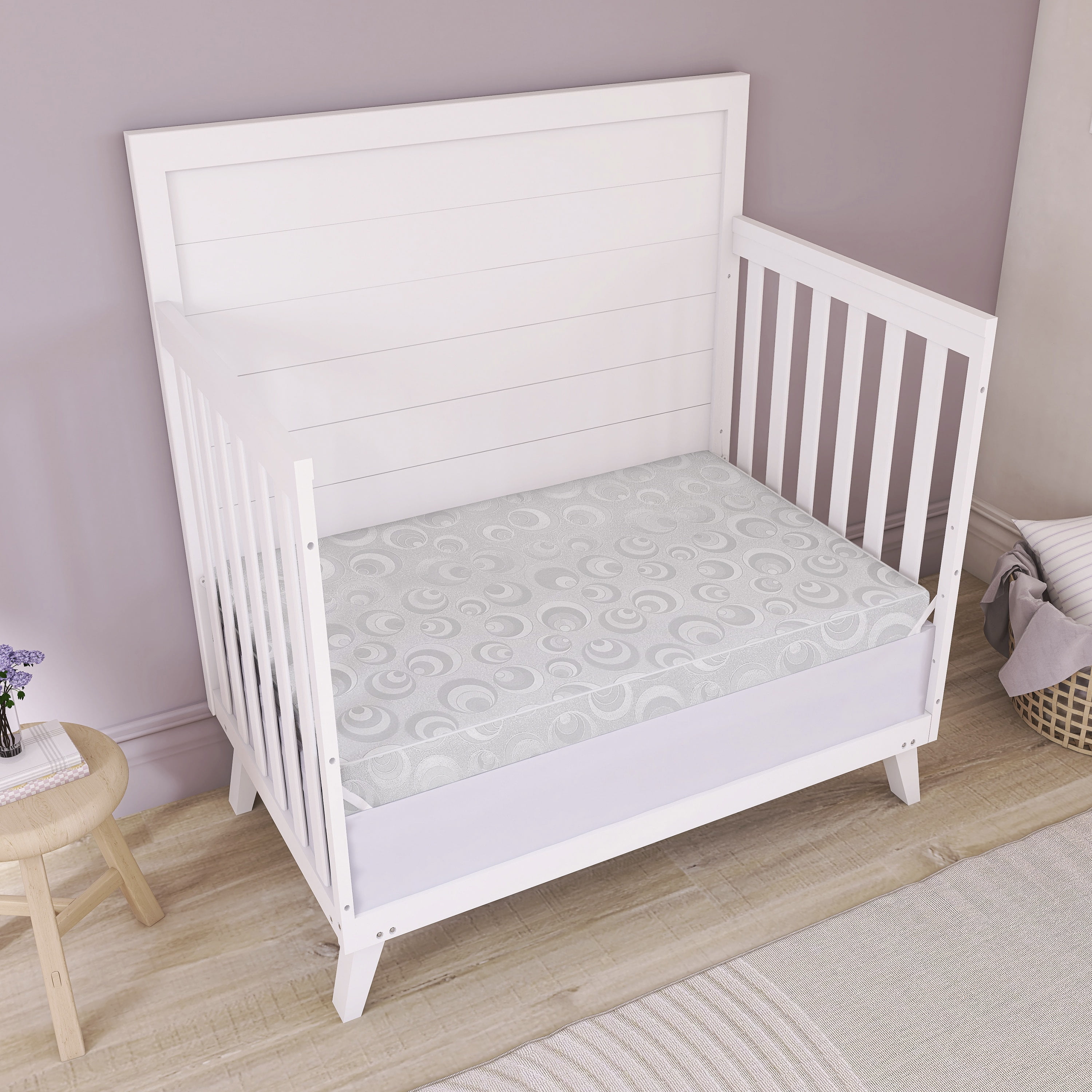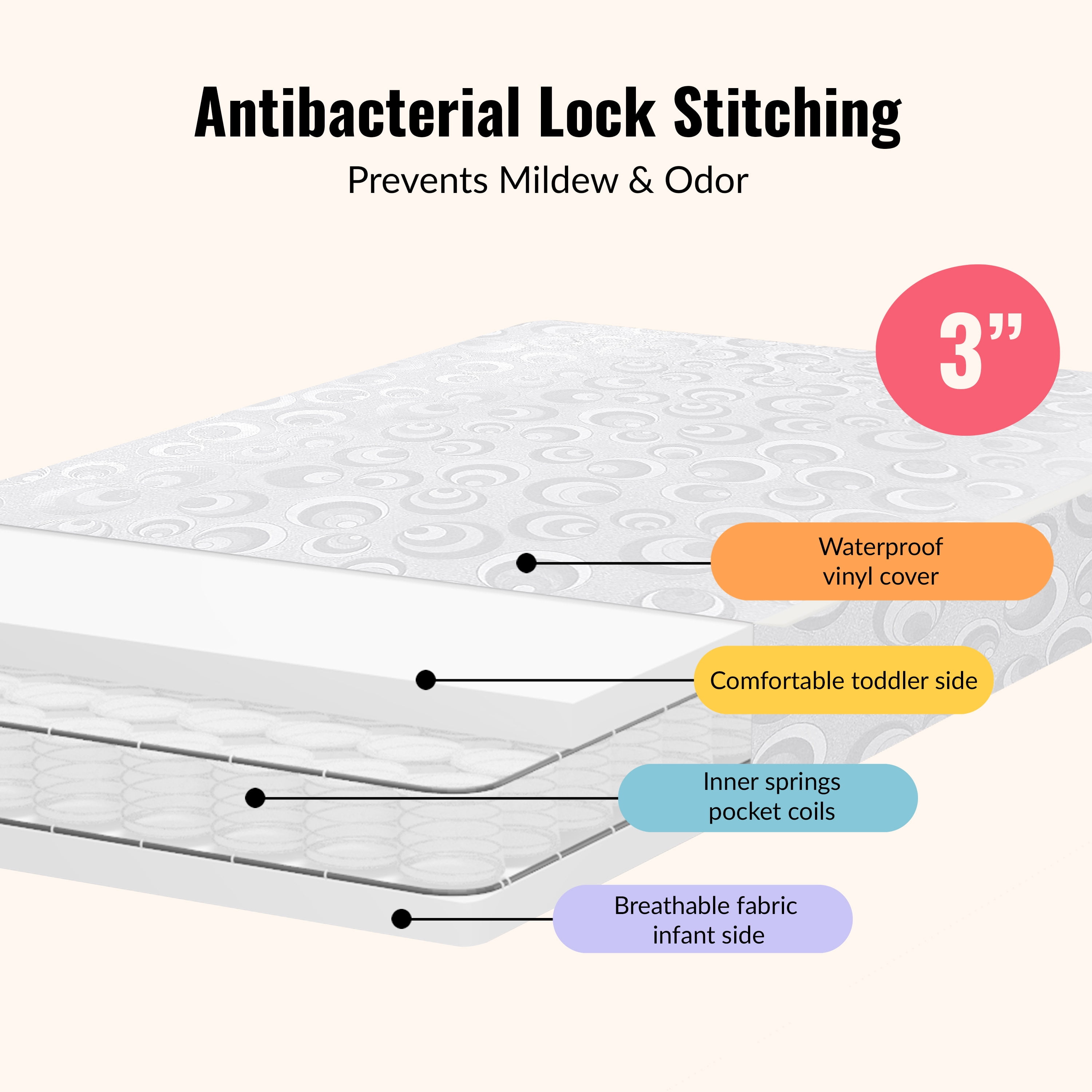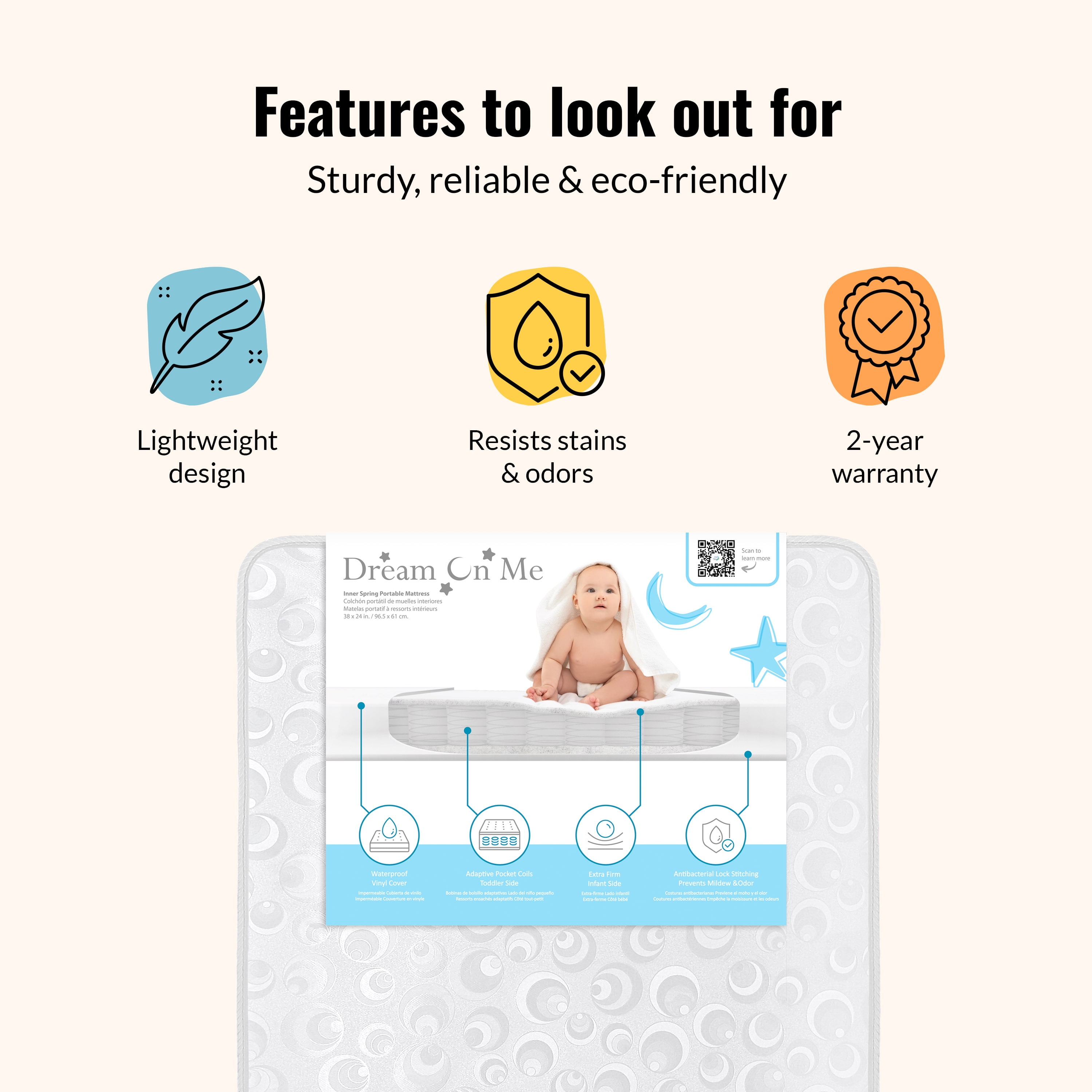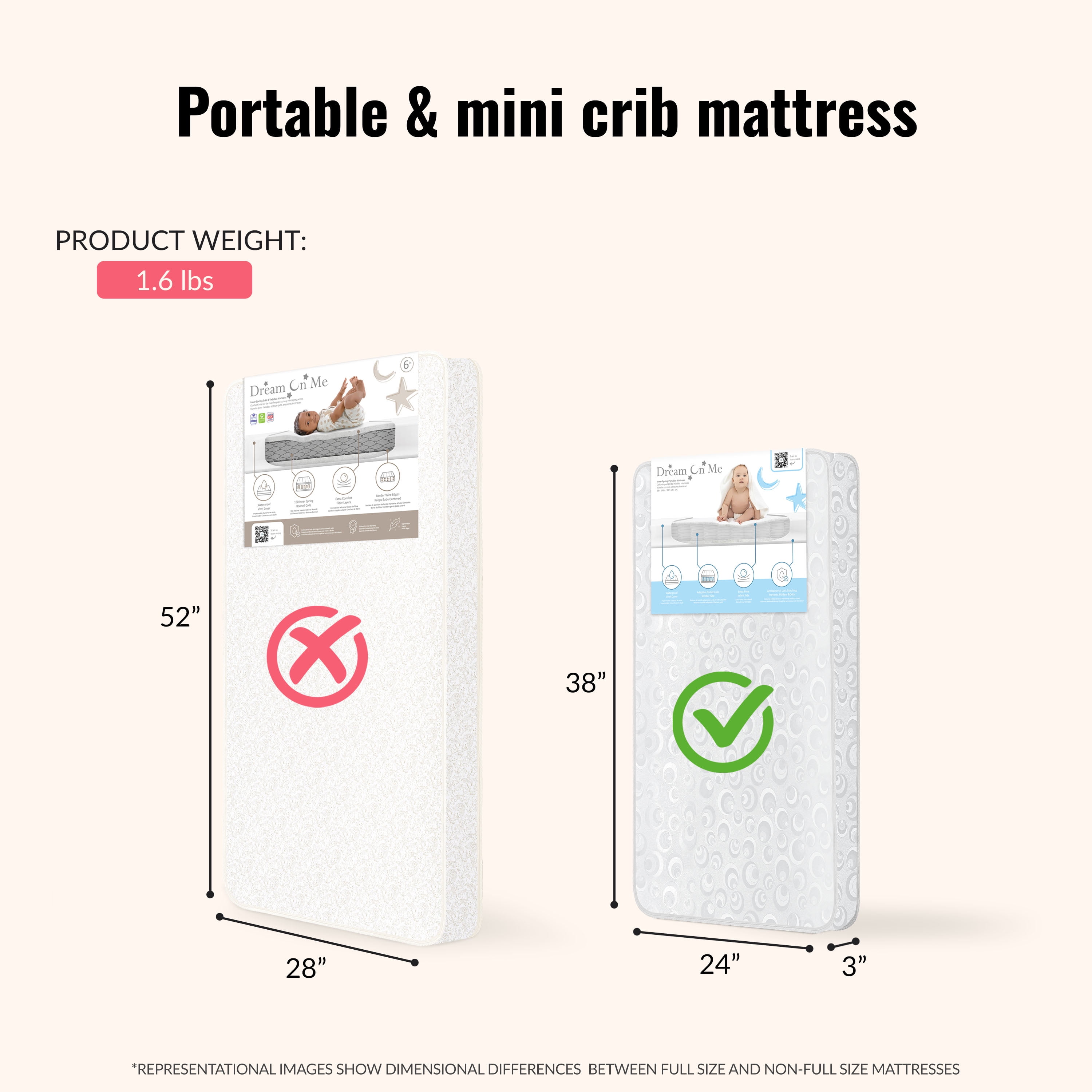 Dream On Me, 3 Spring Coil Mini/Portable Crib Mattress In White is of supreme comfort and quality for newborn, infant and toddler. You no longer need to purchase a standard size crib to get the comfort and support of a full-size mattress. This Portable/Mini crib mattress features interwoven steel coils that are wrapped in hypoallergenic, polyurethane foam and protected with a waterproof cover with Lock Stitch venting. The waterproof, hypoallergenic, antibacterial, cover aids in the prevention of mold, mildew and odor and easily clean with a cloth with warm water and mild soap. This mattress passes the Federal Standard Flammability Standard 16 CFR 1633. Designed to fit a standard 24” x 38” Portable/Mini Crib.