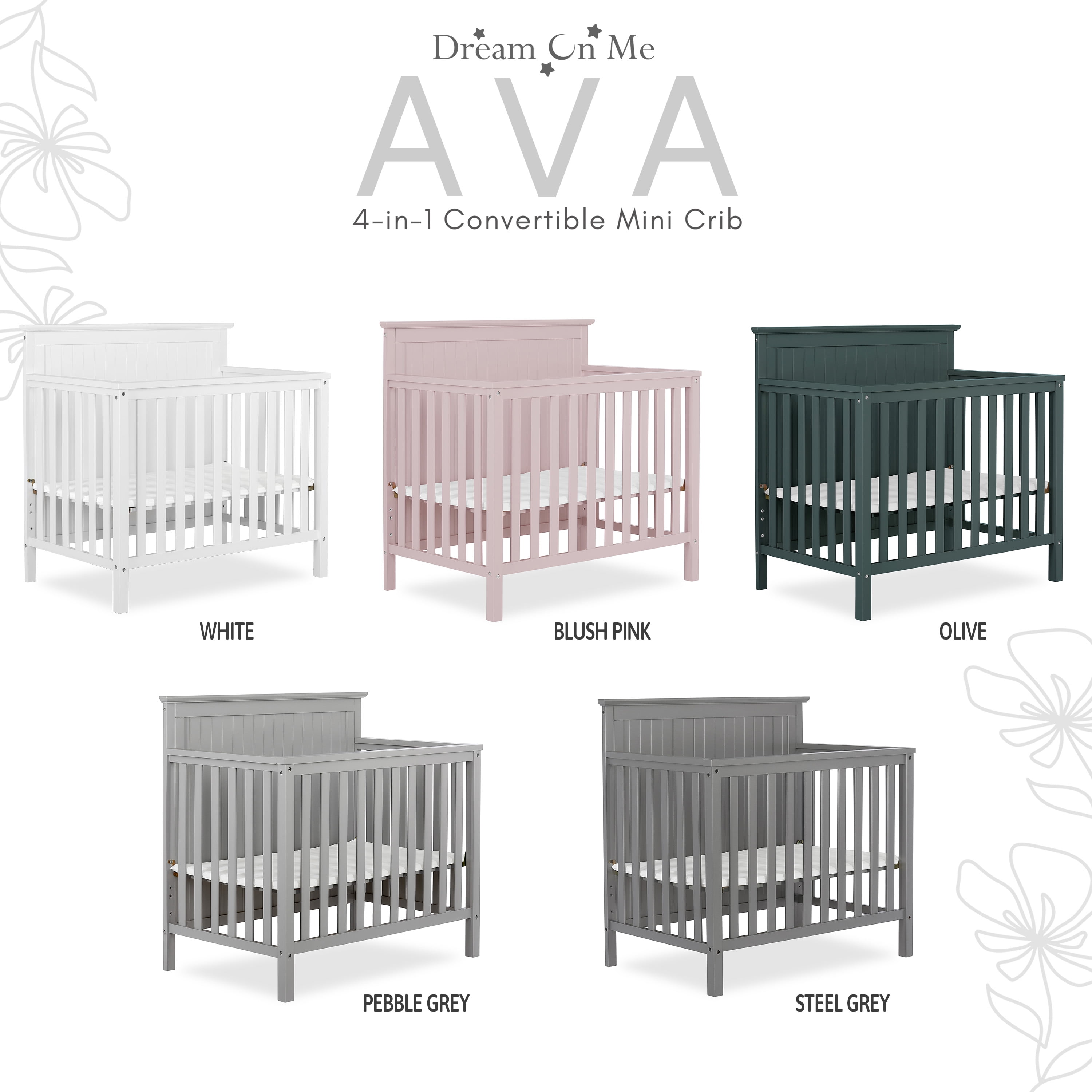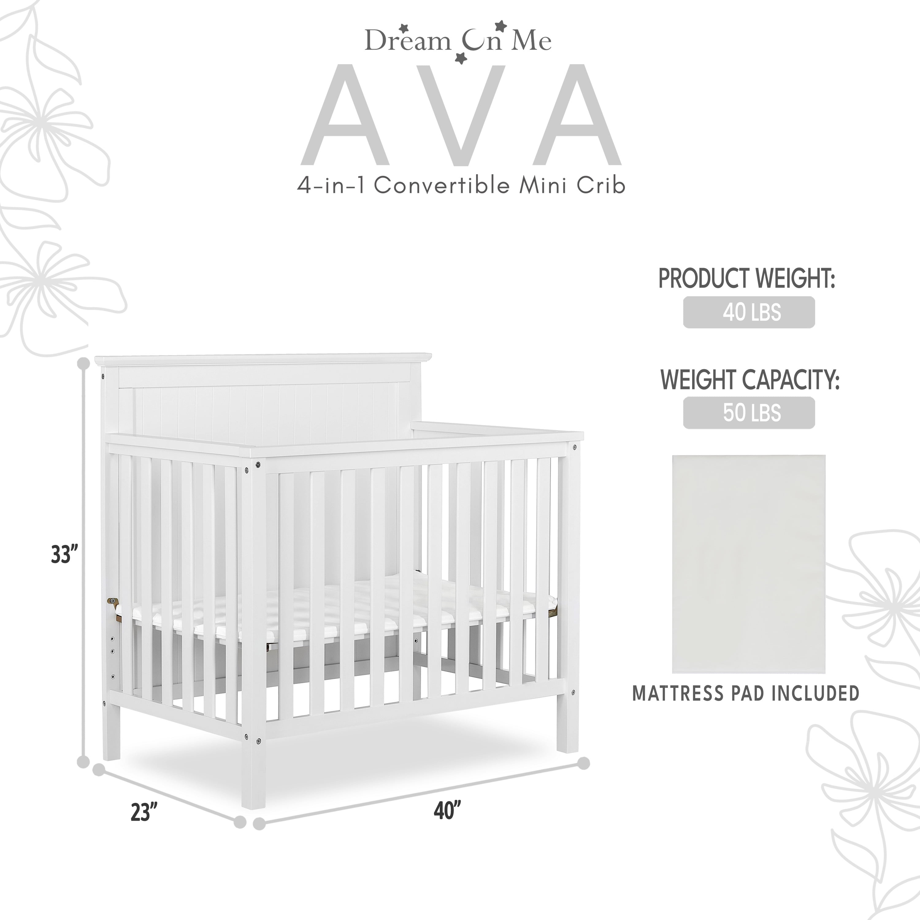 CONVERTIBILITY OPTIONS: The Ava 4-in-1 Convertible Mini Crib grows with your child! Starting as a mini crib, you can convert it into a mini daybed and twin-size bed (bed rails sold separately) Built of solid pinewood, it makes for a durable investment,COMPACT DESIGN: The Ava occupies a small footprint, making it ideal for compact spaces/when you are co-sharing Its lean design featuring a solid headboard with vertical routing lines and a modern frame give it a chic spin Available in 5 bold finishes,MATTRESS MATTERS: The Ava has a 3-position adjustable mattress height setting- adjust it as your child grows It comes with the regulatory 1 mattress pad Choose a DOM non-toxic, Greenguard Gold certified mini or portable crib mattress for a perfect fit.Do not place your furniture in front of or over heating or air conditioning vents,PRIORITIZING SAFETY: All our cribs tested for lead and other toxic elements to meet or exceed applicable ASTM and CCCR safety standards Use a damp cloth to wipe clean when it gets dirty,PRODUCT SPECS: Product dimensions are 44Lx29Wx40H inches The maximum weight limit is 40 lbs All tools/assembly instructions included