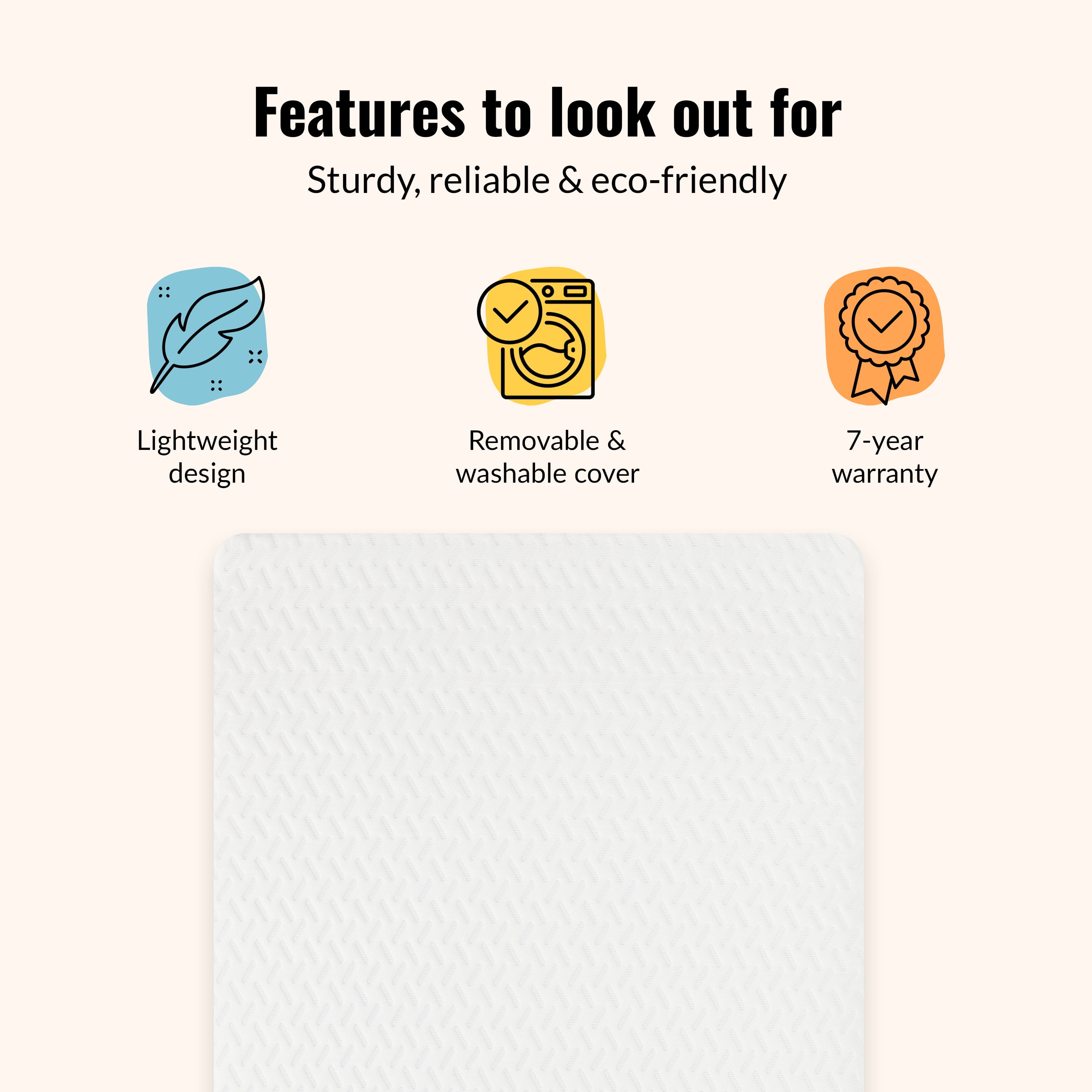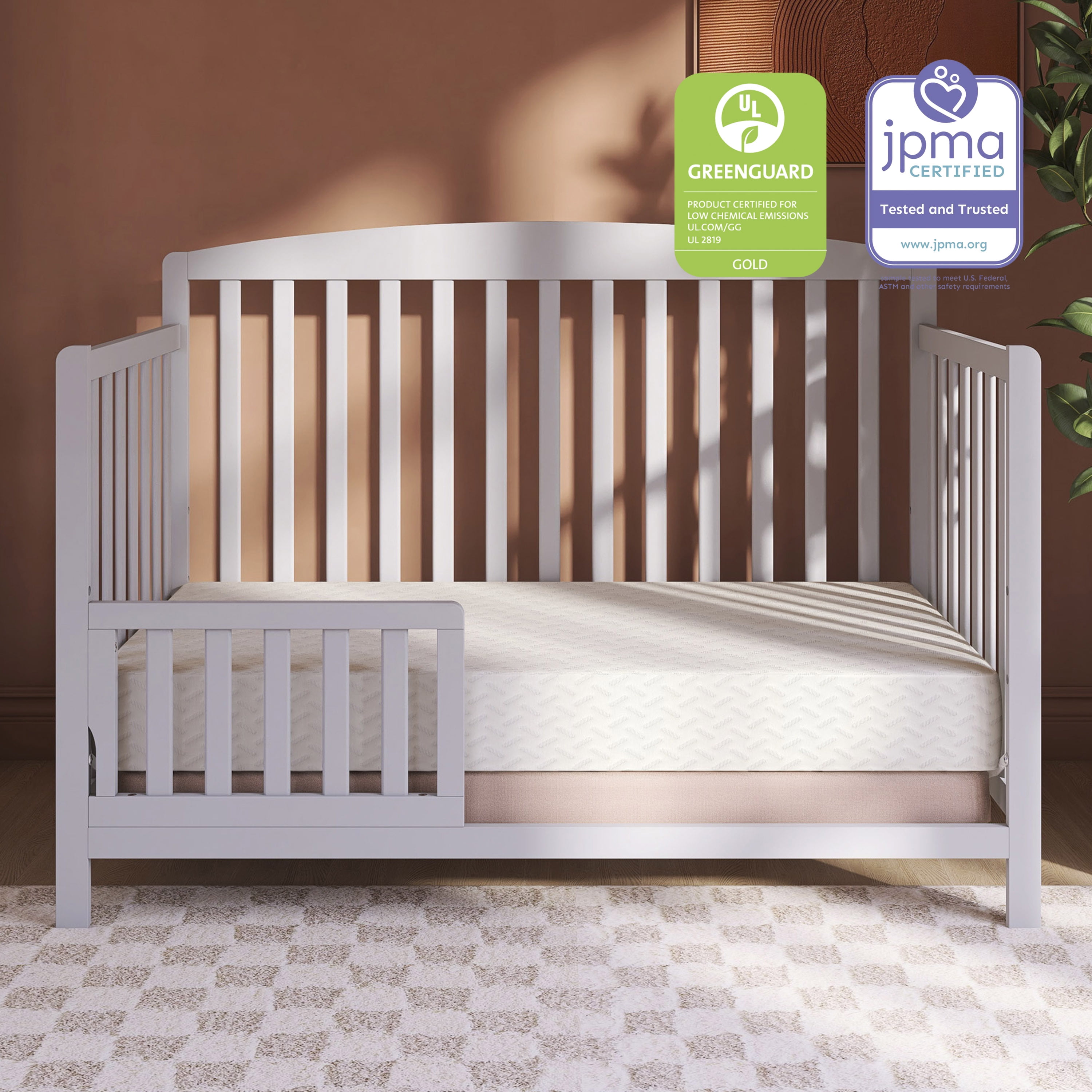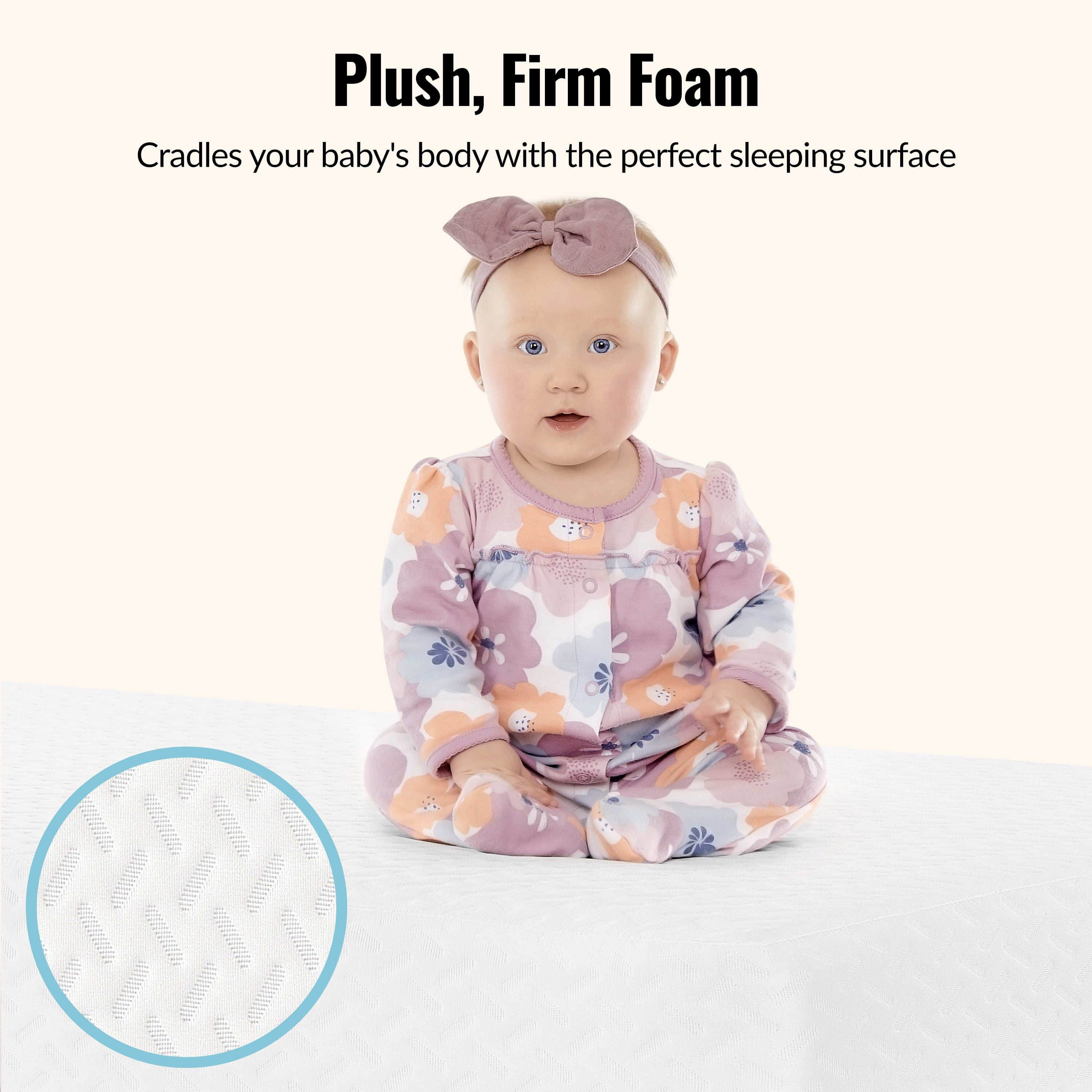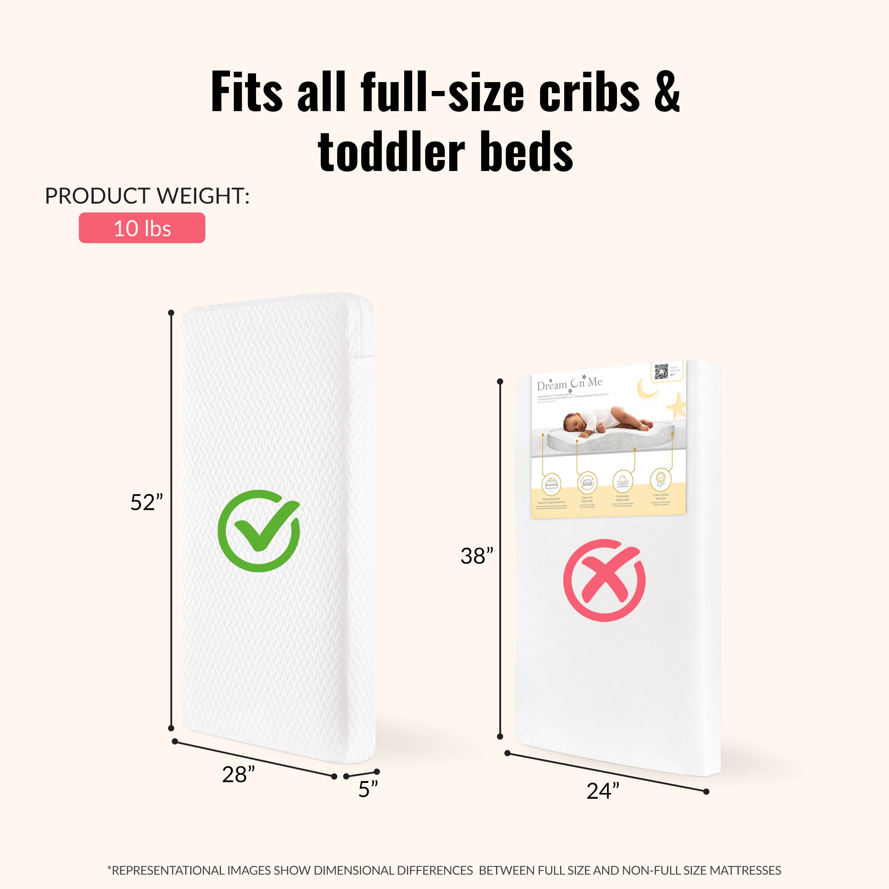 Dream On Me Baby Fairy 5” Foam Crib & Toddler Bed Mattress: QUALITY BUILD: The Baby Fairy 5” Mattress is made of plush yet firm breathable foam that fits a full-size crib & toddler bed. CONVENIENT & EASY TO CLEAN: The Mattress comes with a removable outer cover that’s machine washable. It’s also stain resistant. SAFETY-FIRST: The Baby Fairy 5” Mattress comes in the recommended firmness for infants, is JPMA-certified, and is constructed of quality, fireproof fiber. PRODUCT SPECS: 52” L x 28” W x 5” H “