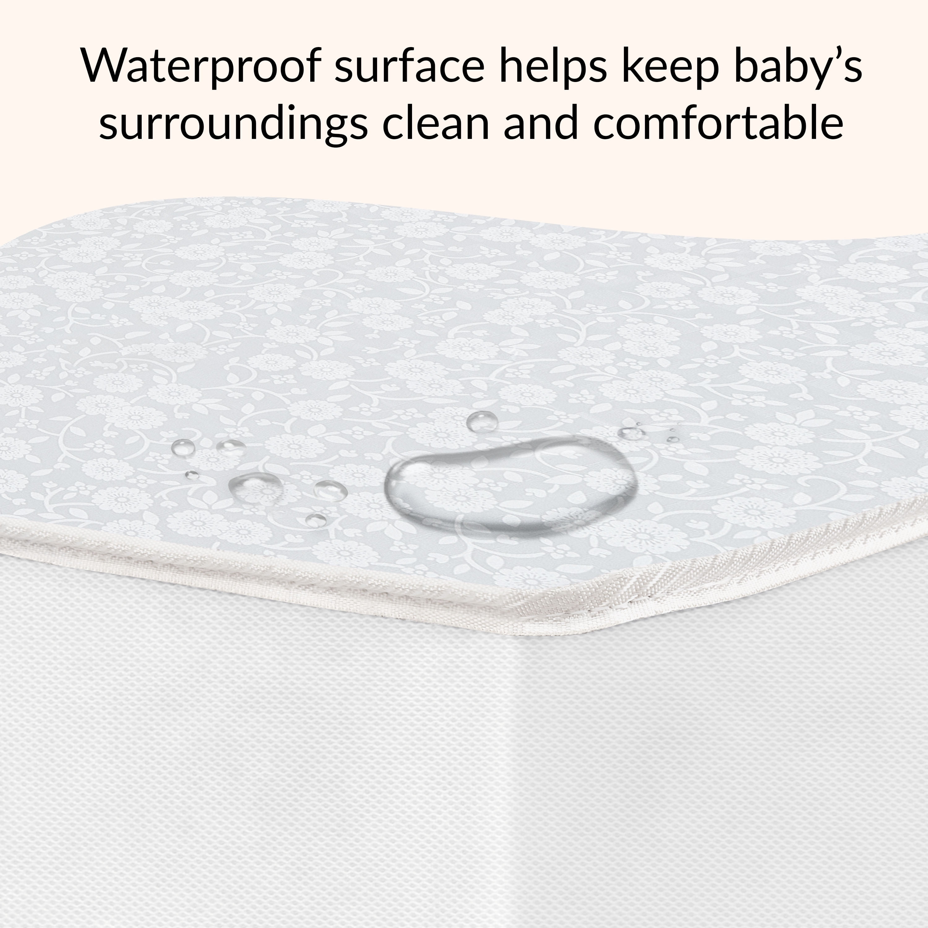 Breathable Mattress cover Promotes airflow Laboratory tested for air / water vapor permeability 2 Hypo-allergenic layers offer cushioned comfort for infants and toddler Reinforced- waterproof cover and binding resist liquids and stains Wipe clean with mild soap and warm water Safety Advice: Please ensure Mattress covers or fitted sheets are not too tight or loose over a crib mattress to practices safe sleeping. Passes all Flammability tests (16 CFR 1632 /1633) and also pass phthalate, lead and toxicity tests GREENGUARD Gold Certified for a healthy indoor environment for your baby JPMA certified to meet or exceed all safety standards set by the CPSC and ASTM Reversible design allows mothers to choice Breathable white side or Printed JPMA certified to meet or exceed all safety standards set by the CPSC and ASTM.