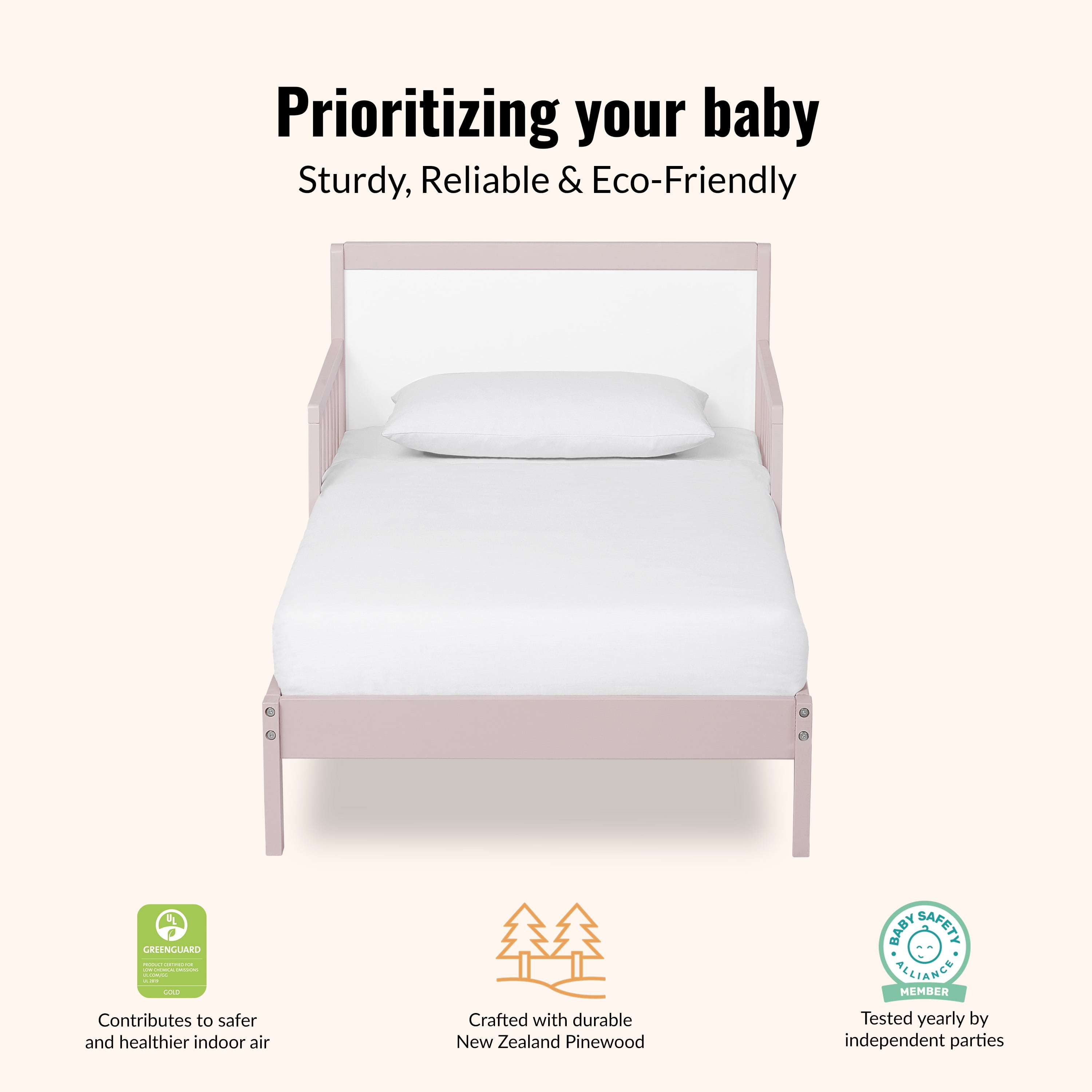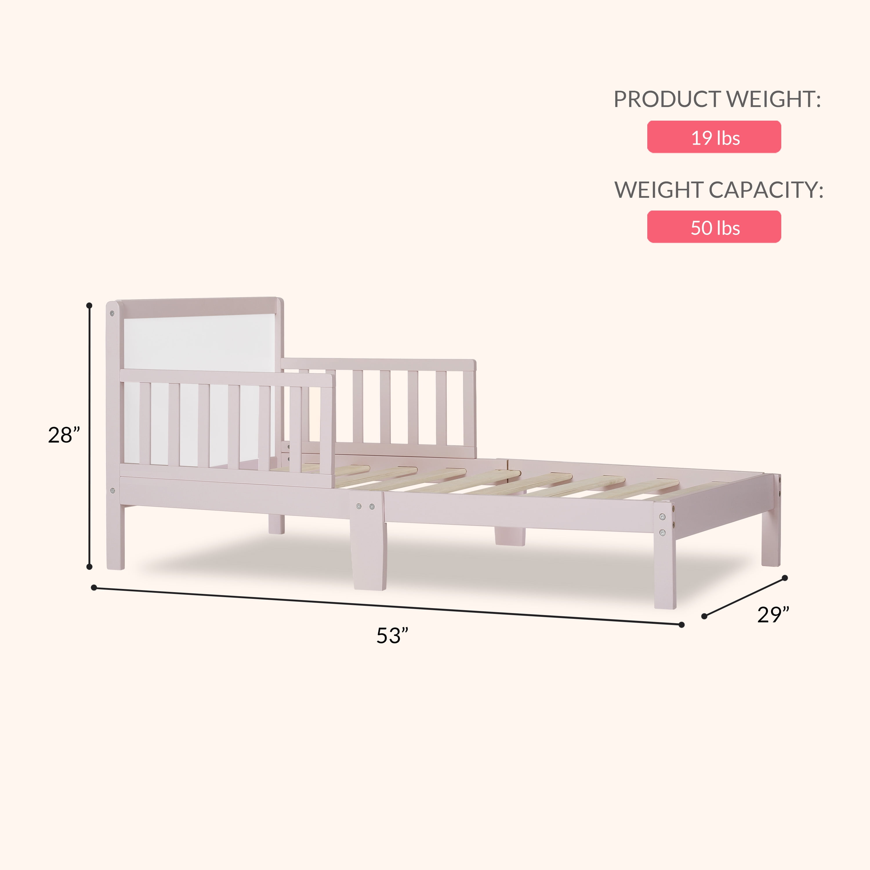 Designed low to the floor, safety guard rails wooden mattress support rails Constructed out of New Zealand pine wood Weight Capacity: 50 lbs All tools for assembly included. Assembled Dimensions: 57 L x 29 W x 28 H” Tested for lead and other toxic elements to meet or exceed government and ASTM safety standards