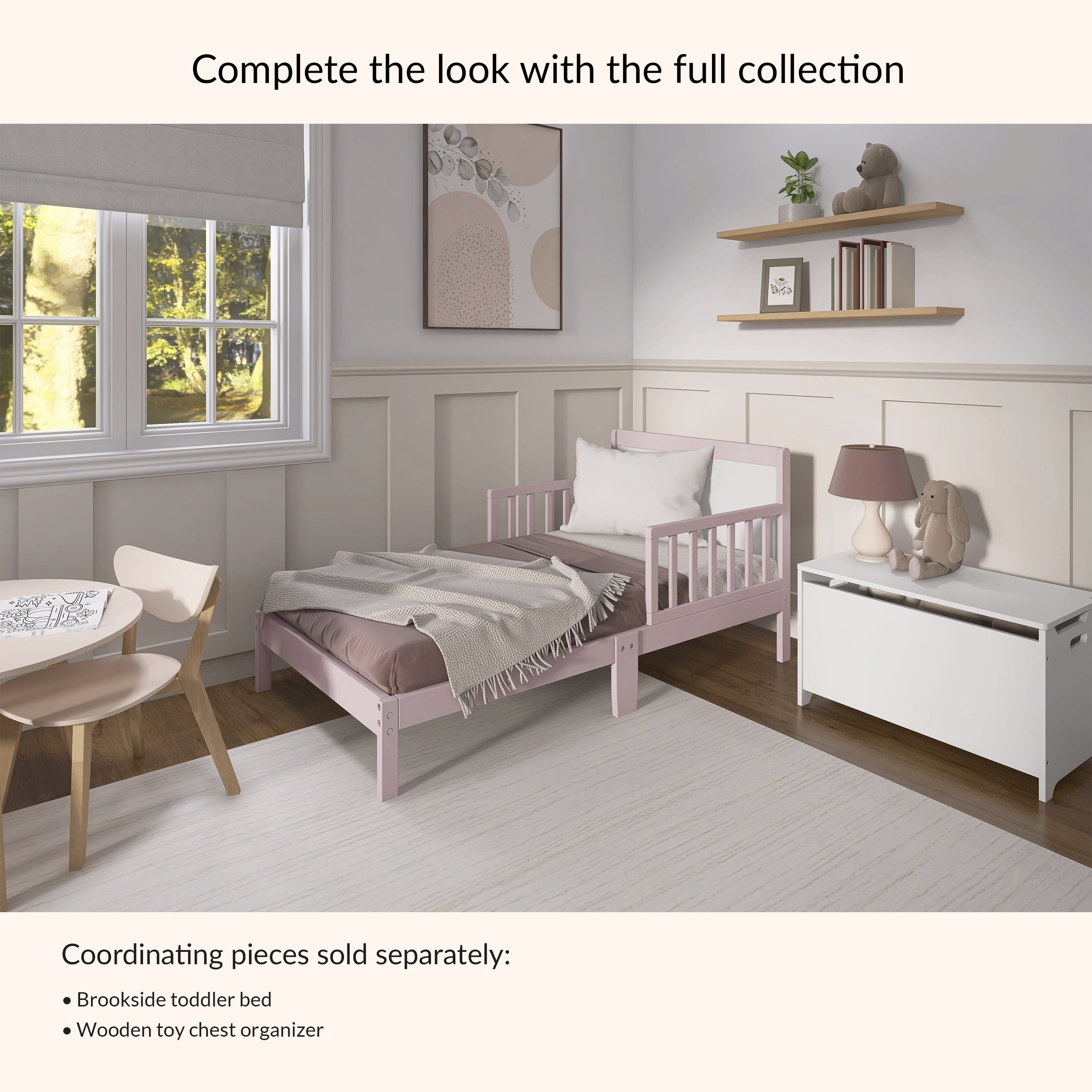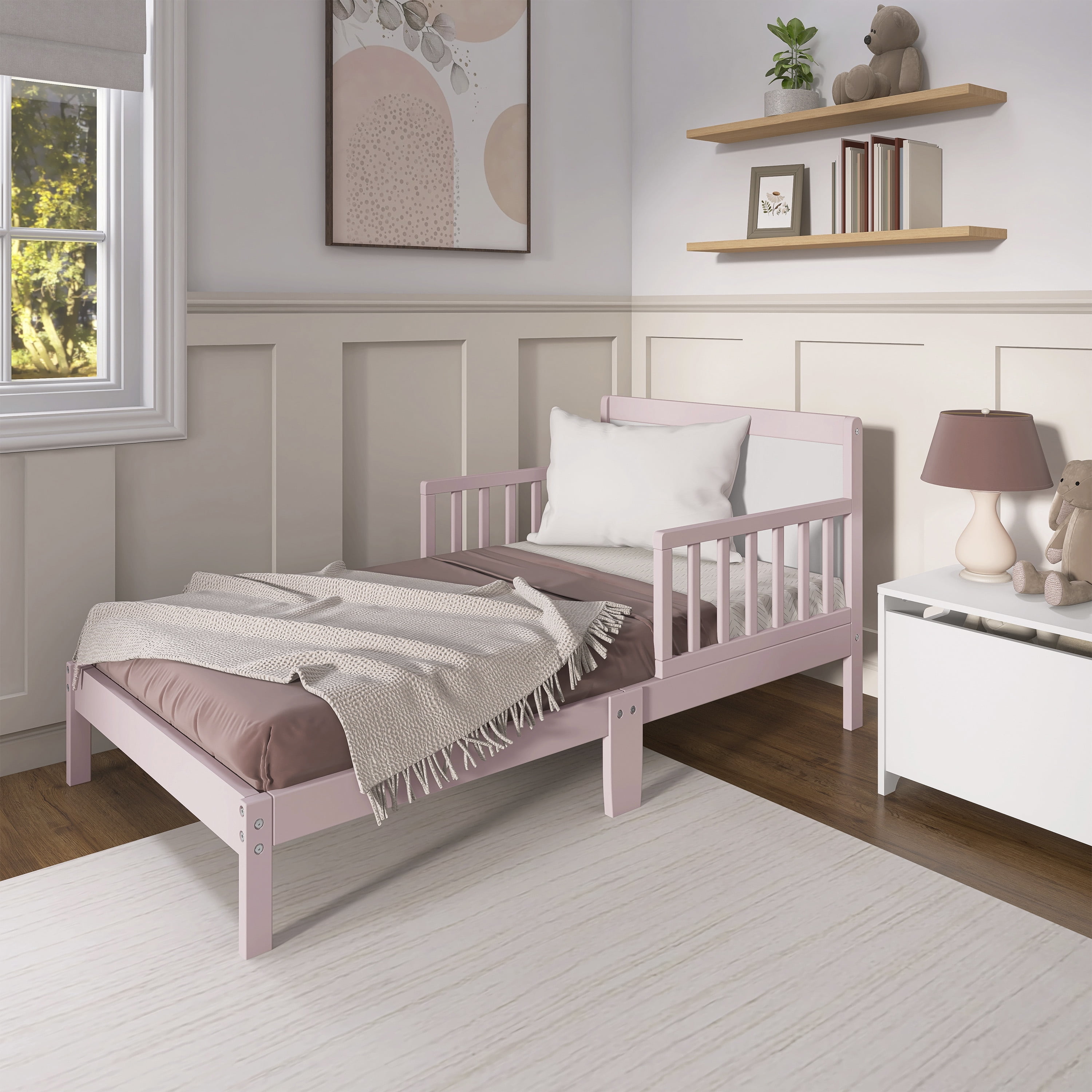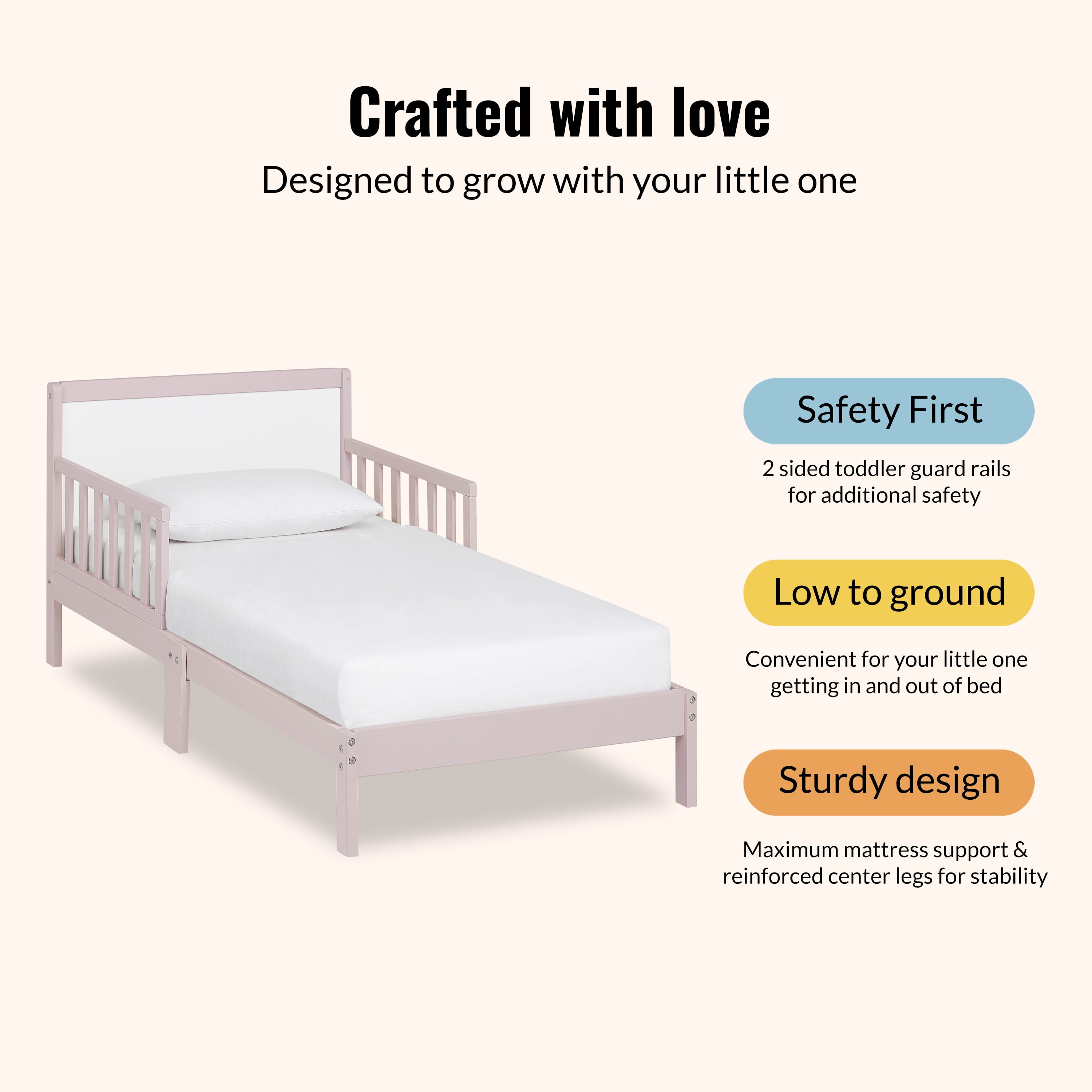 Dream On Me Brookside toddler bed gives your child a fun, colorful, and comfortable bedroom. This toddler bed offers a modern frame design that will blend nicely into any child’s room and transition with them as they grow with a low to the floor design, it is ideal for your toddler to safely get in and out of bed. It is reinforced for stability with center legs and comes complete with two side safety rails for added security in radiant finishes. The Dream On Me Brookside Toddler Bed is the perfect transition for toddlers, who have outgrown their cribs but are still too small for an adult bed. The brilliant combination of playful colors and outstanding comfort make this bed a perfect way to enhance any child’s bedroom.