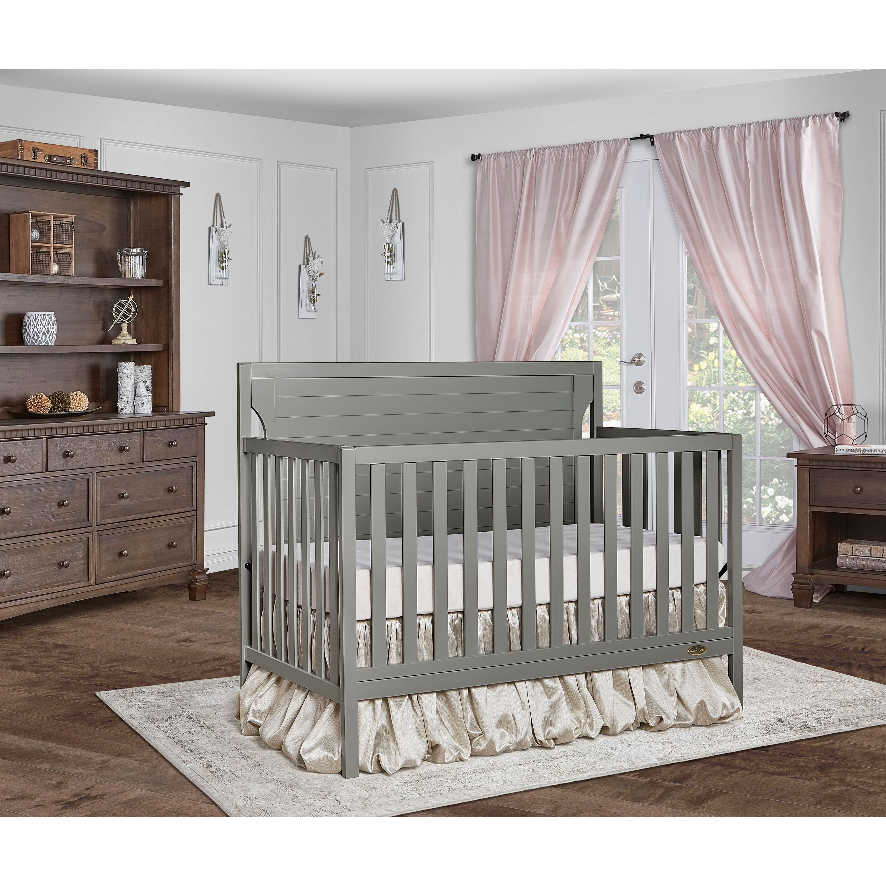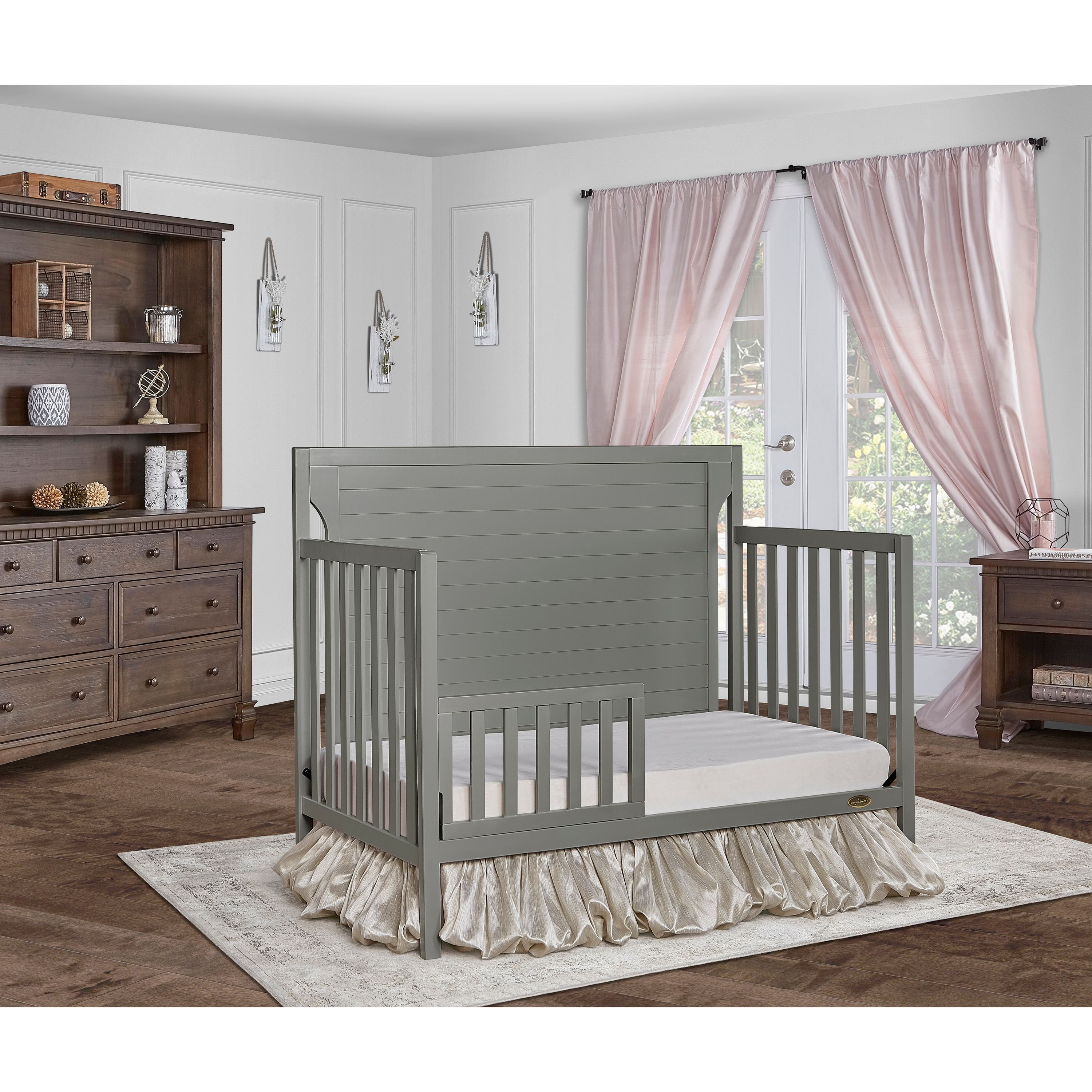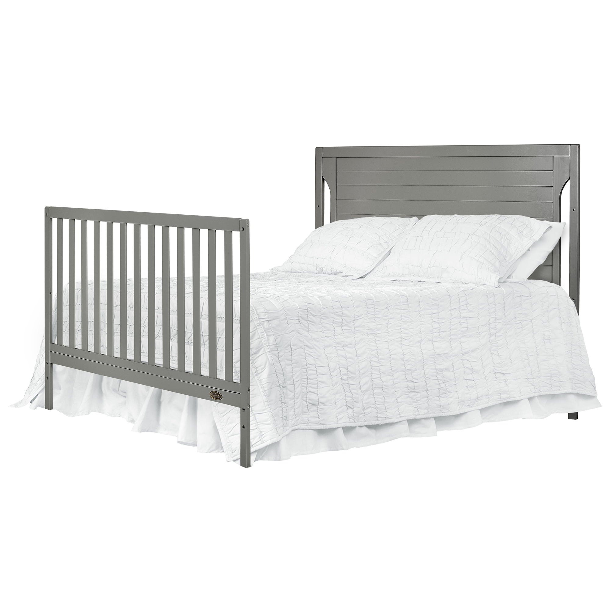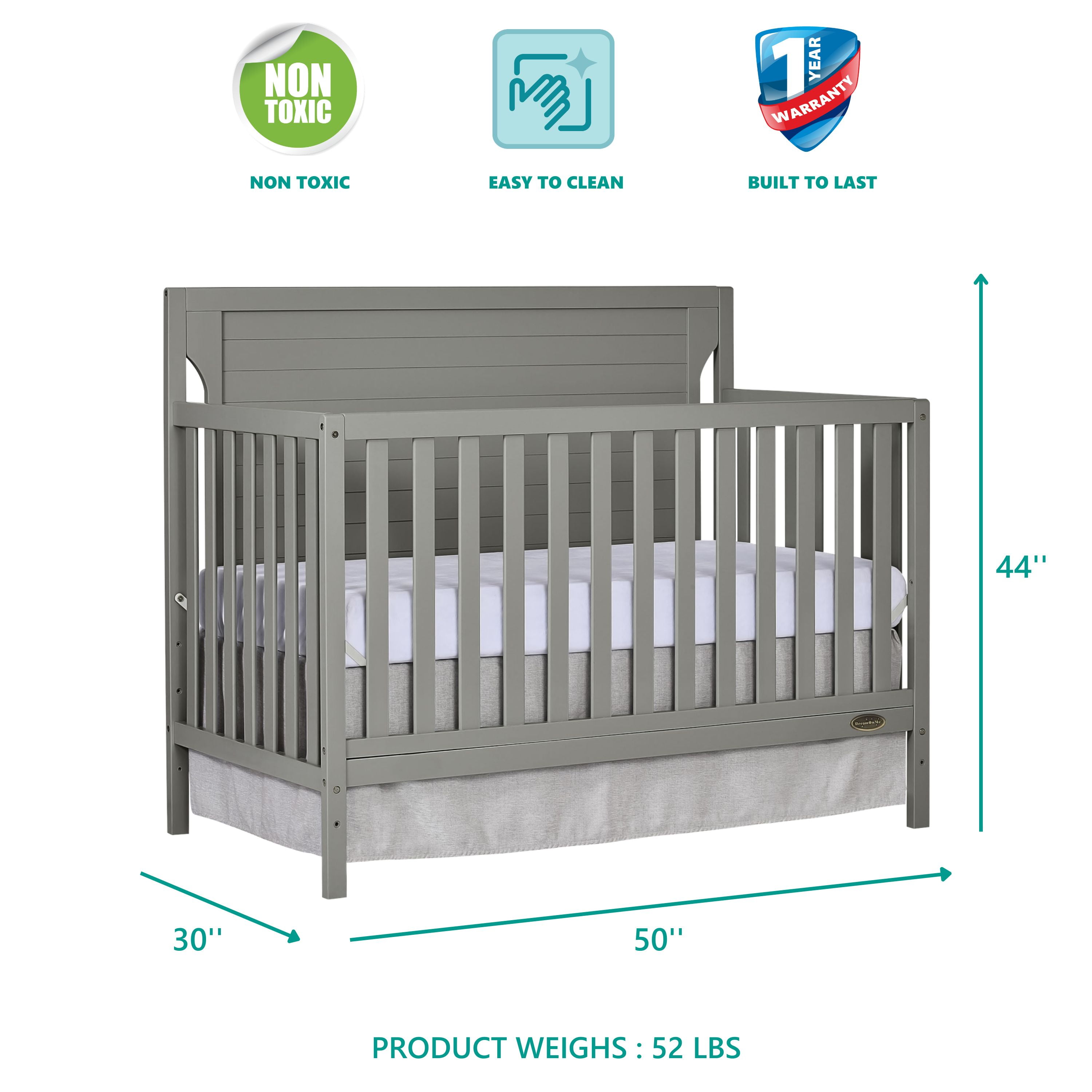 Dimensions: 55L x 30W x 44.5H in Crib converts to toddler bed with conversion set (sold separately) Converts to day bed or full bed (bed frame sold separately) Wood construction with adjustable metal mattress platform Meets all applicable ASTM, JPMA, and CPSC standards Choose from available color options Assembly required