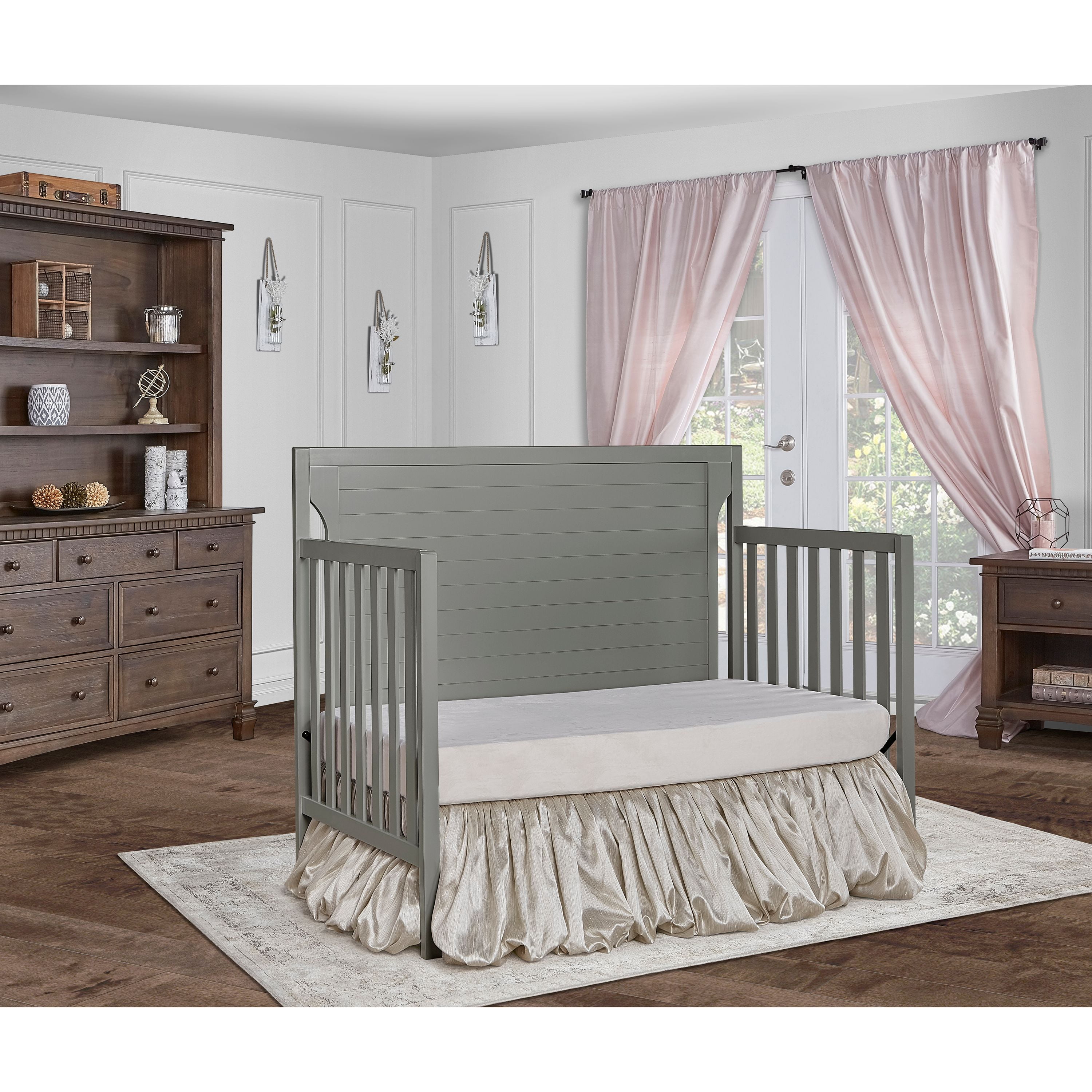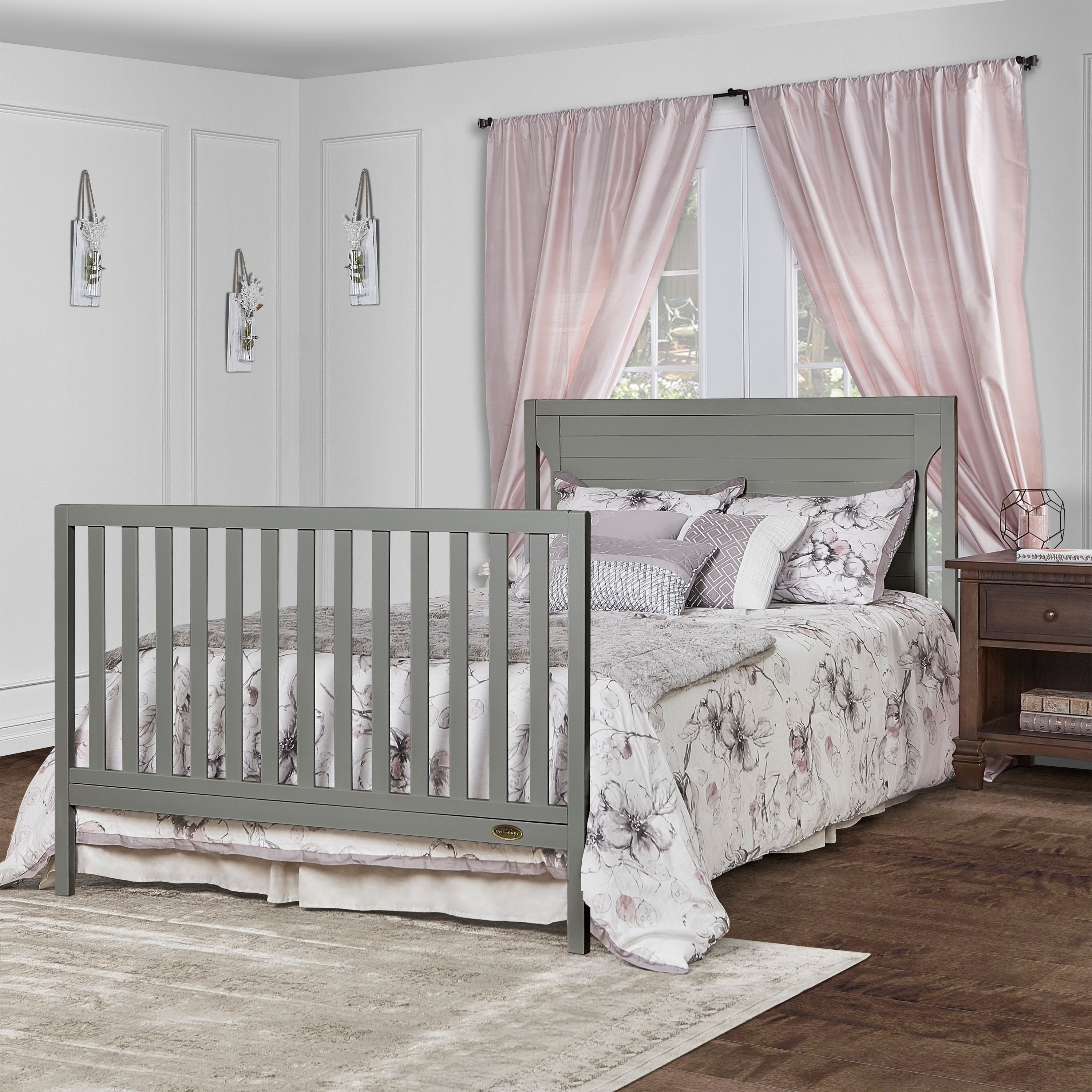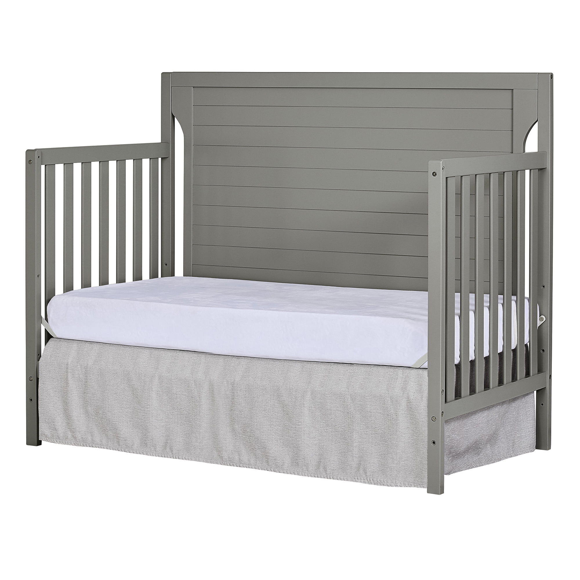 Dimensions: 55L x 30W x 44.5H in Crib converts to toddler bed with conversion set (sold separately) Converts to day bed or full bed (bed frame sold separately) Wood construction with adjustable metal mattress platform Meets all applicable ASTM, JPMA, and CPSC standards Choose from available color options Assembly required