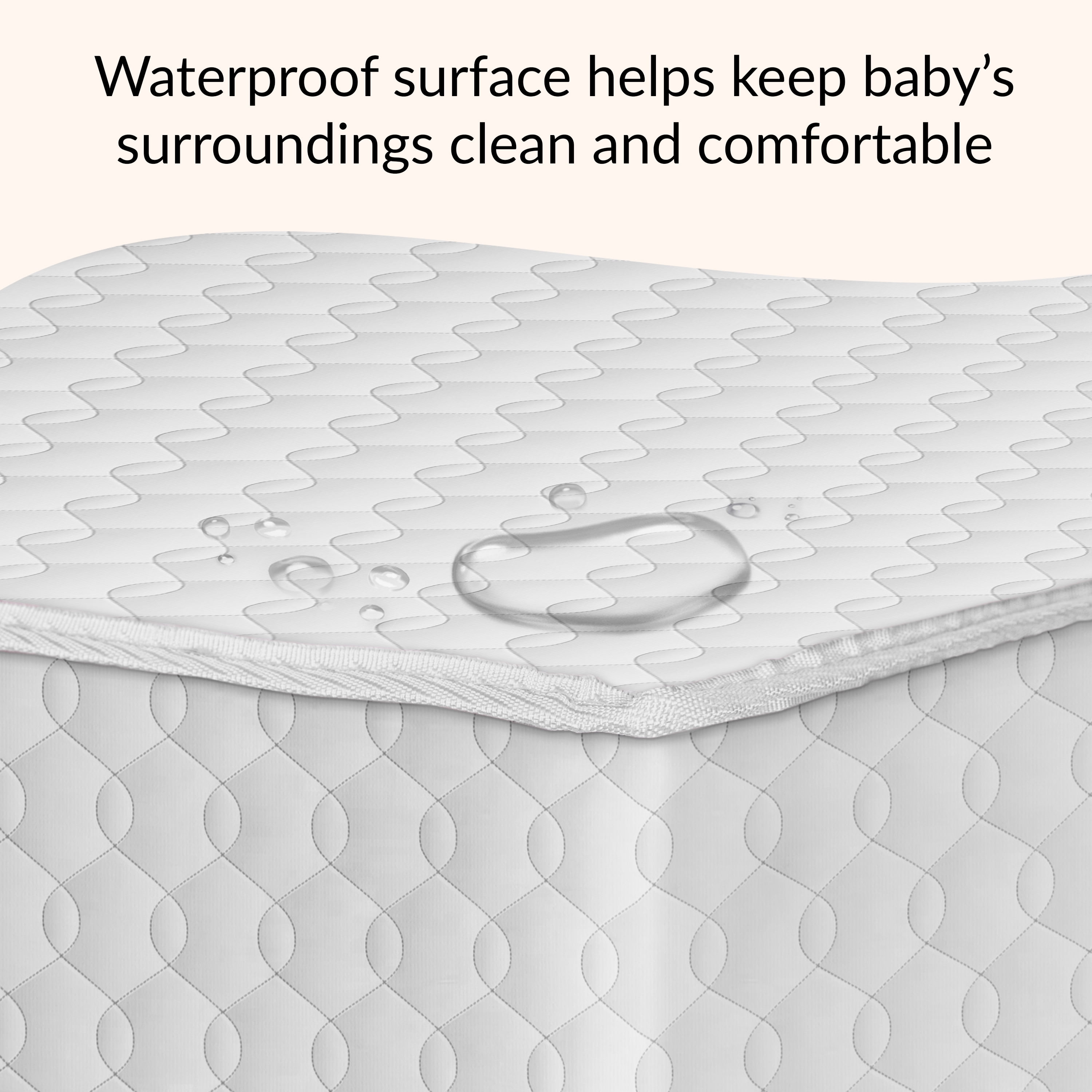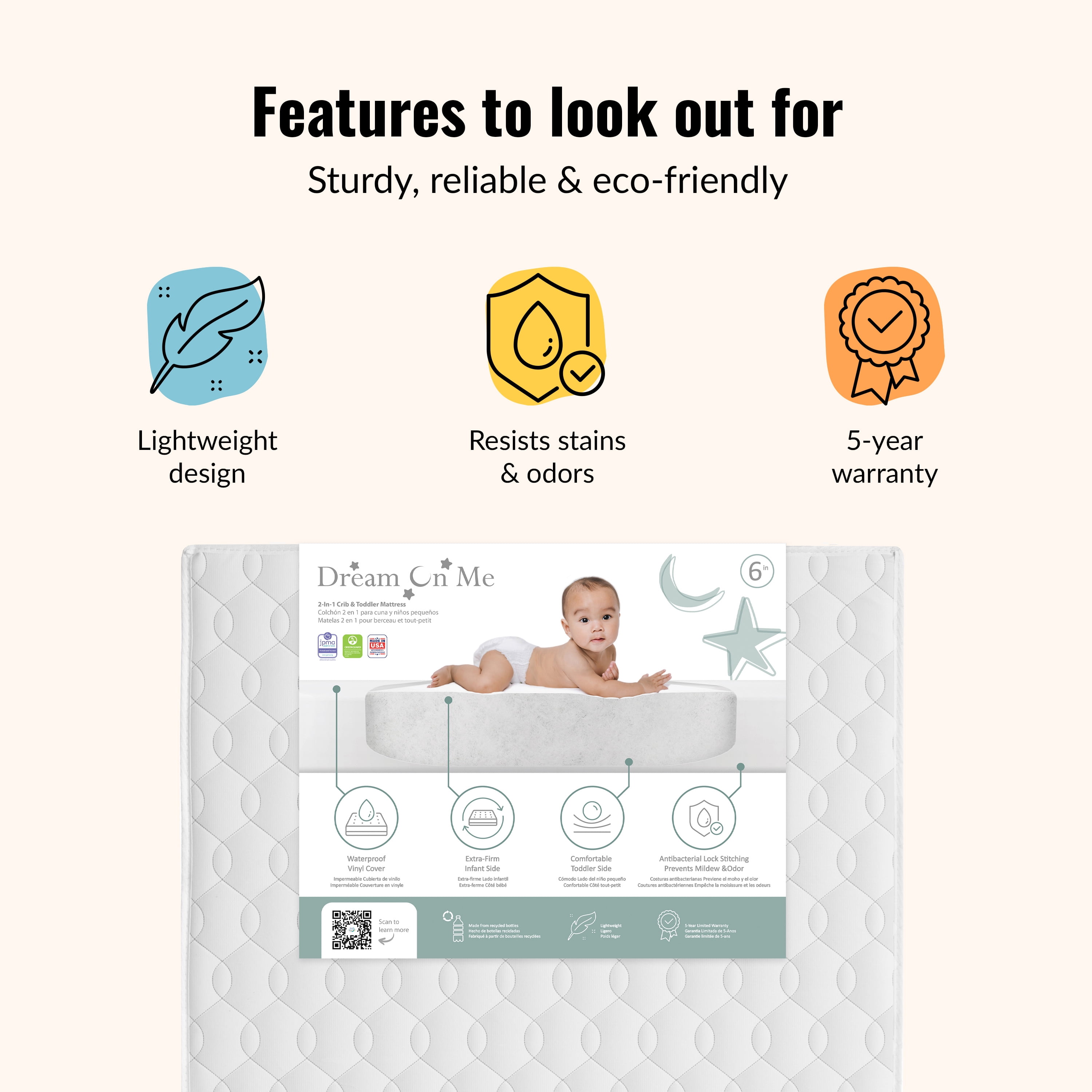 The Dream On Me Firm Foam Crib and Toddler bed mattress is the answer to your baby’s restful sleep. With six inches of firm foam at its core, this mattress is constructed of flame retardant, antibacterial, hypoallergenic quality materials that aids in the prevention of mold, mildew, and odor. Its waterproof cover wipes clean with warm water and mild soap. Lead and phthalate tested; this mattress passes the Federal Standard Flammability Standard 16 CFR 1633.