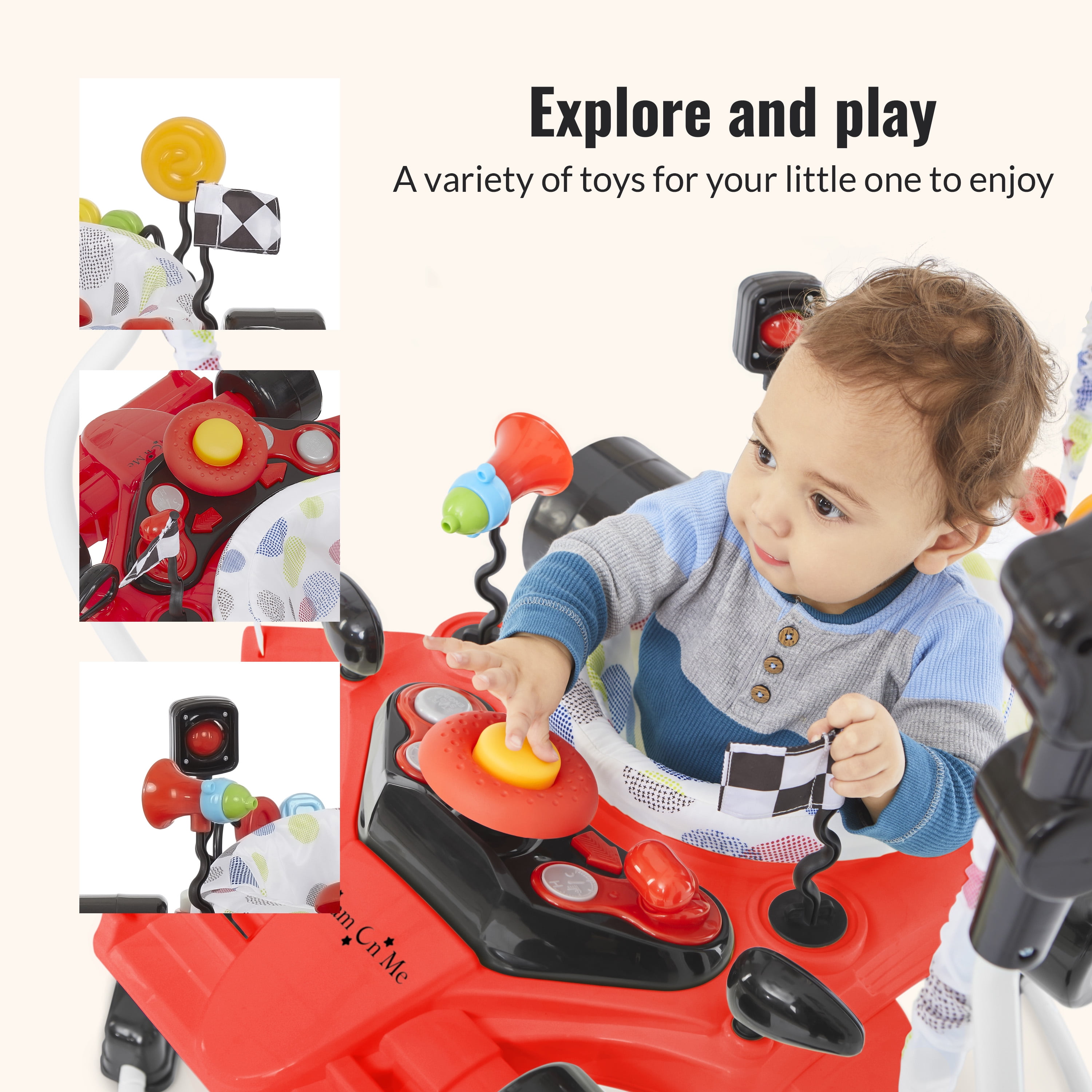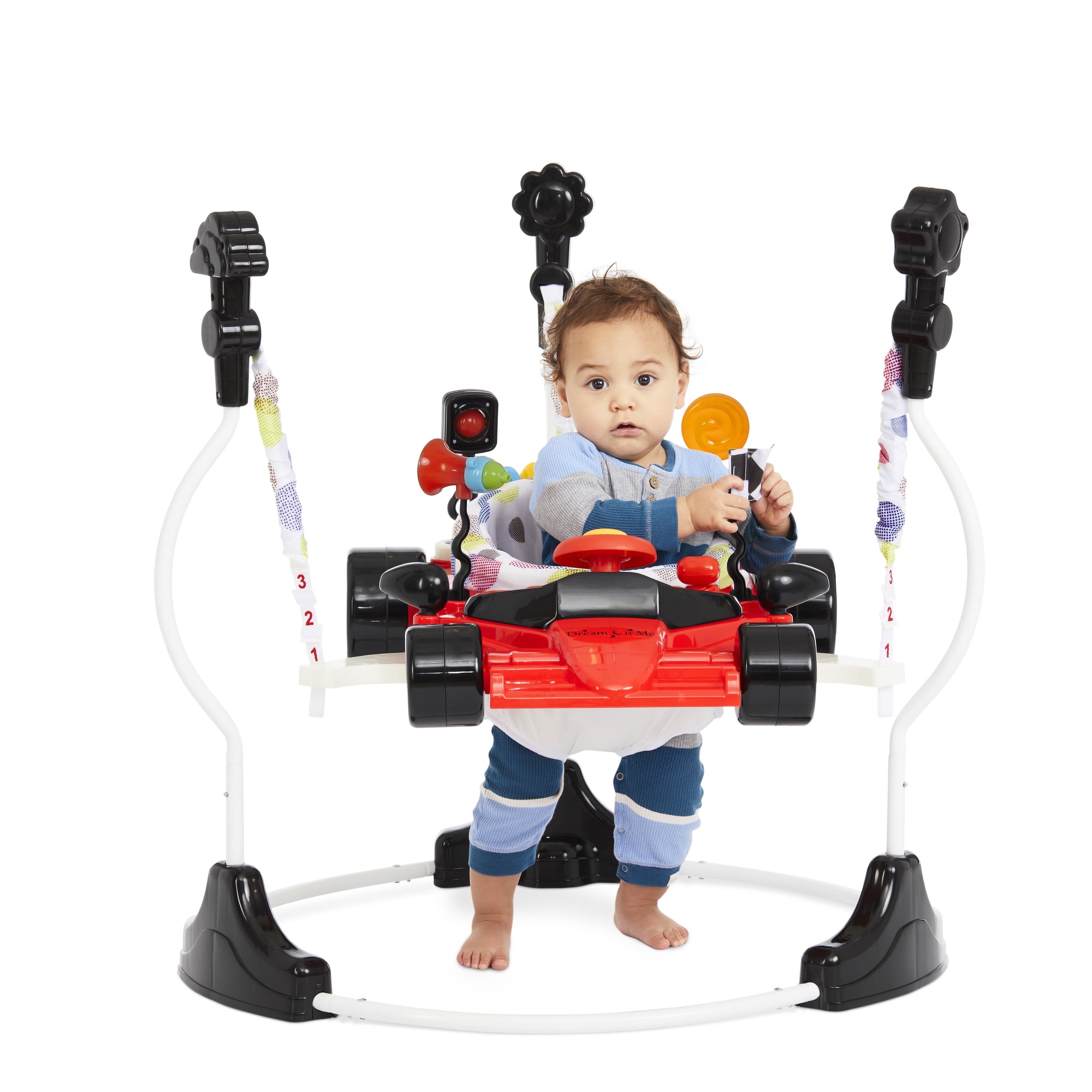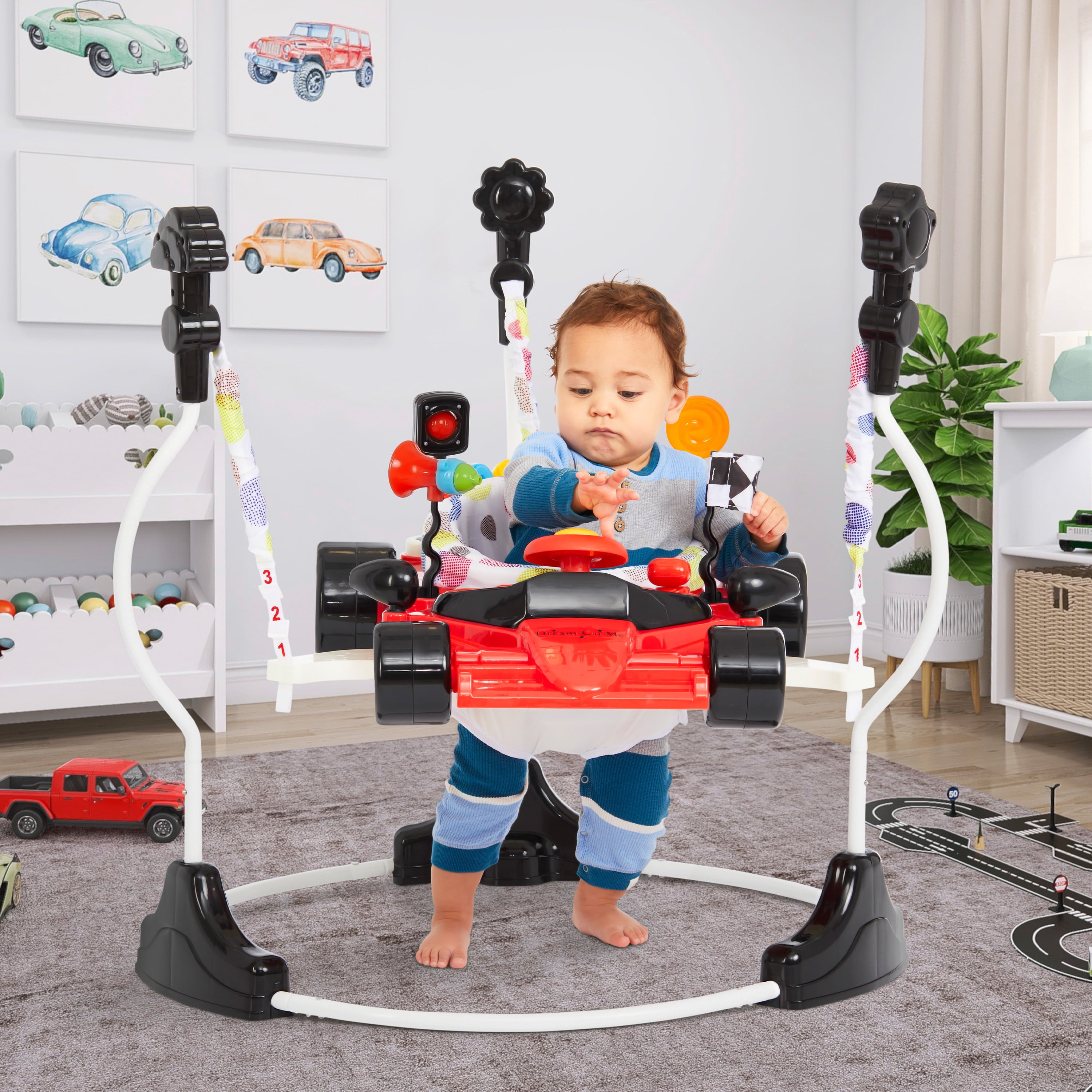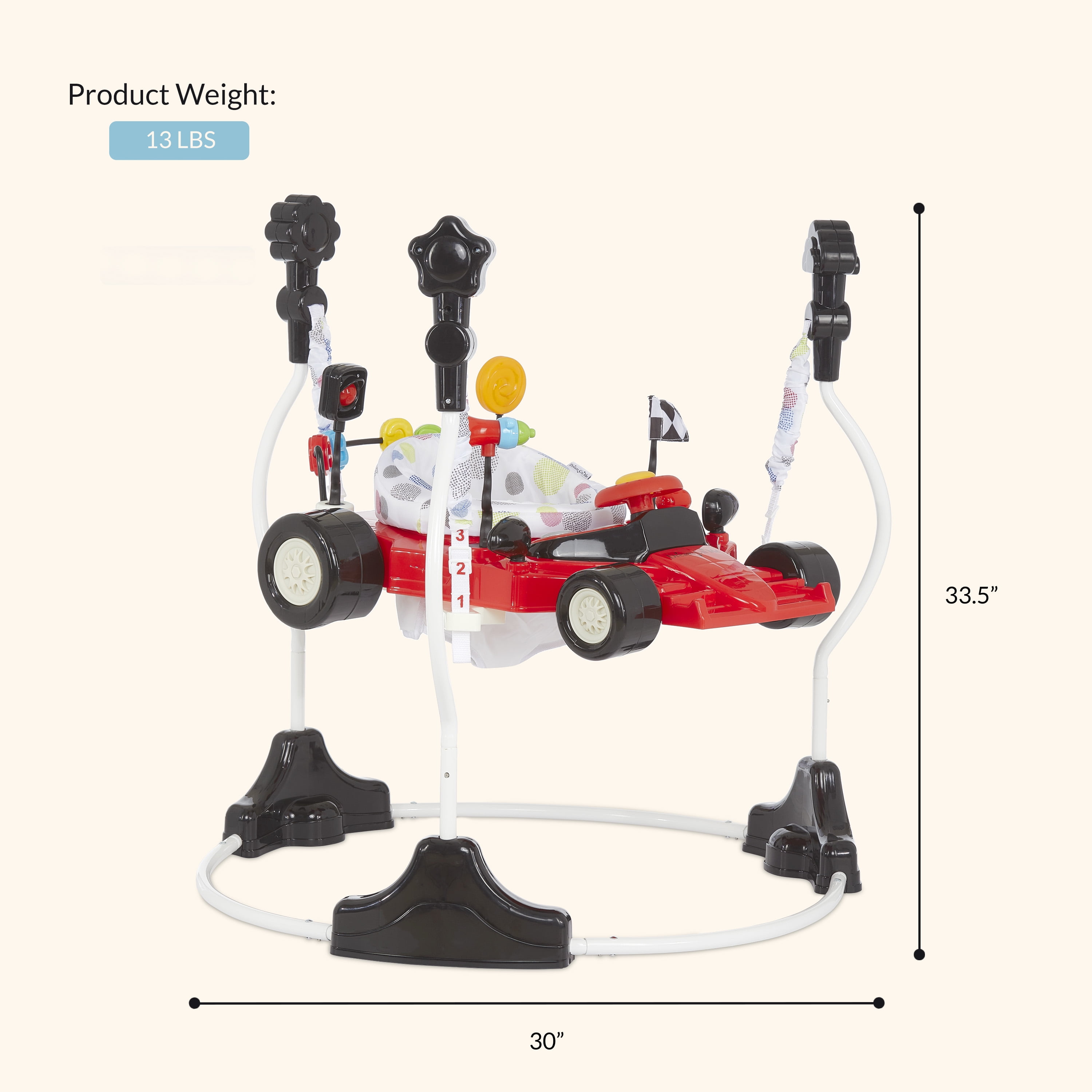 Modern F1 Car design 2-in-1 activity center and bouncer. Seat spins with a 360 degree rotation for easy access to the toys. Seat is 12″ wide Easily converts to toddler play using the 3 height positions. 12 music songs and with flashing lights. Product size : 30 x 33.5”