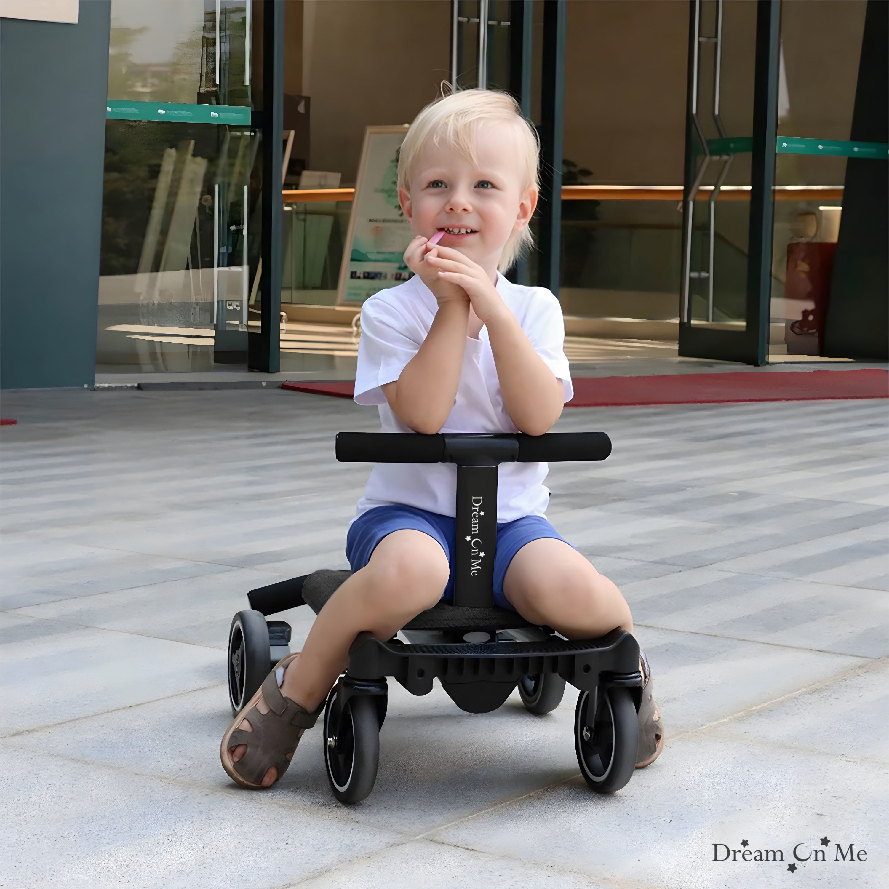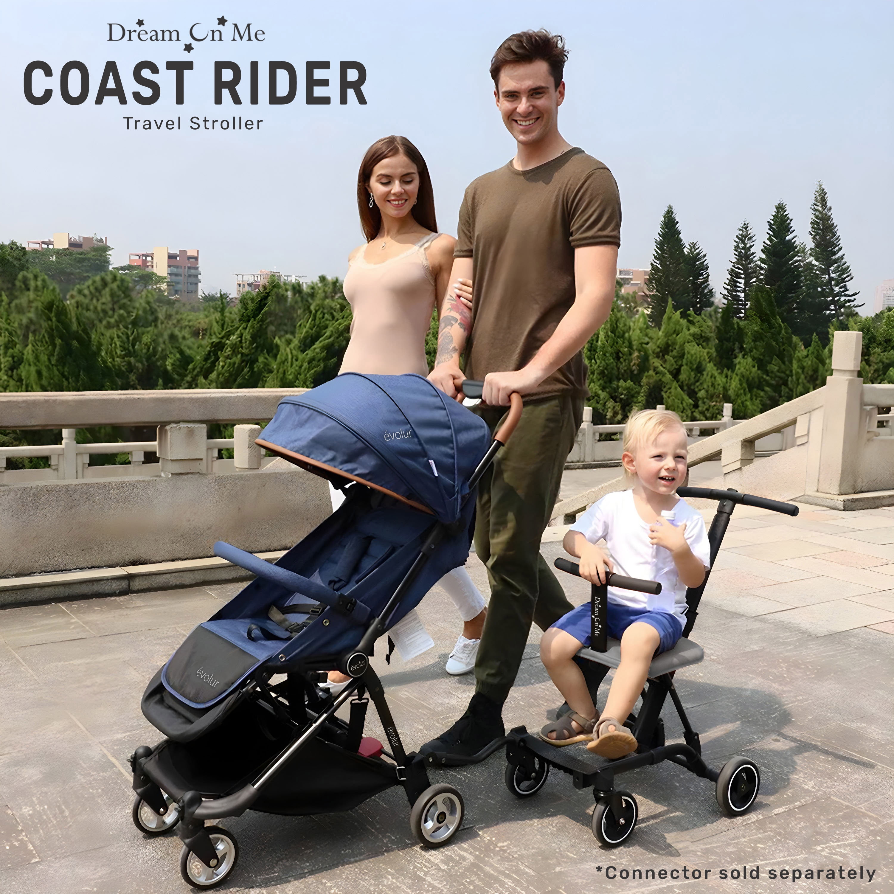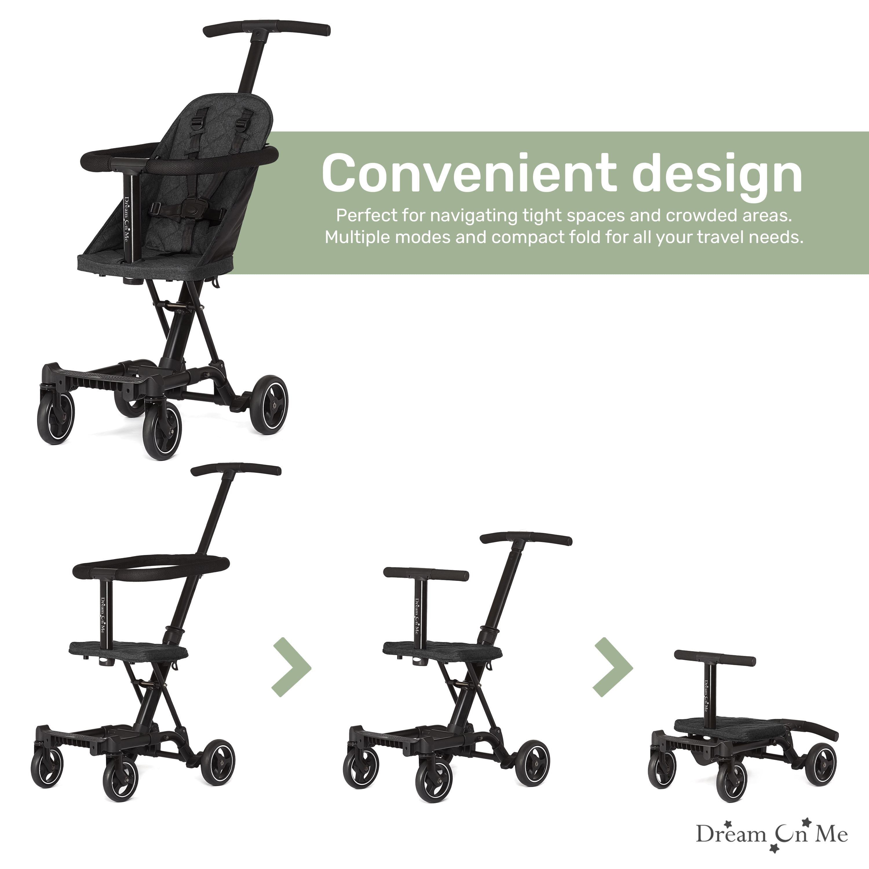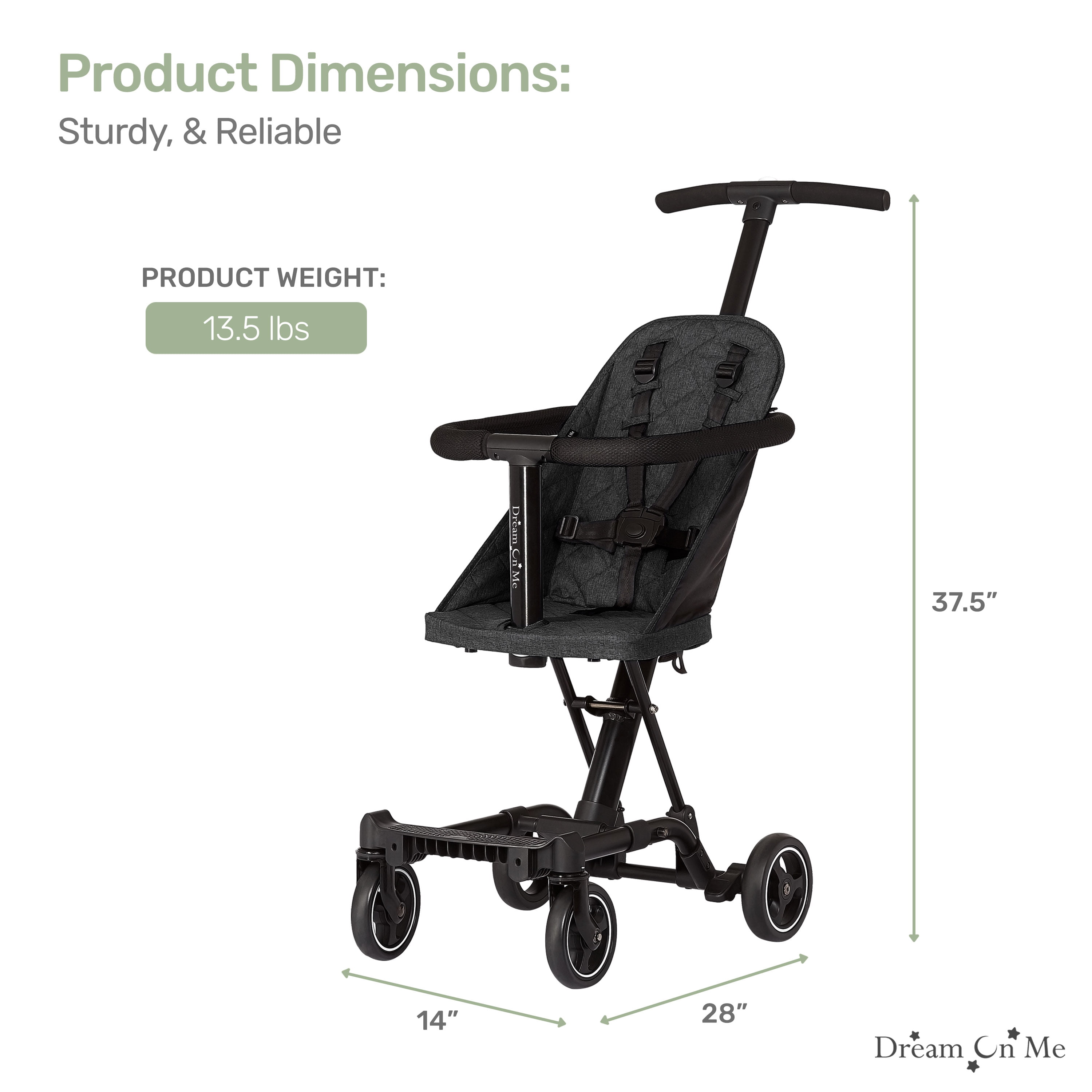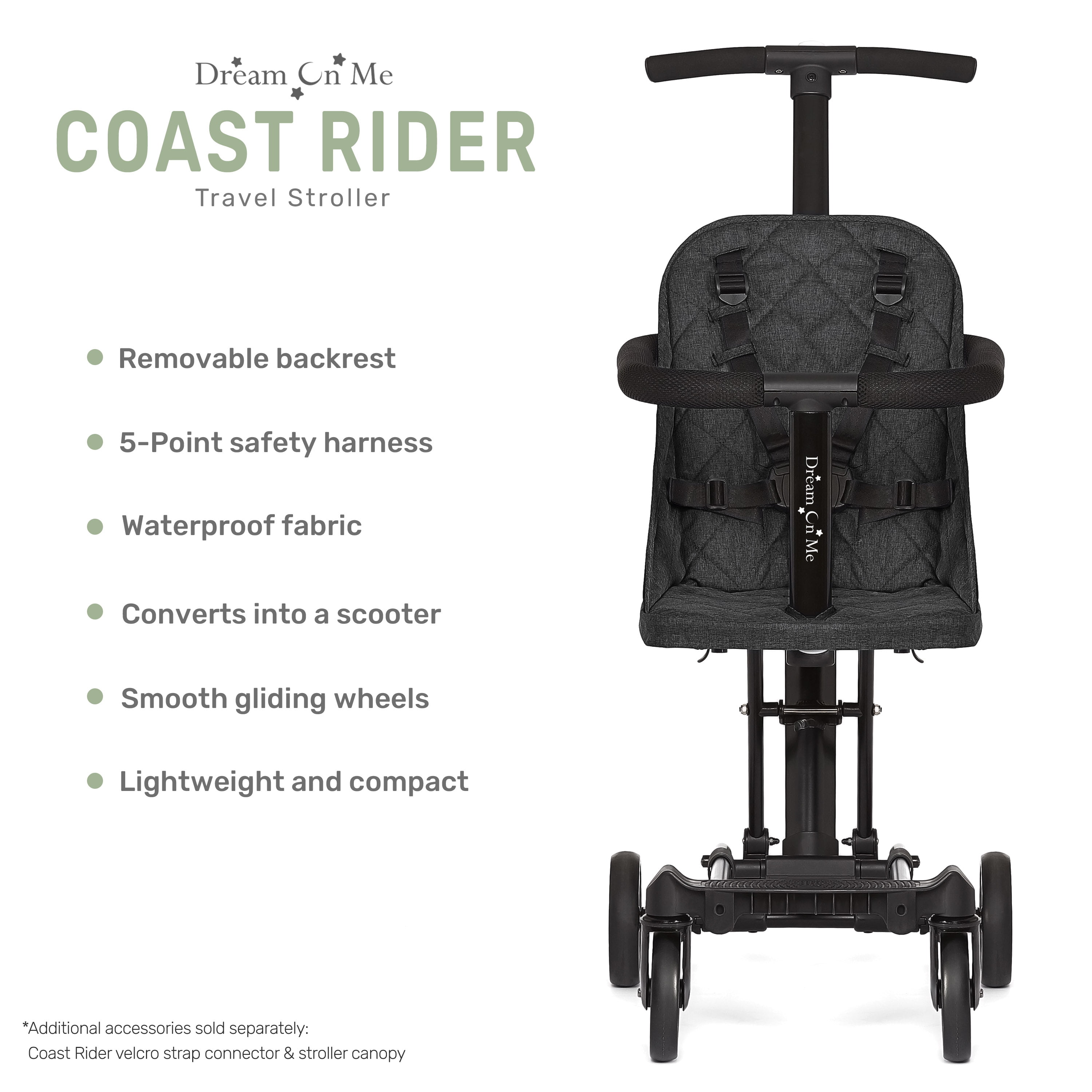 Dream On Me Coast Rider Travel Stroller with Removable Seat, Black Removable seat allows for conversion from a standard stroller to a rider Lightweight and sturdy aluminum frame Easily attaches to standard sized strollers using velcro strap connector (sold separately) Soft Ride wheels for less pushing effort and comfort for child Folds inward like a book with just one hand Folds down to a seat scooter Canopy sold separately Can be used as a walk-behind walker Easy to assemble, no tools required