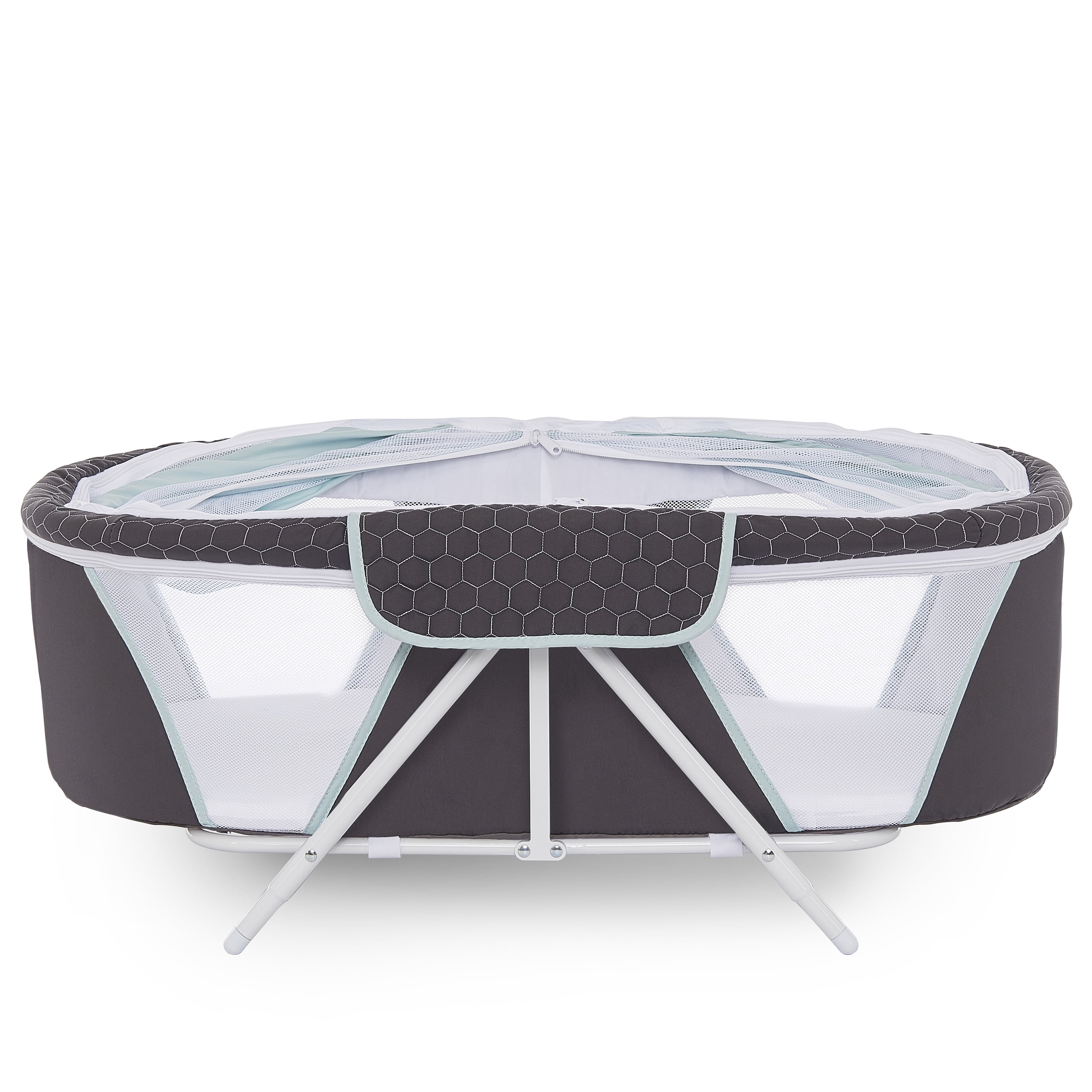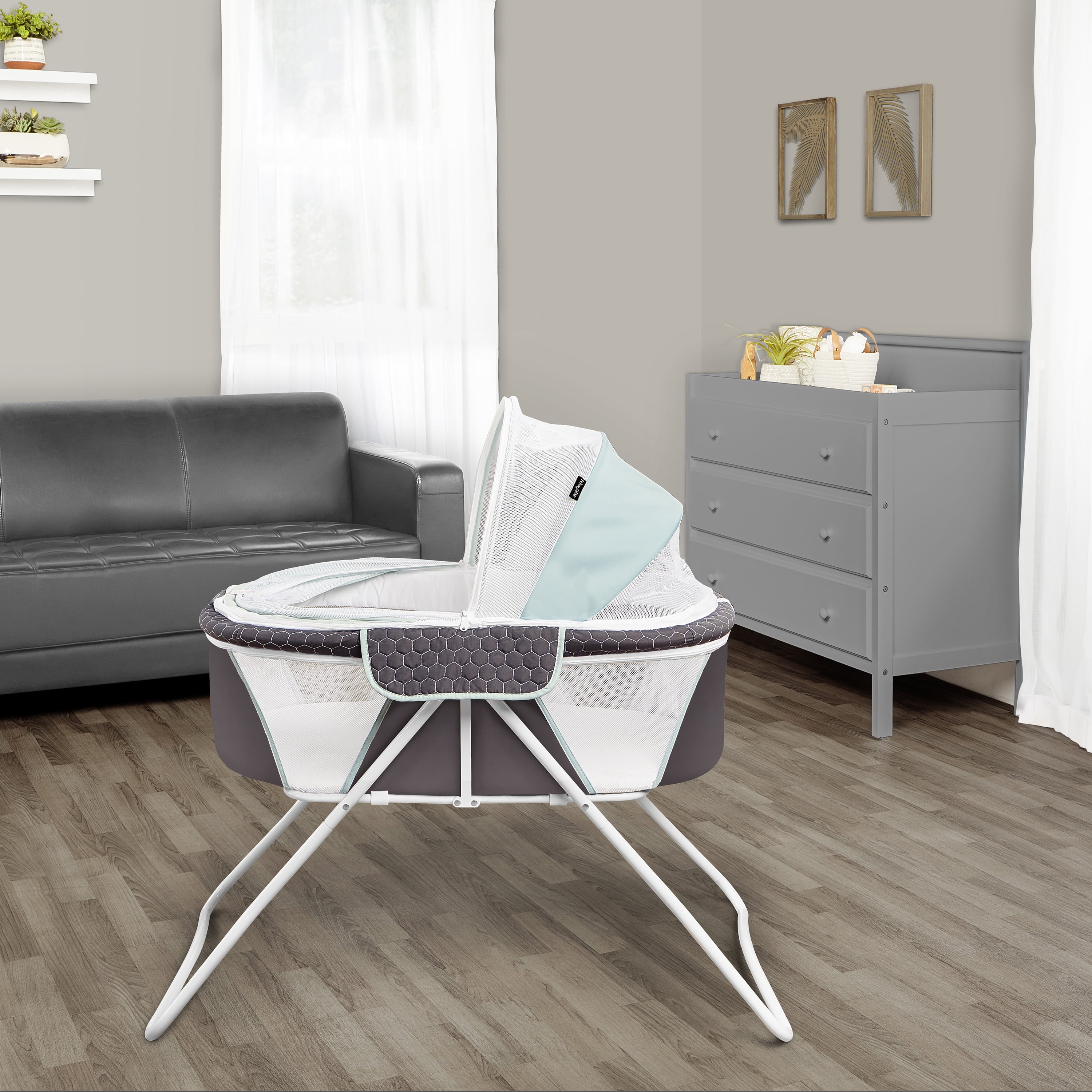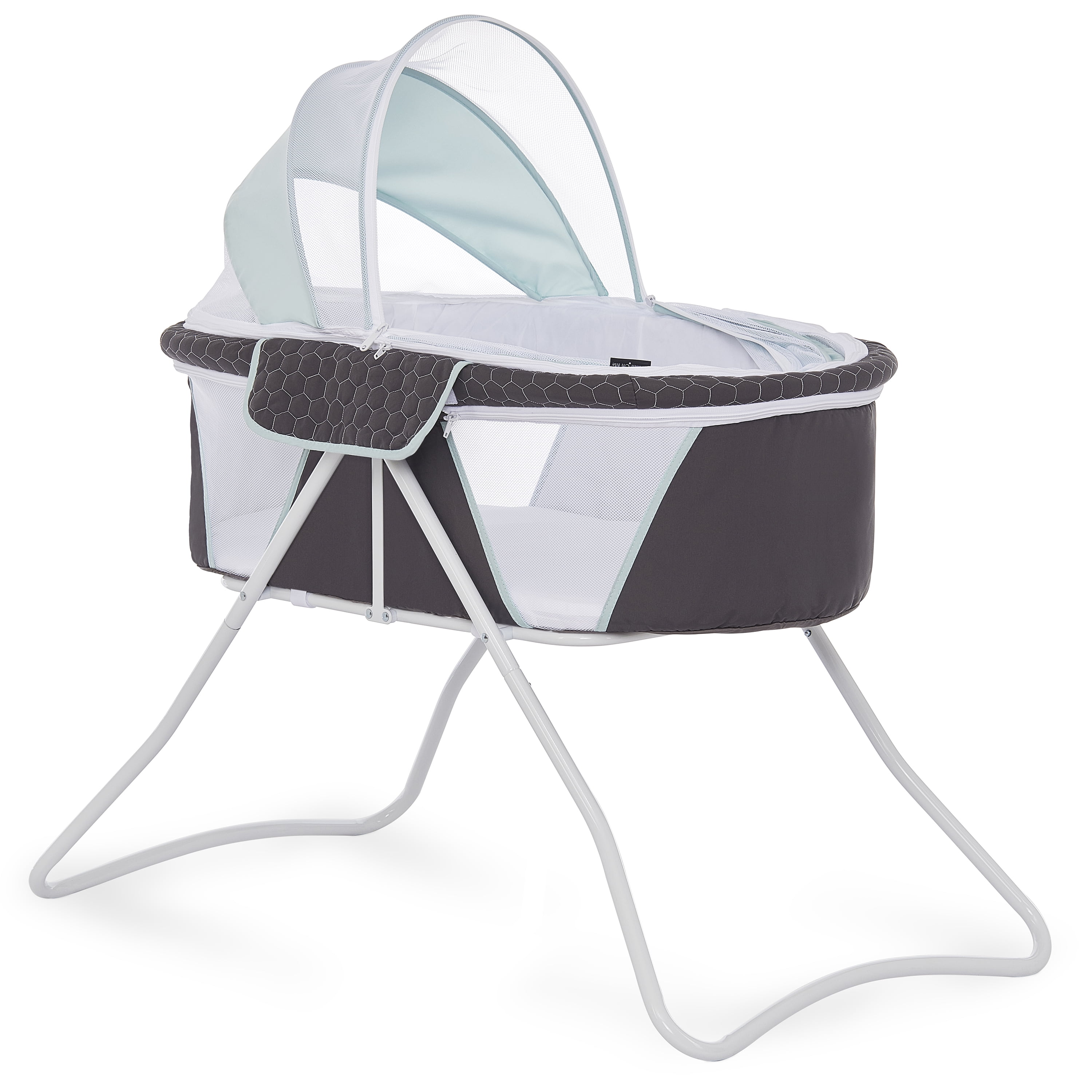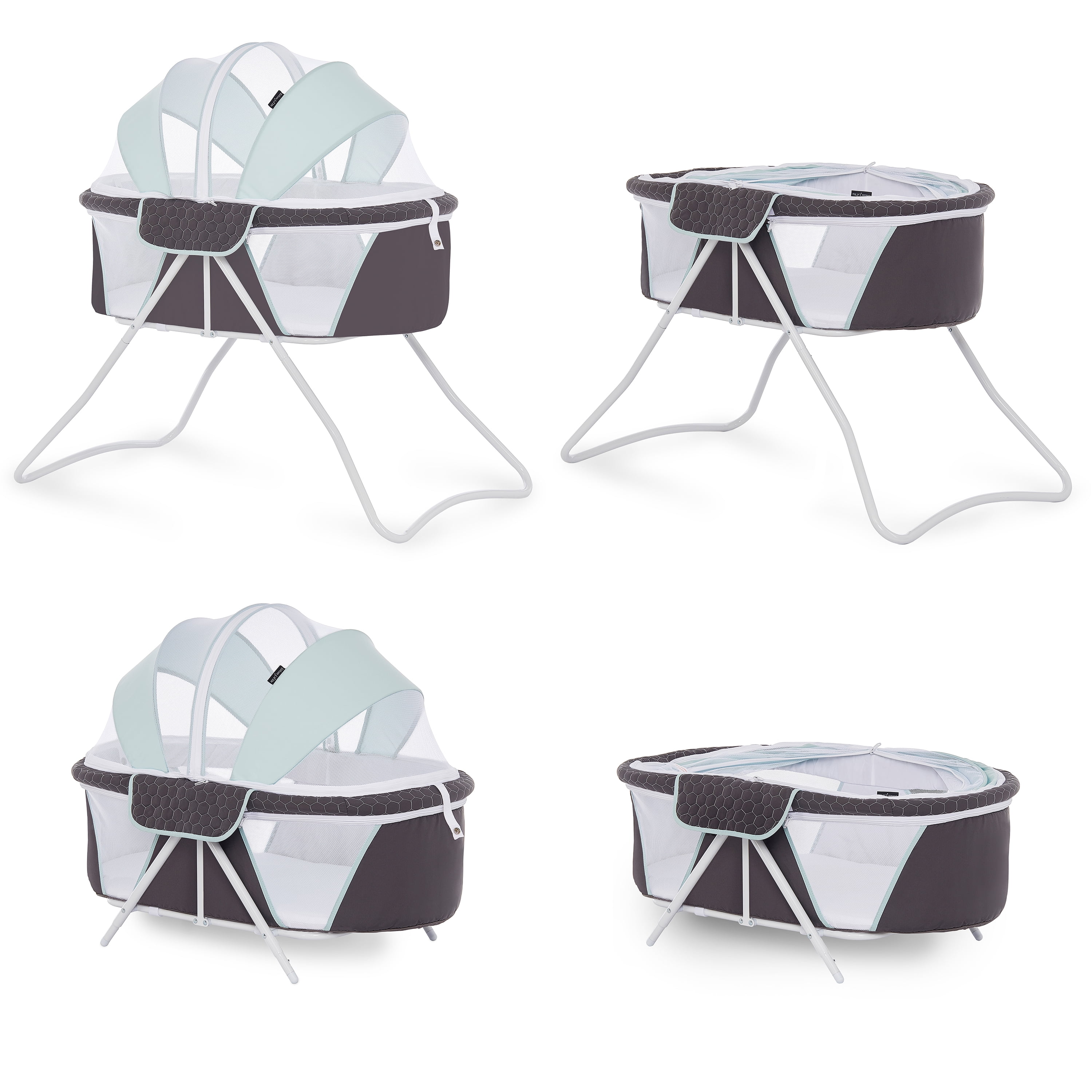 Day Dreamer Portable Bassinet easily converts to a Floor Bassinet for utmost visibility. Bassinet is made of a polyester foam fabric Features a double canopy with a sleeping pad. Sturdy yet lightweight frame, the bassinet comes packed with breathable mesh sides for airflow and visibility Easy-to-fold mechanism and a durable travel bag The bassinet is meant for children weight up to 25 lbs. This bassinet has a flat surface without any incline.