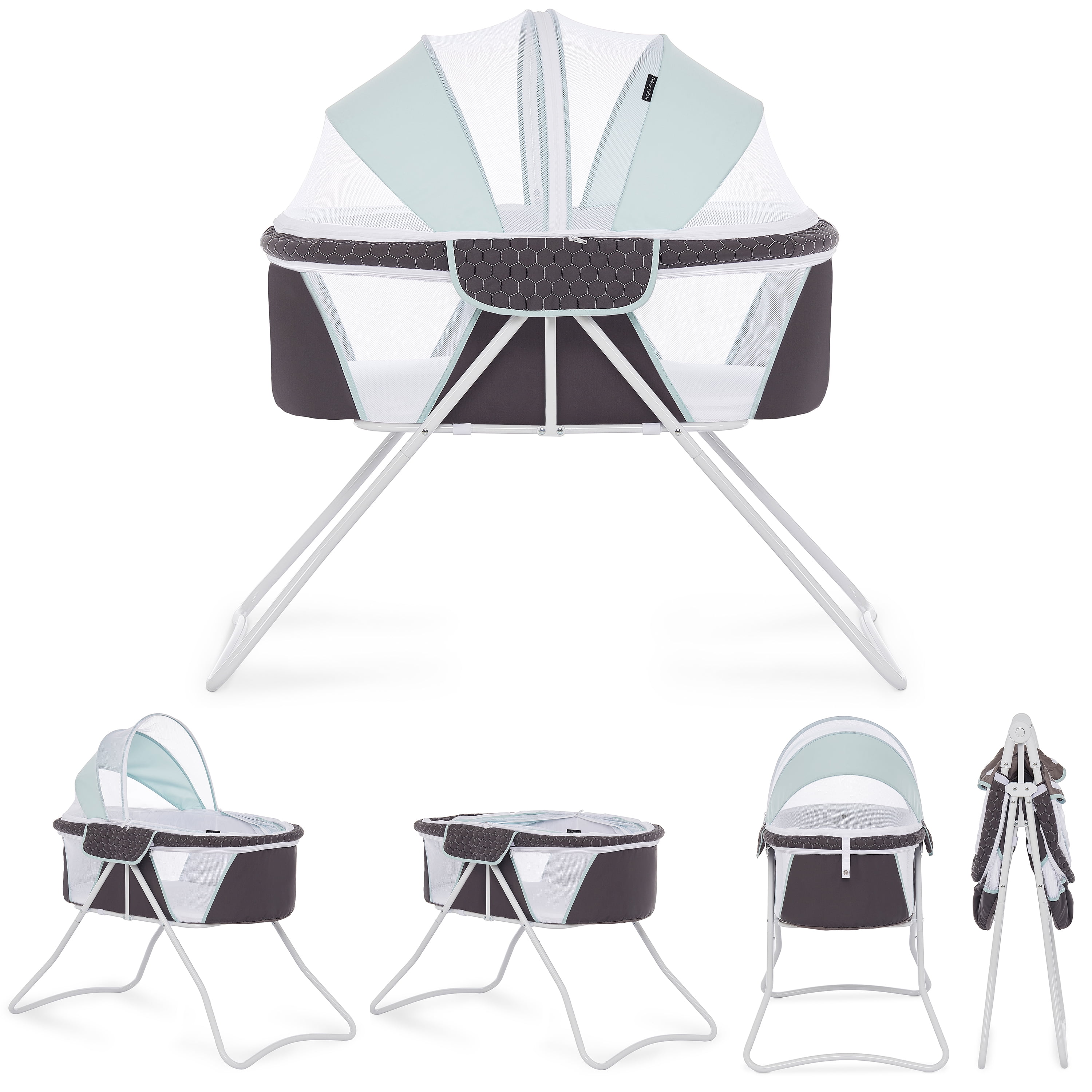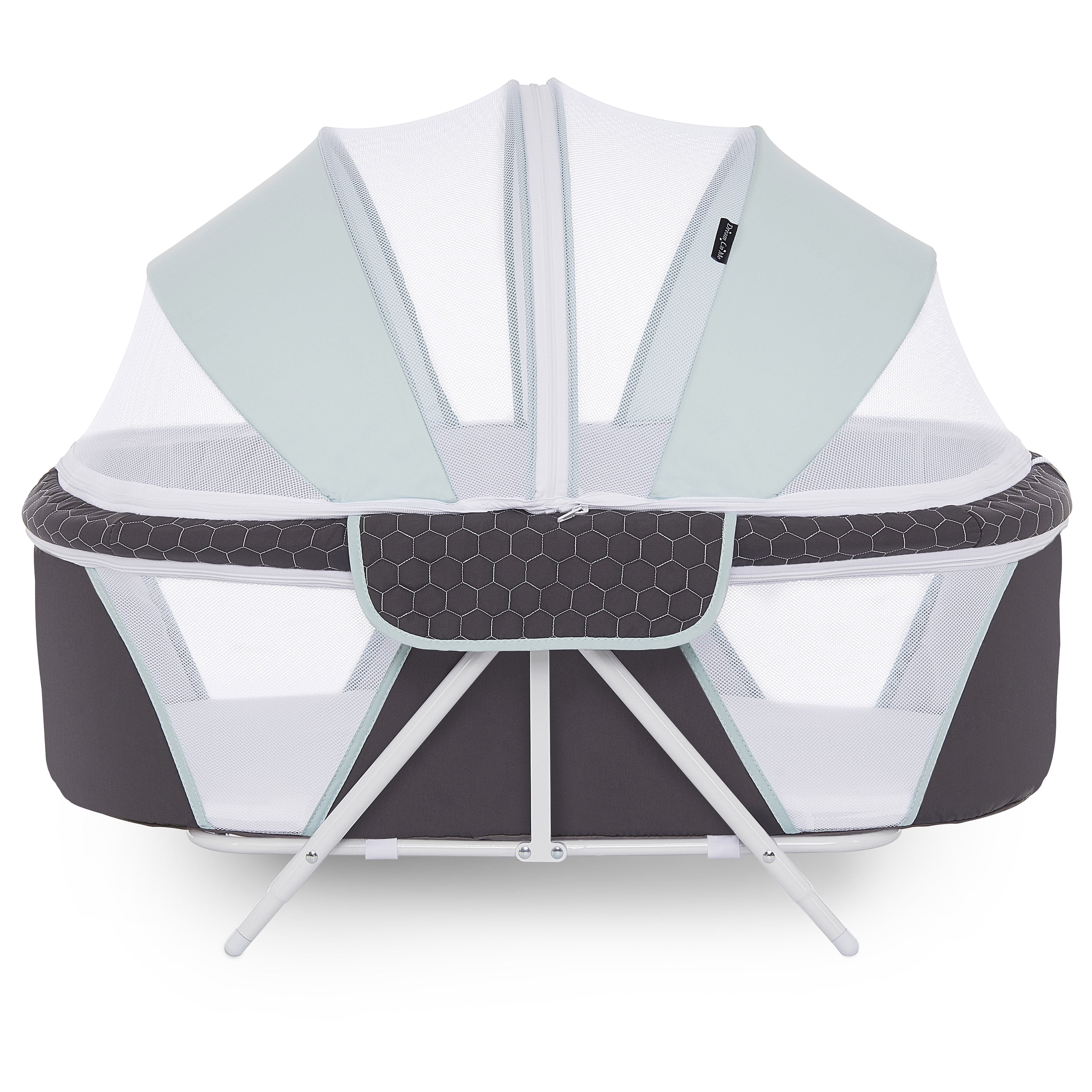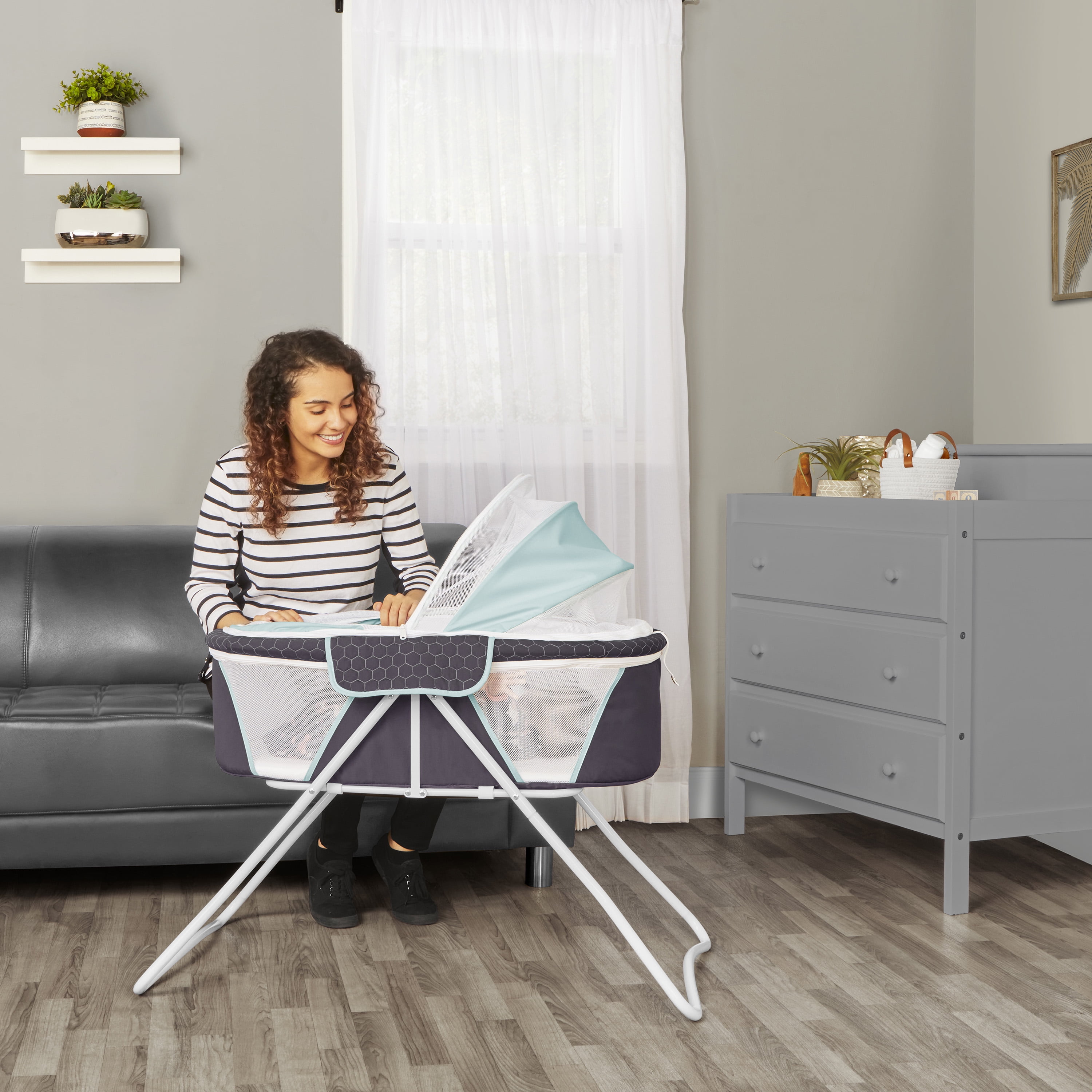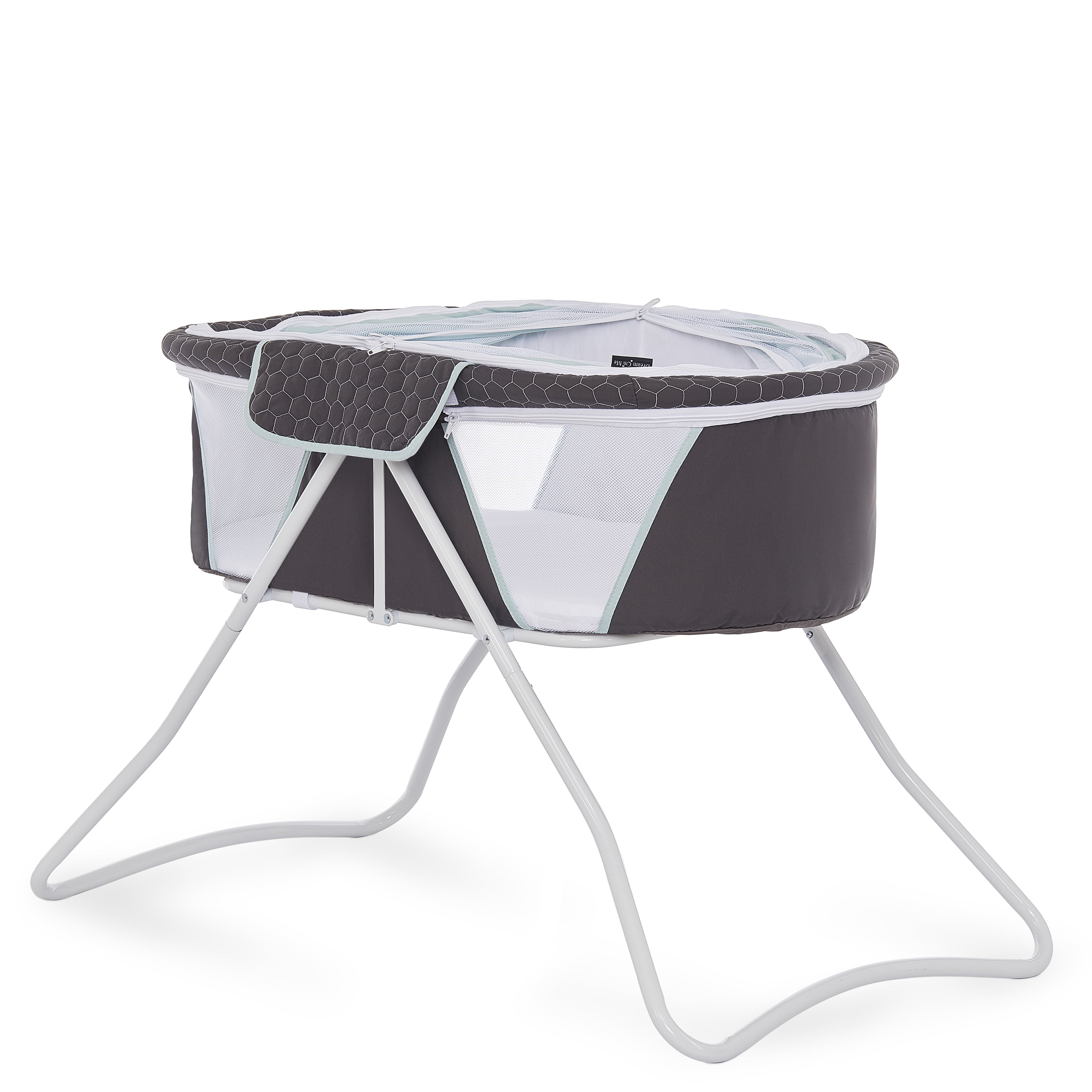 Day Dreamer Portable Bassinet easily converts to a Floor Bassinet for utmost visibility. Bassinet is made of a polyester foam fabric Features a double canopy with a sleeping pad. Sturdy yet lightweight frame, the bassinet comes packed with breathable mesh sides for airflow and visibility Easy-to-fold mechanism and a durable travel bag The bassinet is meant for children weight up to 25 lbs. This bassinet has a flat surface without any incline.