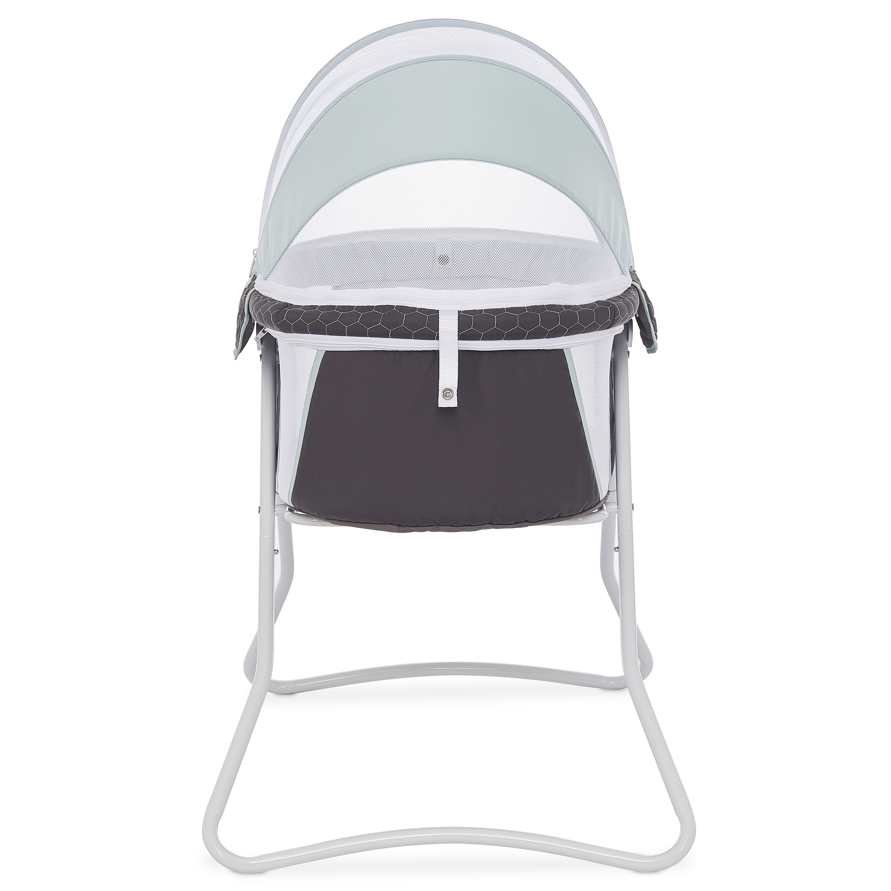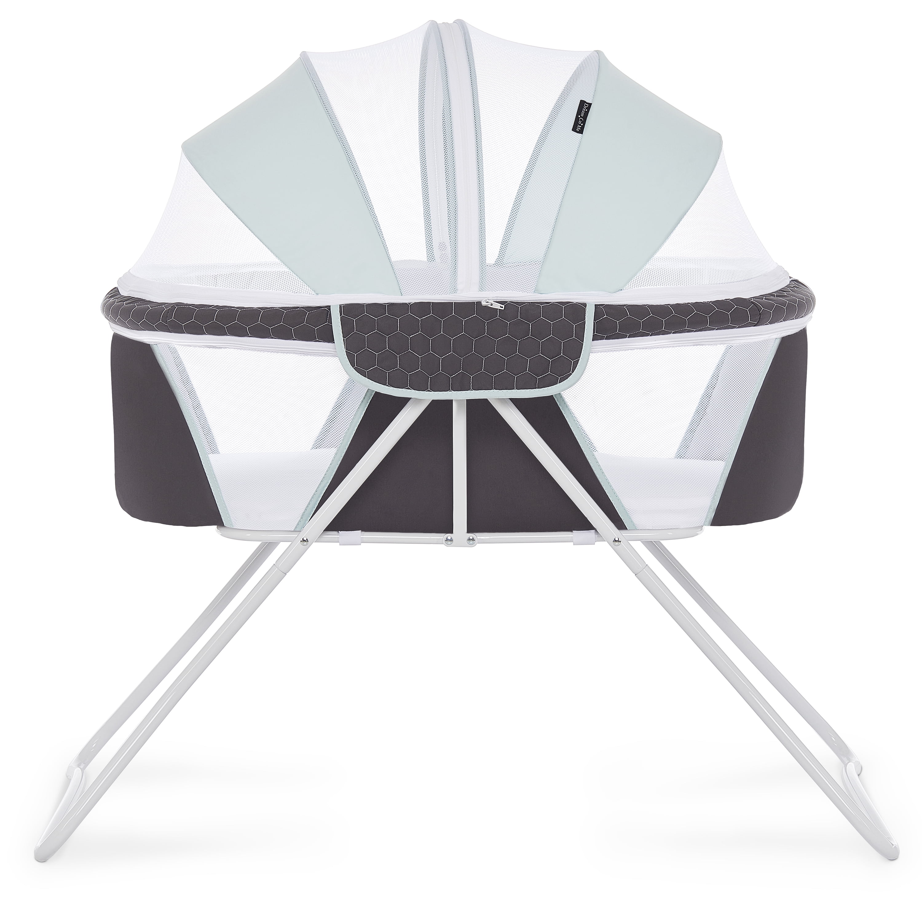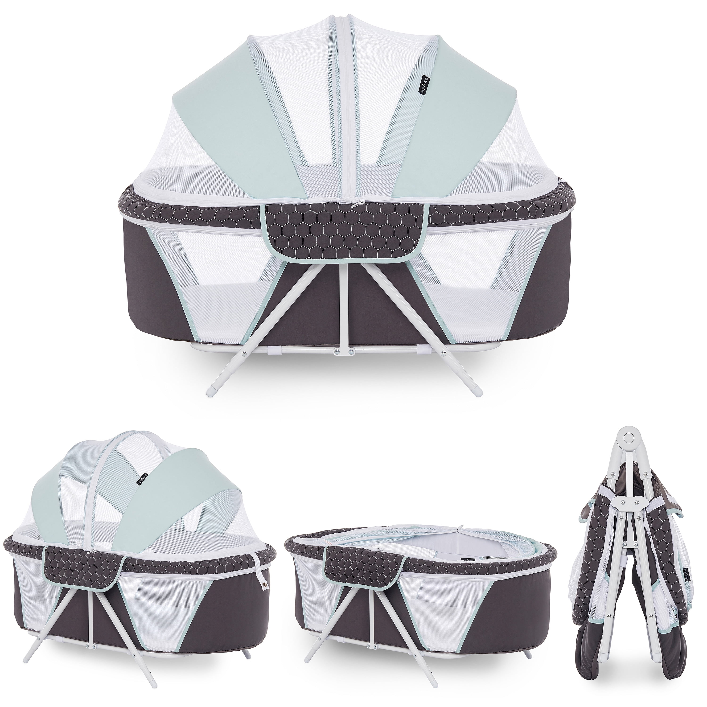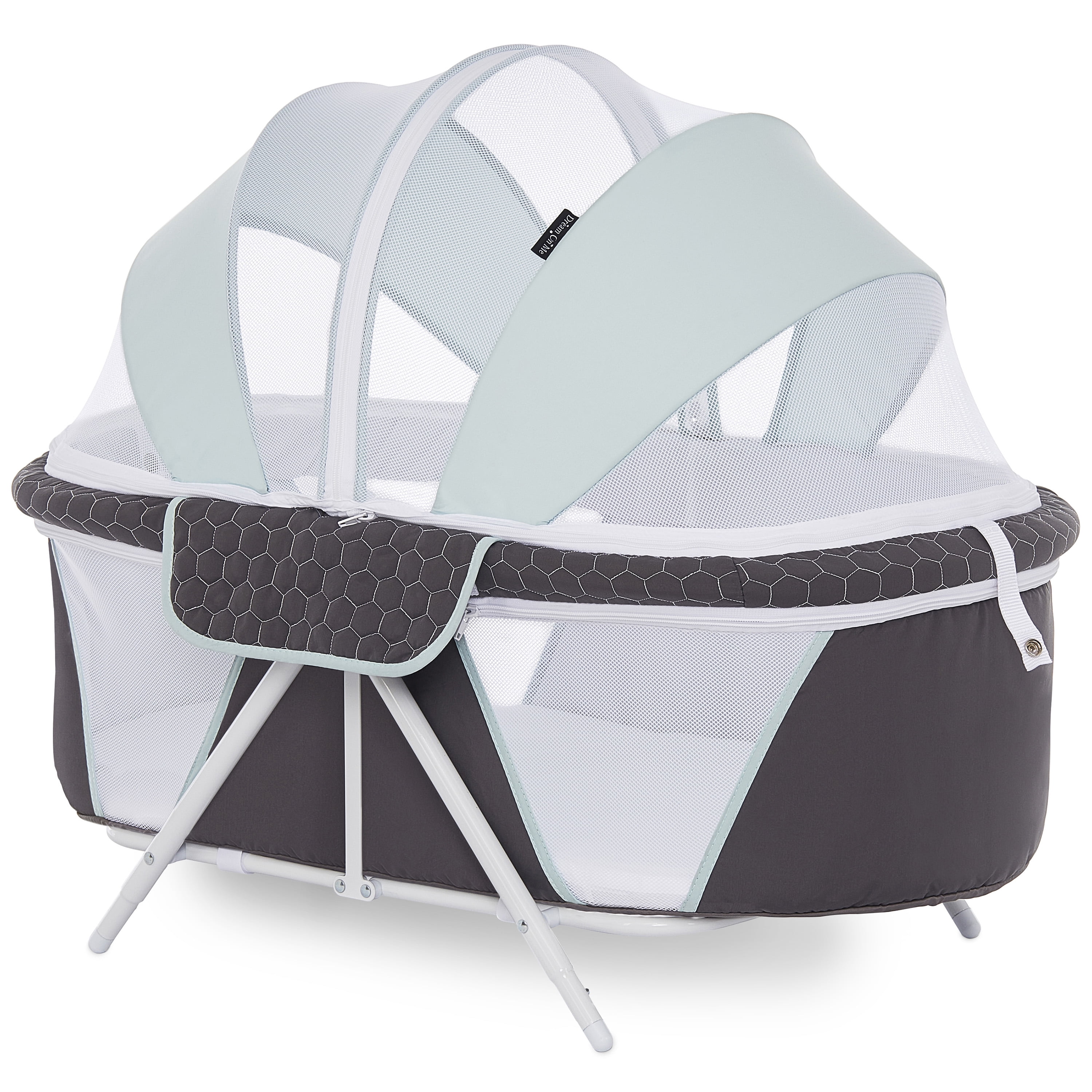 Day Dreamer Portable Bassinet easily converts to a Floor Bassinet for utmost visibility. Bassinet is made of a polyester foam fabric Features a double canopy with a sleeping pad. Sturdy yet lightweight frame, the bassinet comes packed with breathable mesh sides for airflow and visibility Easy-to-fold mechanism and a durable travel bag The bassinet is meant for children weight up to 25 lbs. This bassinet has a flat surface without any incline.