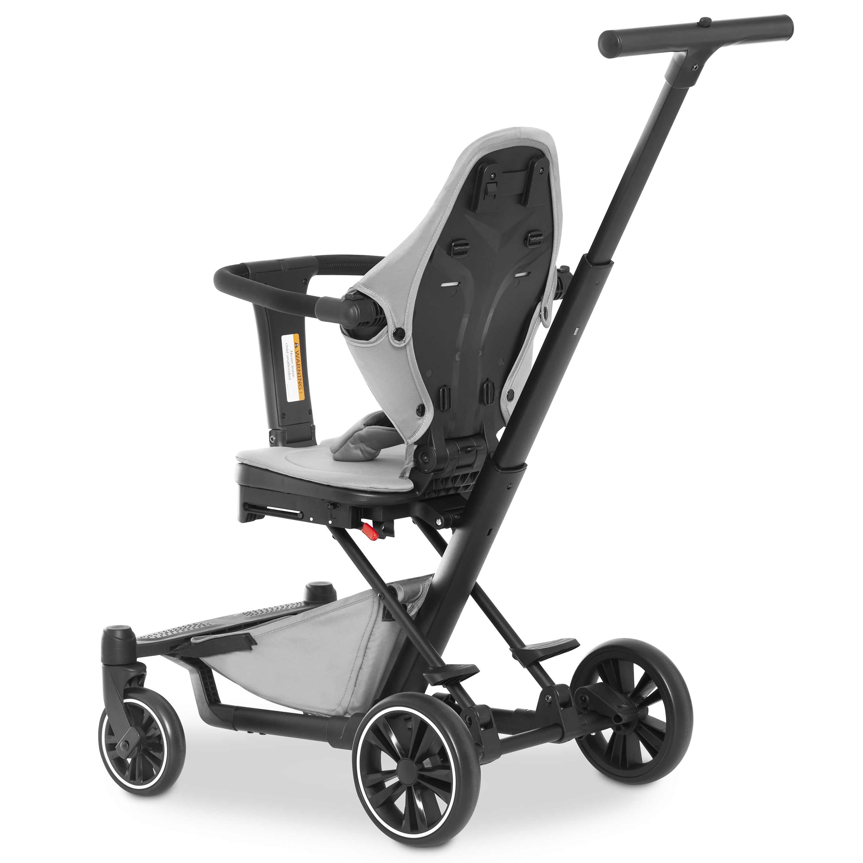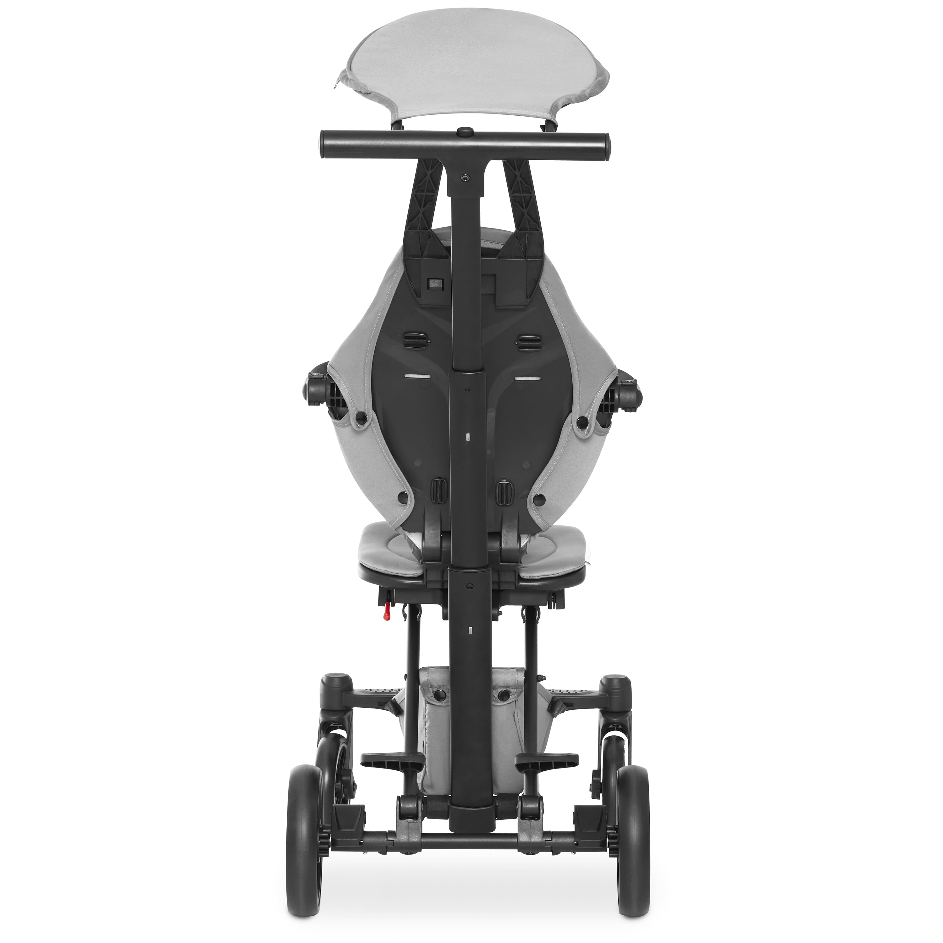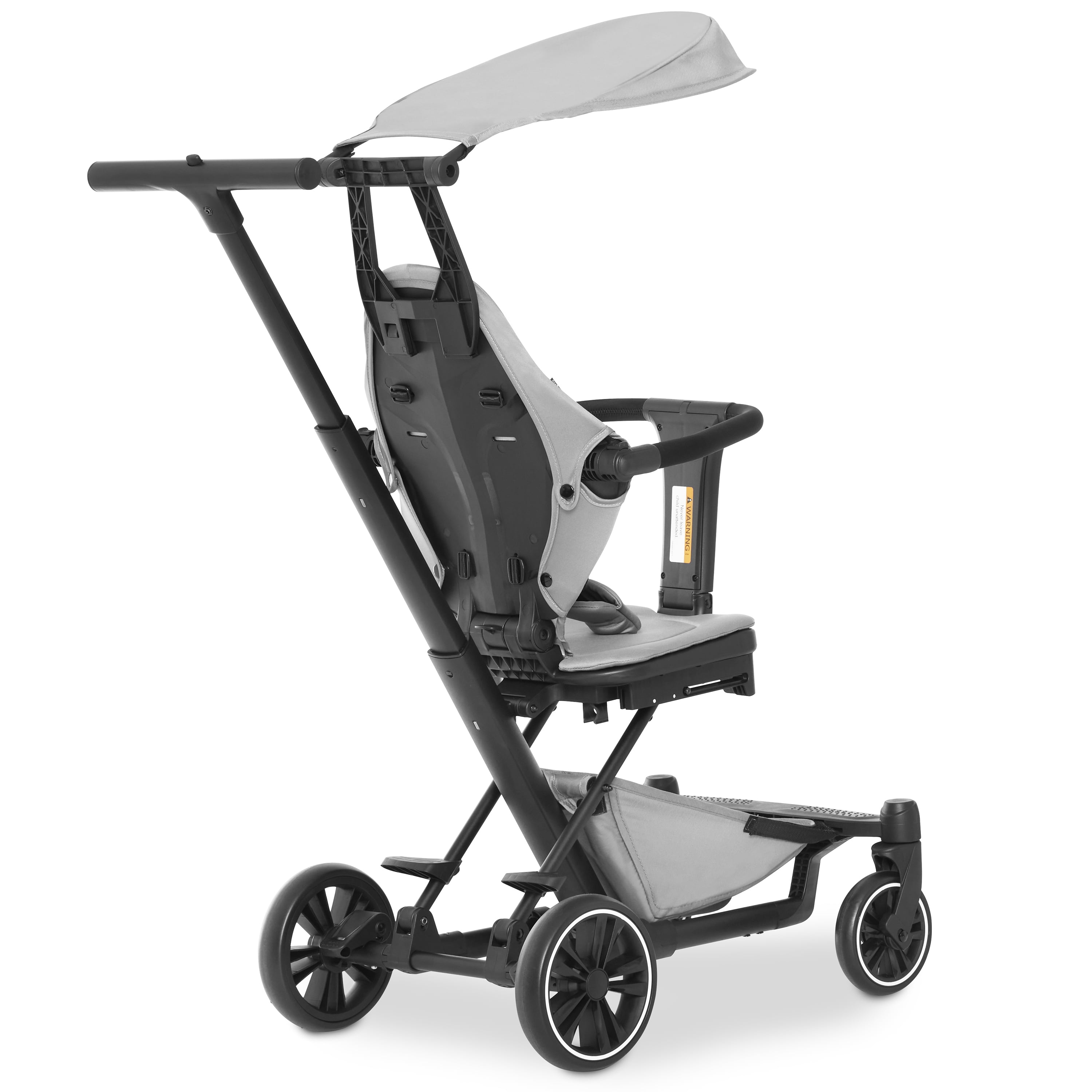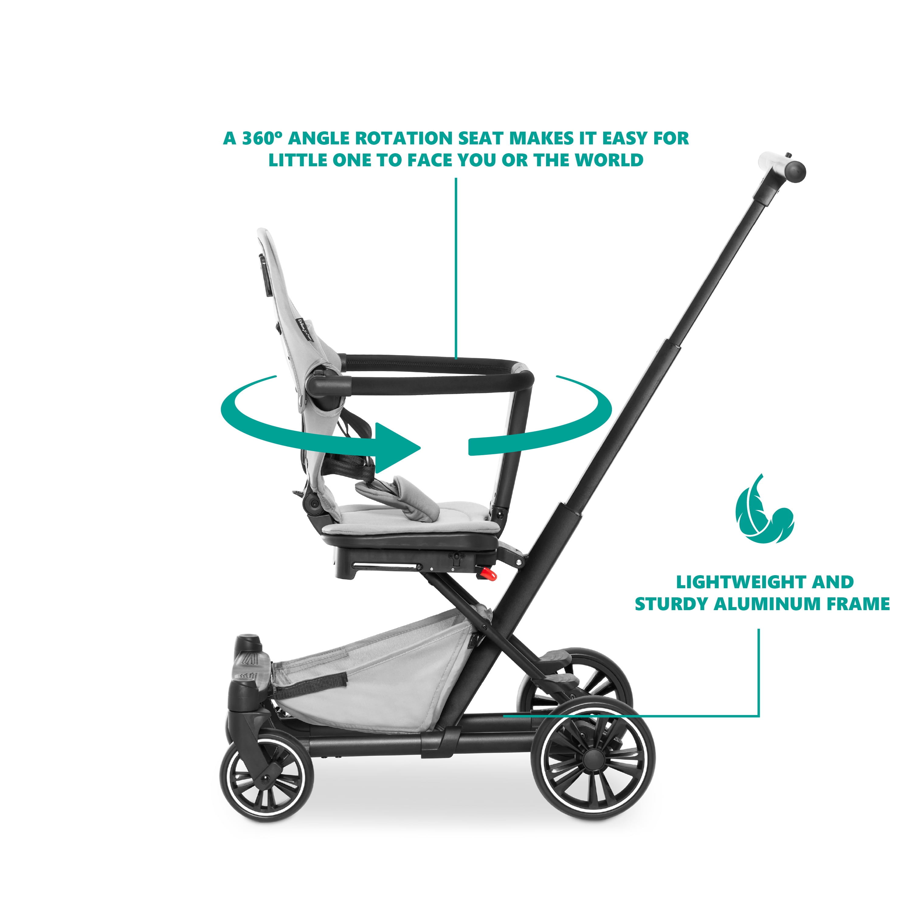 360-angle rotation seat makes it easy for little one to face you or the world. Lightweight and sturdy Aluminum frame. Waterproof Fabric seat cover. Folds inward like a book with just one hand. Soft Ride wheels for less pushing effort and comfortable for child. Can be used as a sit-down scooter. Included canopy to protect from harmful rays. Wipe clean with mild soap and water if needed. Folded dimensions: 28 x 16.5 x 9.5″.