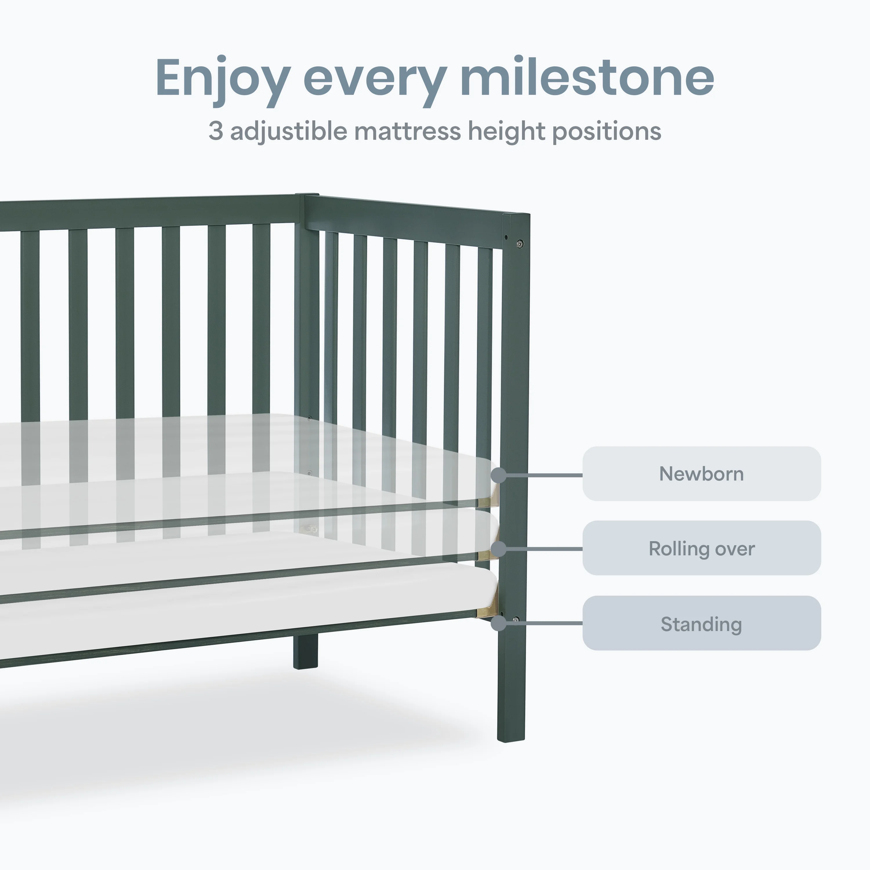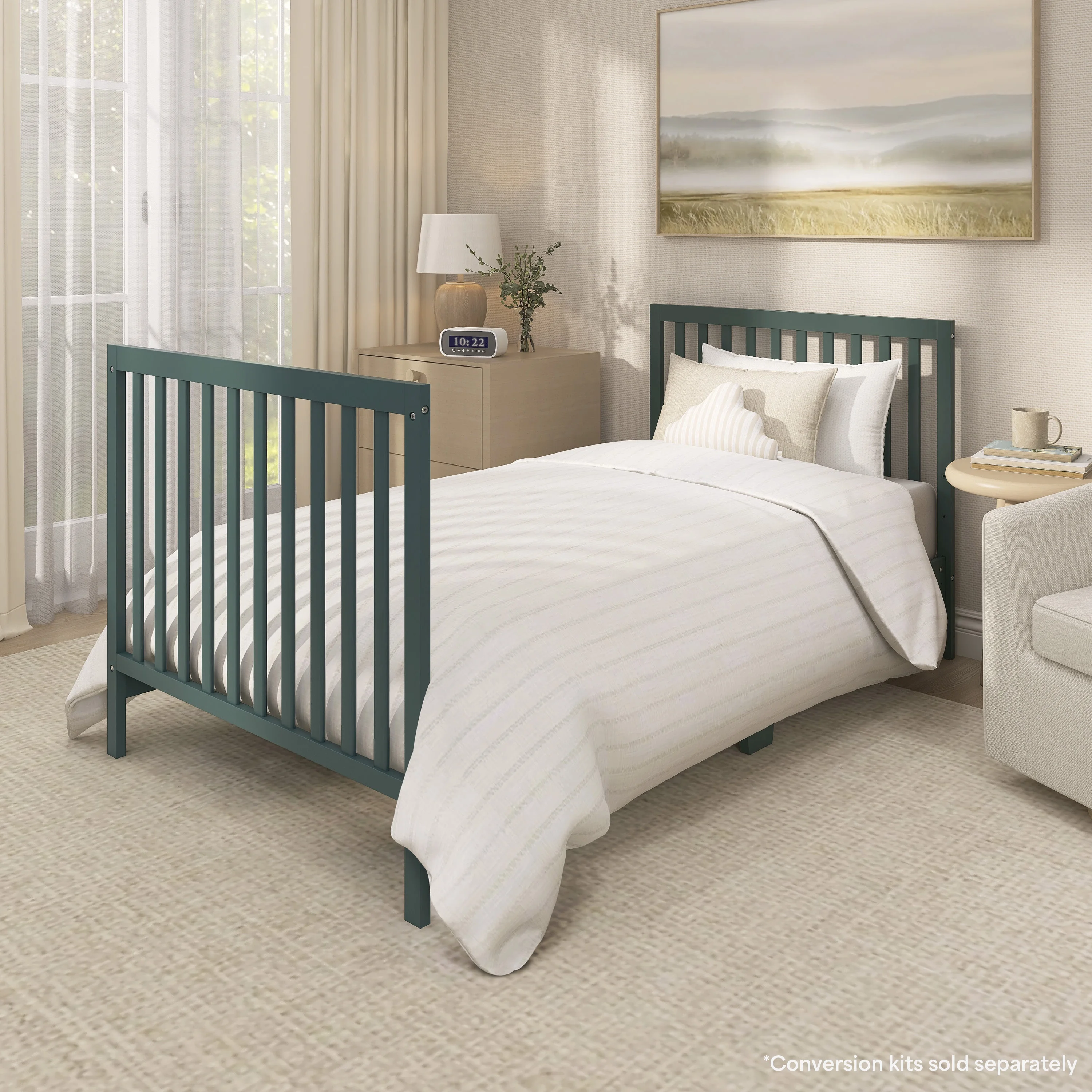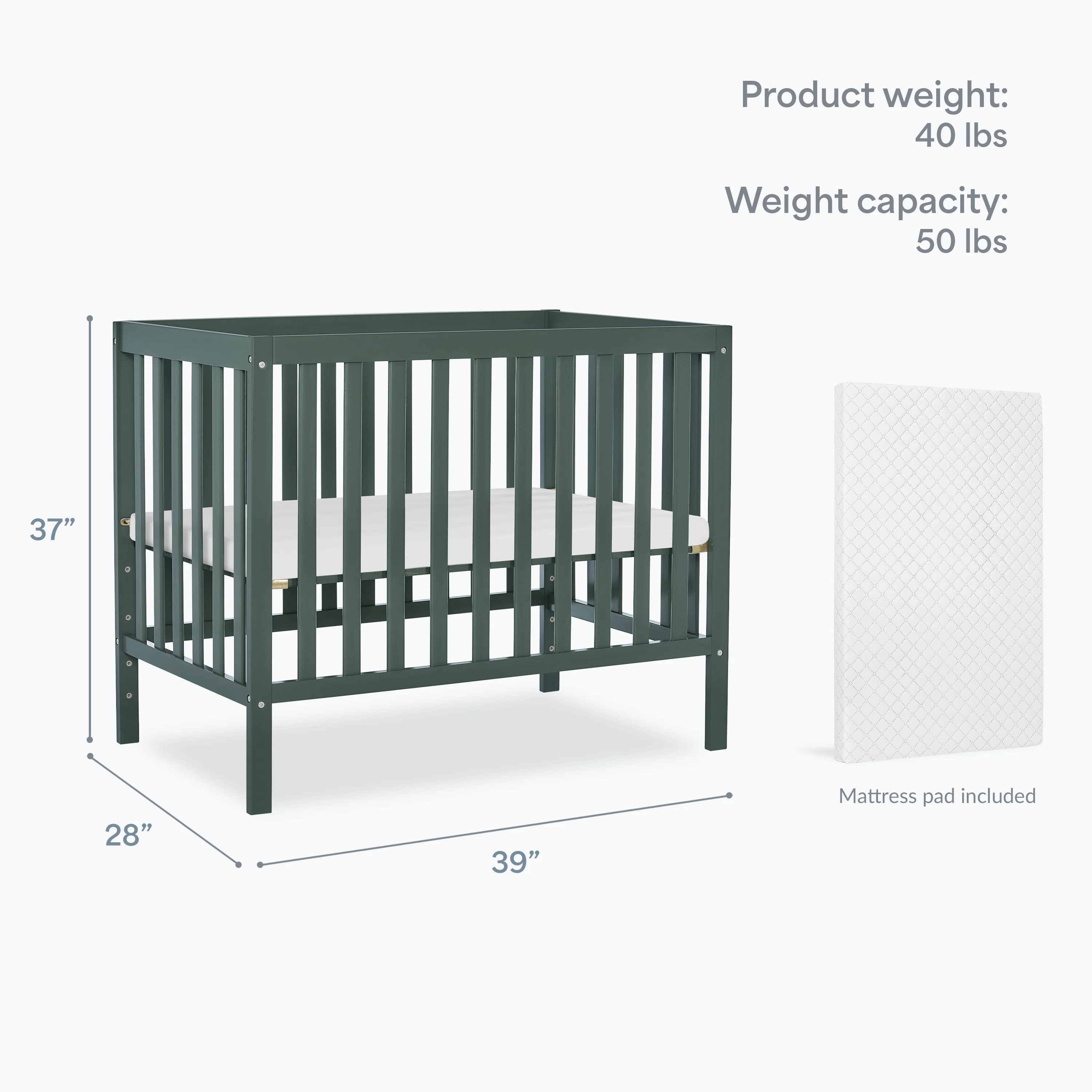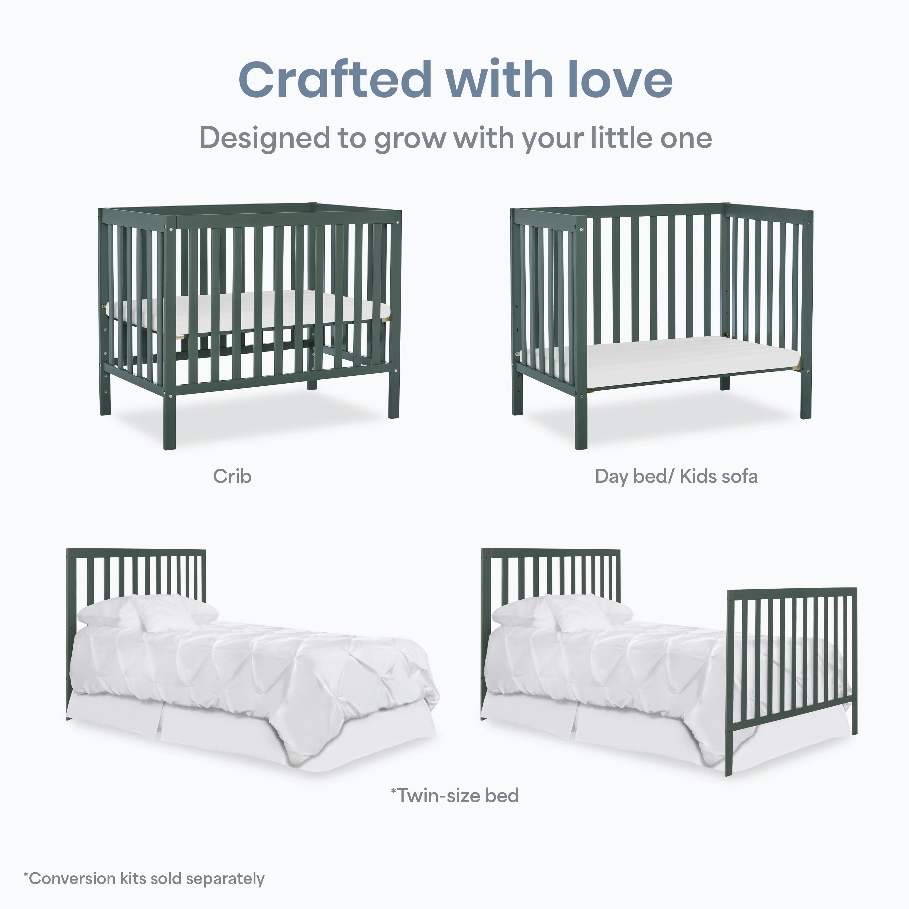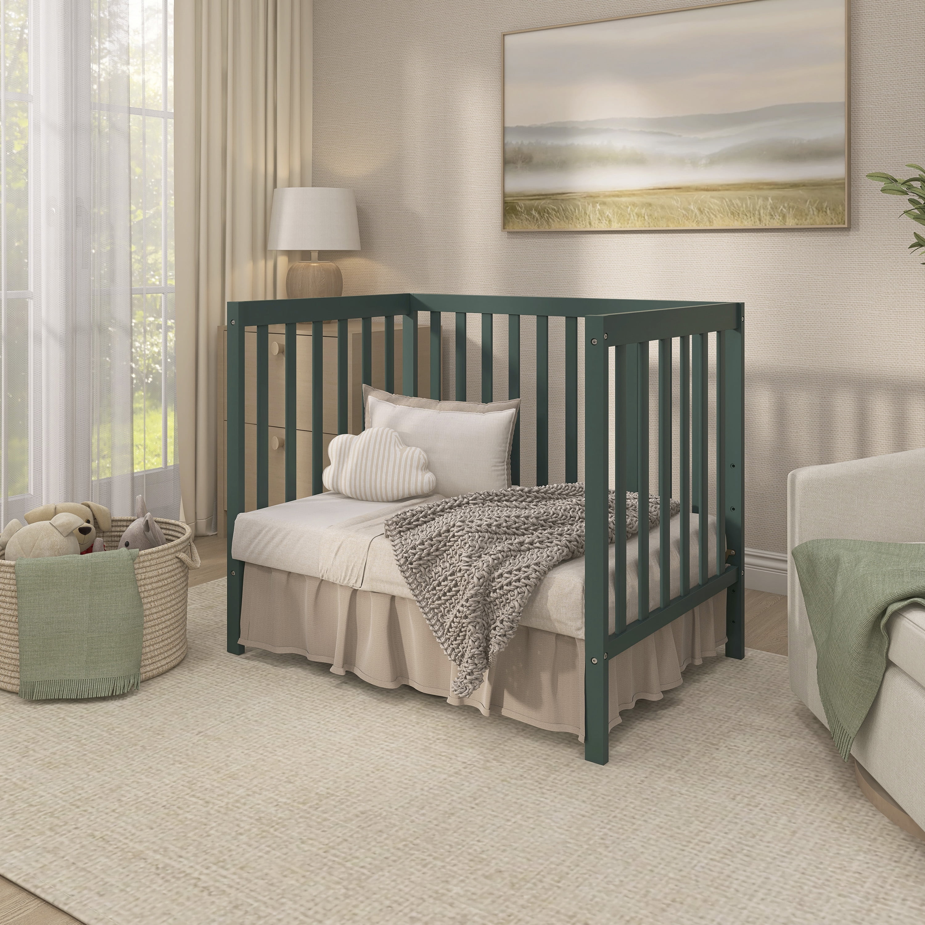 Dream On Me Edgewood 4 in 1 Convertible Mini Crib, Olive Easily converts from a mini crib to a day bed and as a twin size bed Tested for lead and other toxic elements to meet or exceed government and ASTM safety standards. All tools for assembly included. Combining bright patterns, textures rugs, dramatic potted plants, and whimsical woven rattan accessories to create a bohemian chic nursery. 3 position mattress support system. Solid pine wood finish. Weight Capacity: 50 lbs Non Full Size Mattress Sold Separately
