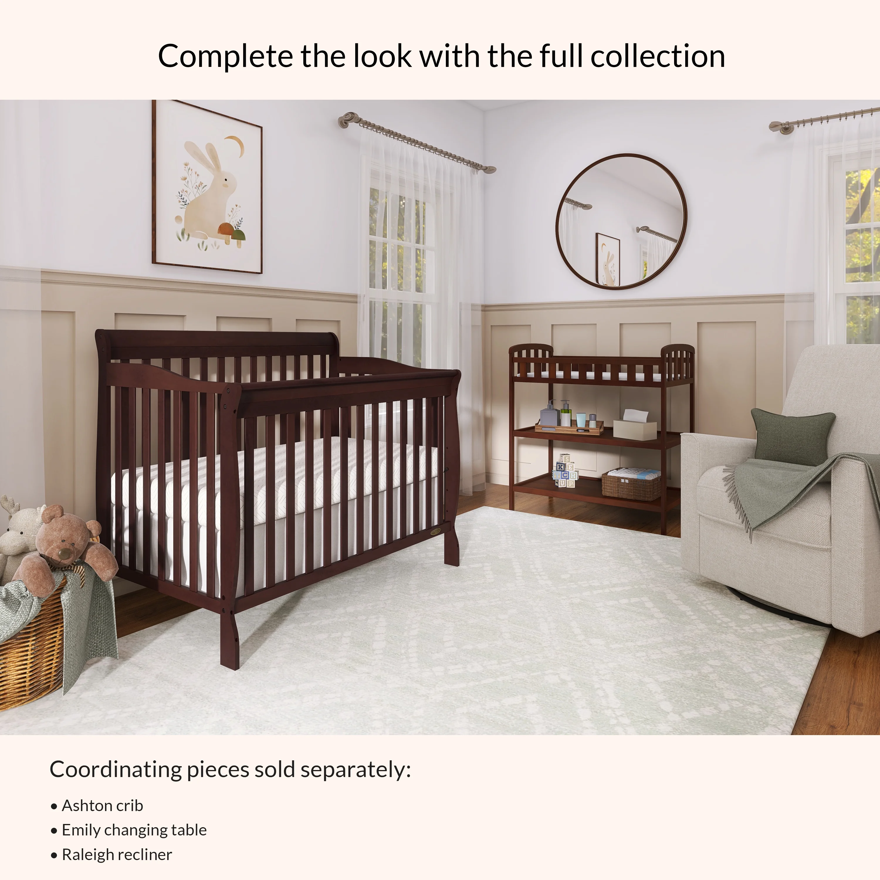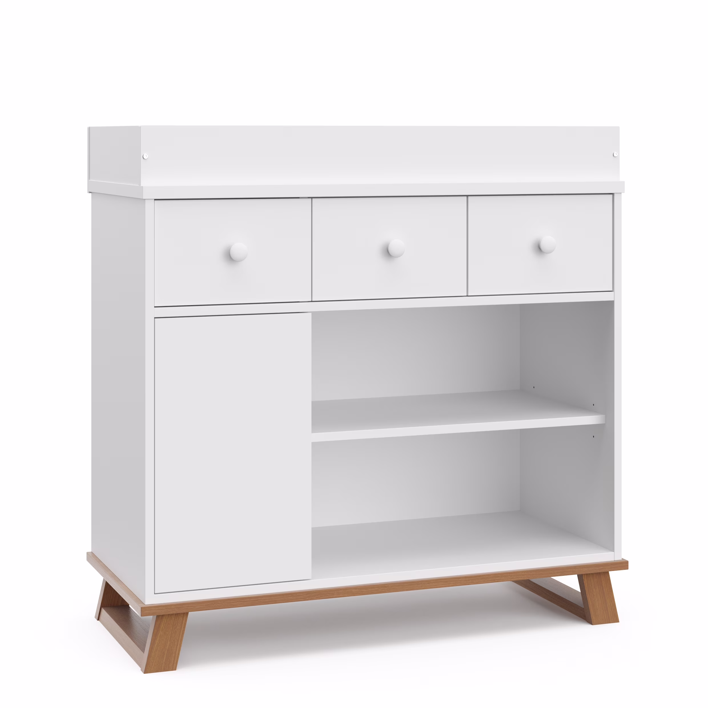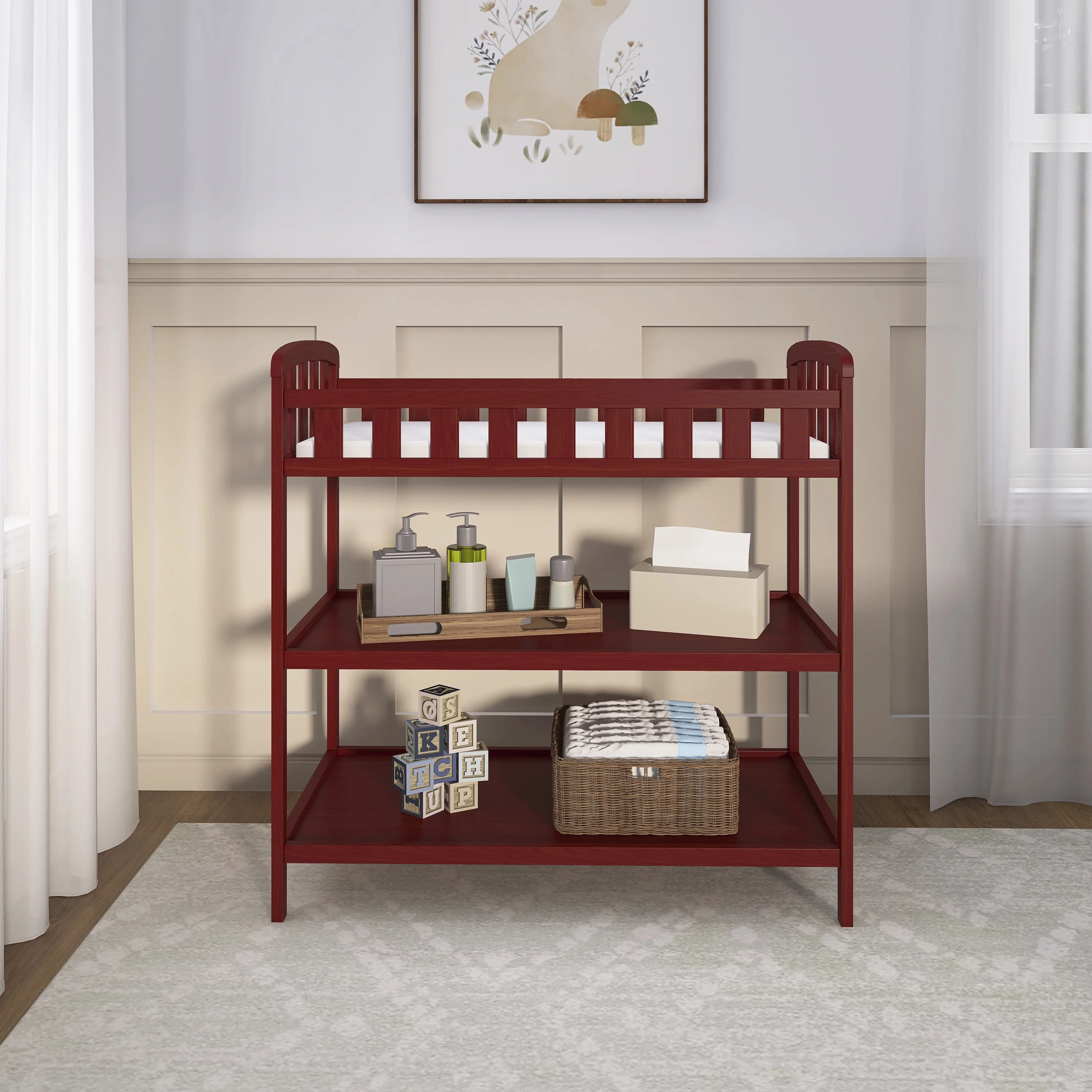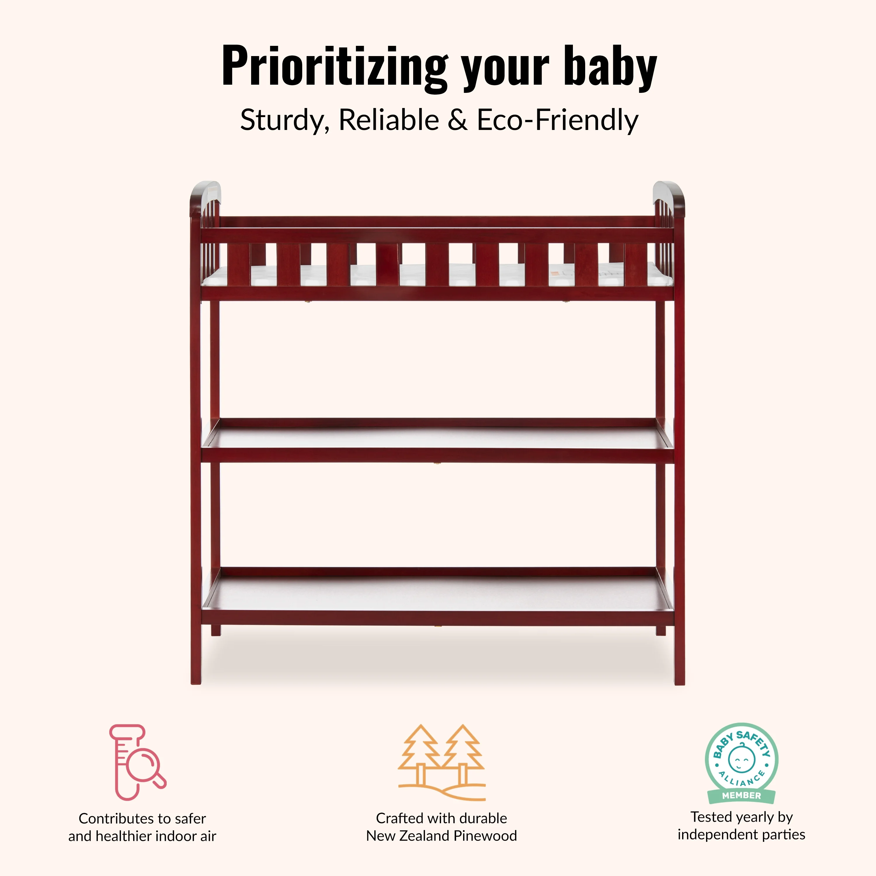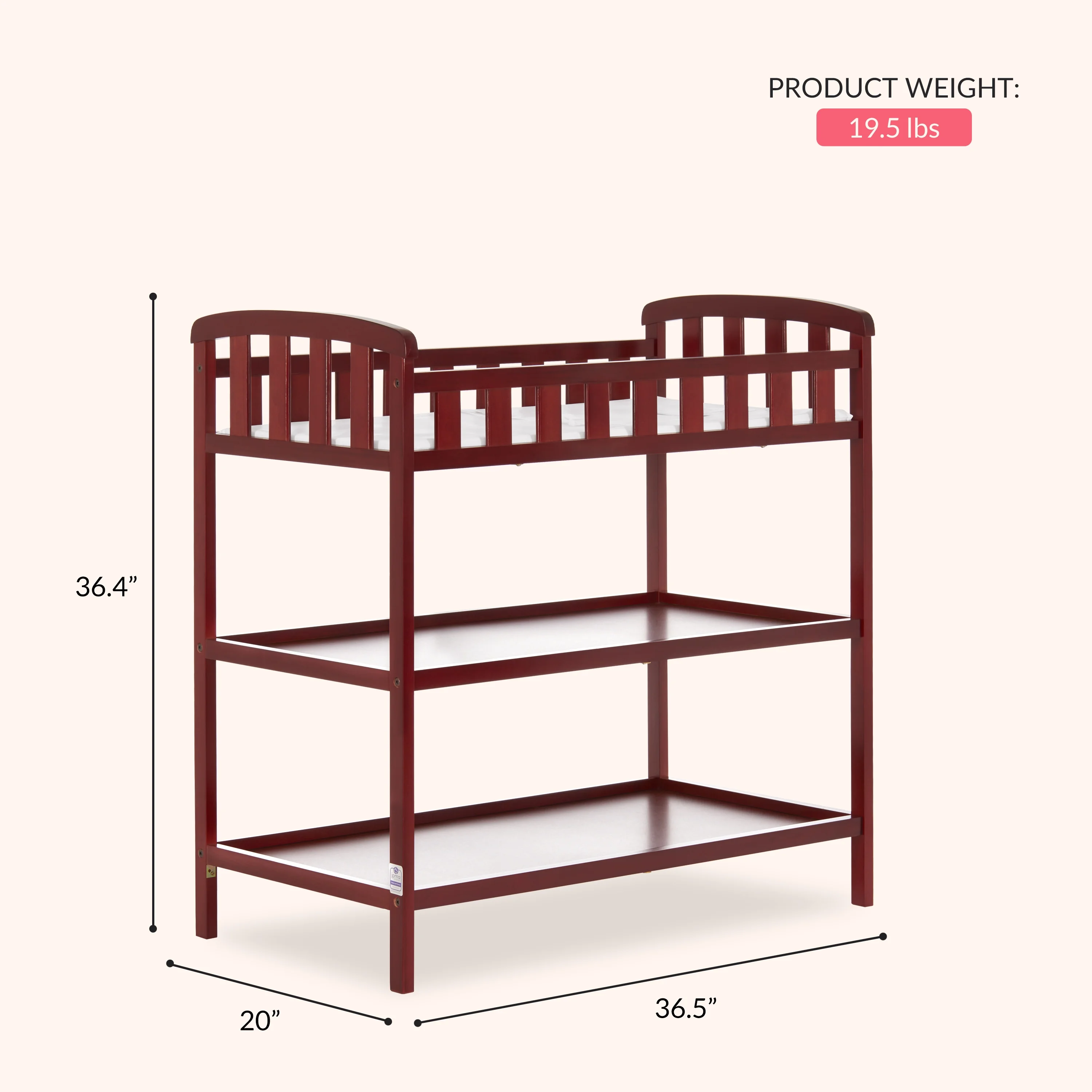 Traditional design in a solid pine wood construction Non-toxic finish Includes 1″ changing pad Features a safety strap Dimensions: 36.5″ L x 20″ W x 36.4″ H Meets all U.S. safety standards Assembly required (approximately 1 hour) Available in Cherry, Espresso, Natural, Steel Grey, White