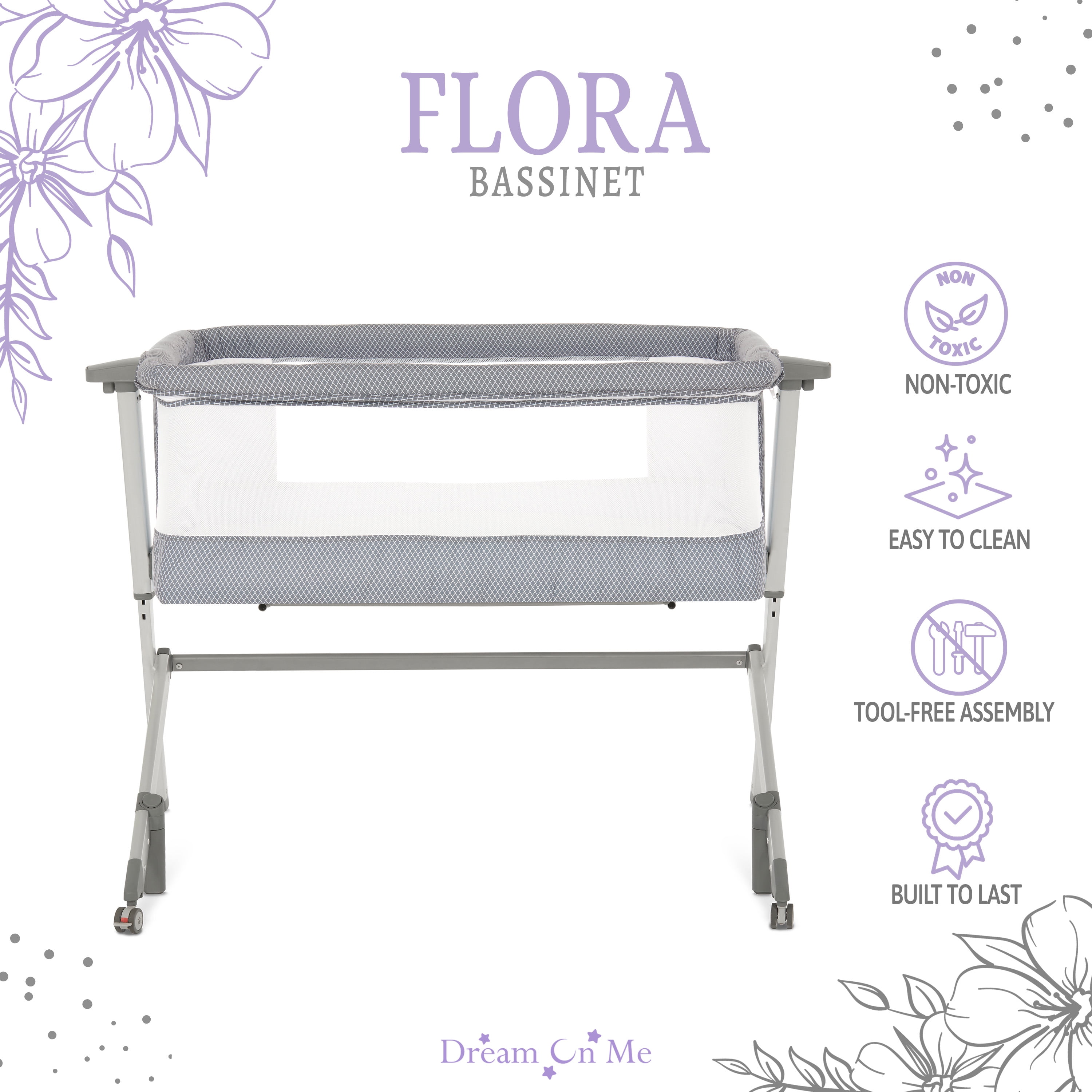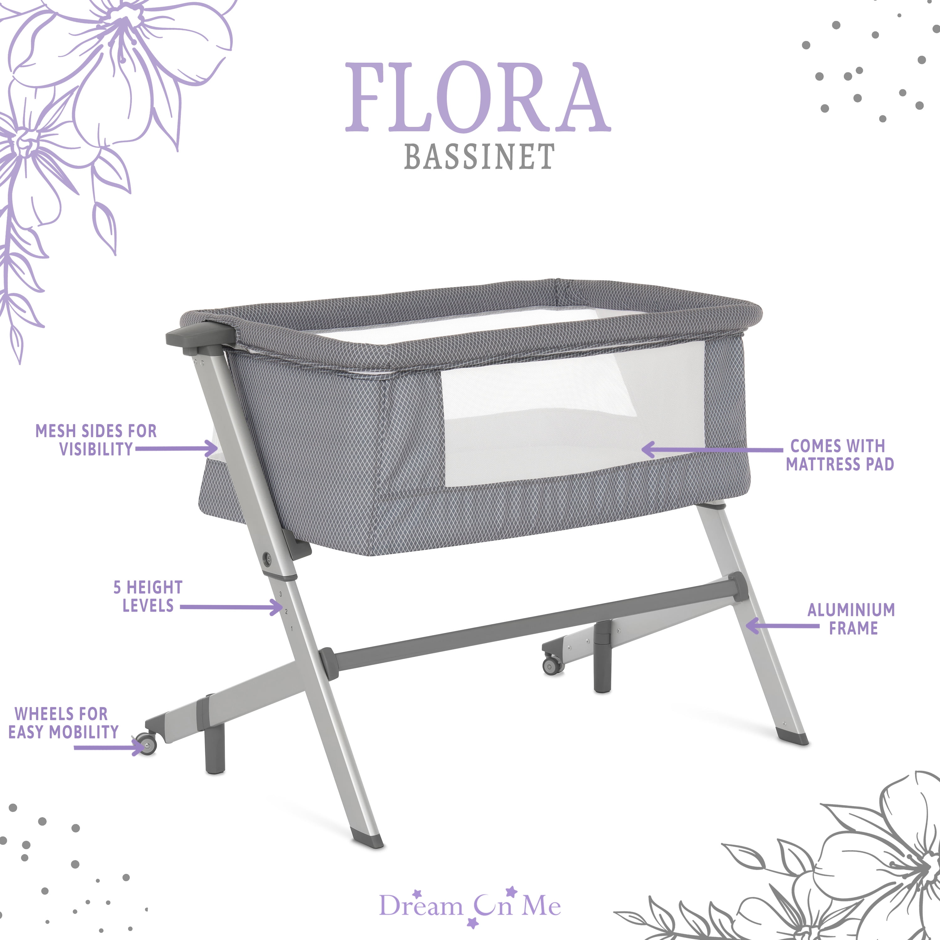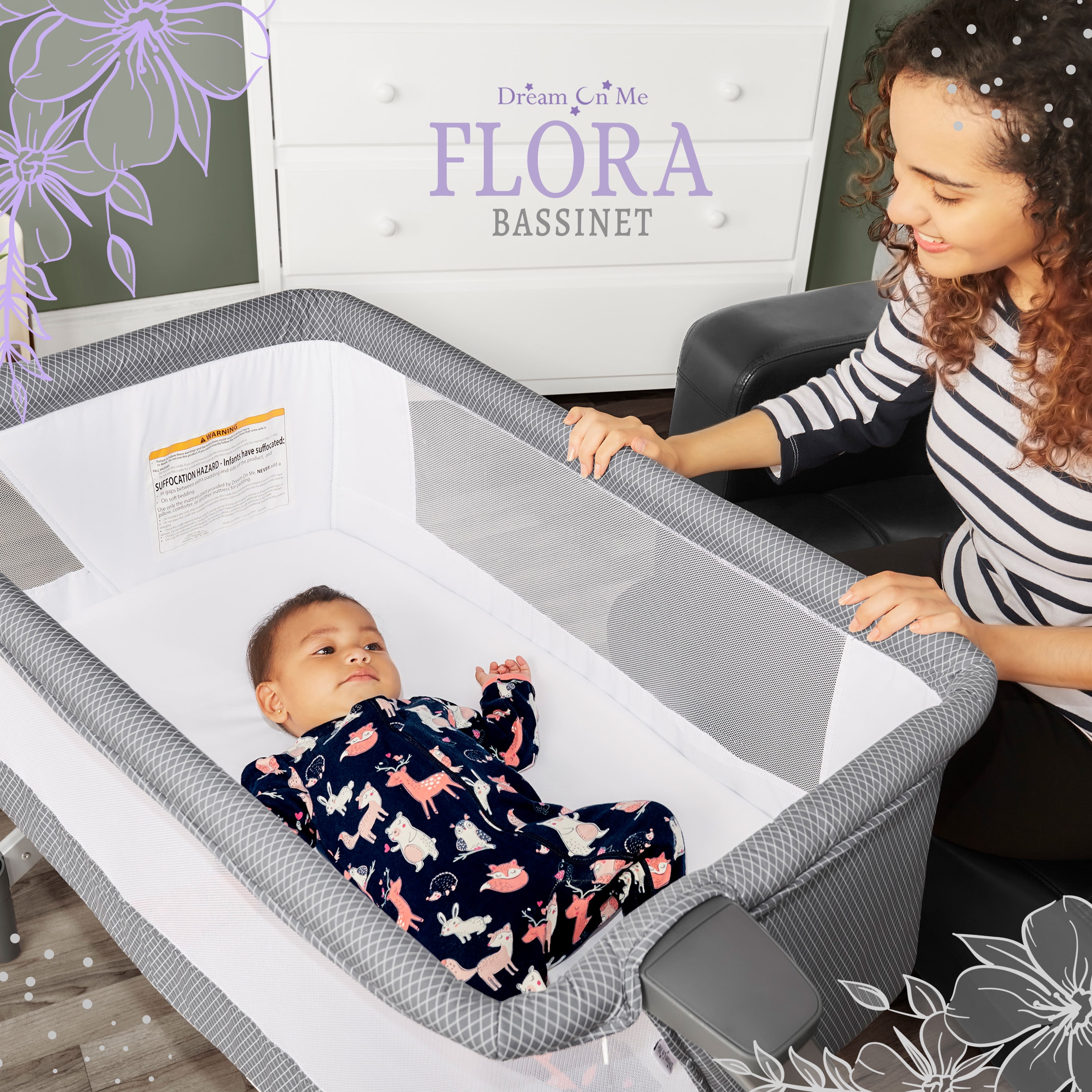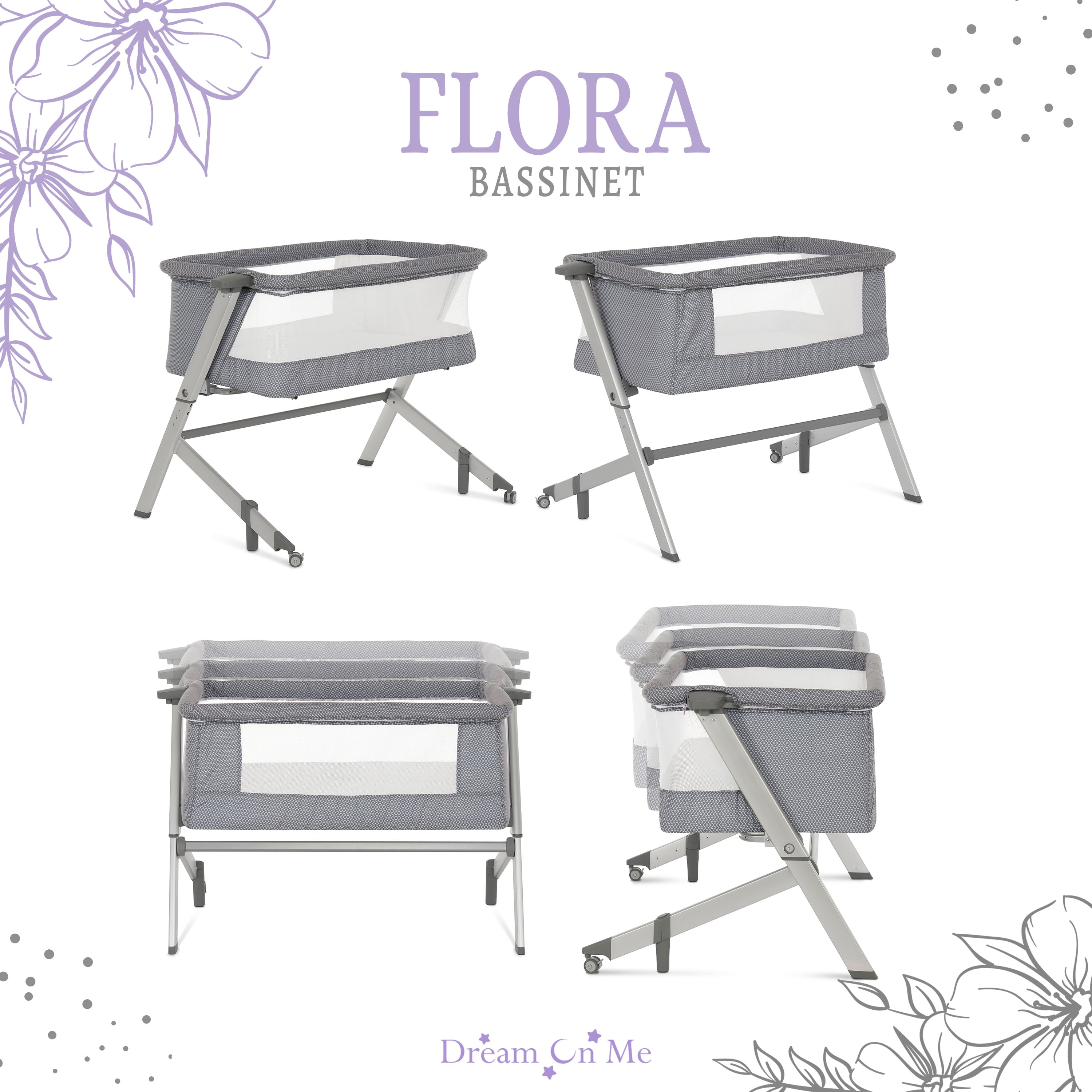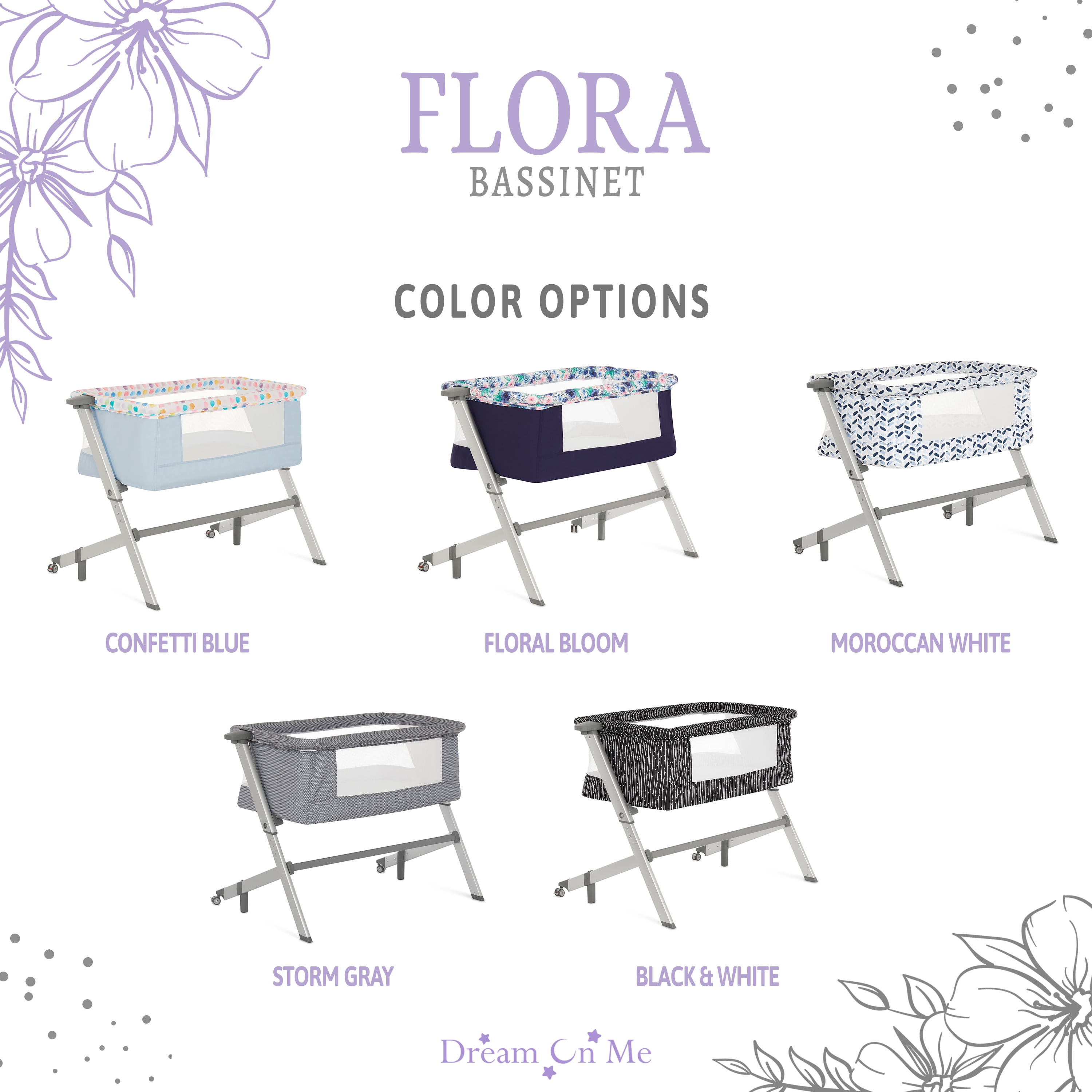 Bring the freshness of spring to your little one’s nap-time, every day. The Dream On Me Flora Bassinet is the ultimate modern bassinet for a co-sharing lifestyle, ensuring mobility and safety. This JPMA & ASTM certified bassinet is designed to enable easy bedside breastfeeding and reassurance for your baby during restless nights. With an easy feature that allow the legs to fold inwards and adjustable height settings, you can keep your baby as close as possible to your mattress. Packed with front-leg wheels and breathable mesh sides, it allows for mobility to keep an eye on your baby as you move about your day. What’s more, compact in design and aesthetic in style, the Flora Bassinet with its floral detailing, comes in 5 unique finishes – Storm Grey, Moroccan White, Black and White, Floral Bloom and Confetti Blue! It’s convenient with easy, tool-free assembly & a portable carry bag. The product is recommended for babies weighing up to 25 lbs. / till 6 months of age, or till your little one shows signs of pushing up to hands & knees. This bassinet has a flat surface without any incline.