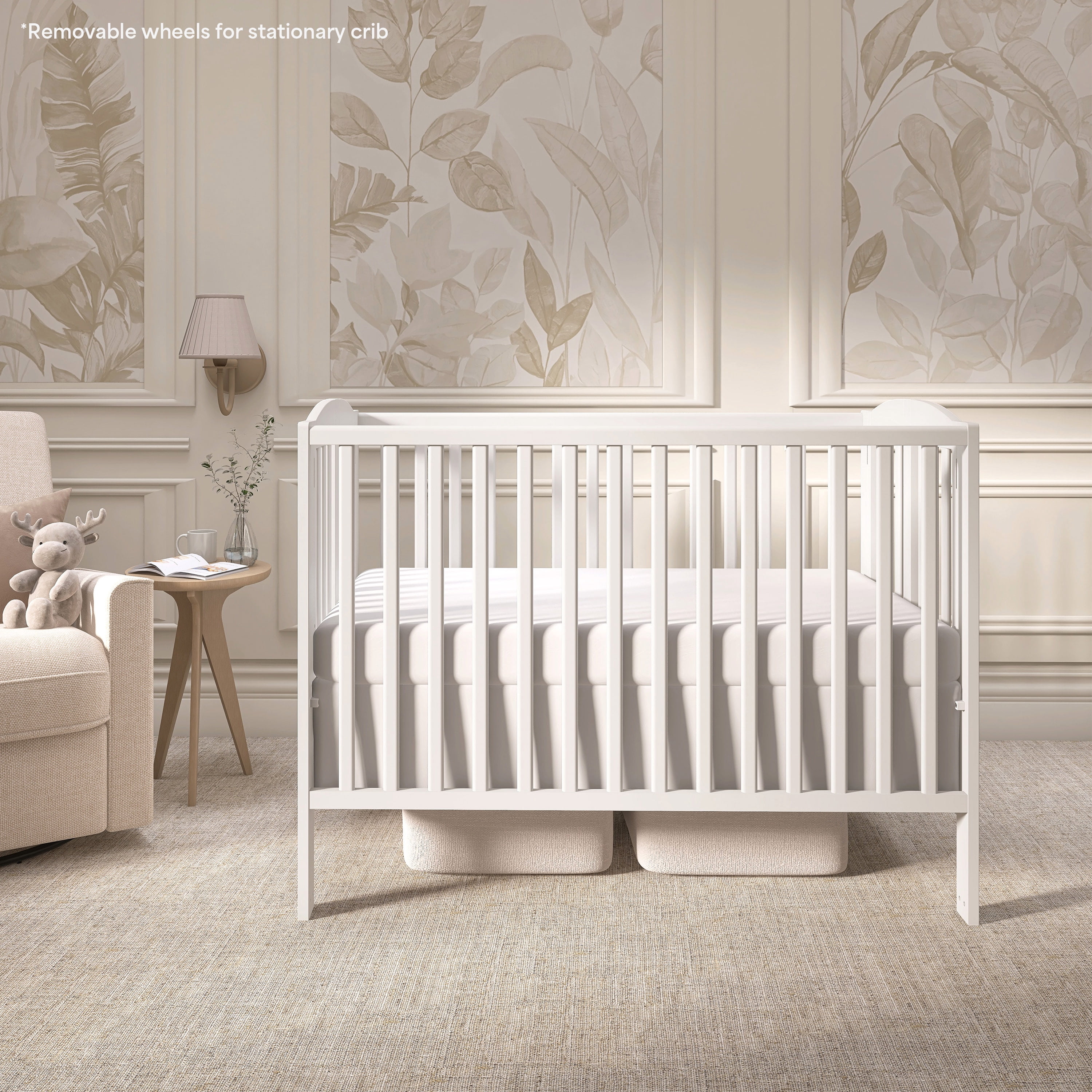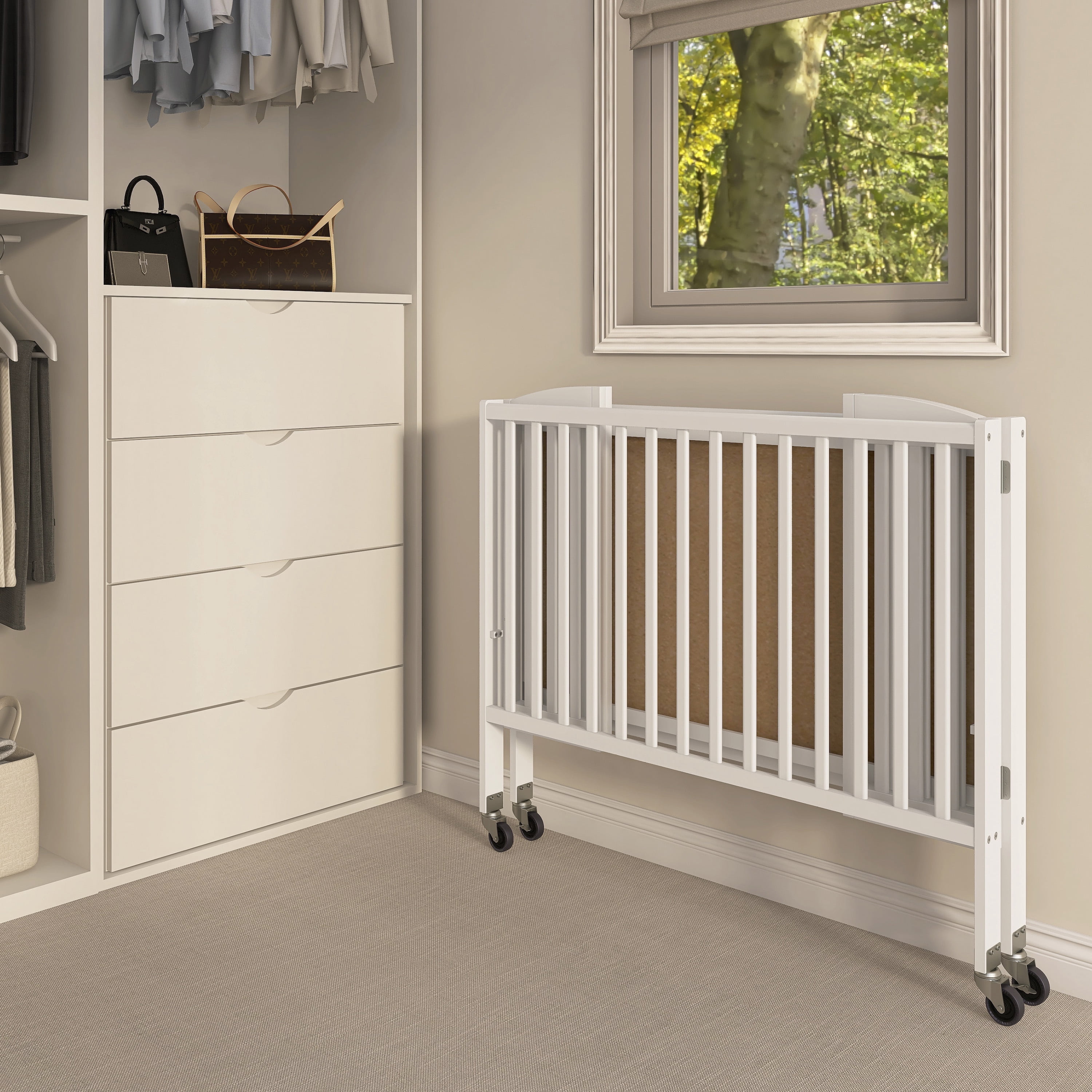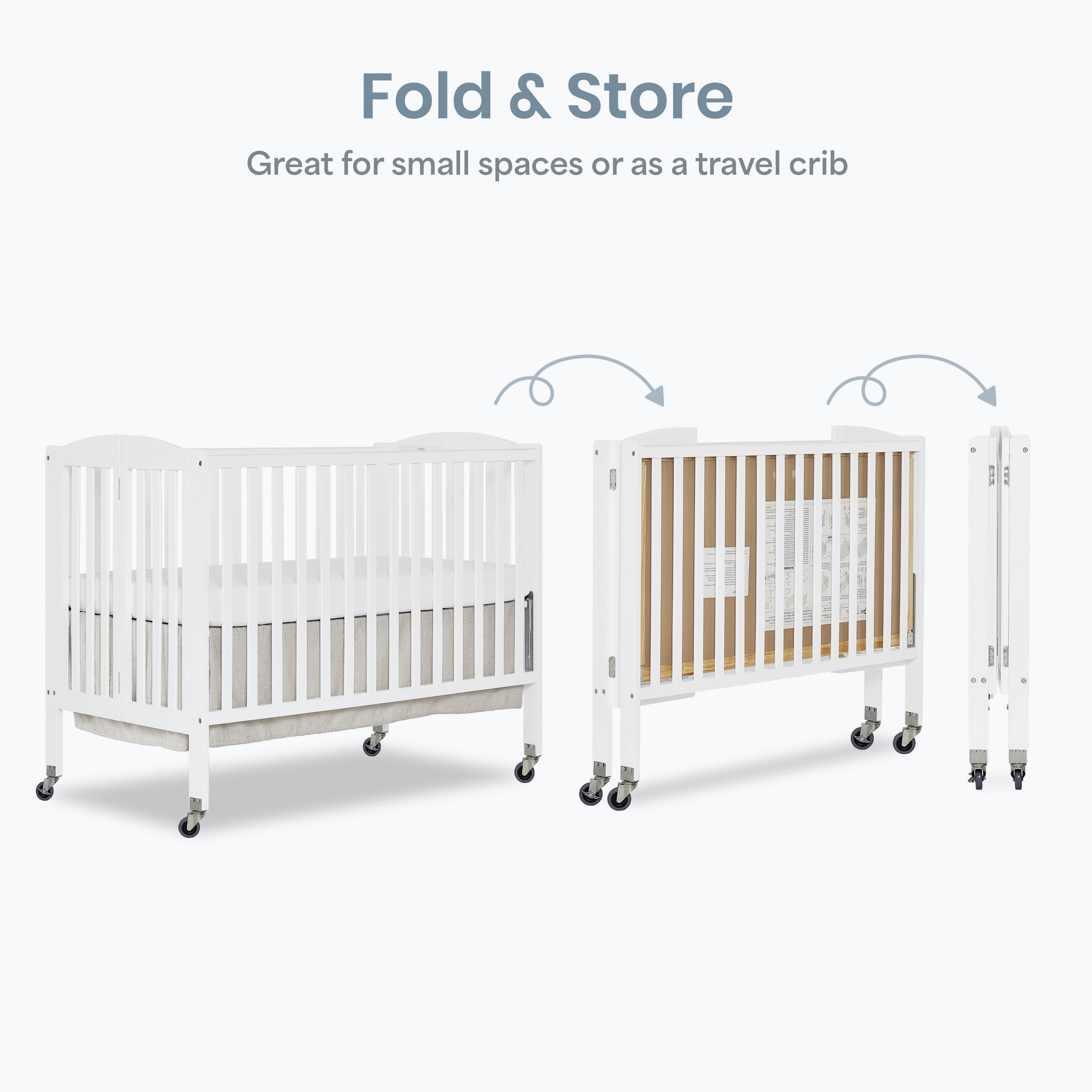 Dream On Me Folding Full Size Crib, is the only 2 position full size folding crib available. When the crib is not needed, simply fold flat using the patented folding system and store. No disassembly involved, now that’s convenience! This crib is ready to use again by simply unfolding and locking into place making it perfect for guests with babies, grandparents, caregivers, daycares and hotels. The stationary rail design (non-drop side), locking, heavy duty, commercial size wheels ensure safe use now and in the future. The cribs are available in beautiful non-toxic, child-safe, water-based finish options. All tools for assembly are included. Dream On Me Standard Mattress, sold separately.