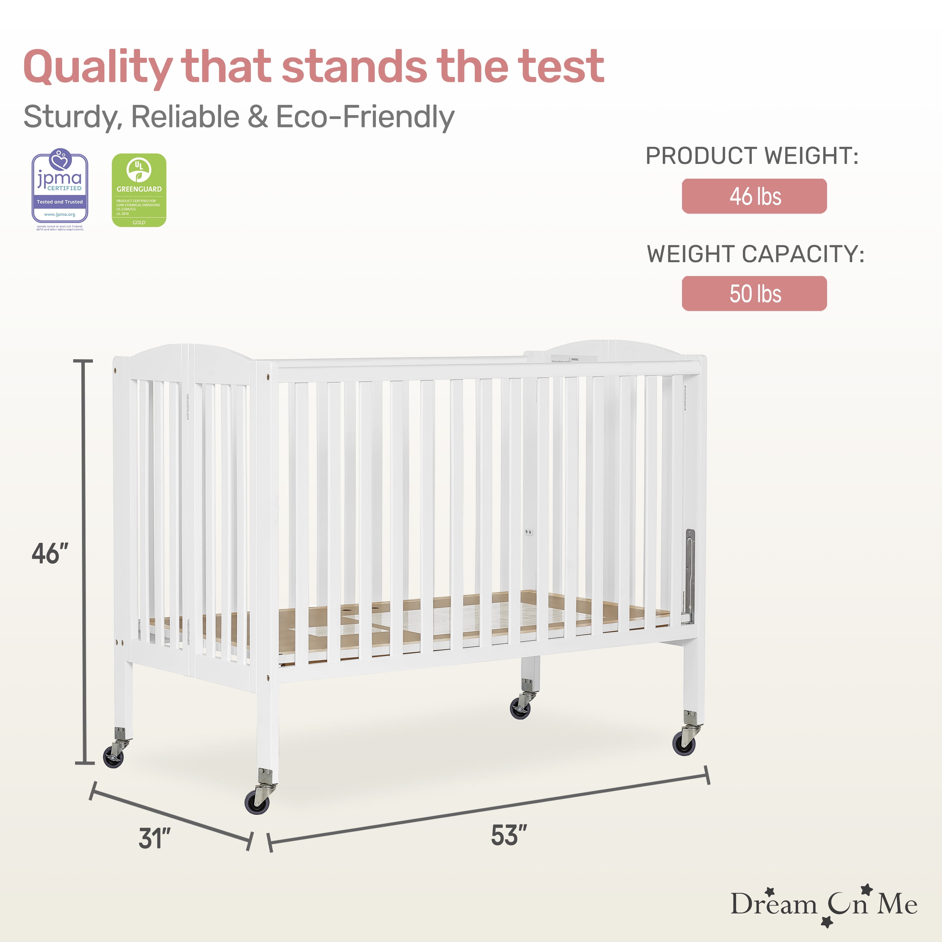 A full-size crib that boasts roomy interiors but occupies a small-footprint, making it the perfect option for small spaces Comes with a two-position mattress support to keep pace with your growing baby When the crib is not needed, simply fold flat using the patented folding system and store Lightweight frame and wheels allow you to move it easily from room to room The stationary (non-drop side) rail system and heavy duty, locking, commercial size wheels provide the utmost in product safety The crib features a minimalist design Crib dimensions are 53L x 31W x 46H. It weighs 46 lbs