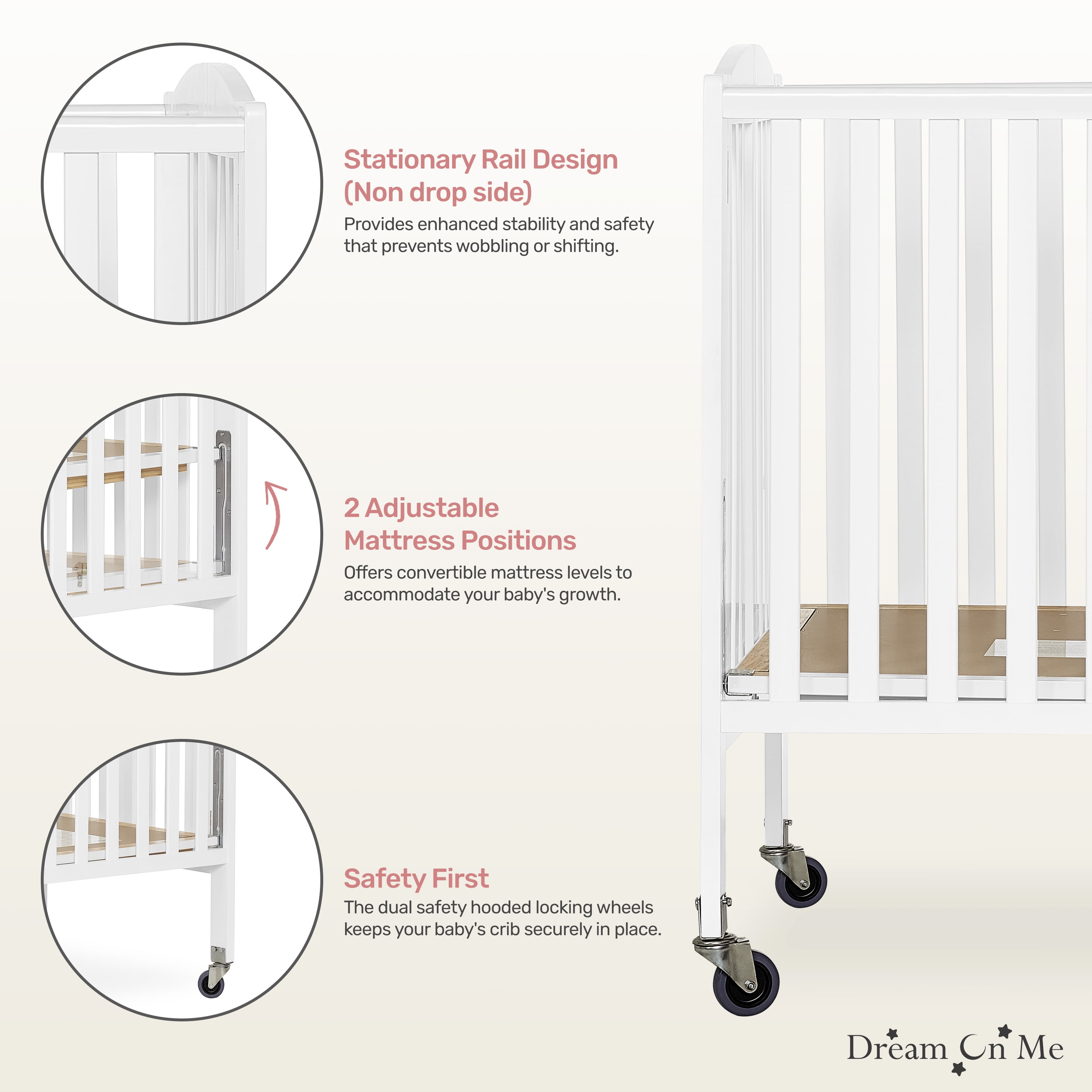 Dream On Me Folding Full Size Convenience Crib in White, Comes With Heavy Duty Locking Wheels