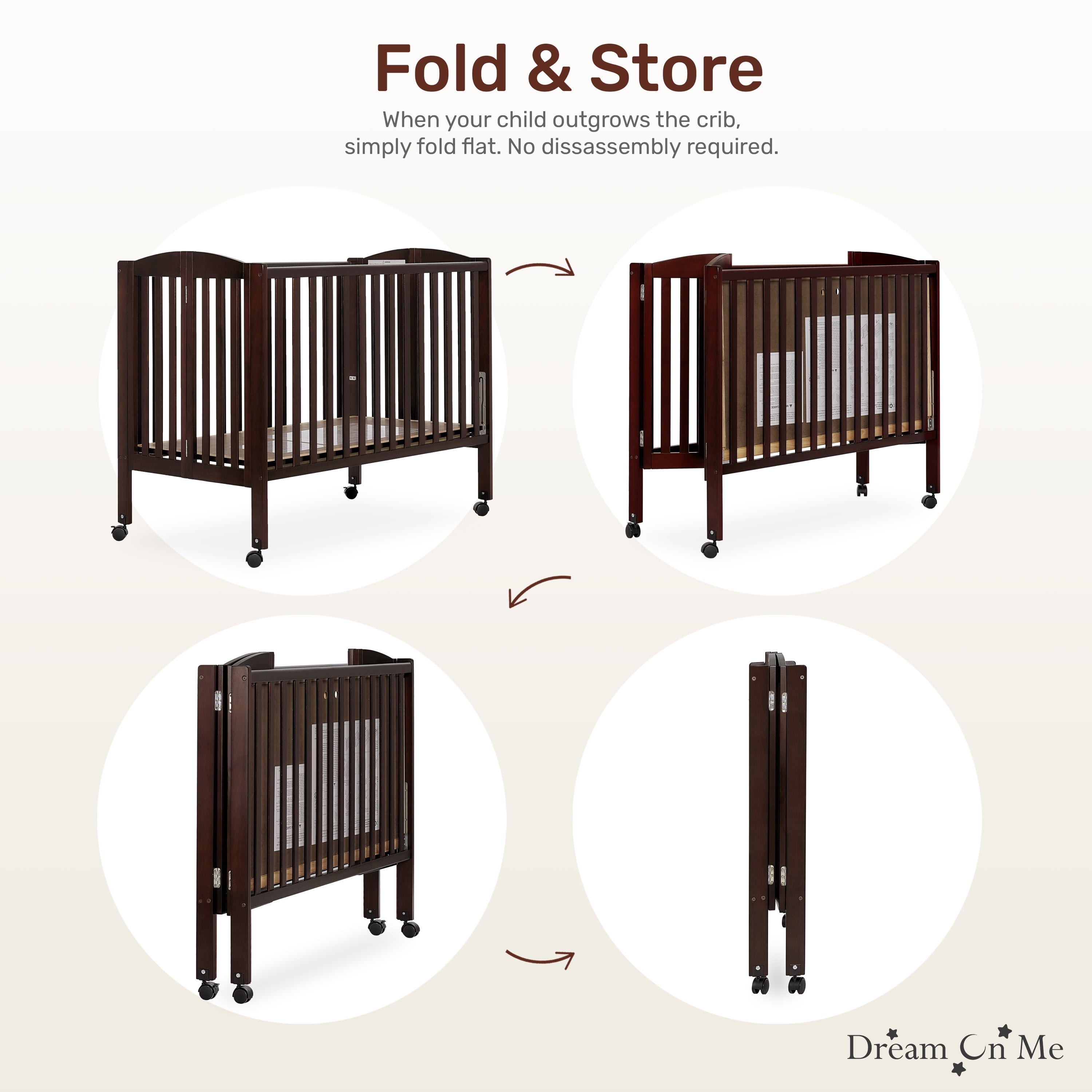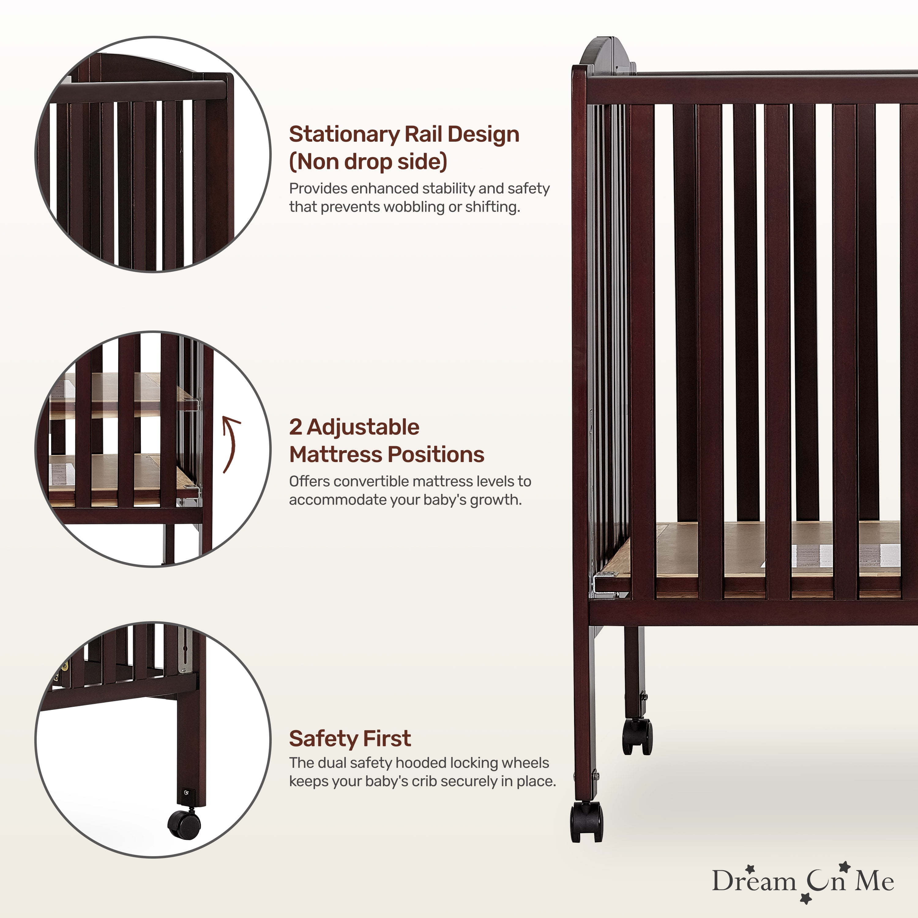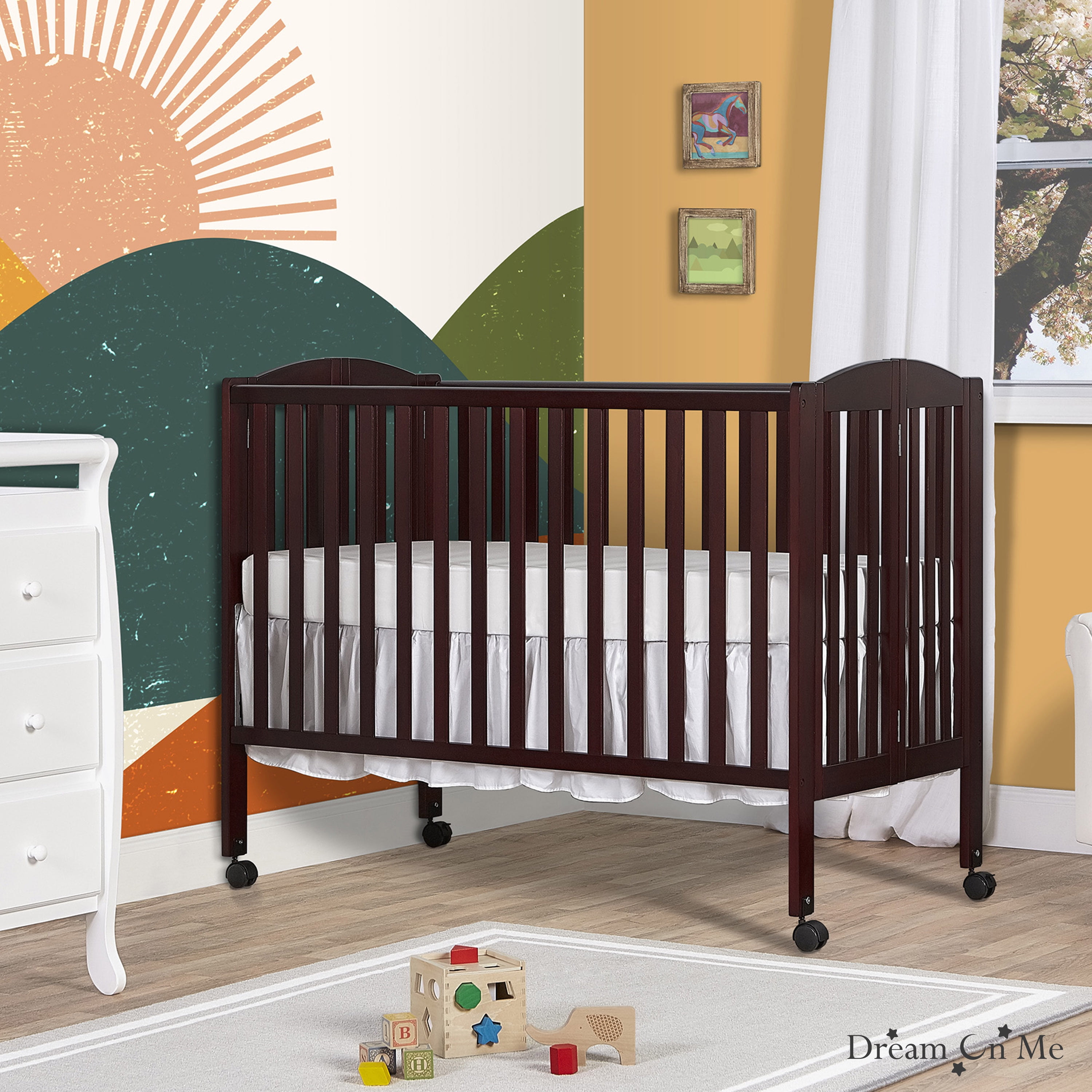 With its compact folding system, the Dream On Me Full Size 2-in-1 Folding Stationary Side Crib is ideal for small spaces. It has a convenient 2-position folding crib. Once your child outgrows it, the patented folding system allows you to fold it without disassembly and storage. It’s lightweight and mobile and folds flat for storage – compact and perfect for small spaces. Simply unfold and lock it in place for when you need to use it again, like when guests with babies visit or use it in grandma’s house. The crib features a contemporary design with clean lines and comes. It is available in six beautiful finishes, perfect to suit any nursery theme you pick. We prioritize safety. Our cribs meet/exceed applicable ASTM and CPSC standards. Enhanced safety features include the stationary rail design (non-drop side) and dual safety hooded locking wheels. We recommend the Dream On Me non-toxic, GREENGUARD Gold-certified full-size crib mattress for the perfect fit. All tools for assembly are provided. From the manufacturer Dream On Me, a full-size folding crib is the only full-size, 2-position folding crib available. The United States patented design makes folding easy for flat, convenient storage when not in use. It features a stationary (non-drop side) rail design which provides the utmost in product safety. It has dual safety, hooded locking wheels, a beautiful non-toxic finish, and is made of pinewood. A mattress is sold separately.