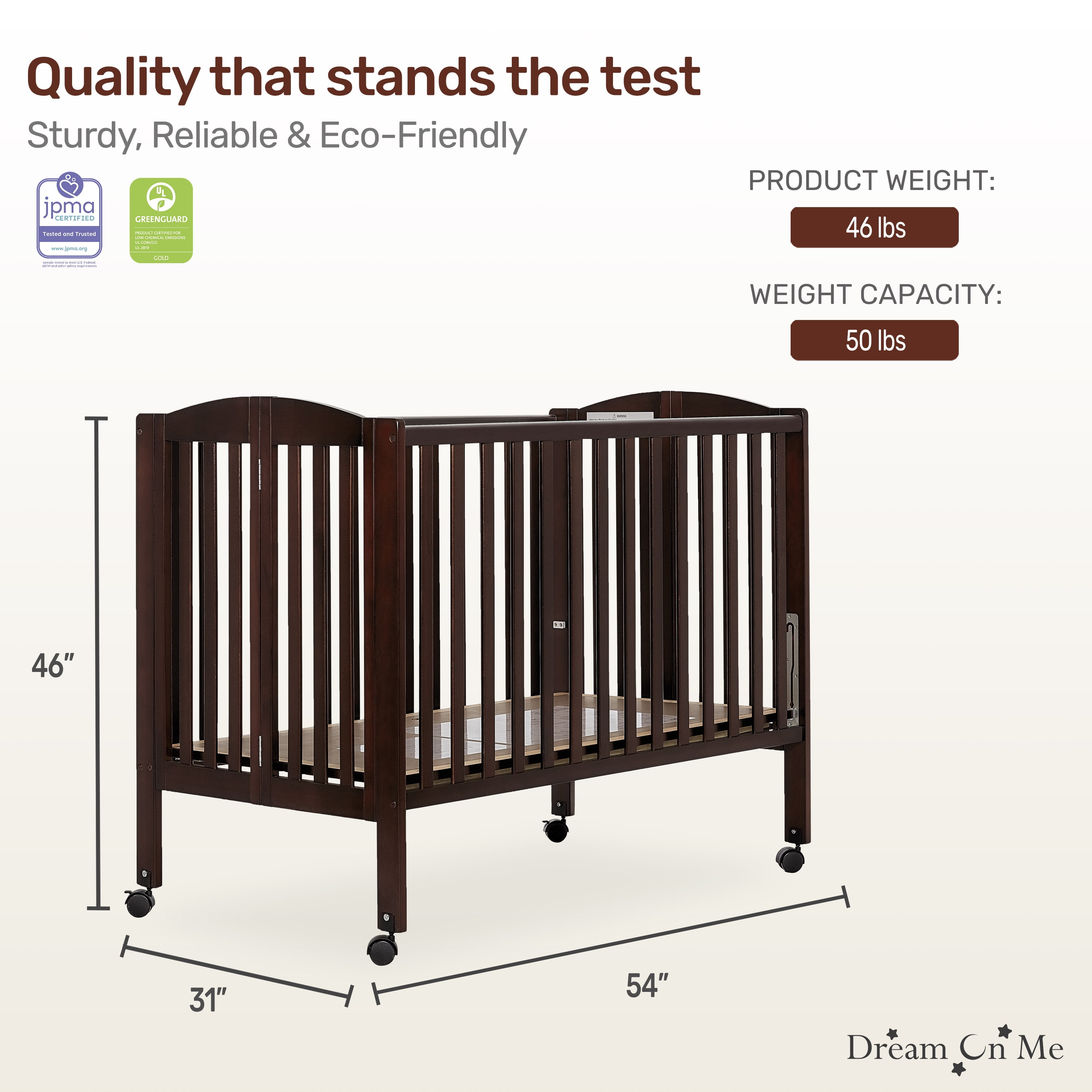Dream On Me Full Size 2-in-1 Folding Stationary Side Crib is a convenient 2-position folding crib Once your child outgrows it, the patented folding system allows you to fold it and store with ease It’s lightweight & mobile-move it easily around your home Folds flat for storage-compact and perfect for small spaces Simply unfold and lock in place for when you need to use it again or for when guests with babies visit All our cribs meet/exceed applicable ASTM & CPSC standards Safety features include the stationary rail design (non-drop side),dual safety hooded locking wheels. Dimensions: 54L x 31W x 46H inches, max weight limit 50 lbs We recommend the Dream On Me non-toxic, Greenguard Gold certified full-size crib mattress (sold separately) for the perfect fit