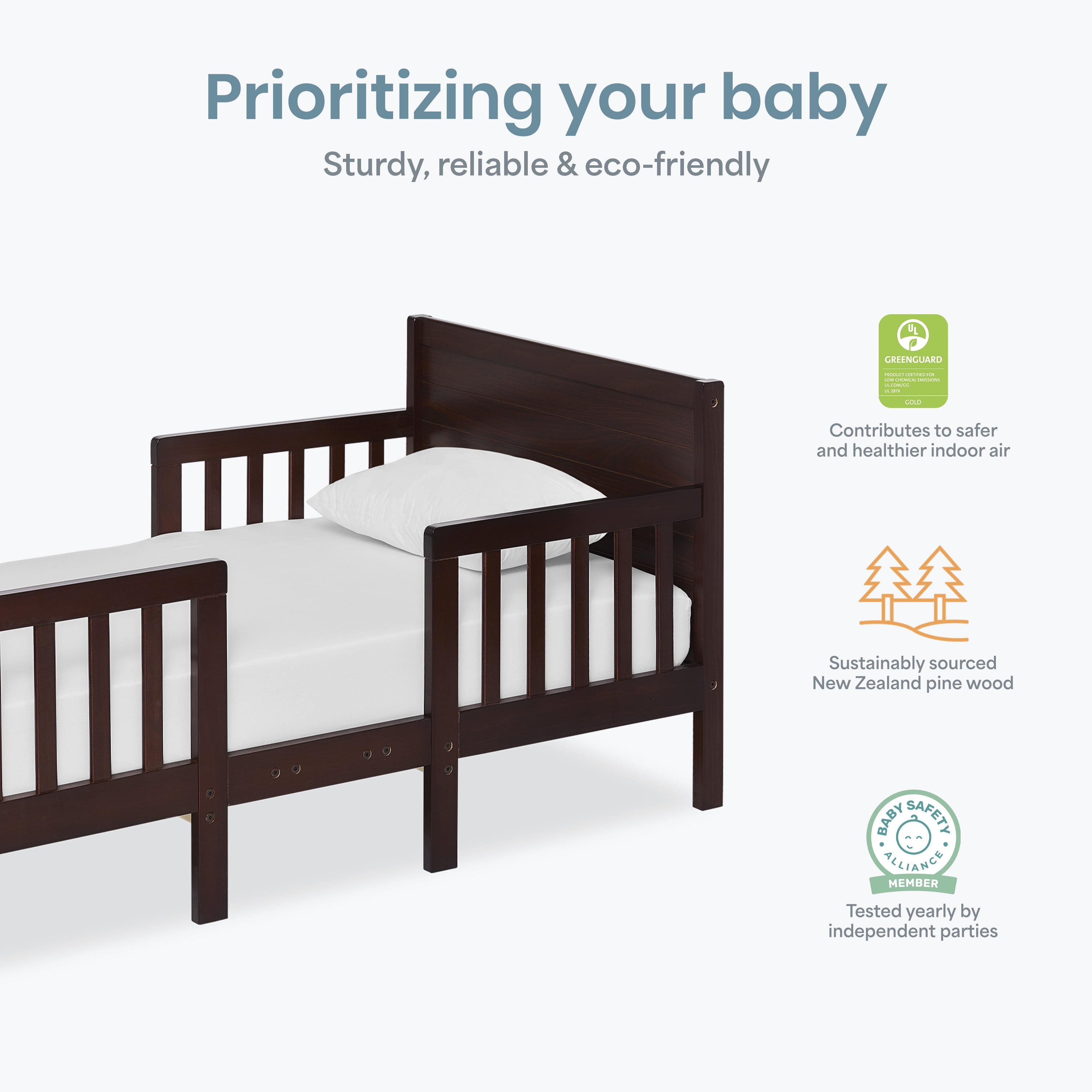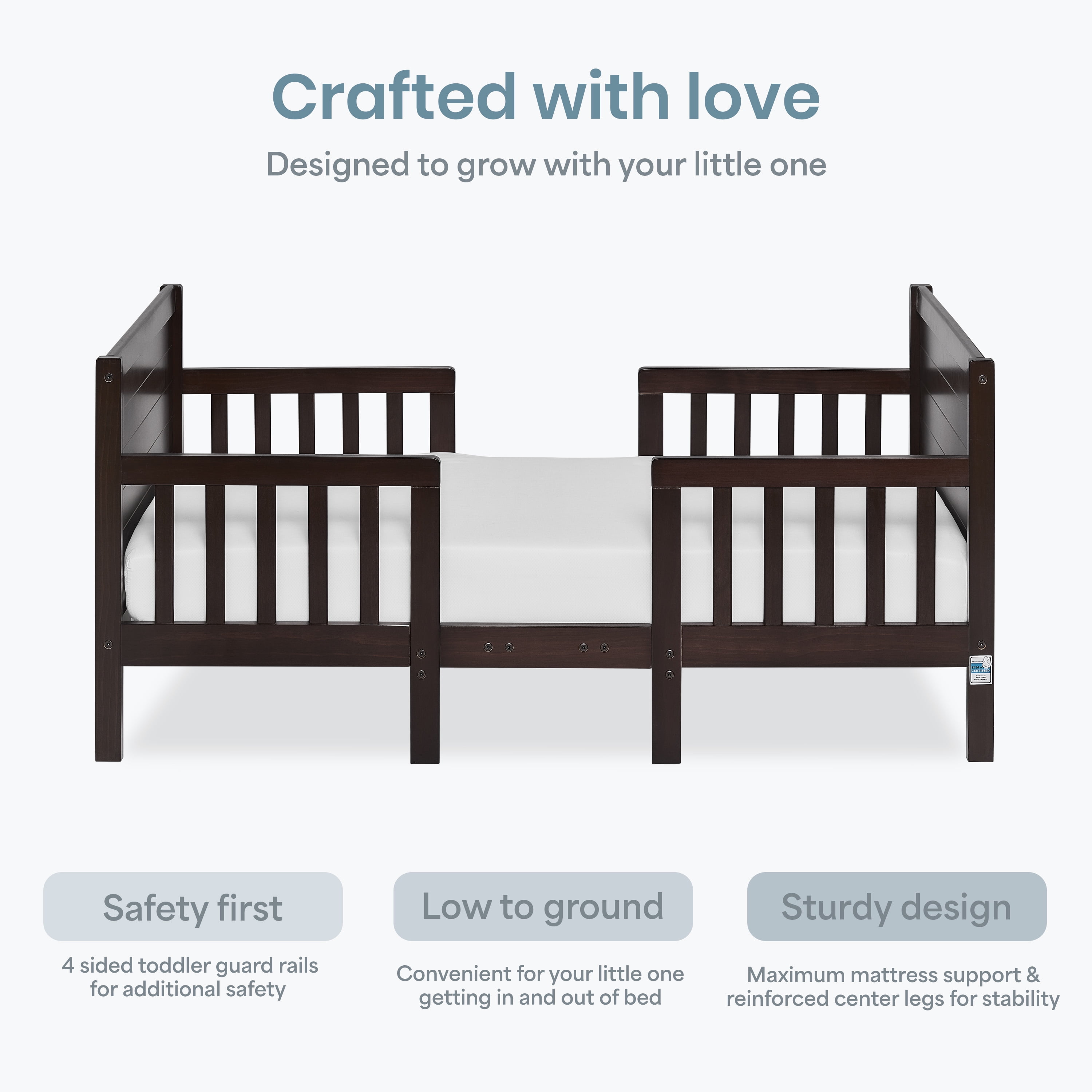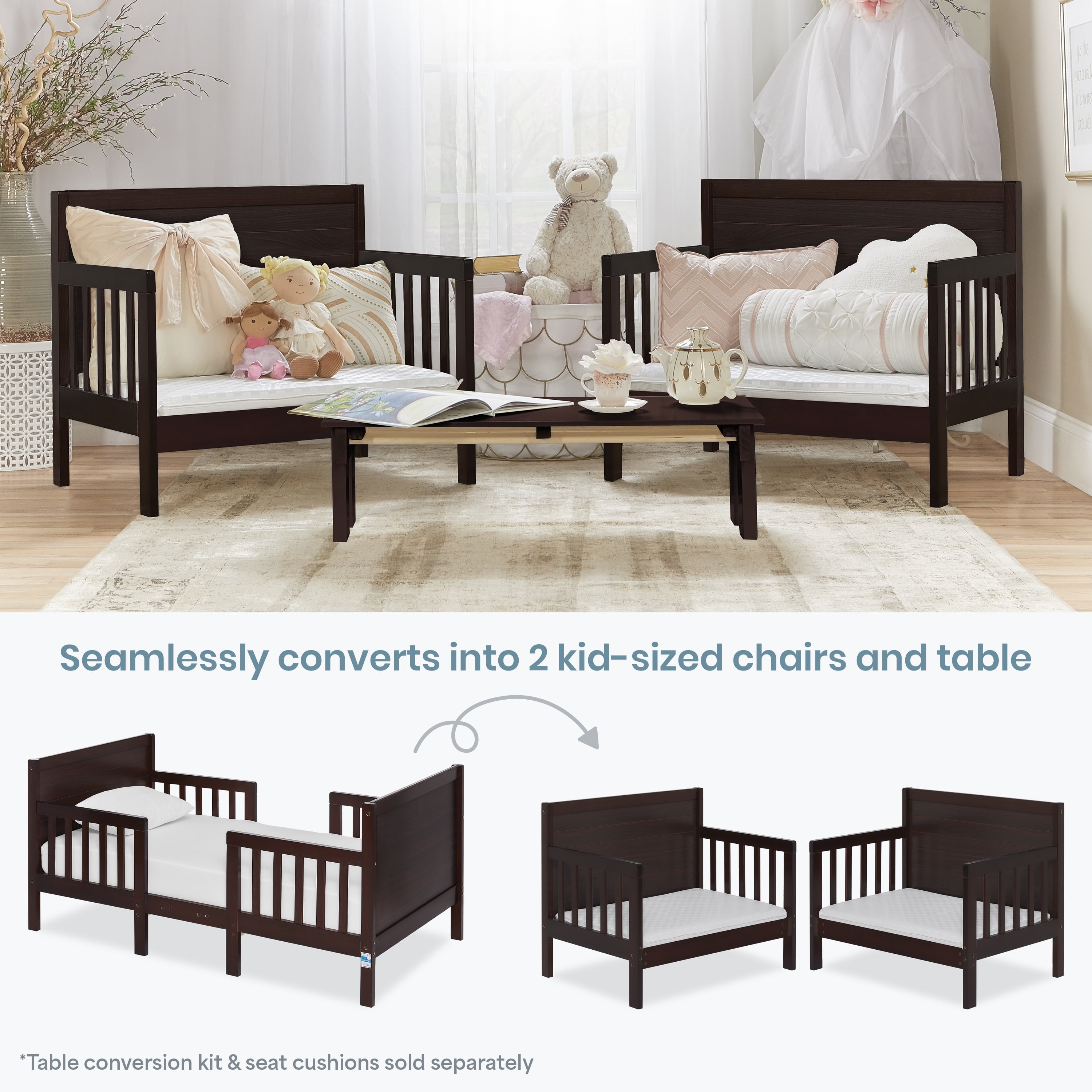 Dream on me Hudson 3 in 1 convertible toddler bed gives your child a fun, comfortable, and colorful bedroom. This toddler bed offers a modern frame design that will blend nicely into any child’s room and transition with them as they grow. It was crafted with a low to the floor design, which is ideal for your toddler to safely get in and out of bed. It is reinforced for stability with center legs and comes complete with four side safety rails for added security in radiant finishes. The dream on me Hudson toddler bed is the perfect transition for toddlers, who have outgrown their cribs but are still too small for an adult bed. The Hudson toddler bed converts from a toddler bed into two kid chairs and a table to adapt to your growing child and complement any room setting. Conversion kits, mattresses, and bedding are sold separately. Dream on me Hudson 3 in 1 convertible toddler bed meets all applicable ASTM and CPSC standards. The brilliant combination of playful colors and outstanding comfort make this bed a perfect way to enhance any child’s bedroom.