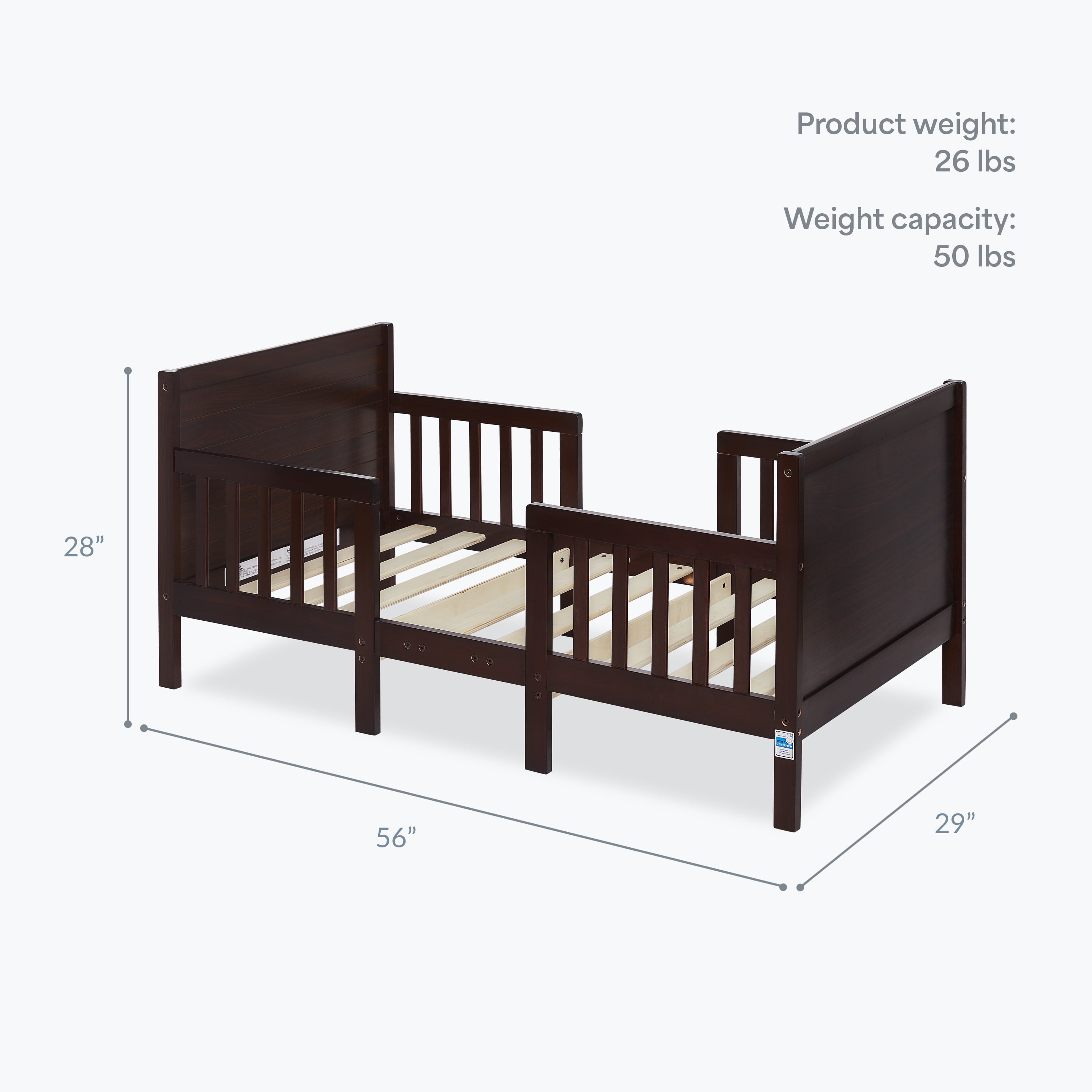 Dream On Me Hudson 3 in 1 Convertible Toddler Bed: Designed low to the floor, safety guardrails PATENT: 14/972.665 Wooden mattress support rails Constructed out of New Zealand pinewood Weight Capacity: 50 lbs All tools for assembly included Assembled Dimensions: 57 L x 29 W x 28 H” Tested for lead and other toxic elements to meet or exceed government and ASTM safety standards. Coverts to two child chairs and a table, conversion kit sold separately. Chair 1- Assembled Dimensions: 29 L x 29 W x 18 H Chair-2 Assembled Dimensions: 29 L x 28W x 18 H Table -29 L x 14 W x 8 H