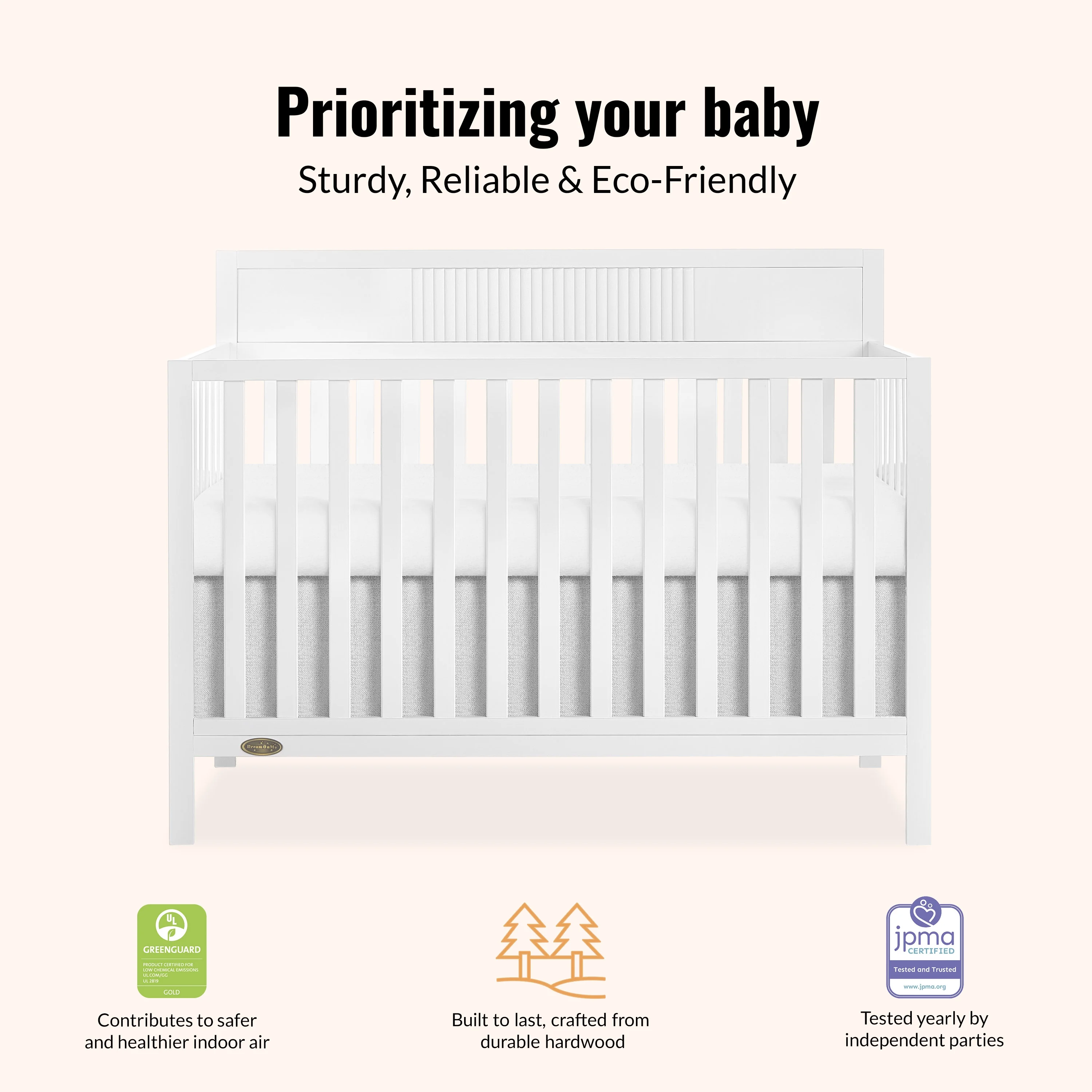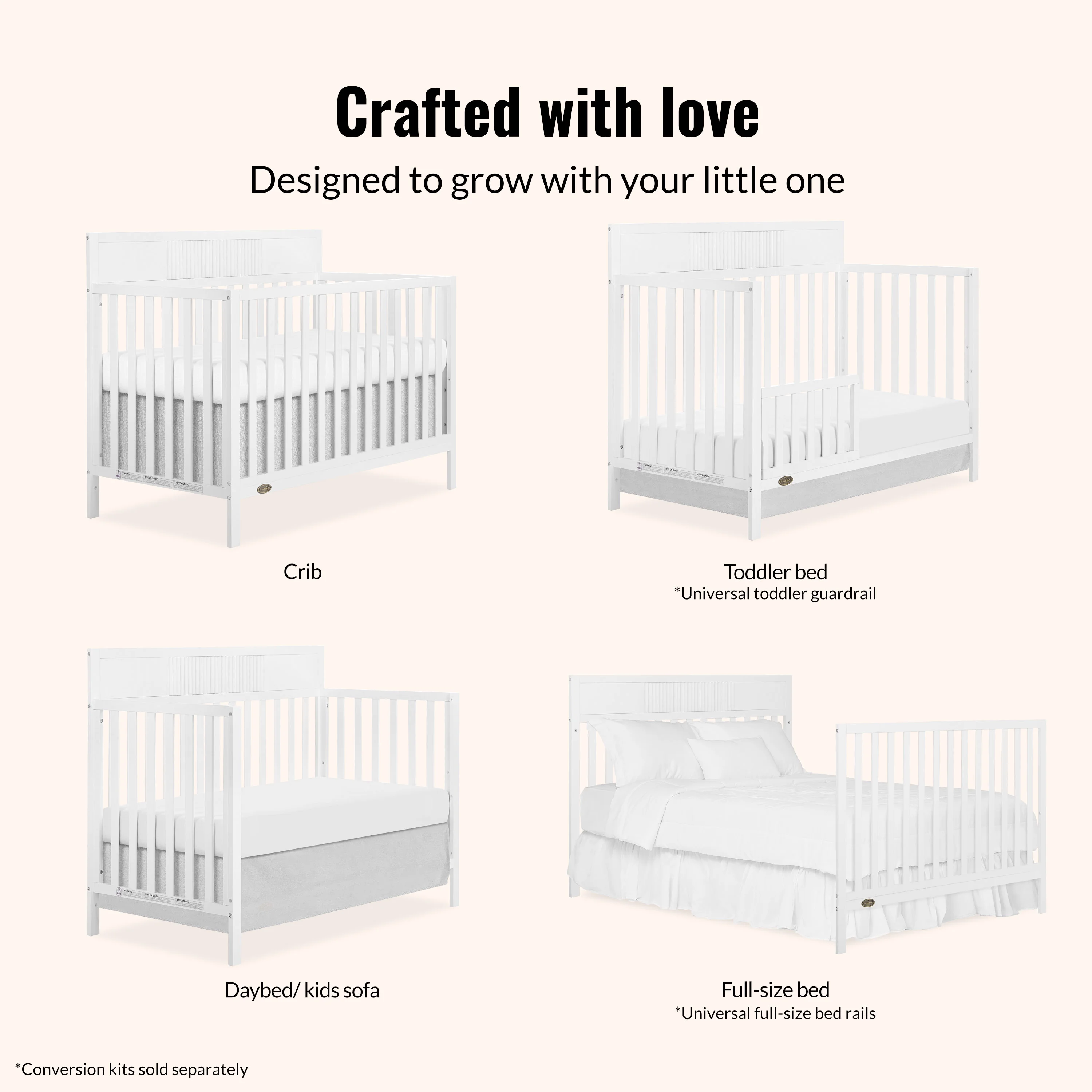 5-in-1 CONVERTIBILITY: Transitions seamlessly from a crib to a toddler bed, daybed, and full-size bed with a headboard and footboard (conversion kits sold separately). SUITABLE FOR ALL STAGES: Designed for children from birth to 5 years with a weight capacity of 50 lbs. SAFETY FIRST: JPMA certified and meets/exceeds ASTM and CPSC safety standards for your peace of mind. NON-TOXIC FINISH: Painted with water-based, non-toxic paint, ensuring a safe environment for your baby