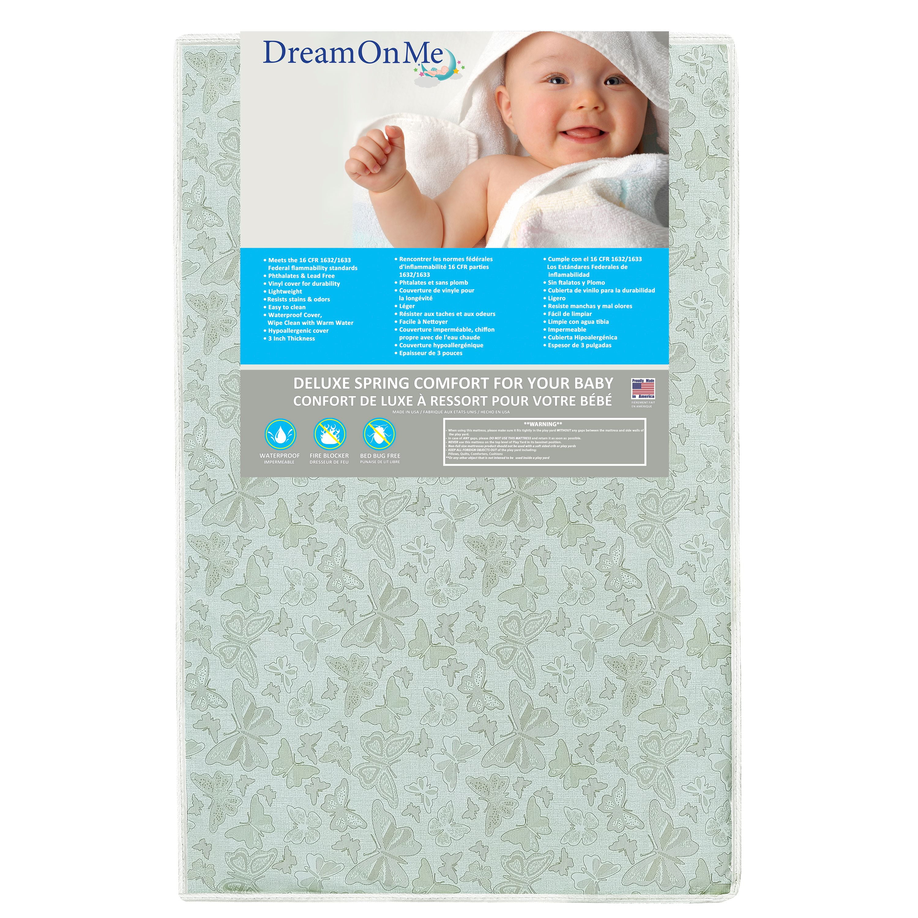 Dream On Me Little Butterflies 6″ 2-in-1 Foam Core Crib and Toddler Bed Mattress: An extra-firm lightweight foam crib mattress made with soybean oils provided by farmers Pearl embossed waterproof and stain-resistant cover for an easy-clean GREENGUARD Gold Certified baby mattress for a healthier indoor environment High-density foams provide reduced sagging and increased durability to provide firm support for sleeping infants The entire cover and lock-stitched binding are wet resistant and wipe clean, preventing allergens from clinging to the mattress Square cut corners for a snug fit in cribs and can move to a toddler bed as your child grows Lightweight to easily change sheets Patterns may vary All Dream On Me mattresses are GREENGUARD Gold Certified for a healthy indoor environment for your baby