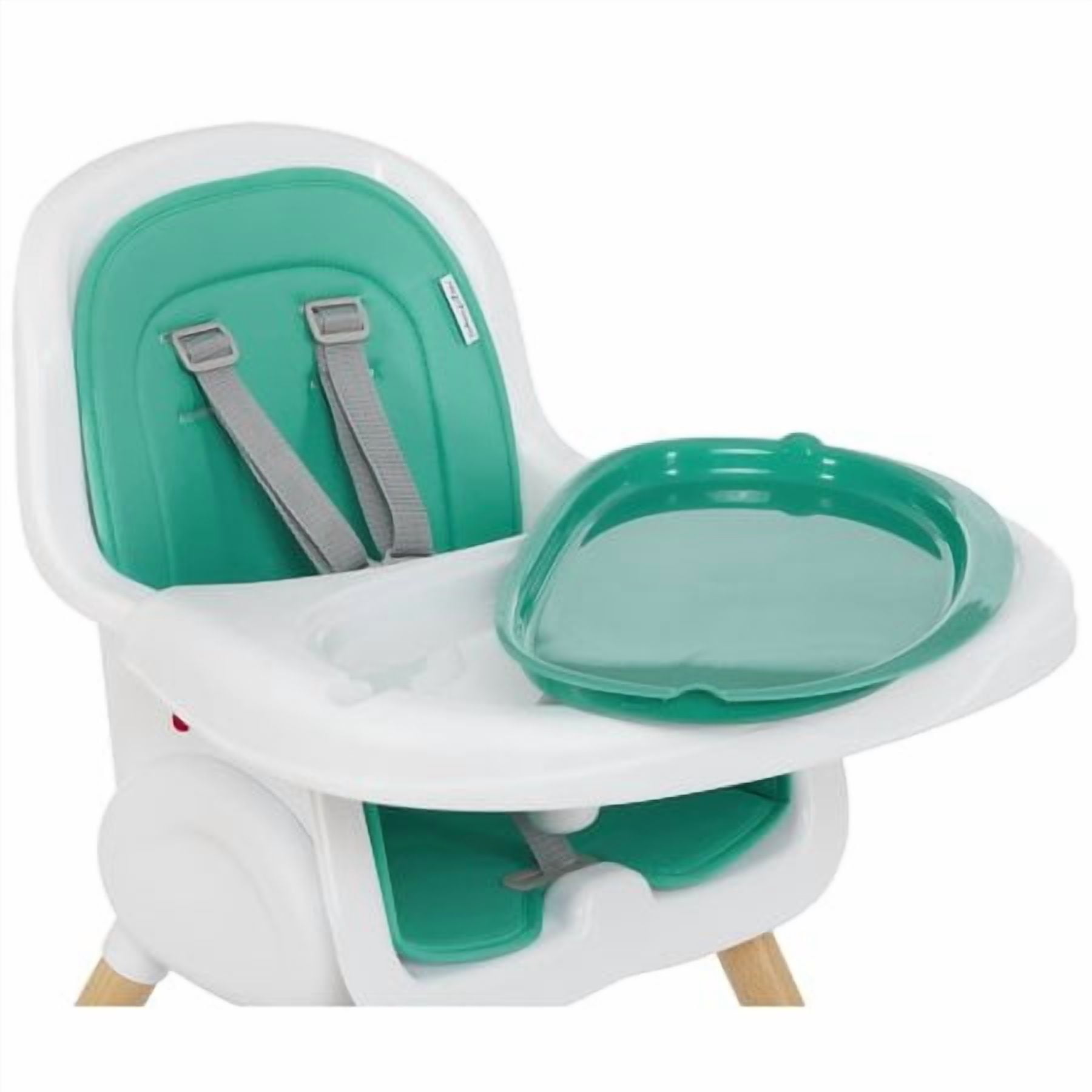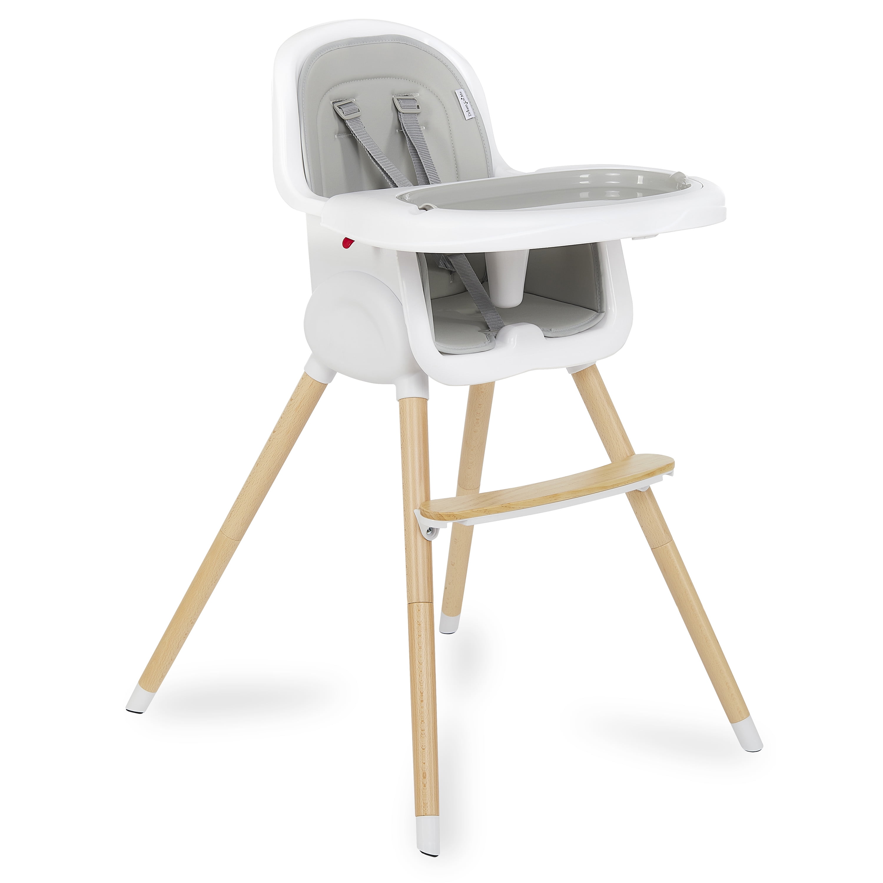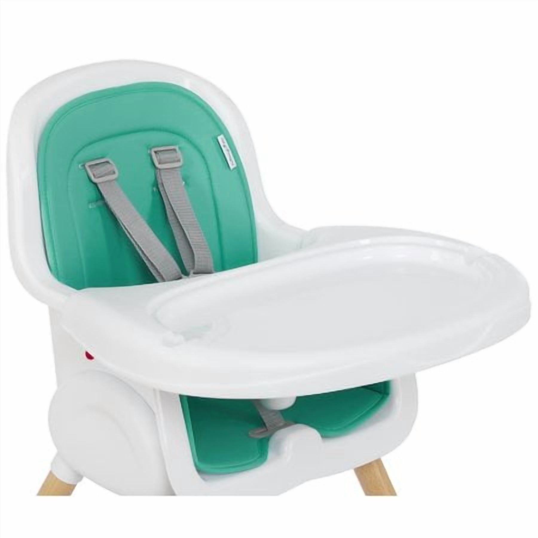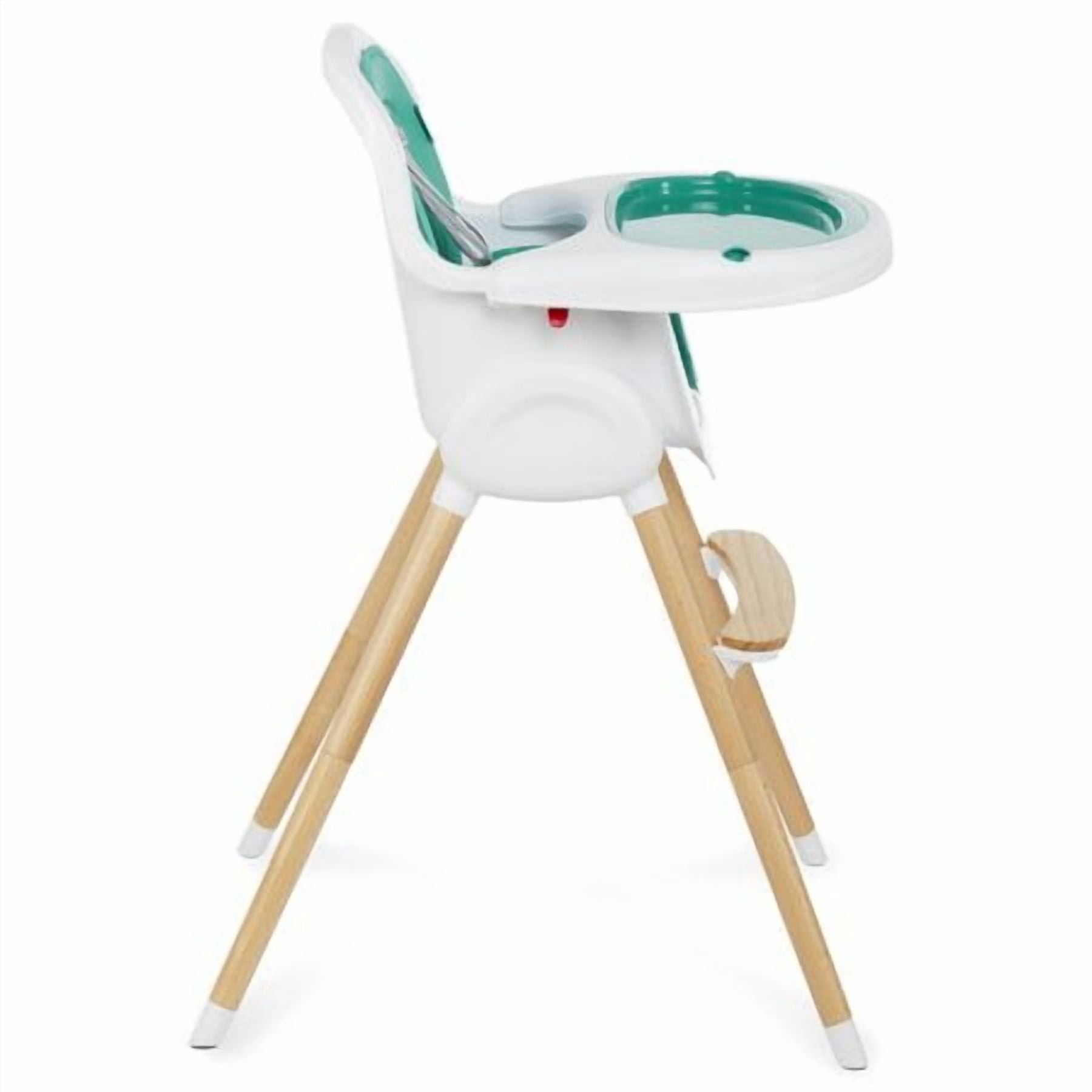 • High Quality wood legs with non-skid feet. • Easily converts in to toddler chair. (Conversion kit included) • PU seat cover can be easily wiped clean. • Tray has 3 positions to support your growing child. • Tray has a removable insert for easy cleaning. It is even dishwasher safe! • Tray can be stored on the back of the highchair. • 5-point safety harness can be raised to support your growing child. • 5-point harness is removable for Junior Chair use. • Lightweight • Age range: 6m+