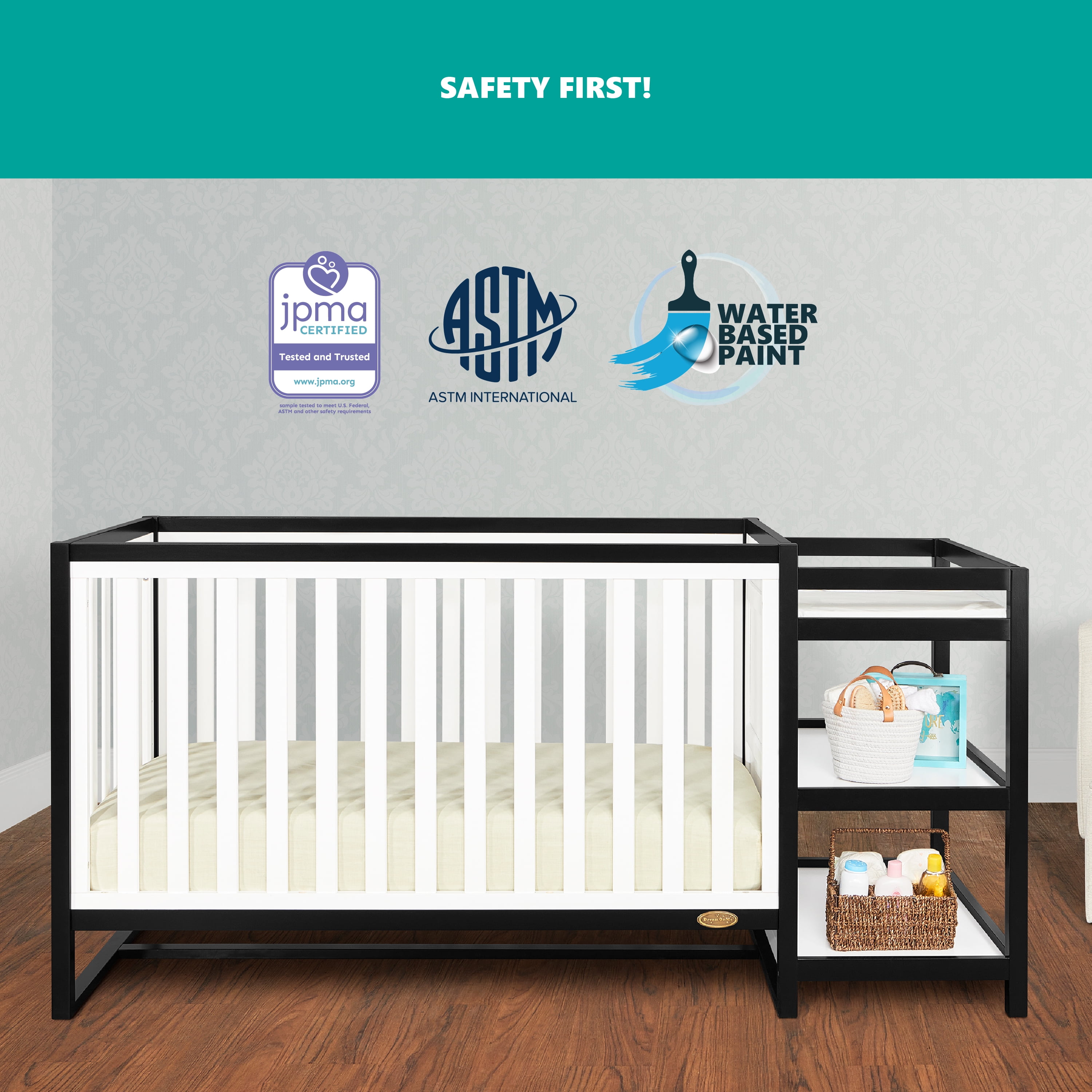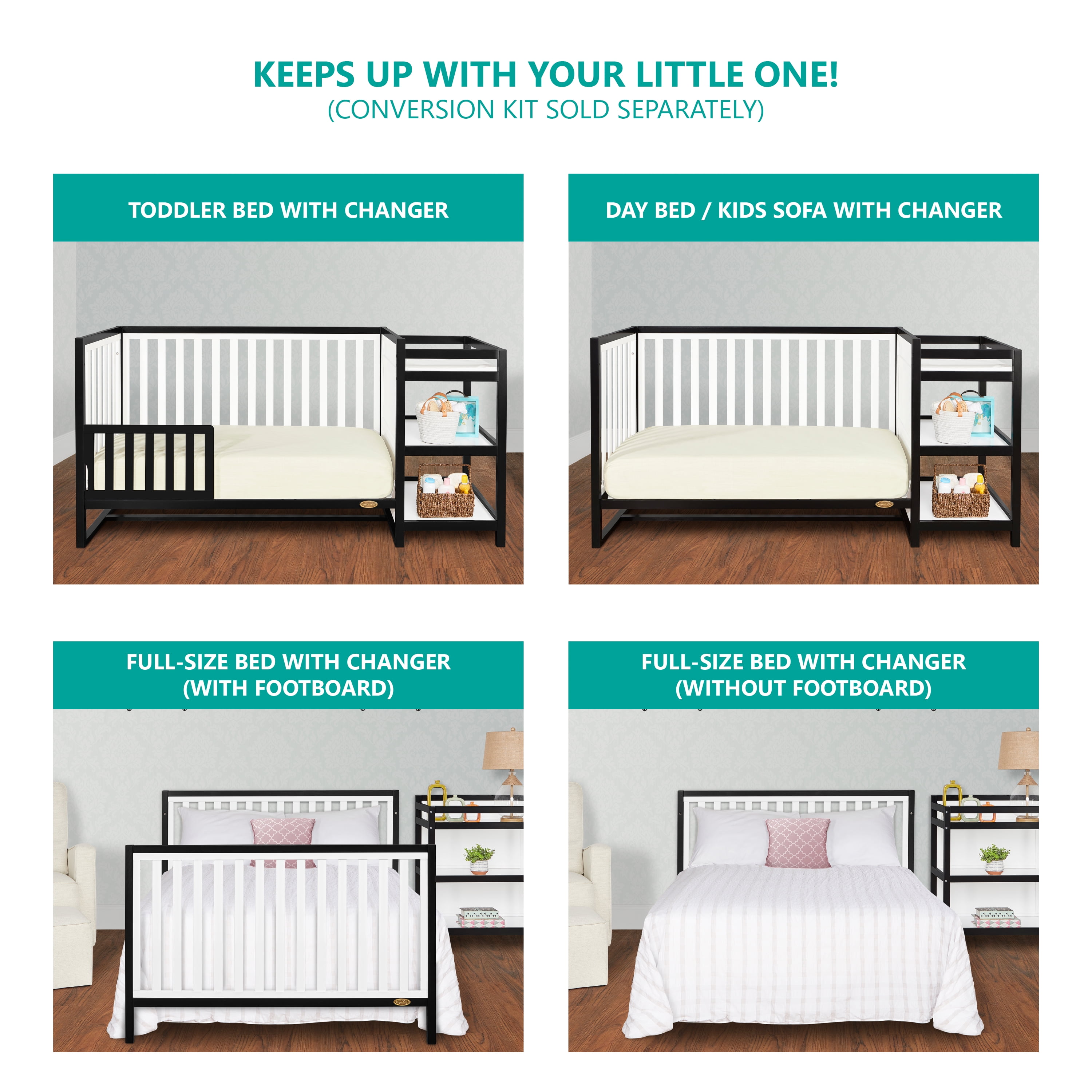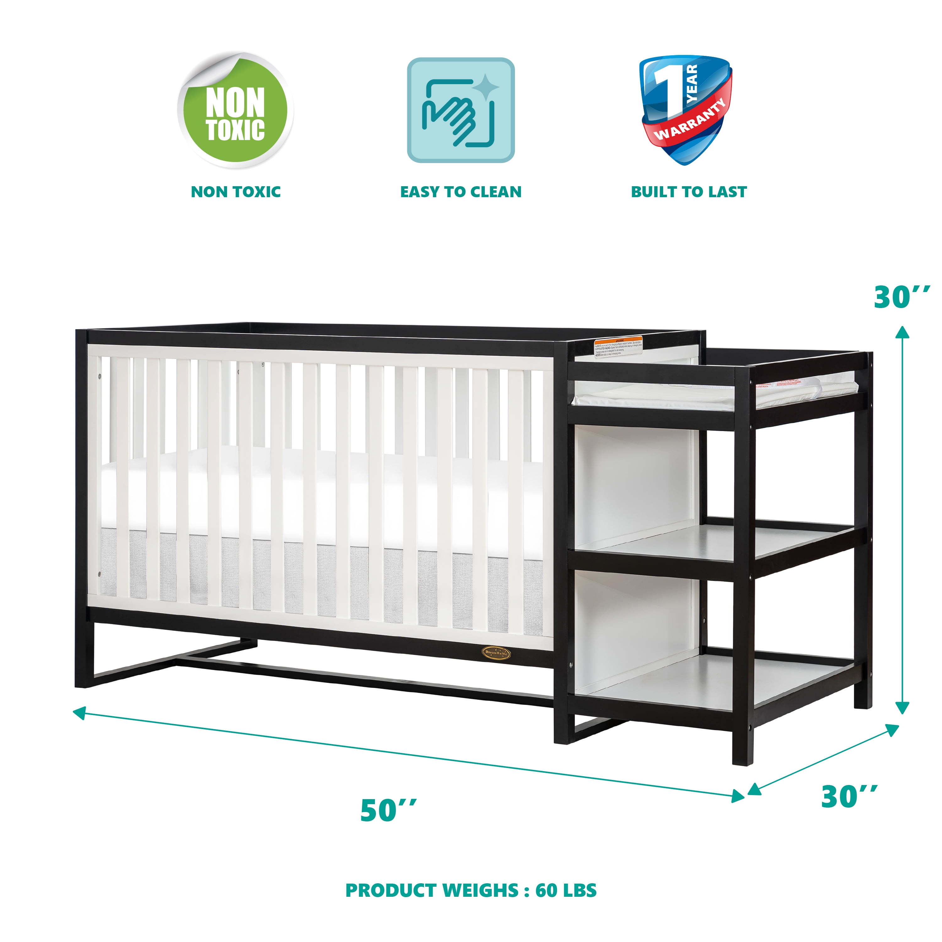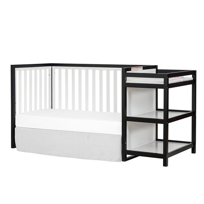 Dream On Me Milo 5-In-1 Convertible Crib and Changing Table I Free Changing Pad, Black And White 5-IN-1 CONVERTIBILITY: The Milo easily converts from a crib into a toddler bed (conversion kit sold separately) and daybed. Changing table includes pad and 2 shelves for storage. GROWS WITH YOUR CHILD: The Milo features the convenience of 3 mattress height positions that you can change as your baby grows. For the best fit use any Dream On Me/Evolur full-size, non-toxic, Greenguard certified crib mattress- TRENDY DESIGN: Built of sustainable, renewable, sturdy New Zealand pinewood, the Milo boasts a modern, gender-neutral vibe with subtle routing lines, square feet and soft fluting on the footboard & headboard. Pick from four solid/two-tone finishes SAFETY FIRST: Side stationary rails mean added security. It’s JPMA certified to meet /exceed all safety standards set by the CPSC/ASTM. All our products are tested by 3rd party labs for lead/other toxic elements to meet/exceed CPSC/ASTM safety standards