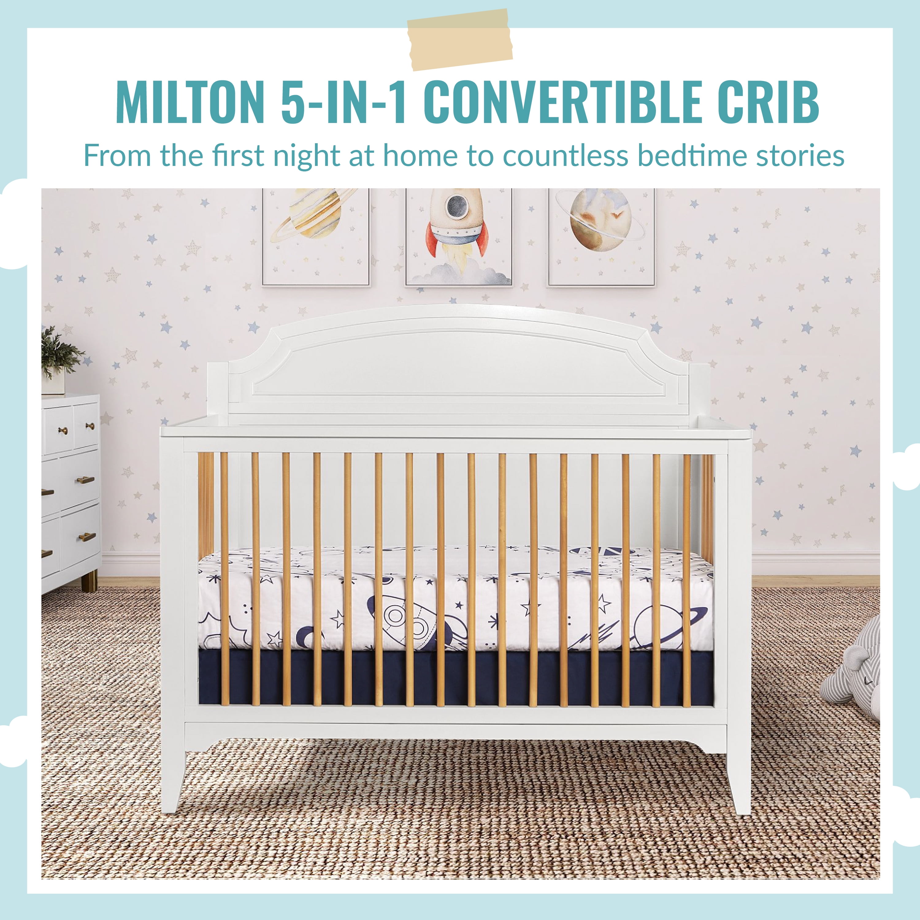 Dream On Me Milton 5 in 1 Convertible Crib made with Sustainable New Zealand Pinewood: 5 IN 1 CONVERTIBILITY: Modern and long-lasting, this crib effortlessly converts from a standard-size crib to a toddler bed, daybed & full-size bed (conversion kit sold separately). UTMOST SAFETY: Not only is the crib JPMA & Greenguard Gold certified, but it also meets/exceeds the ASTM & CPSC standards, providing utmost safety for your baby. SOLID & STURDY: The Milton 5-in-1 Convertible Crib is built of sustainable New Zealand Pinewood and sturdy wooden spindles, with a child-safe, non-toxic finish. THOUGHTFULLY & CONVENIENT: This convenient crib is easy to spot or wipe clean and comes in 3 alluring finishes that complement your nursery – White & Natural, Pebble Grey and White. PRODUCT DIMENSIONS: Product dimensions are 54.5” L x 29.5” W x 48” H, with a weight of 55 Lbs.