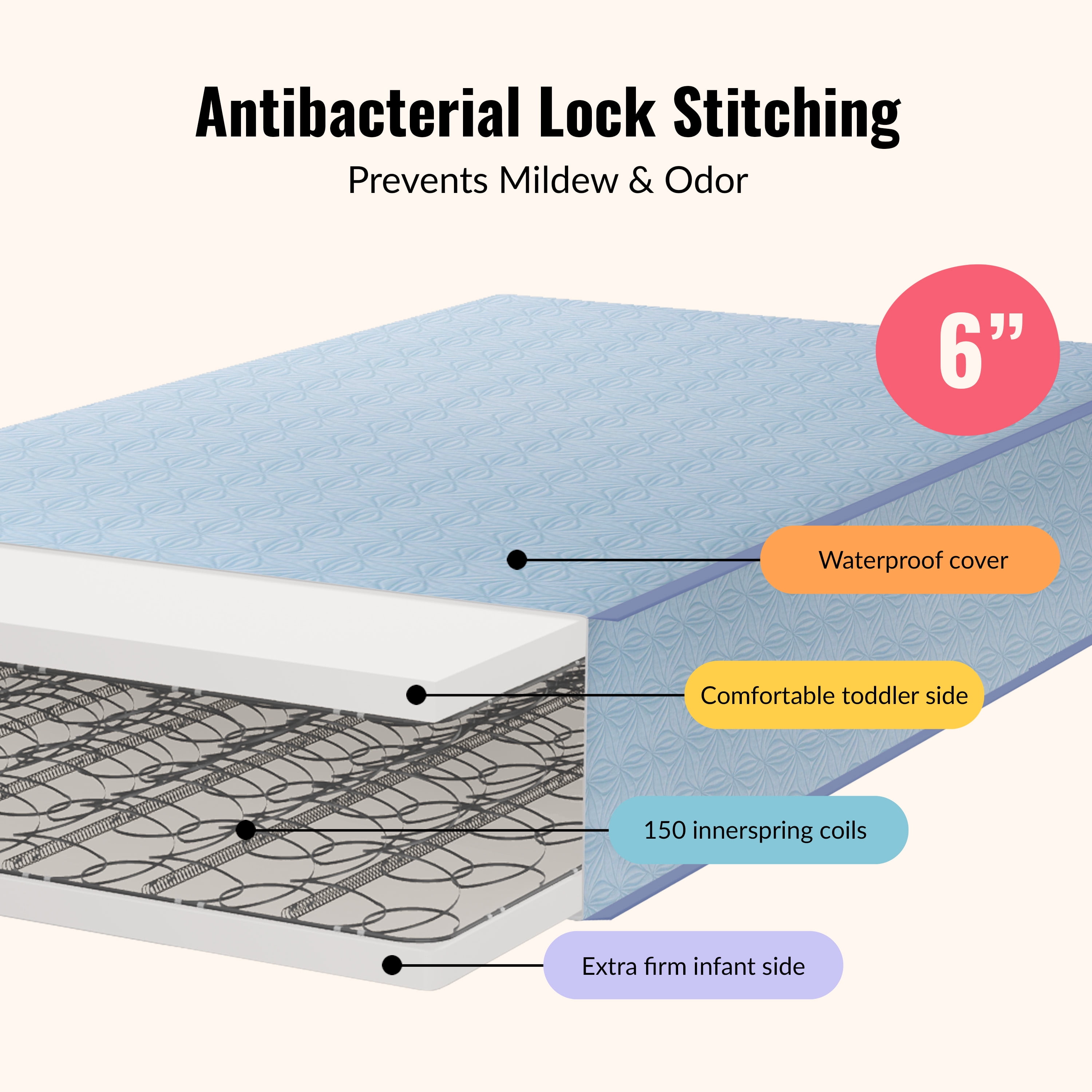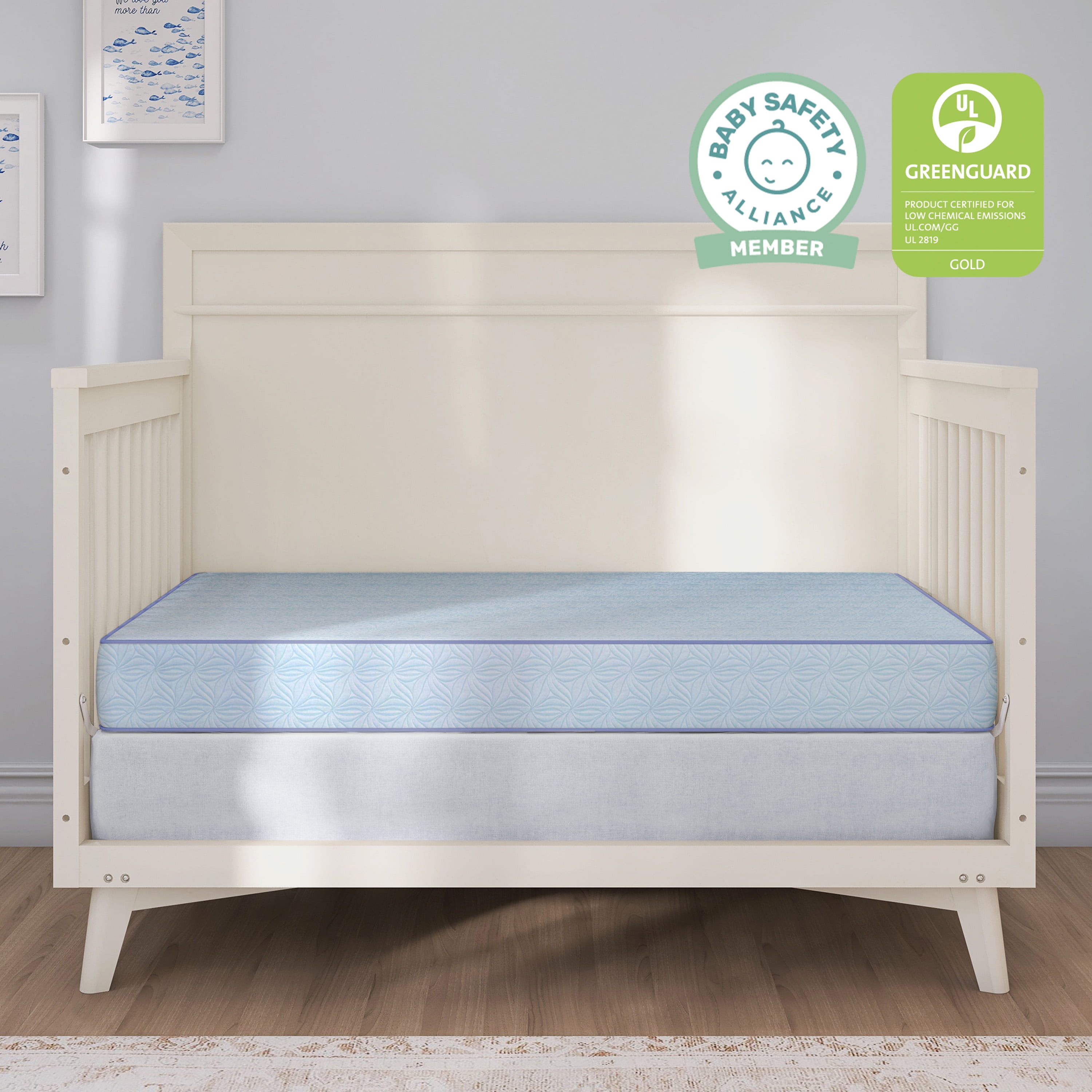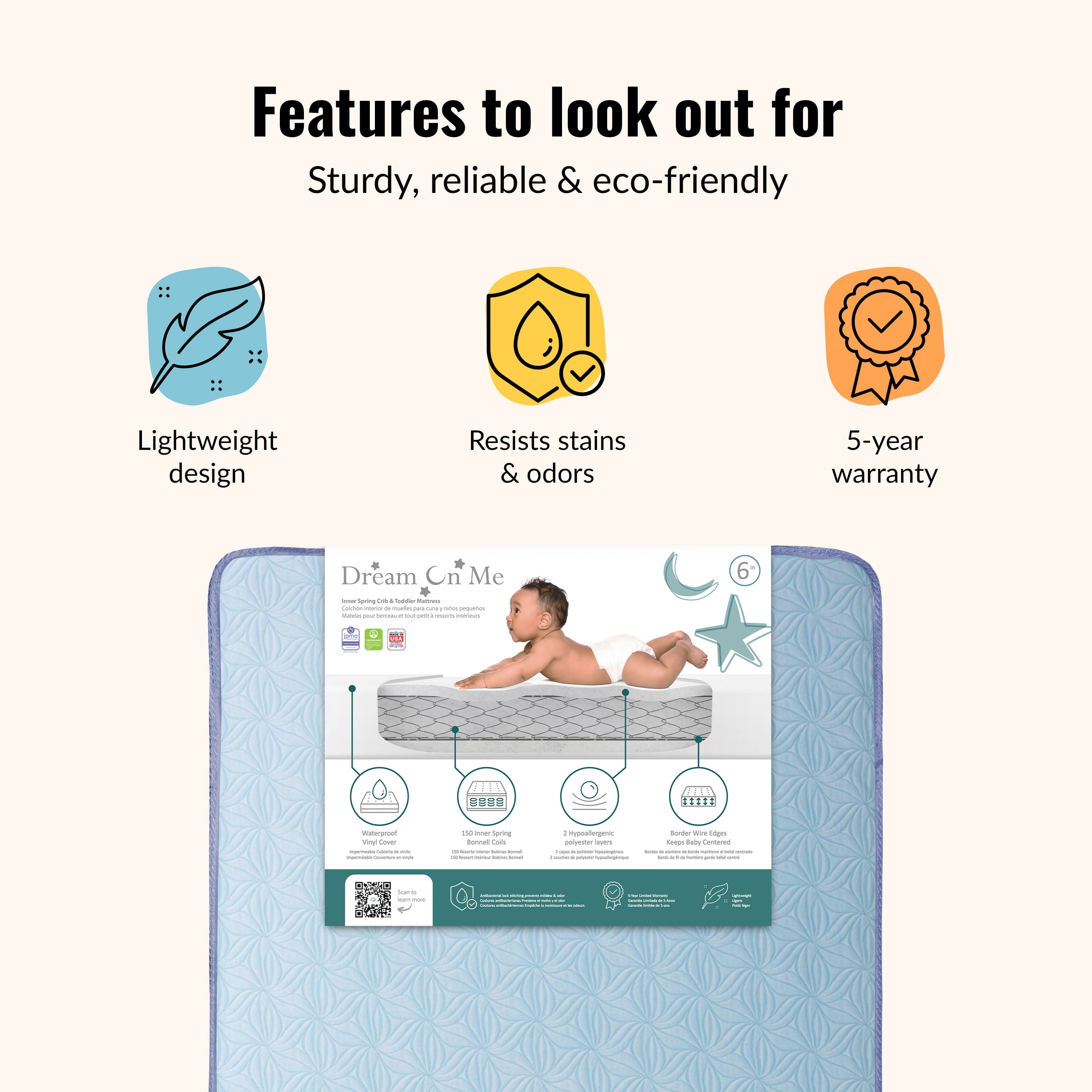 Dream On Me Moonlight Crib and Toddler 130 Coil Mattress: Dream On Me Moonlight crib mattress features 130 heavy-gauge steel coils interwoven for a firm foundation 2 non-allergenic layers provide lasting durability and support Reinforced cover and binding resist liquids and stains and wipes clean with soap and water Waterproof lock-stitched binding helps prevent mold, mildew, and odor Airflow pocket helps keep the mattress fresh without the use of small metal vents Fits all U.S. standard-size cribs and toddler bed frames Meets or exceeds all flammability and lead testing and does not contain toxic fire retardants Dimensions: 52″L x 27″W All Dream On Me mattresses are GREENGUARD Gold Certified for a healthy indoor environment for your baby Questions about product recalls? Items that are a part of a recall are removed from the site, and are no longer available for purchase. These items include items only, not those of Marketplace sellers. Customers who have purchased a recalled item will be notified by email or by letter sent to the address given at the time of purchase. For complete recall information, go to Recalls.