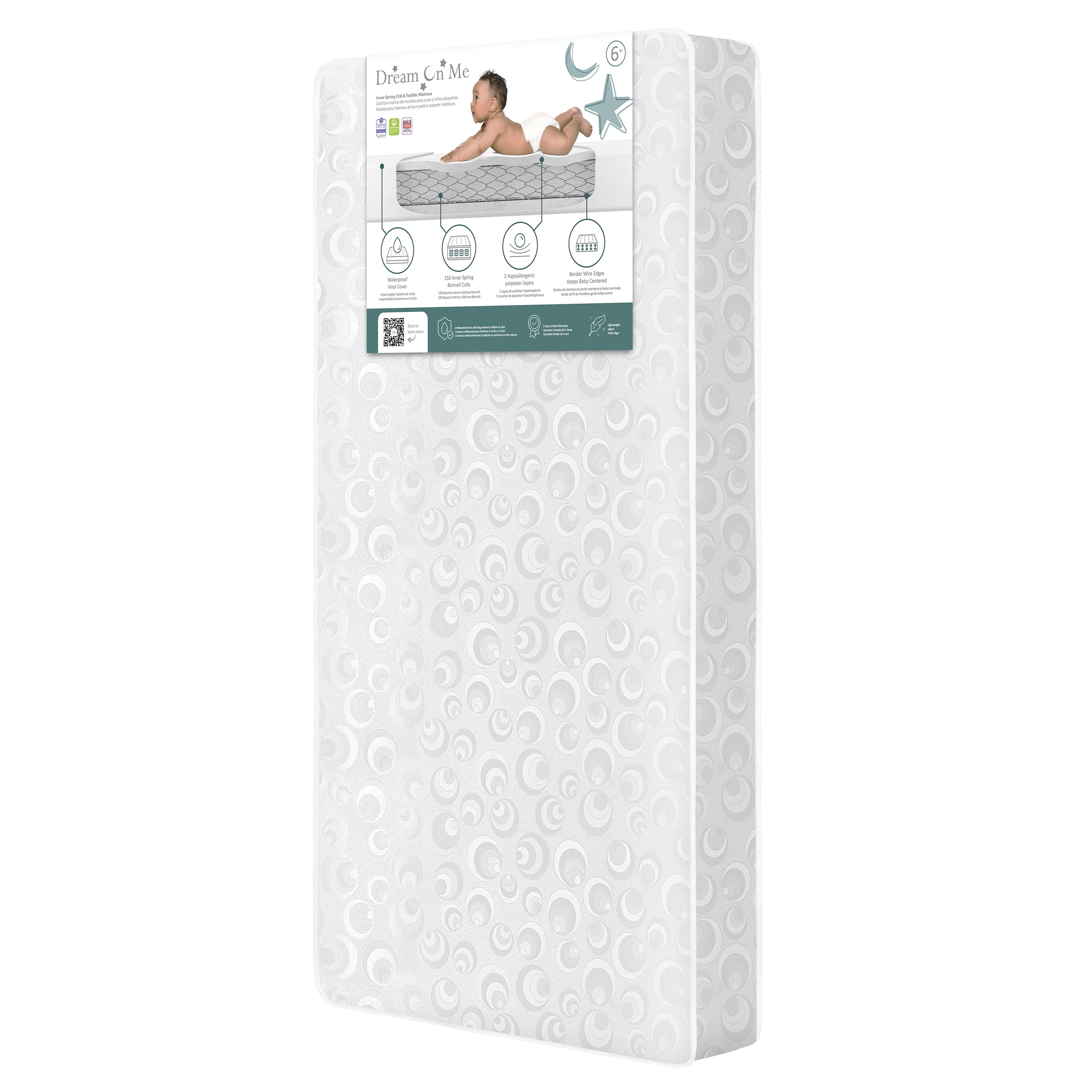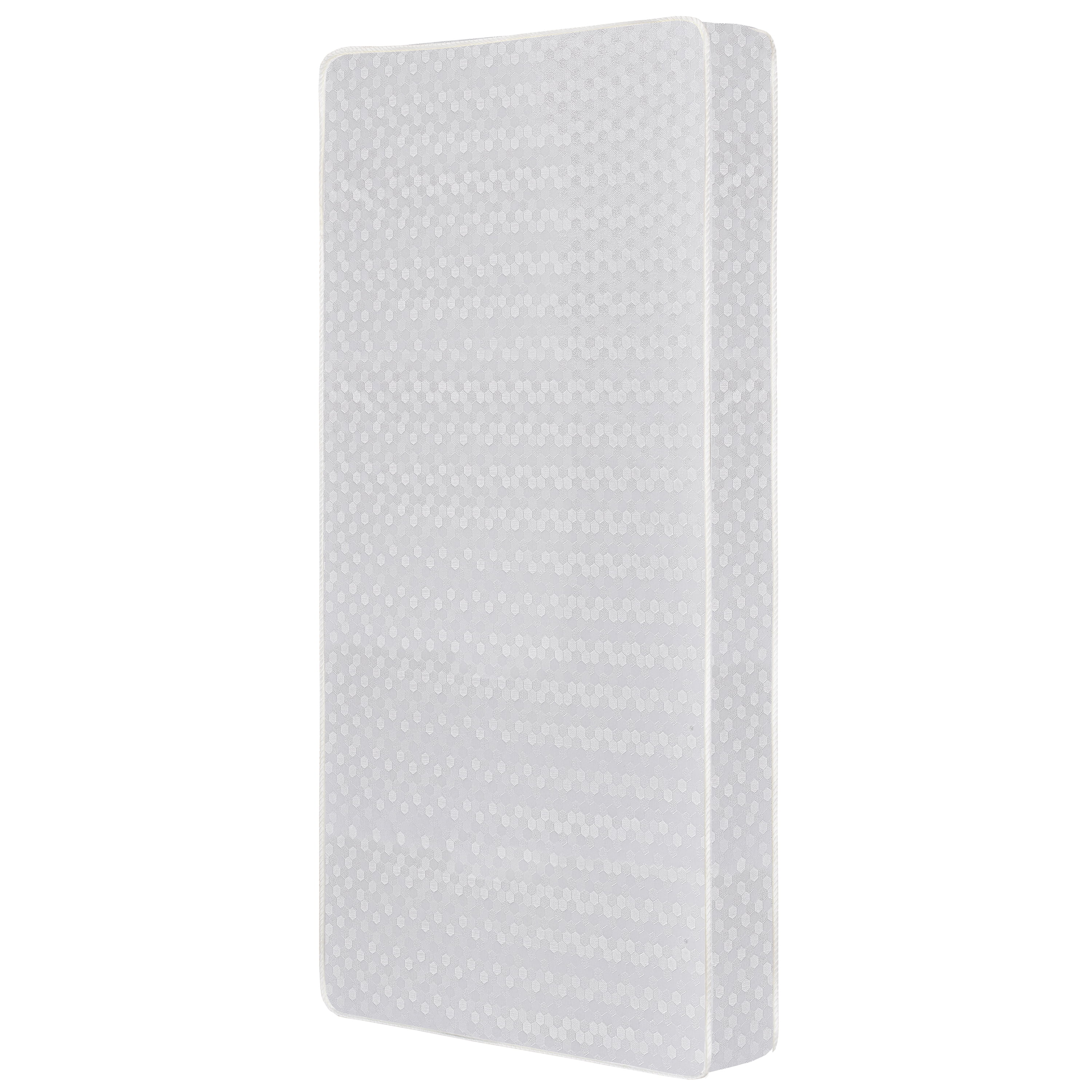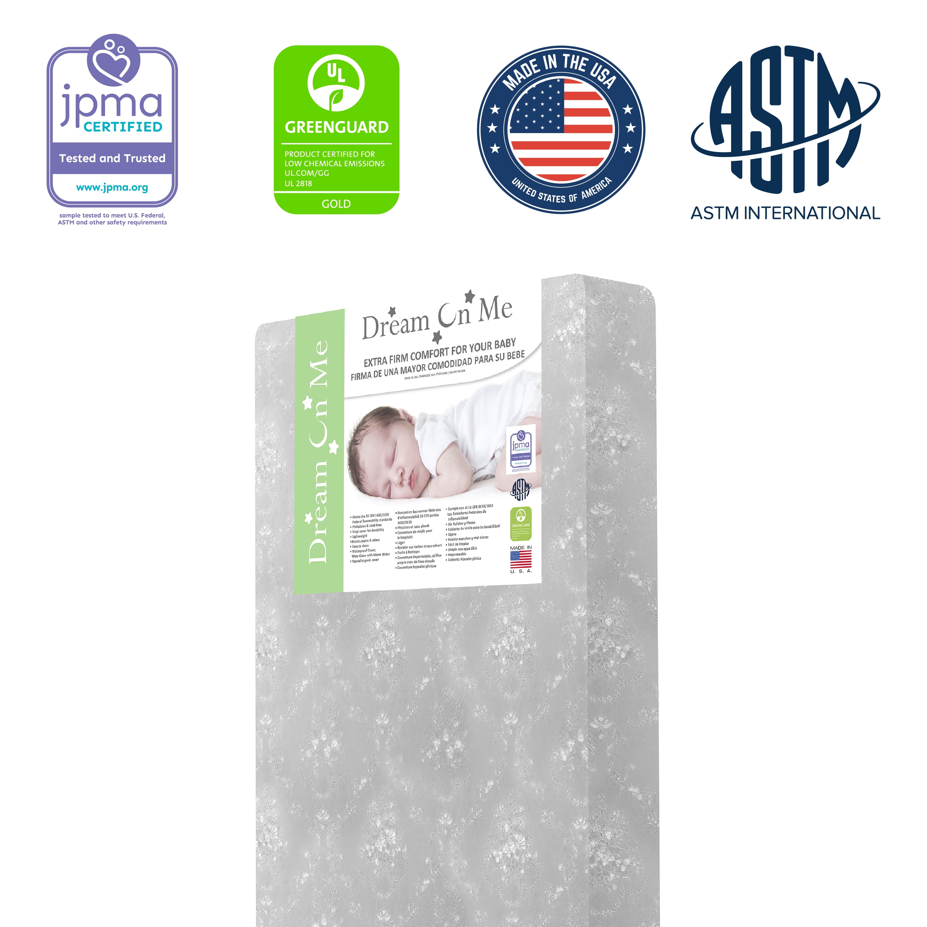 SAFETY ALL THE WAY: This Dream On Me Crib Mattress is Greenguard Gold Certified and meets/exceeds all flammability (16 CFR 1632/1633), phthalate, and lead tests. It is also designed, engineered, and proudly, with a 10-year warranty. It has a flat surface without any incline. EASY MAINTENANCE: The mattress has a waterproof, vented cover that keeps liquids and stains out to maintain hygienic & safe sleep conditions, and ensure freshness. STYLISH FINISH: The mattress comes in a chic, white honeycomb vinyl cover. In case it gets dirty, wipe it clean with mild soap and warm water. FIRM SUPPORT FOR YOUR GROWING CHILD: This Mattress has a 5” fiber core that provides the optimum foundation for your growing child and can be used for both infants and toddlers. PRODUCT SPECS.: The mattress dimensions are 52” L x 28” W x 5” H and it weighs 8 Lbs.