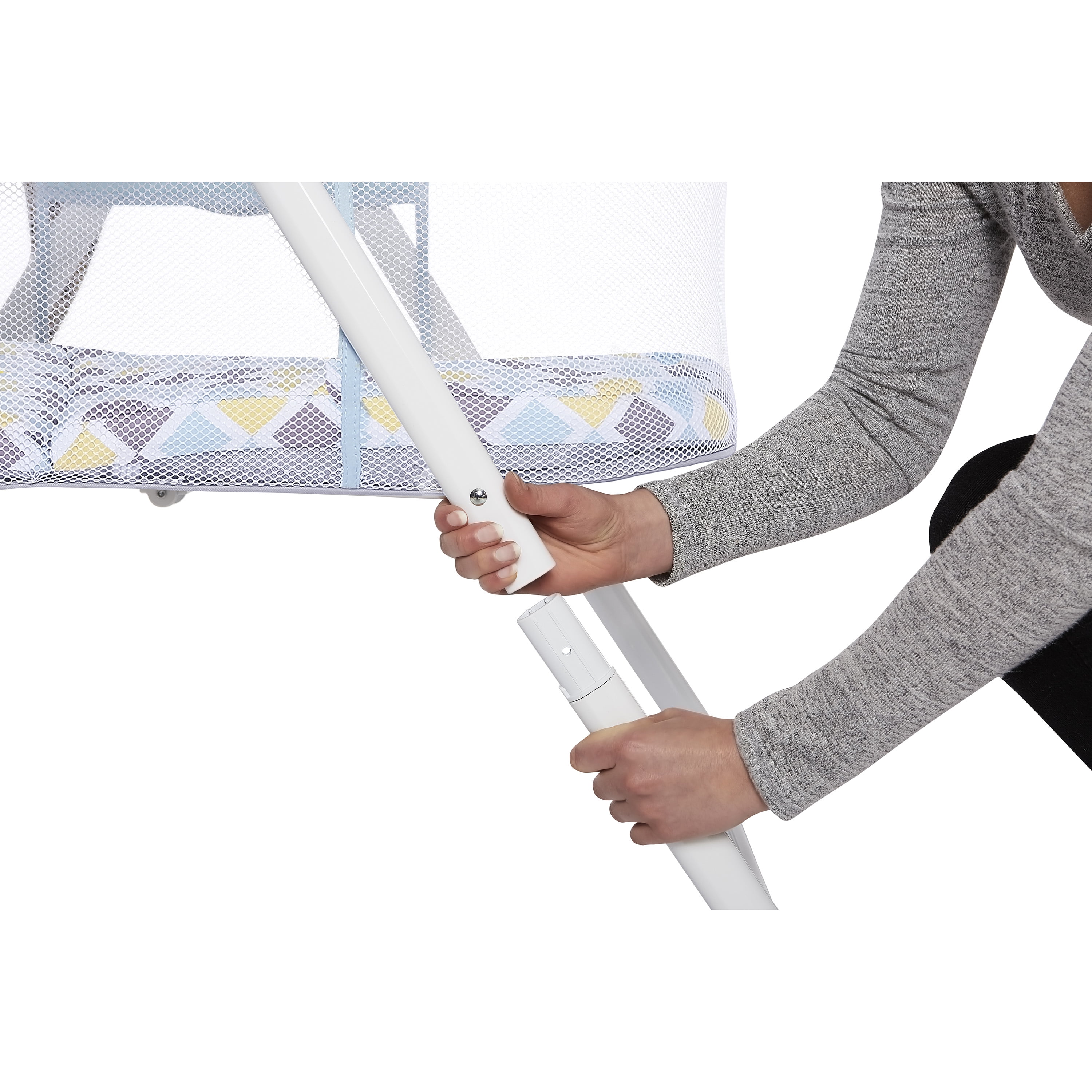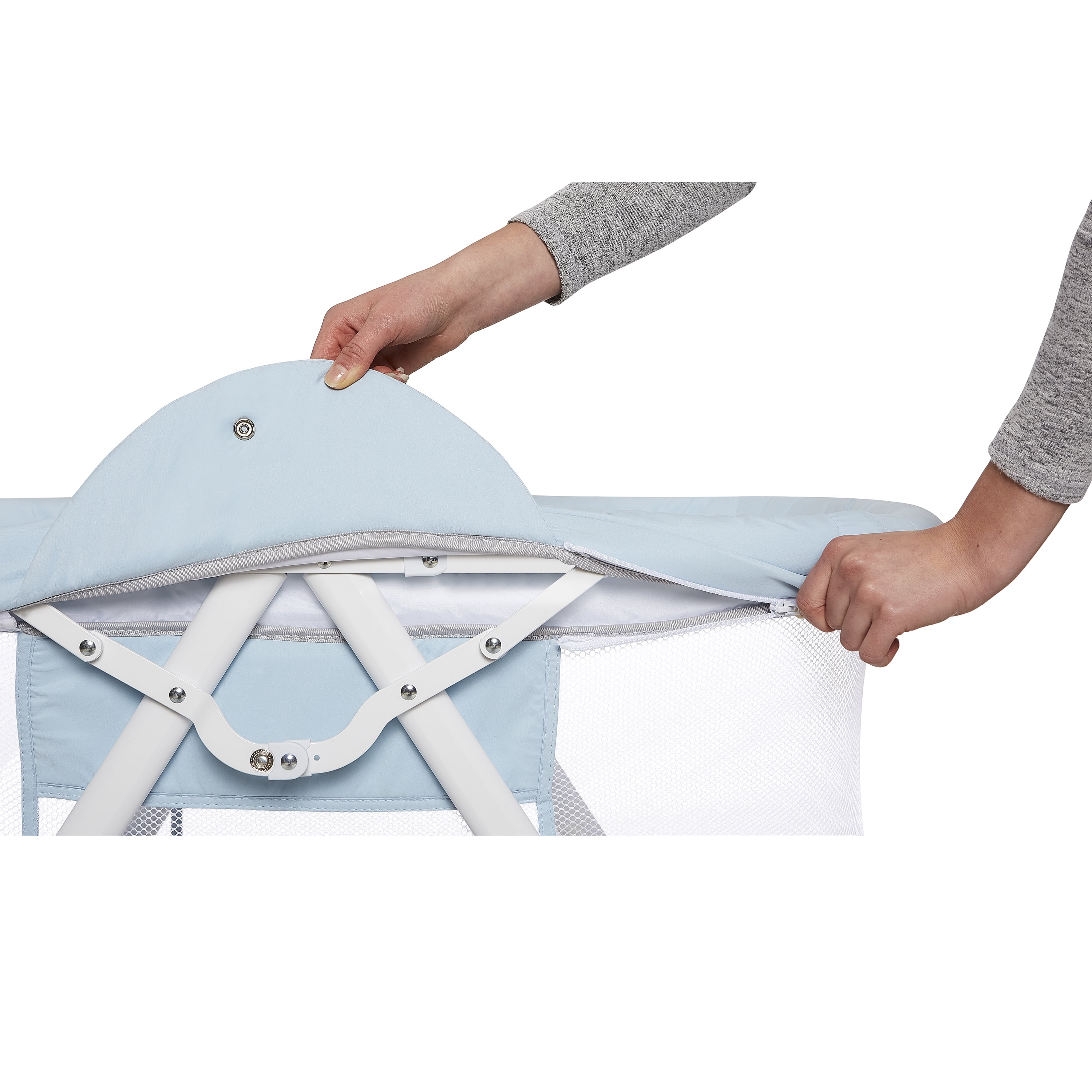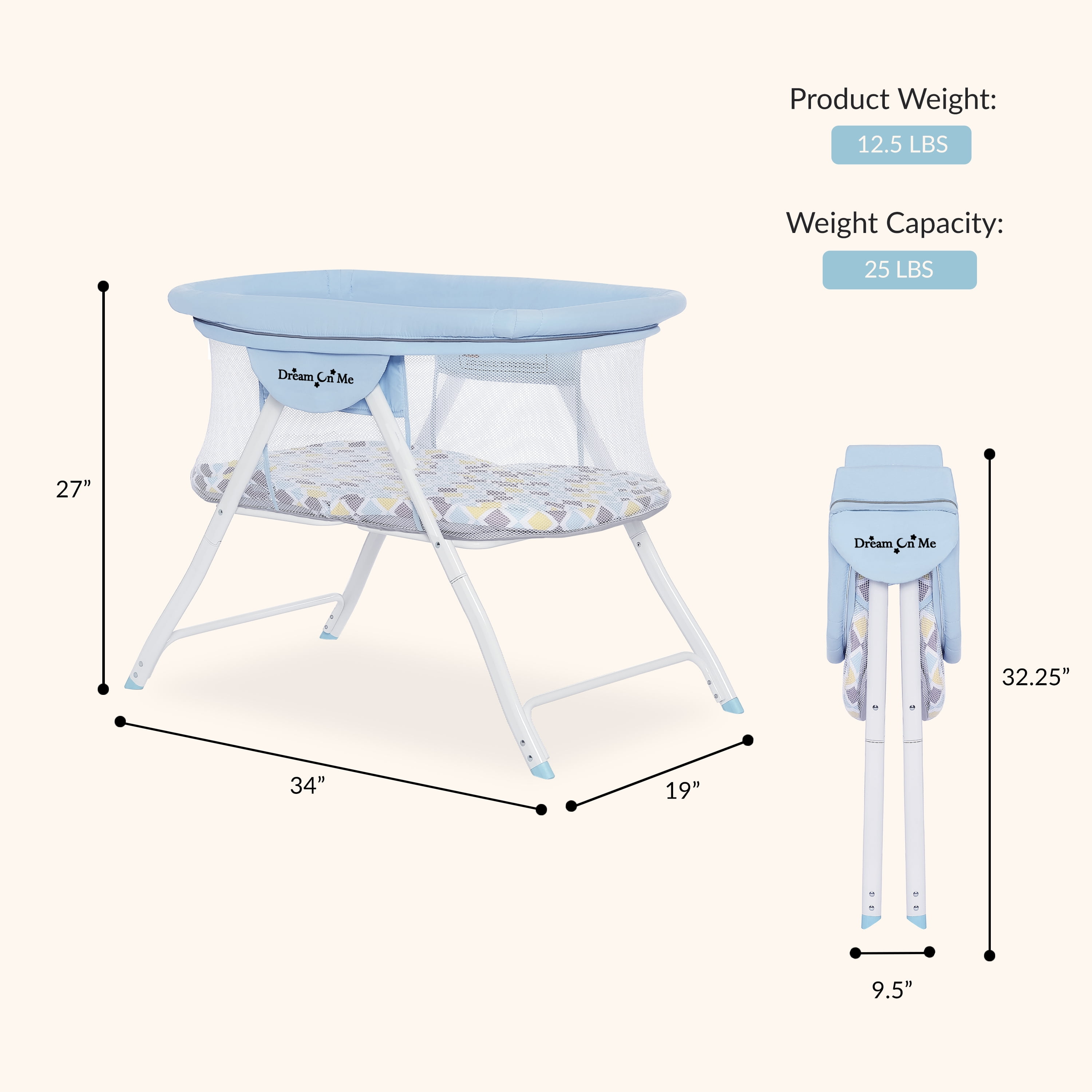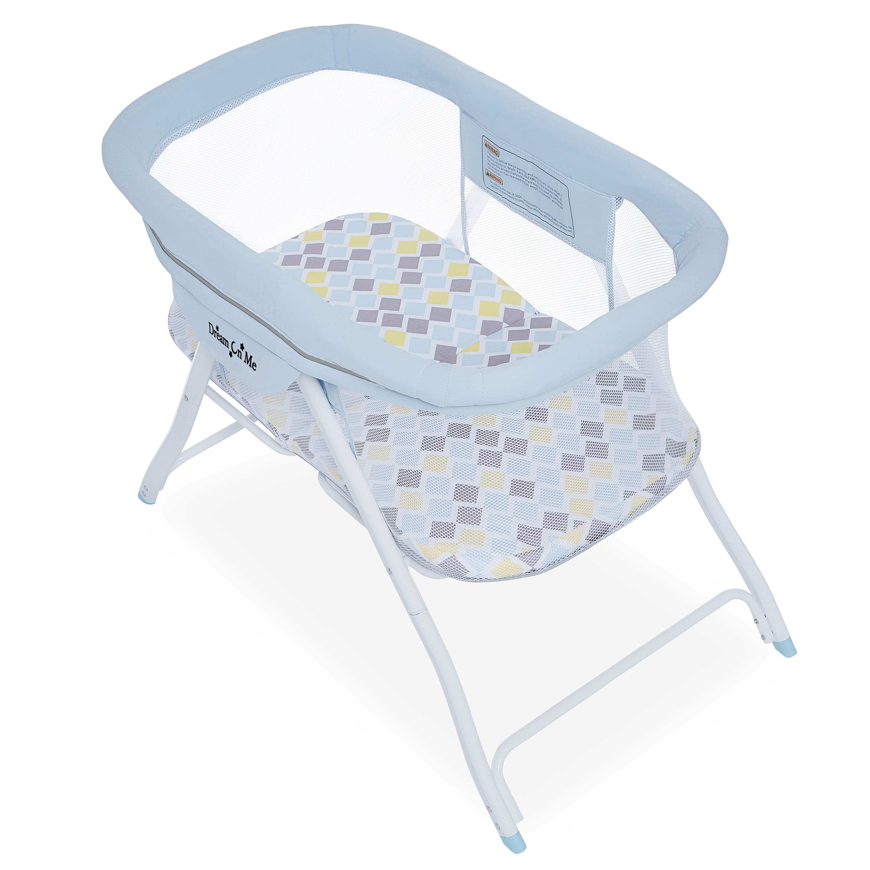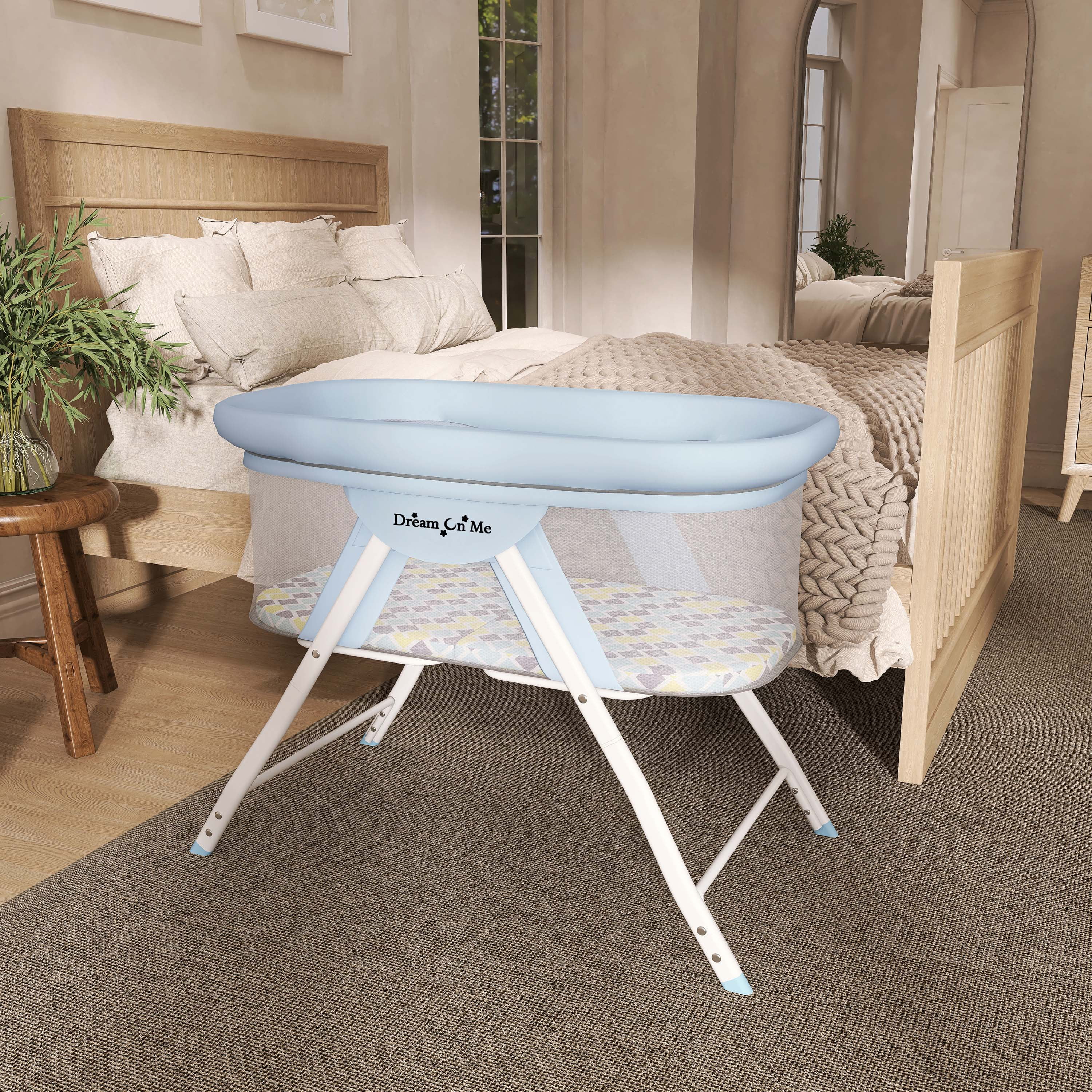 Sets up in seconds thanks to the convenient snap-on legs and one-piece top structure Lightweight aluminium frame makes it easy to carry around Folds & stores compactly in the provided travel bag The bassinet is made of a soft and safe polyester foam fabric which is easy to clean Full mesh design that ensures optimal visibility and ventilation Comes with a removable padded mattress that folds easily for compact storage The zipper cover is detachable and easy to clean Use from 0-3 months and/or until the baby can push-up/roll over unassisted, max weight limit is 25lbs. JPMA certified to meet/exceed the standards set by the CPSC & ASTM This bassinet has a flat surface without any incline.