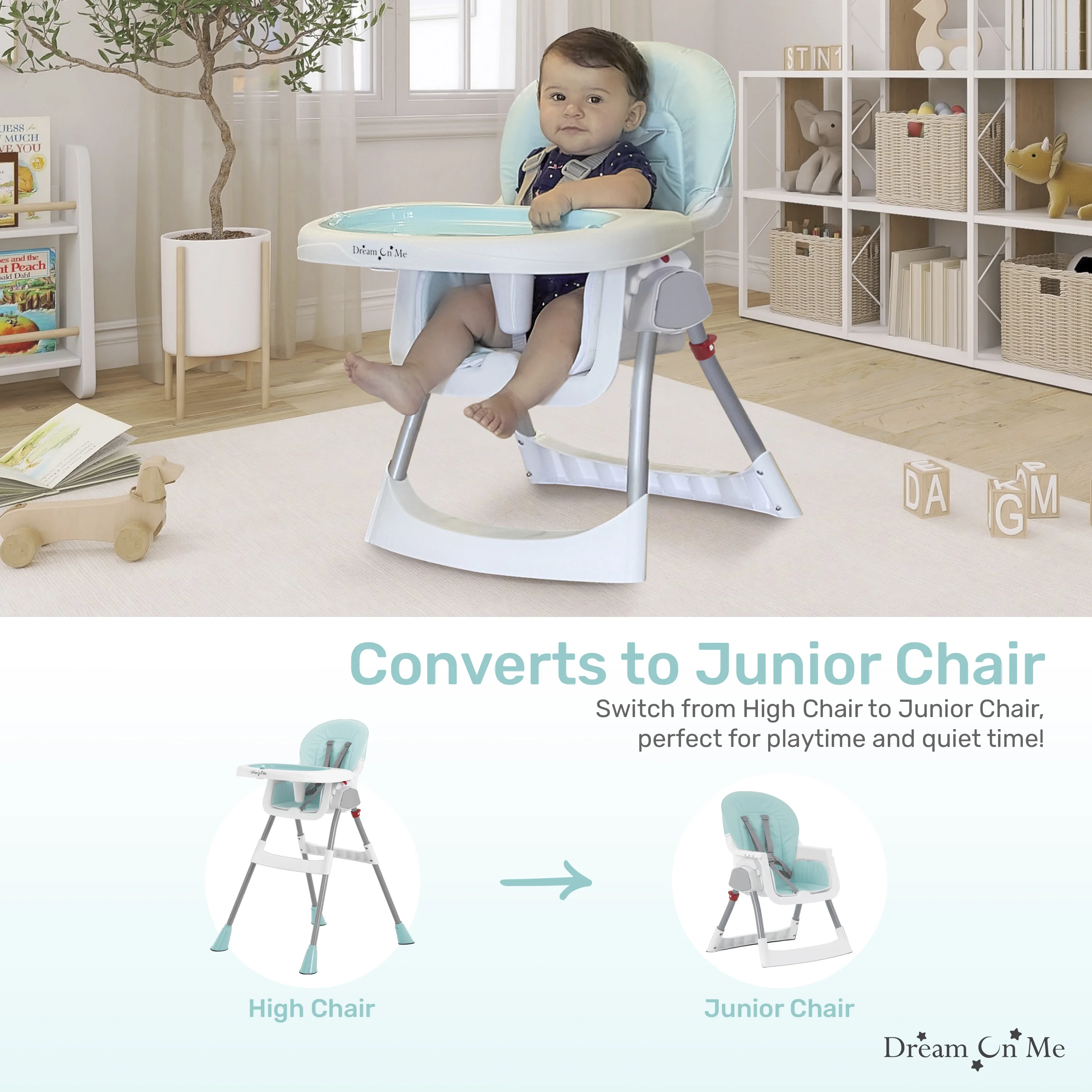 Designed for versatility, it features upper leg tubes with a rounded shape, a new joint base for improved stability, and a redesigned tray hanging system for added convenience. With three height adjustments and a padded seat, your baby enjoys maximum comfort. Cleanup is a breeze, just pop the detachable inner tray into the dishwasher and wipe down the seat with a cloth. This highchair effortlessly converts into a toddler chair, making it perfect for playtime, Storytime, or TV time. Its lightweight frame allows for easy movement, while the self-standing fold ensures compact storage. Plus, the tray conveniently stores at the back when not in use. At Dream On Me, safety comes first—the Table talk High Chair is equipped with a 5-point safety harness, anti-skid feet, and a durable plastic buckle. It meets ASTM/CPSC safety standards, giving you peace of mind. Dimensions of High Chair: 15.9″ L x 11.3″ W x 22.3″ H; Dimensions of Junior Chair: 17.5 L x 16″ W x 24″ H. Recommended for ages 6 months to 3 years.