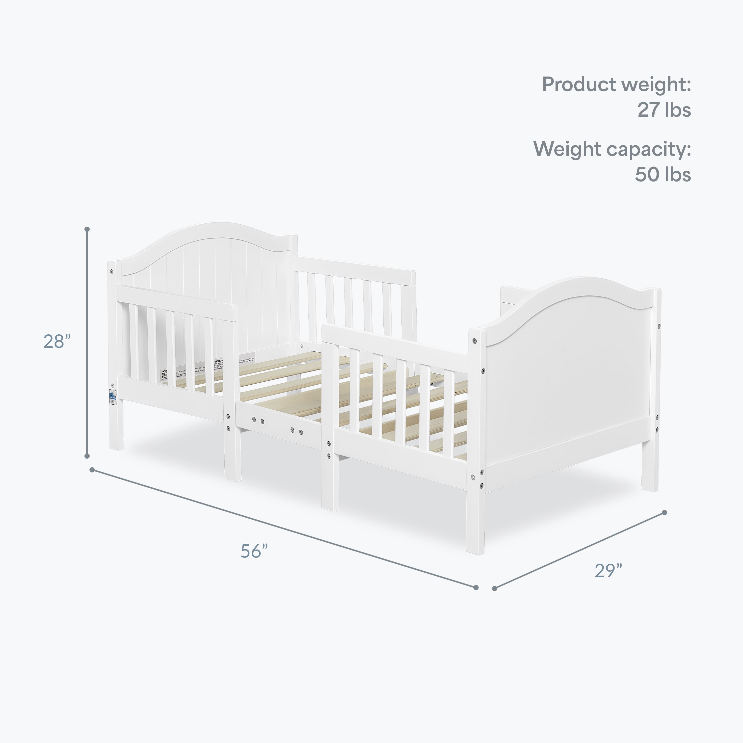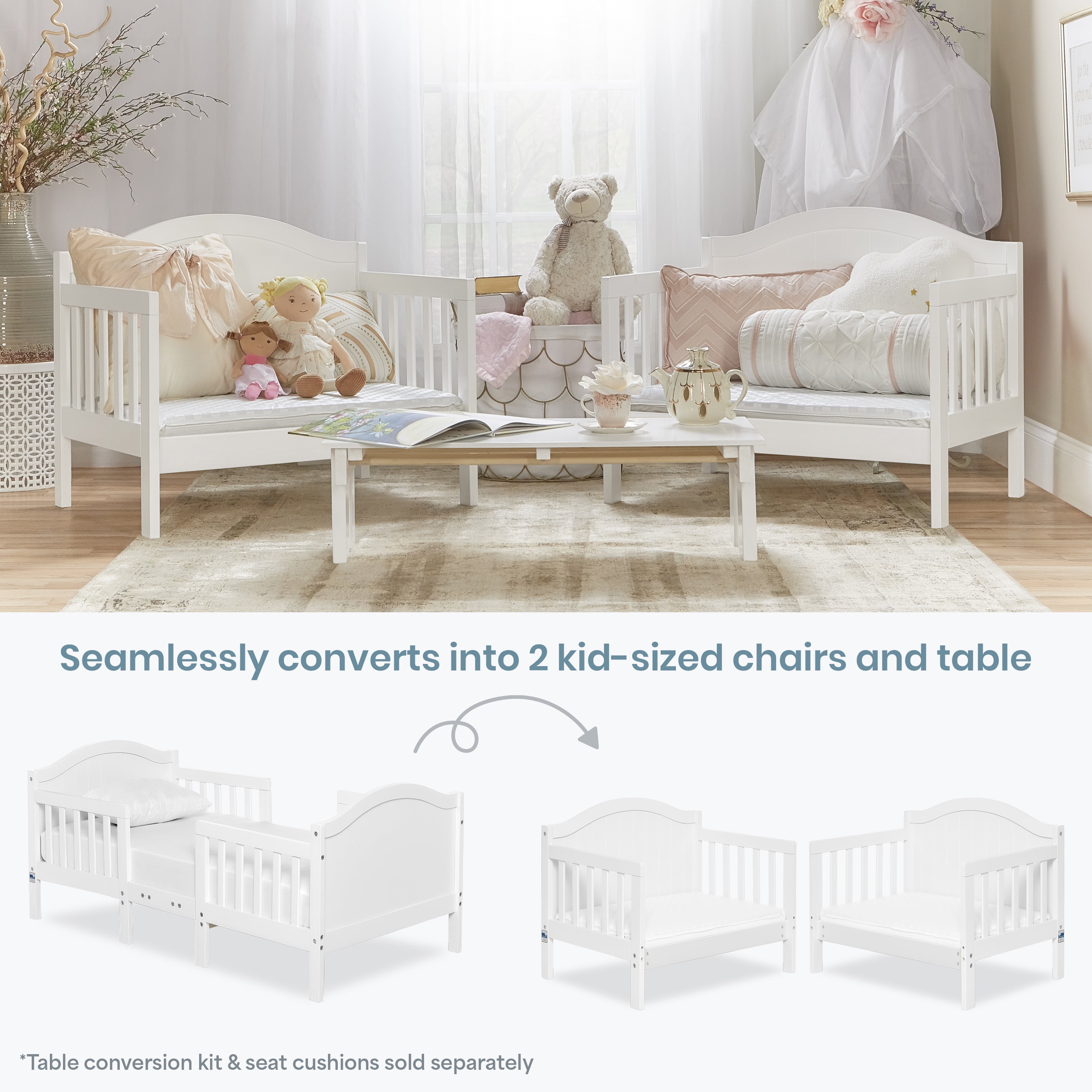 Dream On Me Portland 3 in 1 convertible Toddler Bed: Constructed out of New Zealand pine wood Weight Capacity: 50 lbs All tools for assembly included. Assembled Dimensions: 57 L x 29 W x 28 H. Tested for lead and other toxic elements to meet or exceed government and ASTM safety standards. Coverts to two child chairs and a table, conversion kit sold separately. Chair 1- Assembled Dimensions: 29 L x 29 W x 18 H Chair-2 Assembled Dimensions: 29 L x 28 W x 18 H. Table -29 L x 14 W x 8 H