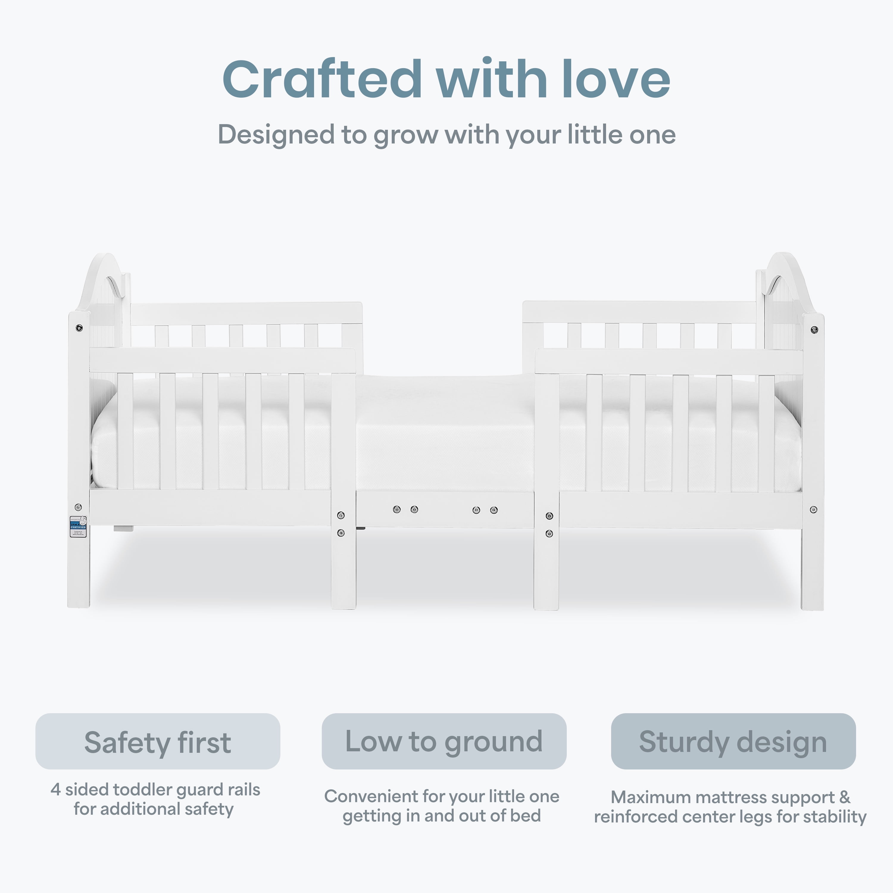 This bed brings a colorful charm to any toddler’s room with its modern chic design. This toddler bed offers a modern silhouette featuring a bell-shaped full panel headboard and footboard which accommodates them as they grow with a low to the floor design, it is ideal for your toddler to safely get in and out of bed. It is reinforced for stability with center legs and comes complete with four side safety rails for added security in radiant finishes. The Dream On Me Portland Toddler Bed is the perfect transition for toddlers, who have outgrown their cribs but are still too small for an adult bed. The Portland Toddler Bed converts from a toddler bed into two kid chairs and a table to adapt to your growing child and complement any room setting. Conversion kits, mattresses, and bedding are sold separately. Dream On Me Portland 3 in 1 toddler meets all applicable ASTM and CPSC standards. The brilliant combination of playful colors and outstanding comfort make this bed a perfect way to enhance any child’s bedroom.