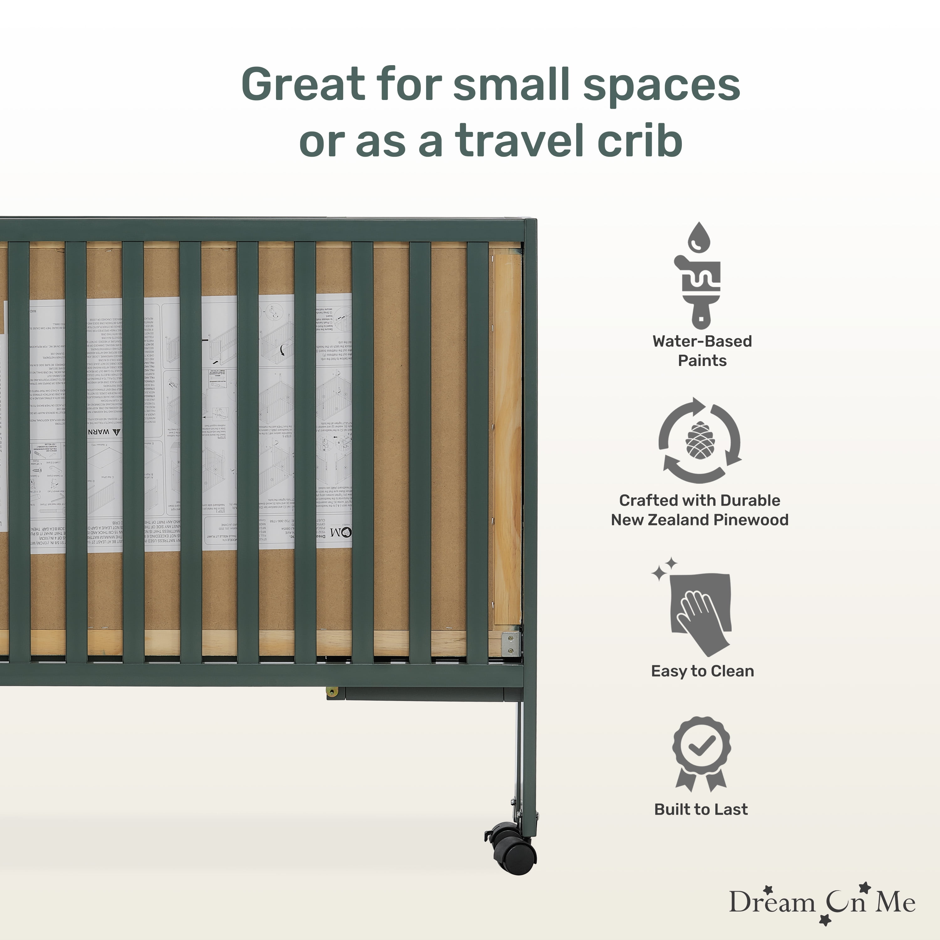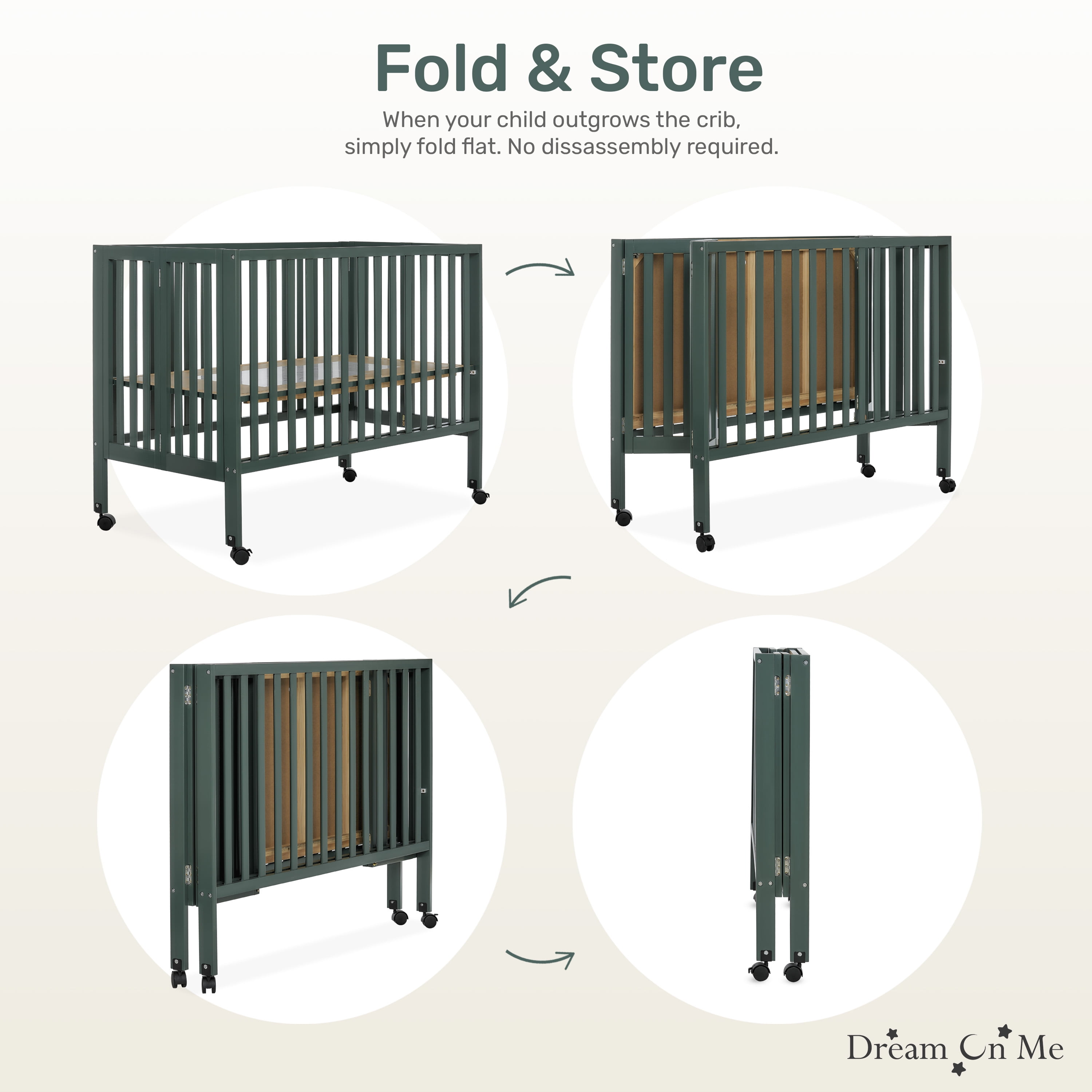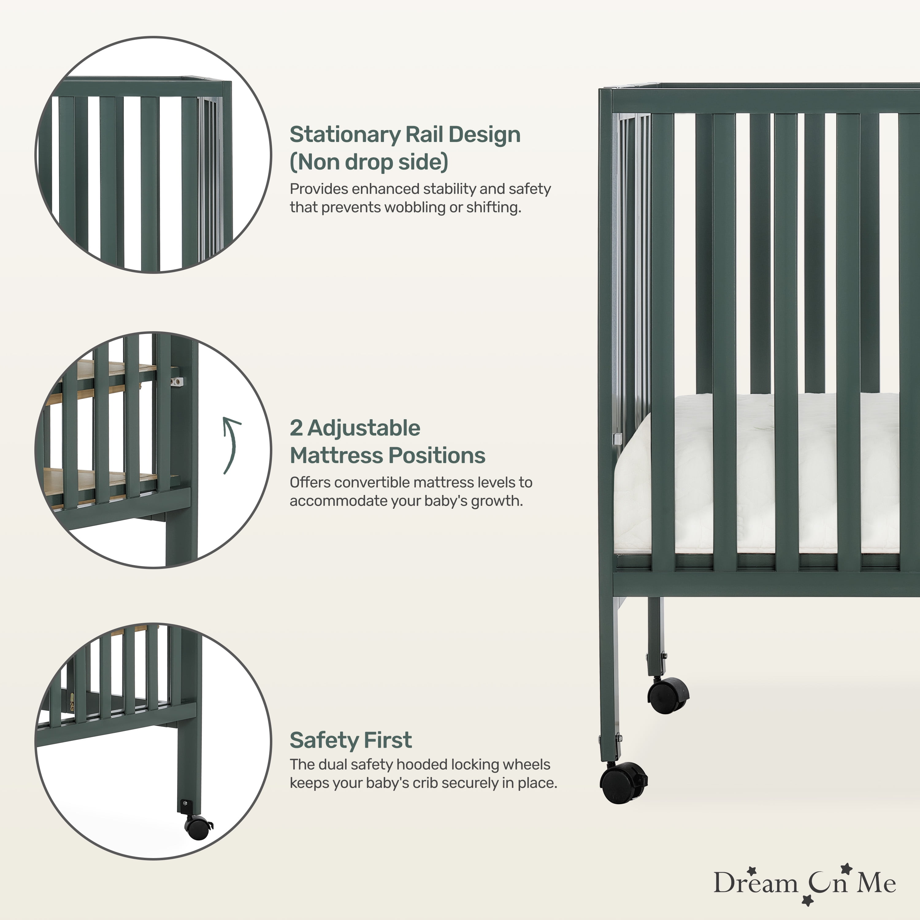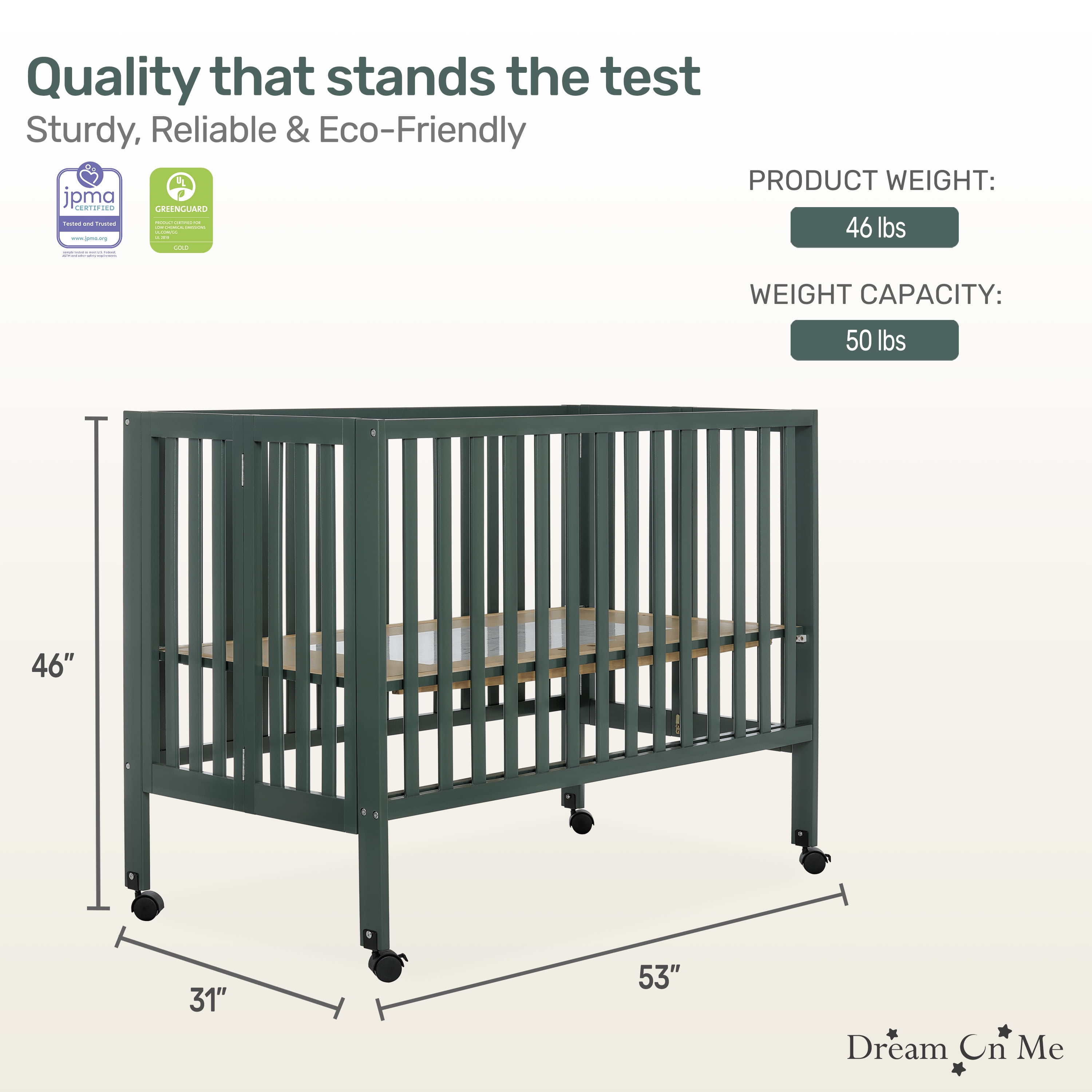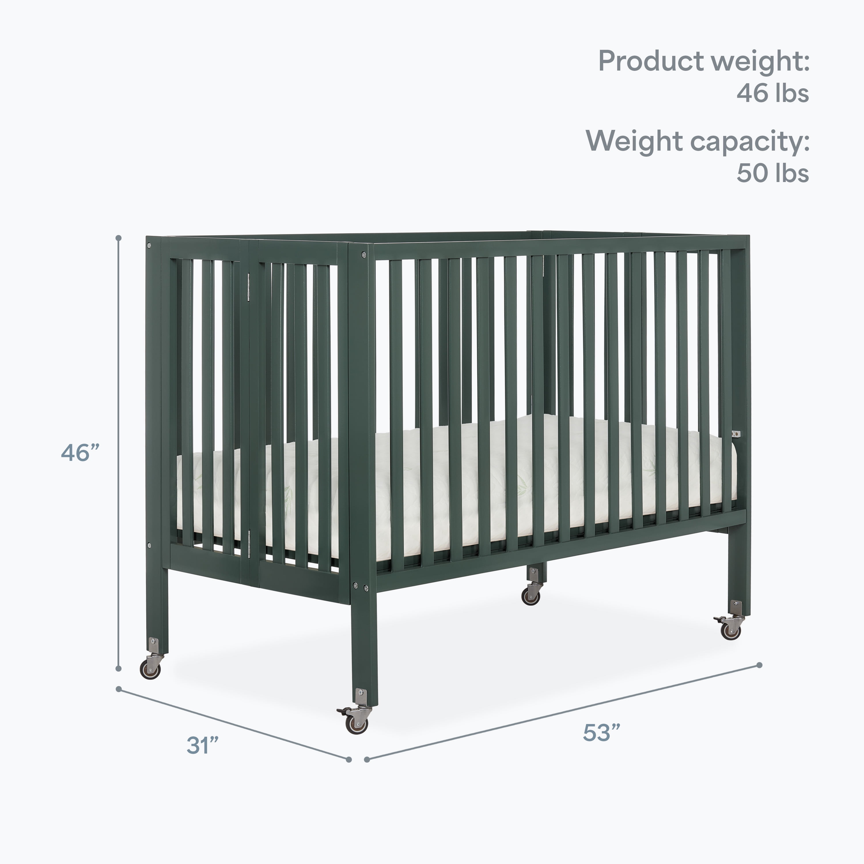 PATENTED FOLDING SYSTEM: The Dream On Me Full Size 2-in-1 Folding Stationary Side Crib is a convenient 2-position folding crib. Once your child outgrows it, the patented folding system allows you to fold it and store with ease IDEAL FOR SMALL SPACES: It is lightweight & mobile-move it easily around your home. It folds flat for storage-compact and perfect for small spaces. Simply unfold and lock in place for when you need to use it again or for when guests with babies visit SAFETY MATTERS: Safety is our topmost priority. All our cribs meet/exceed applicable ASTM & CPSC standards. Safety features include the stationary rail design (non-drop side), dual safety hooded locking wheels and teething guard FINISH OPTIONS: A stylish and contemporary design and six beautiful finish options allow you to effortlessly match it with any nursery theme! All tools for assembly are provided PRODUCT SPECS: Dimensions: 54Lx31Wx46H inches, max weight limit 50 lbs Our portable cribs come with the regulatory 1” mattress pad. We recommend the Dream On Me non-toxic, Greenguard Gold certified full-size crib mattress for the perfect fit
