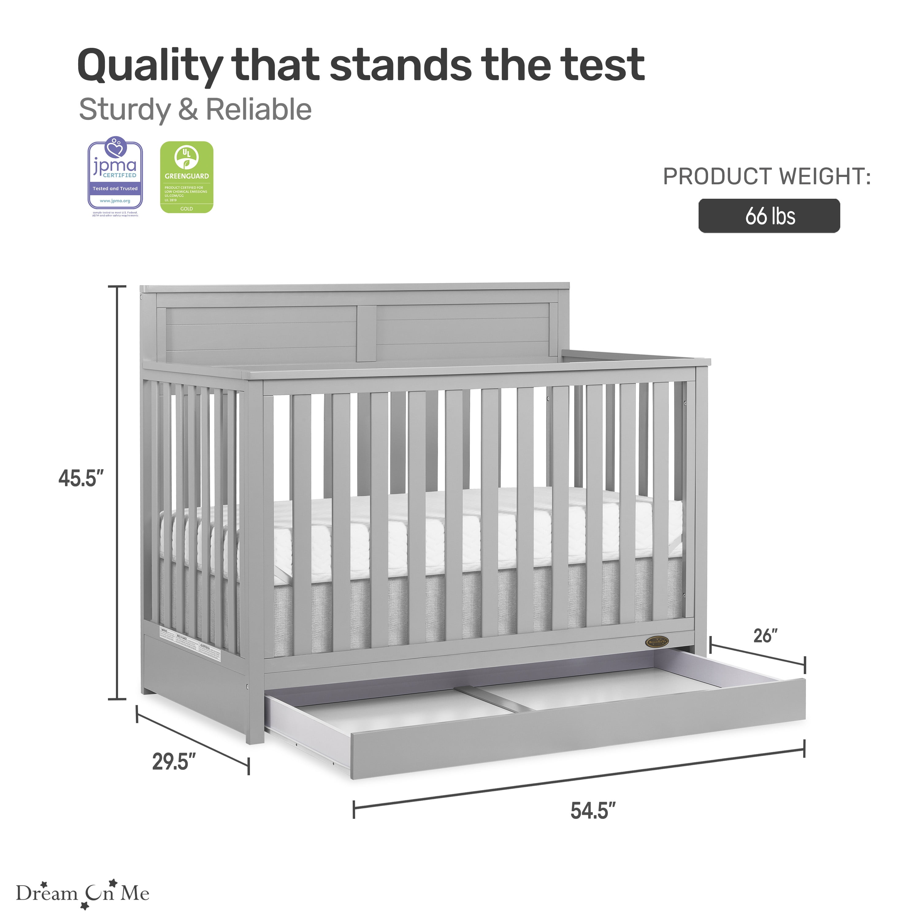 SEAMLESS CONVERTIBILITY: This crib comes with a 3-position adjustable mattress height setting & grows along with your baby as it seamlessly converts from crib to daybed, toddler bed & full-size bed (conversion kit sold separately). SAFETY FIRST: JPMA & Greenguard Gold certified, and meets/exceeds ASTM & SOR standards – the Dream On Me Reign 5 in 1 Convertible Crib with Under Drawer is the safe choice for your little one. ADDITIONAL STORAGE: This thoughtfully designed crib features a stylish flat-top headboard & comes with a 26” deep, big bottom drawer with 2 concave handles for easy opening, that offers additional storage to conveniently organize your nursery items and essentials. THOUGHTFULLY DESIGNED: Crafted with sustainable New Zealand Pinewood & sturdy wooden spindles, with water based paint, the Dream On Me Reign 5 in 1 Convertible Crib with Under Drawer is easy to assemble & clean and comes in 2 pleasant finishes – White & Pebble Grey. PRODUCT SPECS: Product dimensions are 54.5“ L x 29.5” W x 45.5“ H, with a weight of 73.8 Lbs.