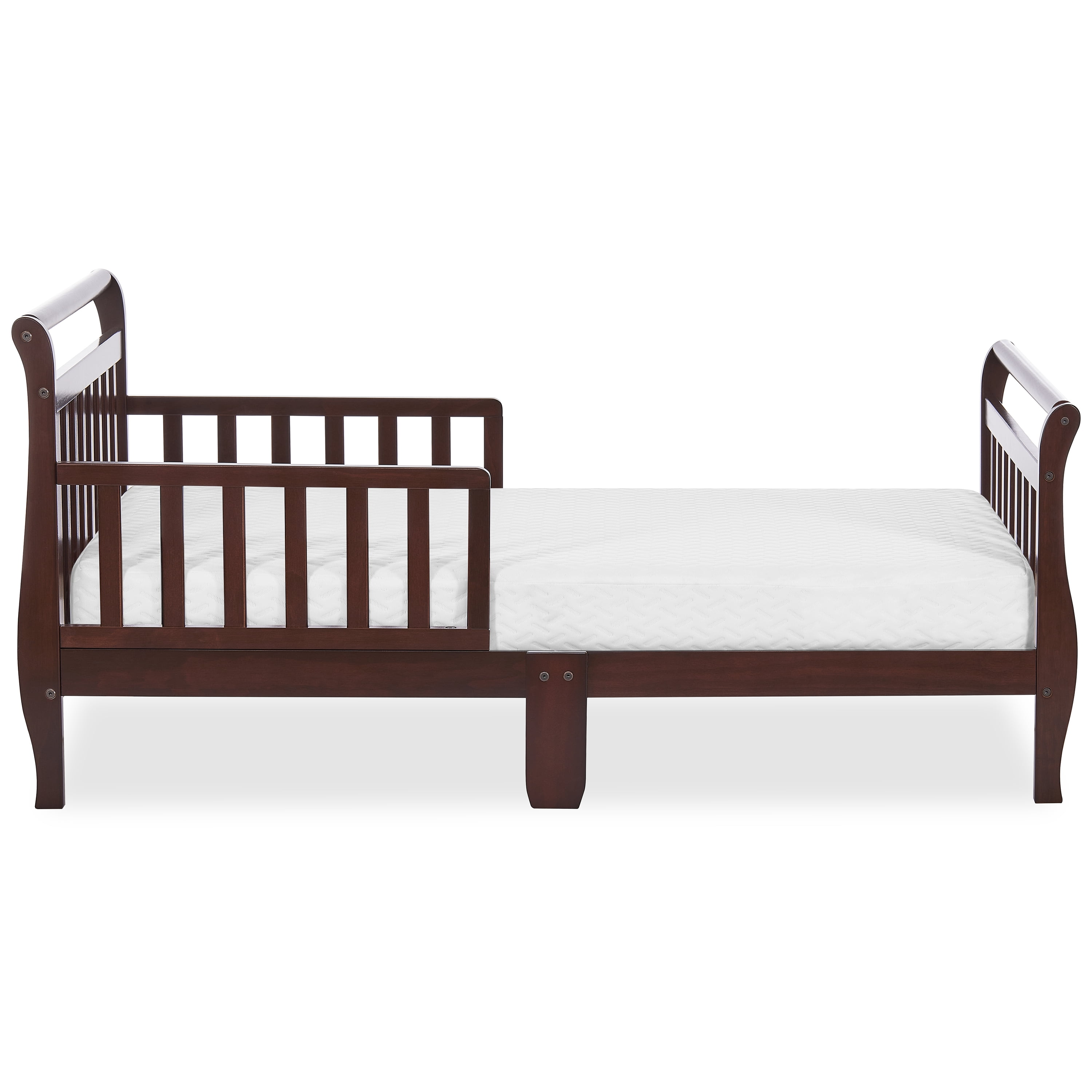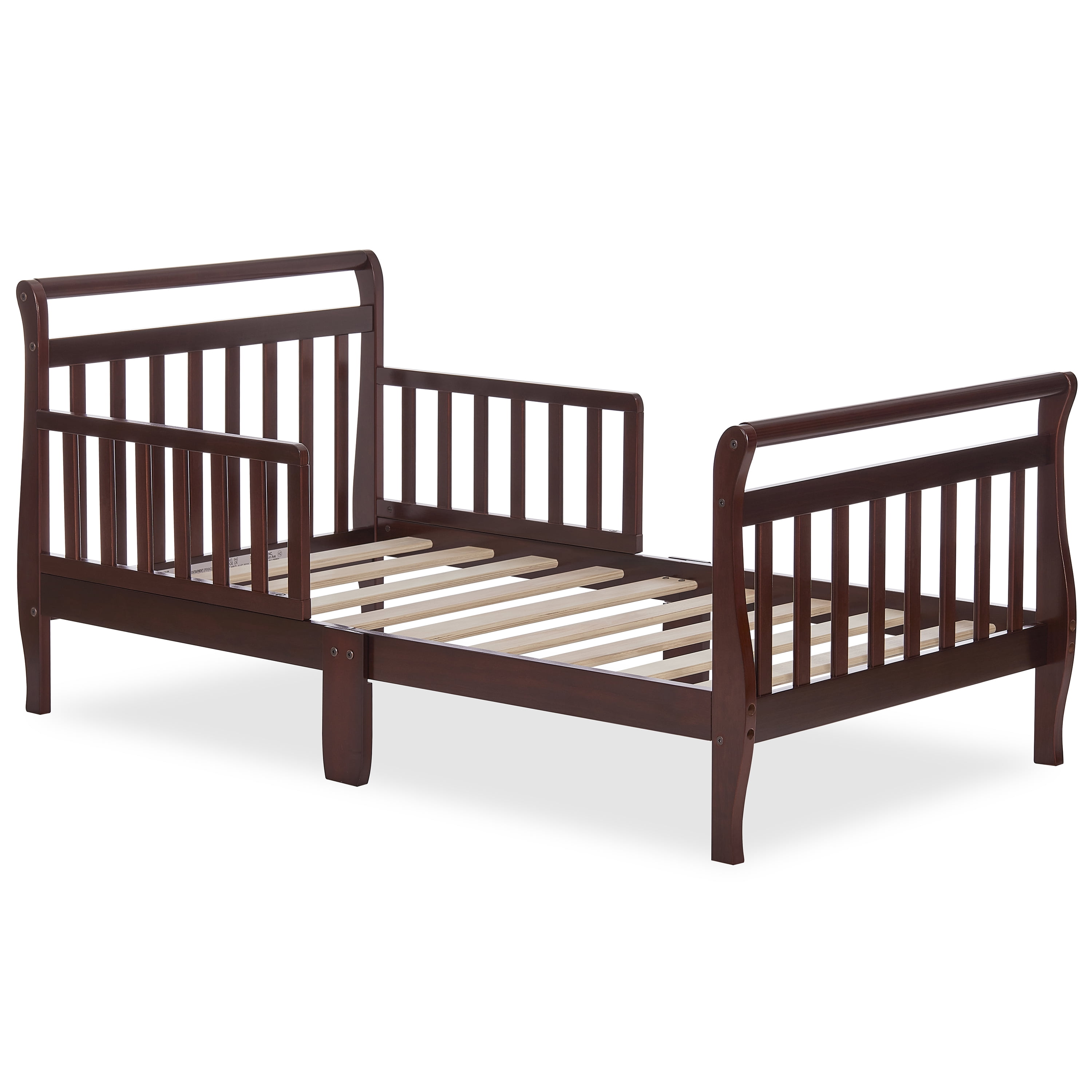 - The Classic Sleigh Toddler Bed sits low to the floor, is designed with two side safety rails & is reinforced for stability with center legs.