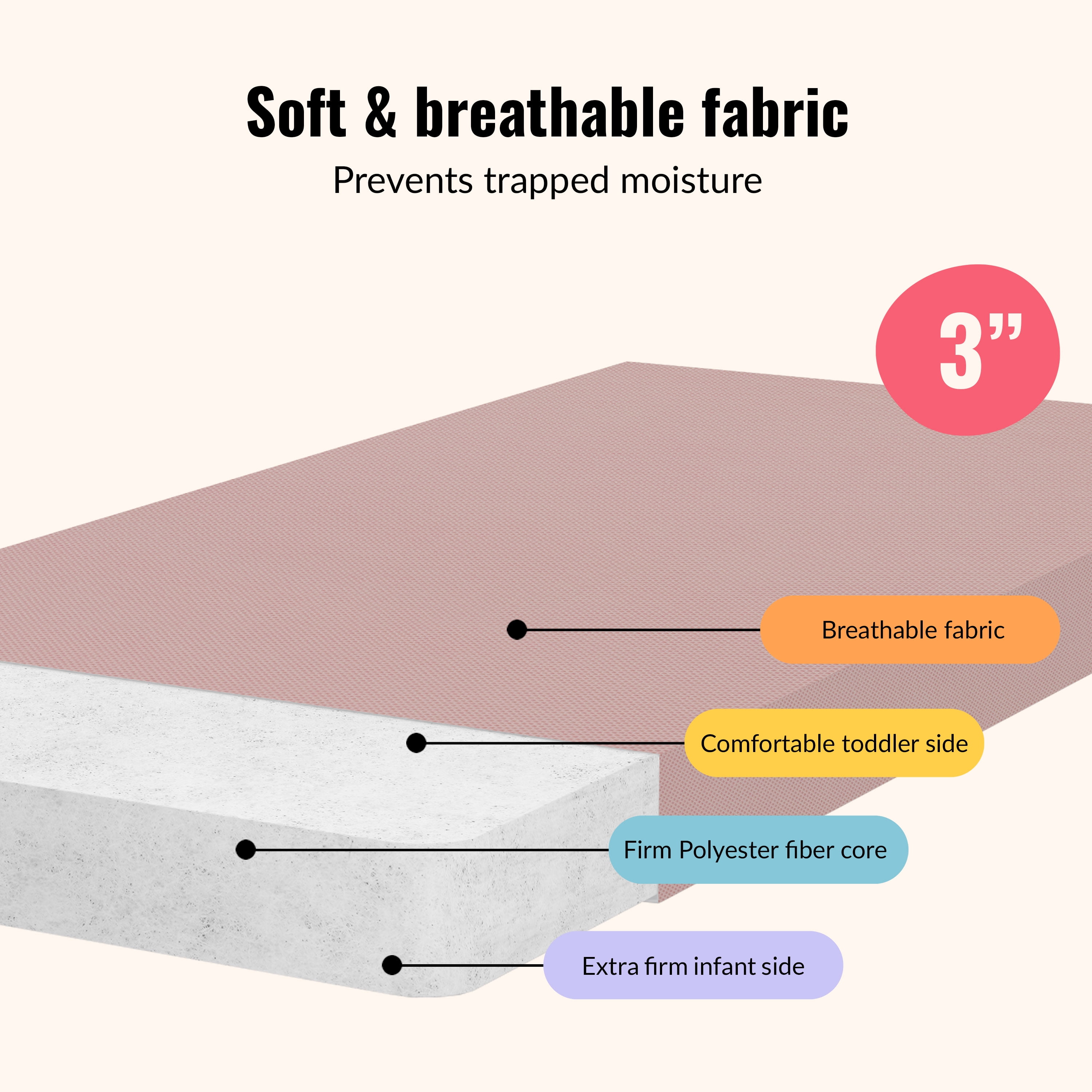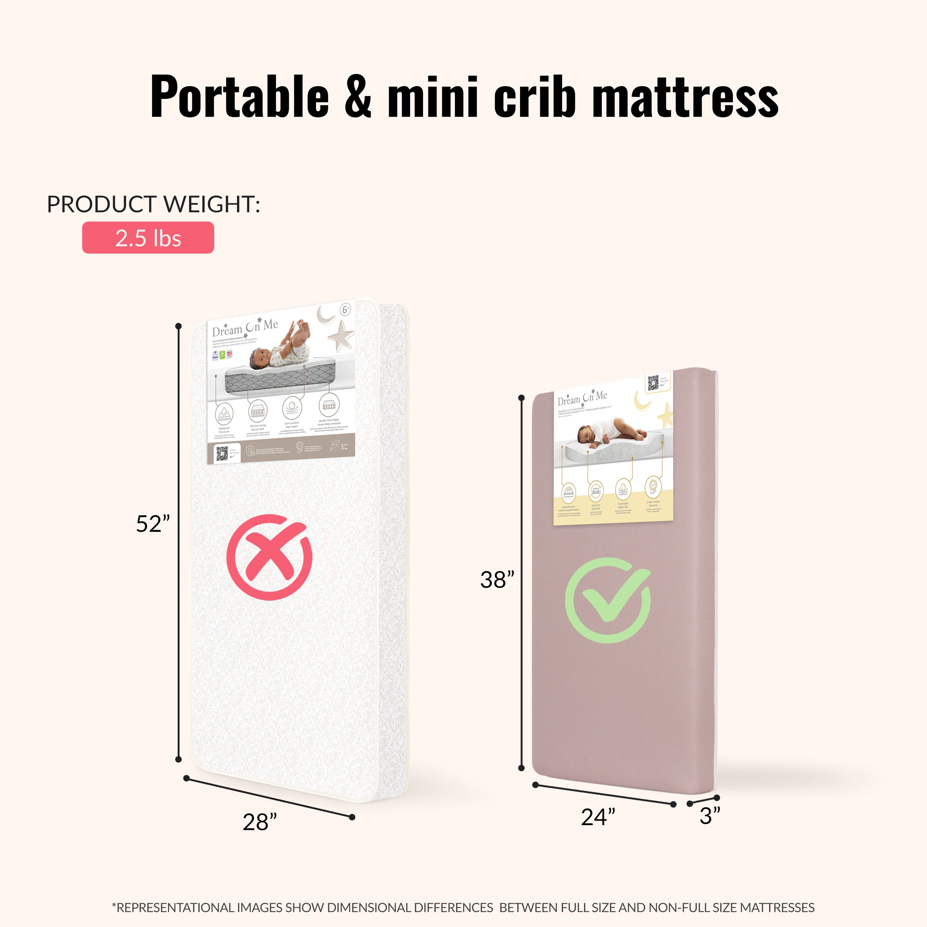 COZY & COMFORTABLE: Embossed Soft Breathable Cover to allow air flow and give your little one a cozy and comfortable rest. The pink finish adds a touch of calm ambience to your little one’s nursery. EASY MAINTENANCE: Cleaning Dream on Me Snuggles Crib Mattress is easy to clean with a warm water and a mild soap to maintain freshness. LIGHTWEIGHT and FIRM: Weighing at around 2.5 lbs, The Snuggles Breathable mattress is lightweight with a square corner design for a snug fit. Extra Firm fiber offers perfect sleep environment and support. SAFETY GUARENTEED: Snuggles Mattress is Greenguard Gold Certified for highest level of safety & health. Passes all Federal Standard Flammability Standard (16 CFR 1633), lead and phthalate tests. PRODUCT SPECS: The Dream on Me Snuggles Potable Crib Mattress is proudly engineered with quality workmanship. Ideal for most portable/mini cribs with dimension: 38L X 24W X 3H inches. Mattress weight is 2.5 lbs.