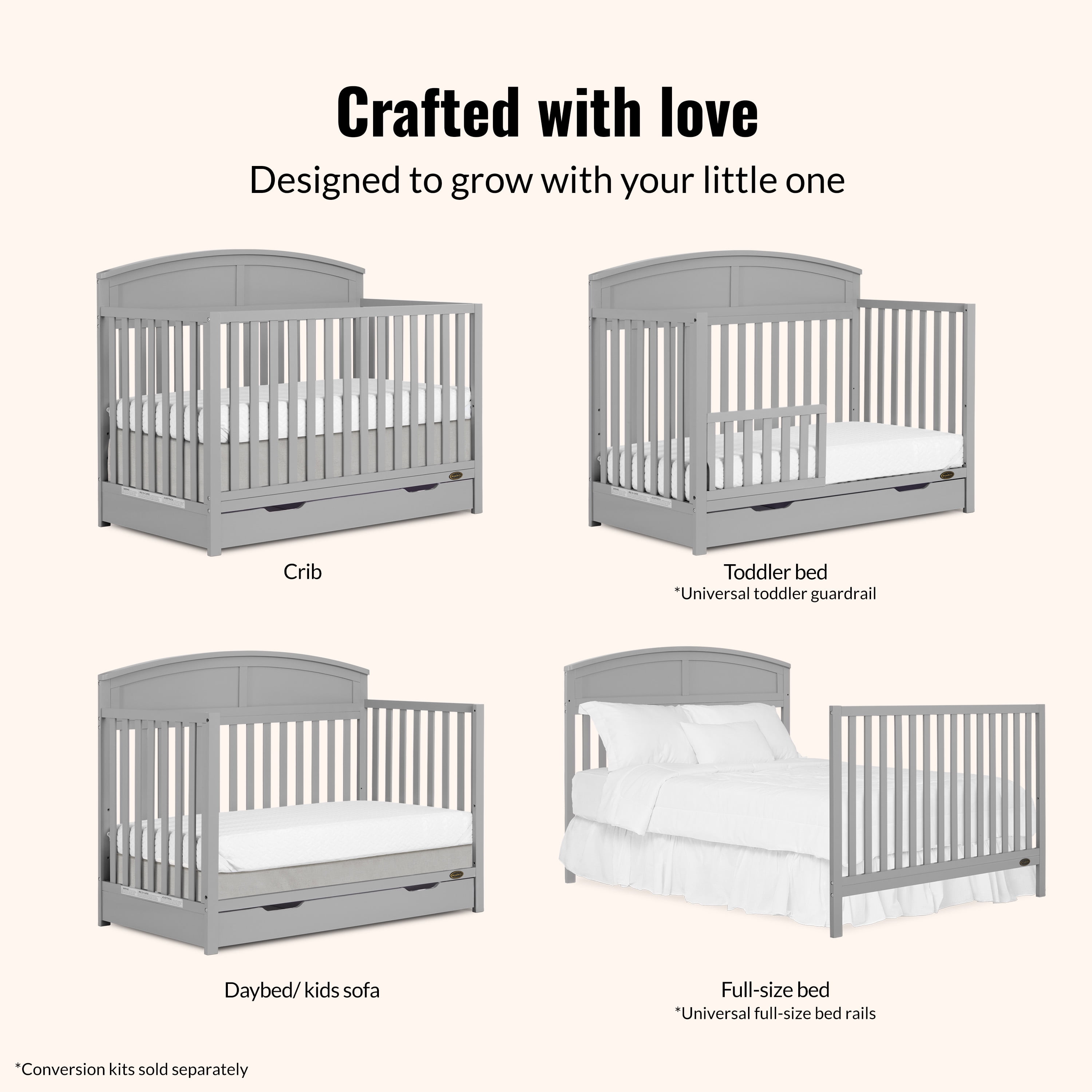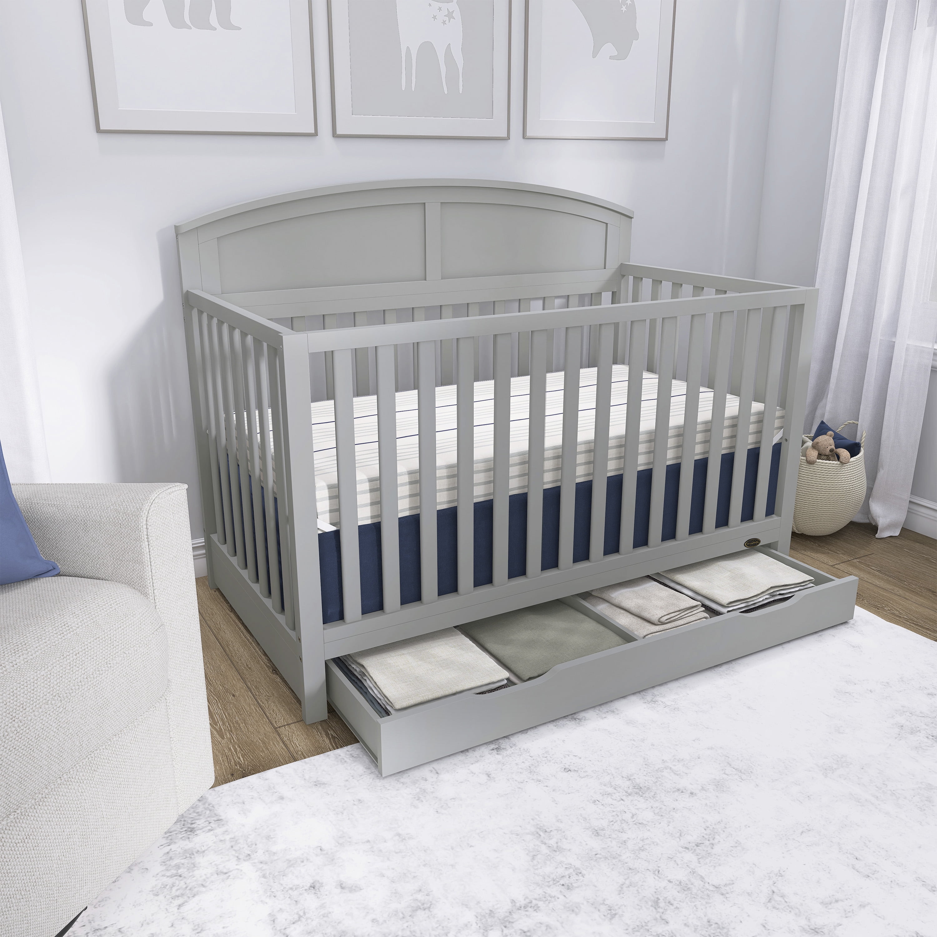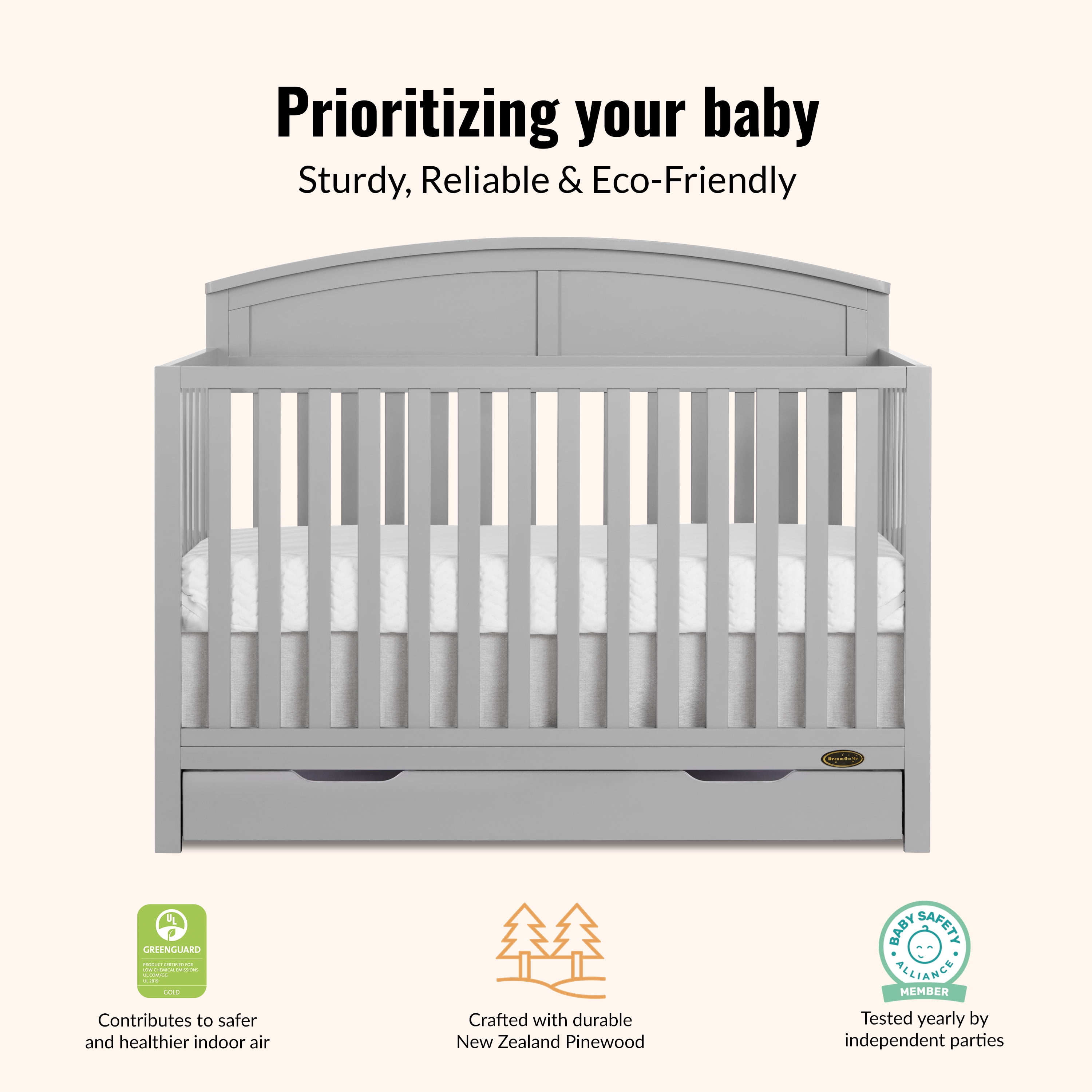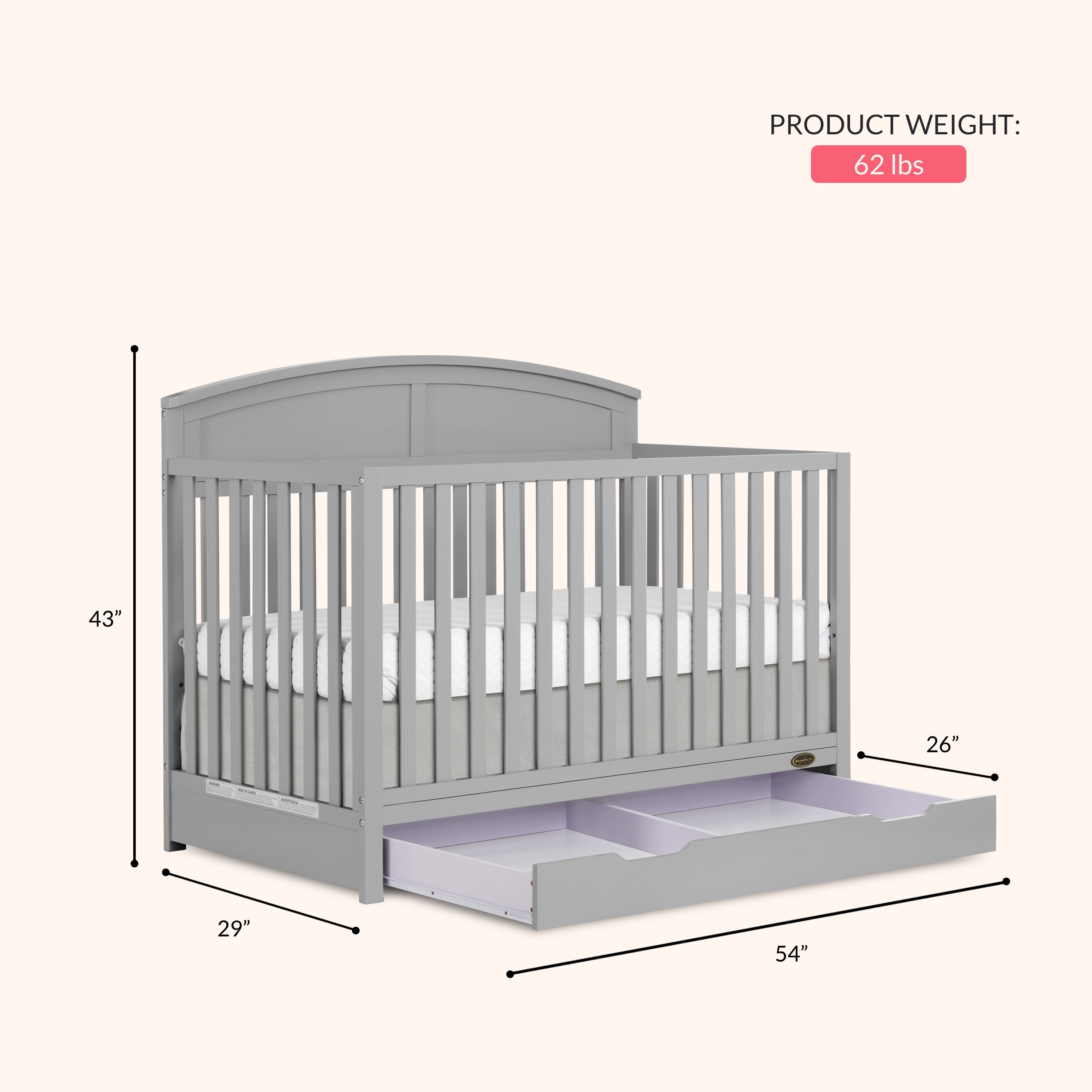 SEAMLESS CONVERTIBILITY: This crib grows comes with a 3-position adjustable mattress height setting and seamlessly converts from crib to daybed, toddler bed & full-size bed (conversion kit sold separately). SAFETY FIRST: The Dream On Me Storybrooke 5 in 1 Convertible Crib with Under Drawer is the safe choice as it is JPMA & Greenguard Gold certified, and meets ASTM & SOR standards. ADDITIONAL STORAGE: This crib comes with a 26” deep, big bottom drawer equipped with 2 concave handles for easy opening, that offers additional storage to conveniently organize your nursery items and essentials. THOUGHTFULLY DESIGNED: Crafted with sustainable New Zealand Pinewood & sturdy wooden spindles, with non-toxic, water based paint, this crib features a beautifully curved headboard, is easy to assemble & clean and comes in 2 pleasant finishes – White & Pebble Grey. PRODUCT SPECS:Product dimensions are 53.9“ L x 29.4” W x 42.9“ H, with a weight of 62 lbs