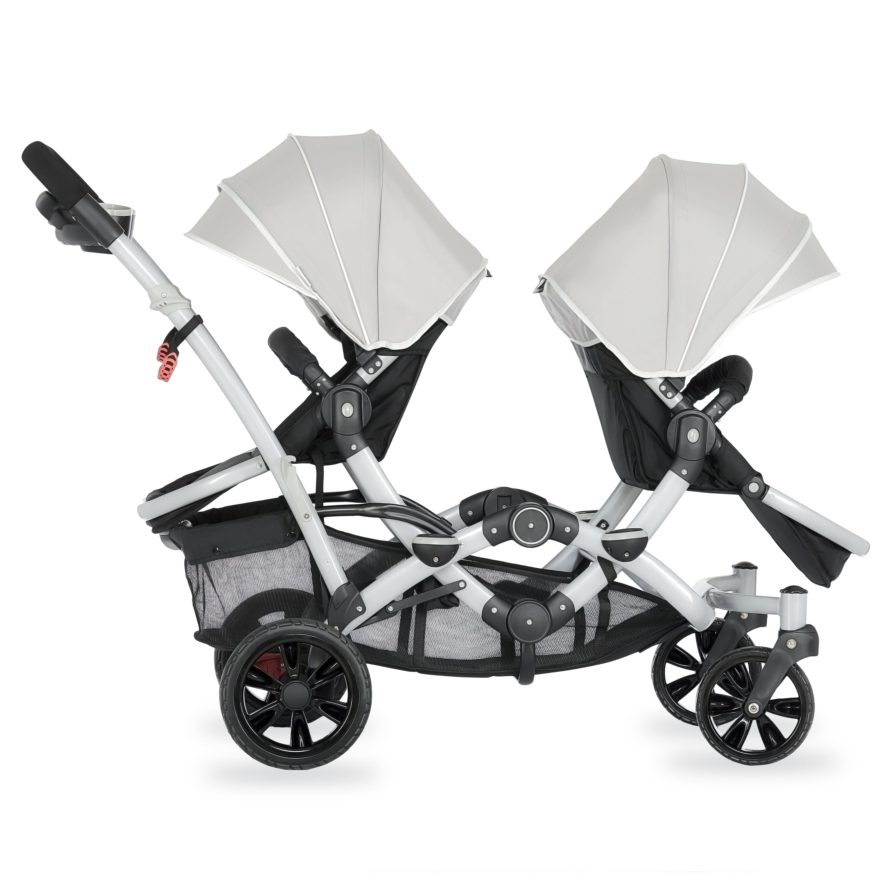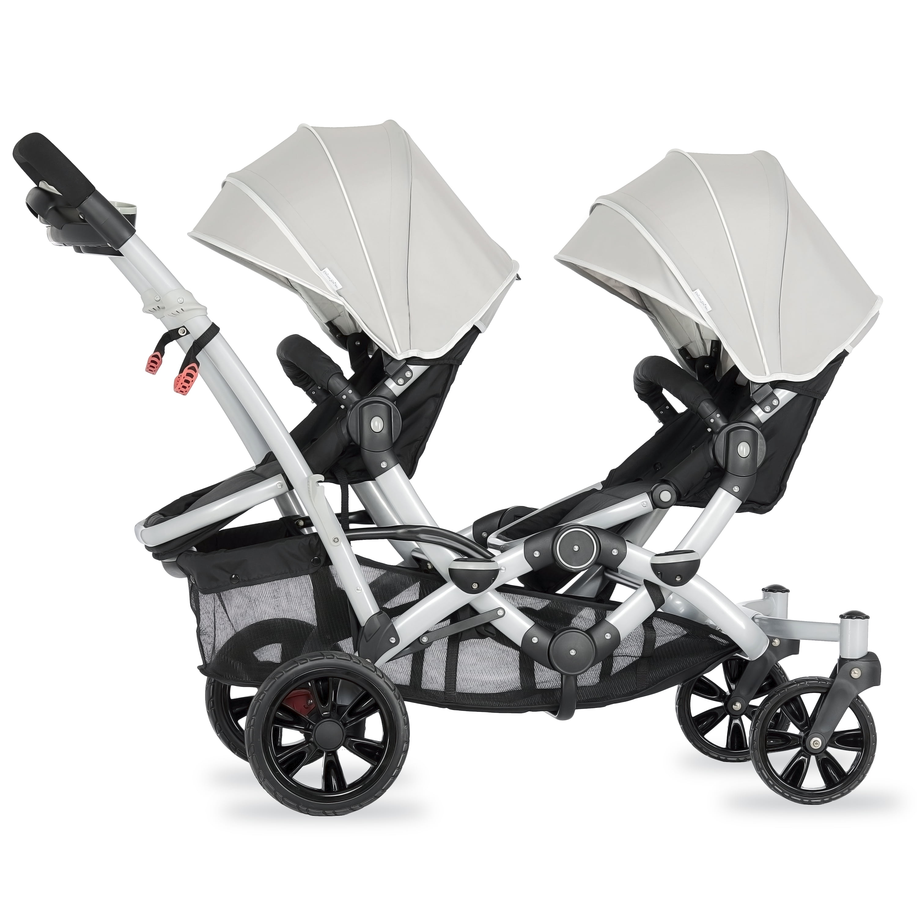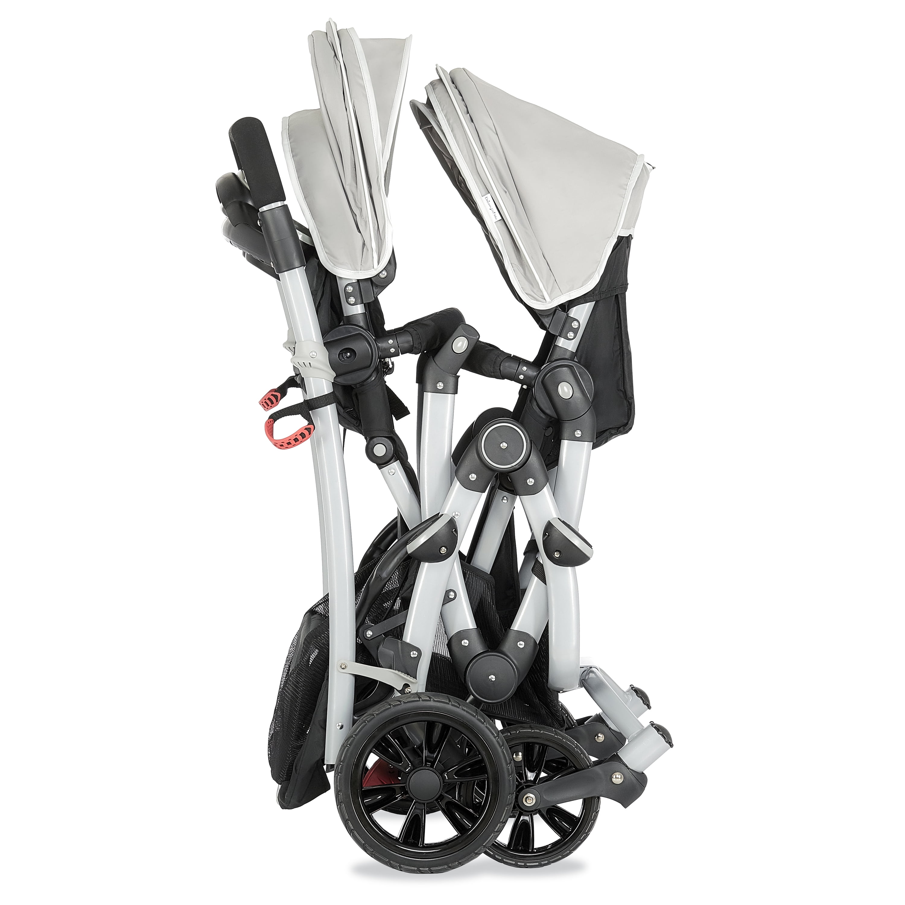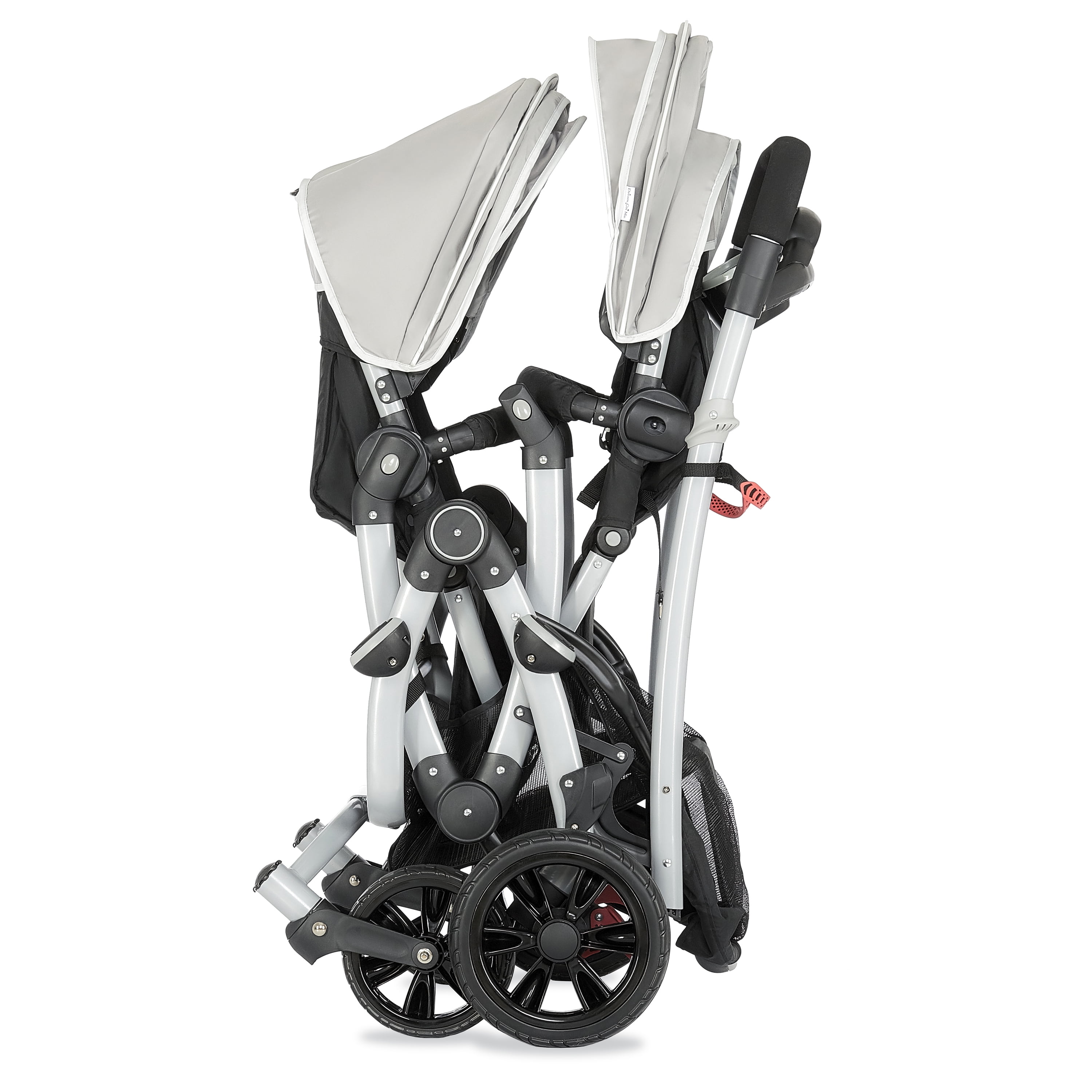 Lightweight Aluminum Frame with high-end anodizing treatment with reversible seats- Kids can face each other. The front seat offers an adjustable foot rest with one position seat recline while the rear seat can recline to 3 different positions Adjustable canopy with a convenient peek a boo window provides shade for both children when needed Lockable swivel wheels with suspension for superior maneuverability, which acts as a safe, guard in case you lose hold of the handle and give more flexibility. The comfortable seat with safety belt equipped is ideal to keep baby protected. LARGE STORAGE BASKET – The large storage basket underneath is ideal for holding purses, groceries, and diaper bags. Parent Tray is perfect to keep keys, purse drink etc. Stand by itself when folded; Storage latch auto-locks to keep it folded Both front and rear seats come with a 5-point safety harness for security Folded dimensions: 22 x 26 x 41”