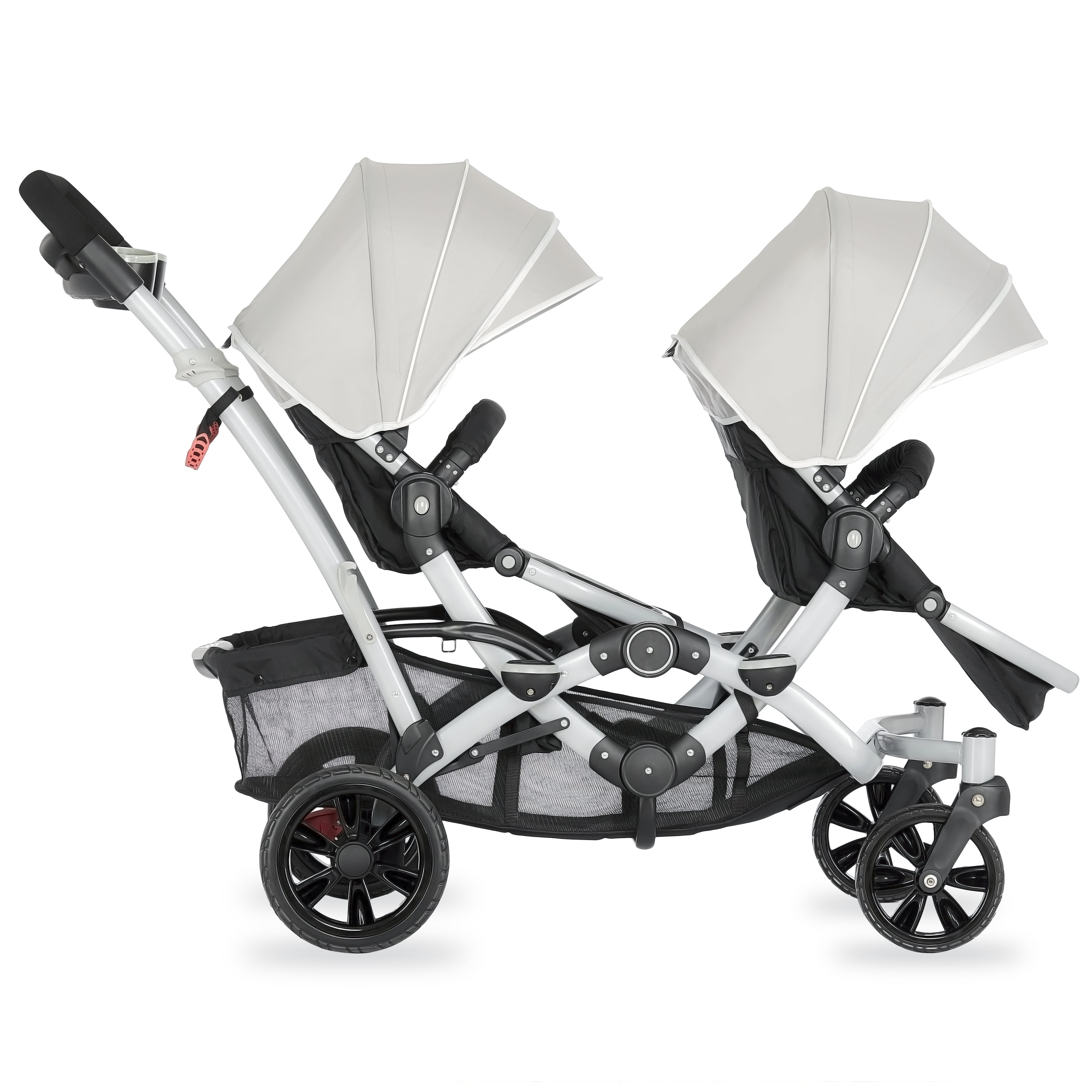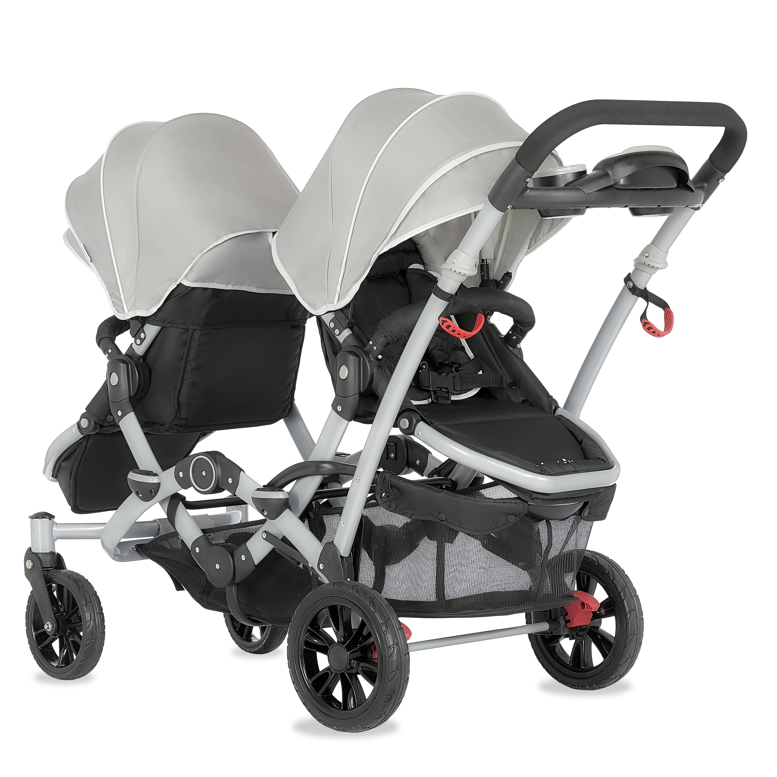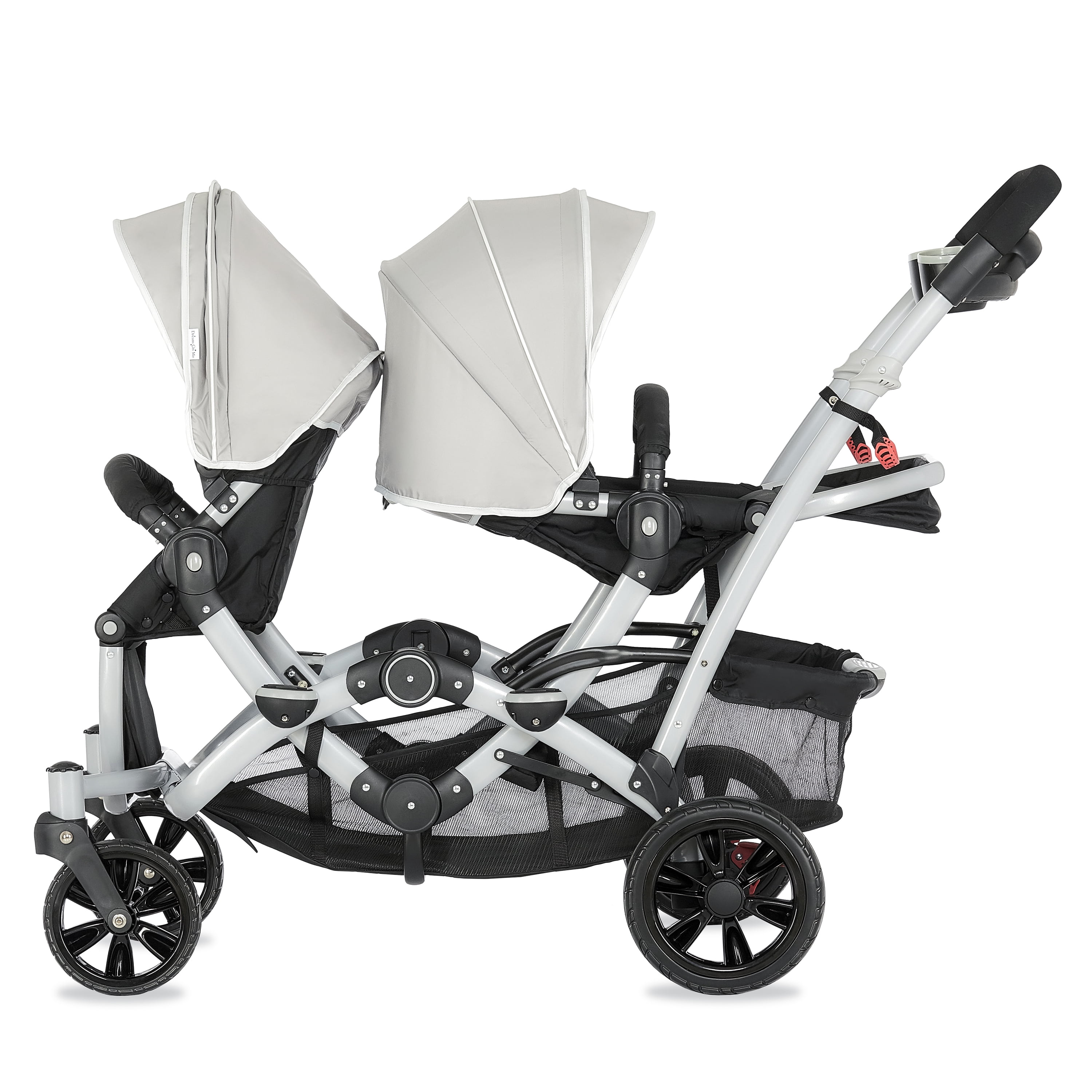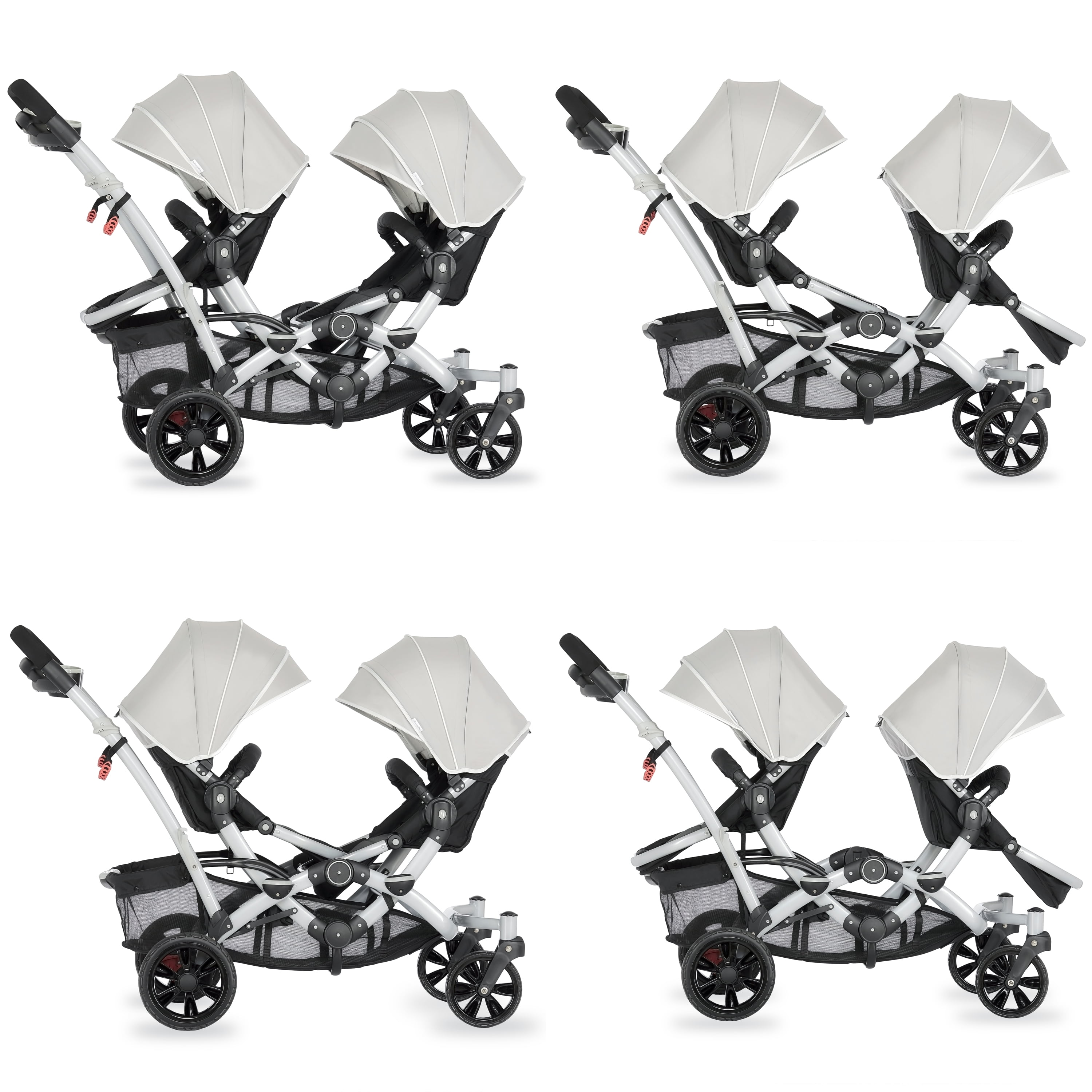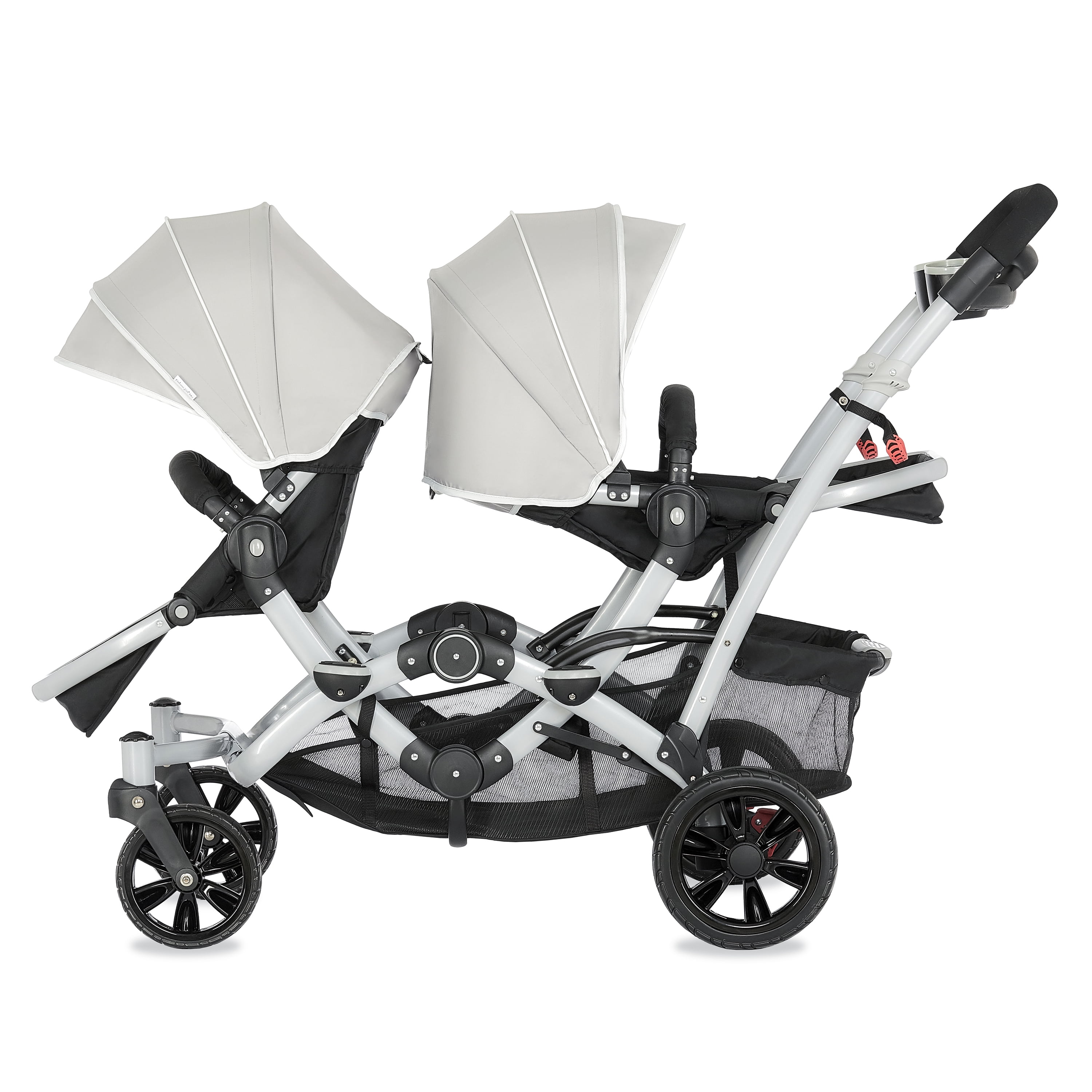 Lightweight Aluminum Frame with high-end anodizing treatment with reversible seats- Kids can face each other. The front seat offers an adjustable foot rest with one position seat recline while the rear seat can recline to 3 different positions Adjustable canopy with a convenient peek a boo window provides shade for both children when needed Lockable swivel wheels with suspension for superior maneuverability, which acts as a safe, guard in case you lose hold of the handle and give more flexibility. The comfortable seat with safety belt equipped is ideal to keep baby protected. LARGE STORAGE BASKET – The large storage basket underneath is ideal for holding purses, groceries, and diaper bags. Parent Tray is perfect to keep keys, purse drink etc. Stand by itself when folded; Storage latch auto-locks to keep it folded Both front and rear seats come with a 5-point safety harness for security Folded dimensions: 22 x 26 x 41”
