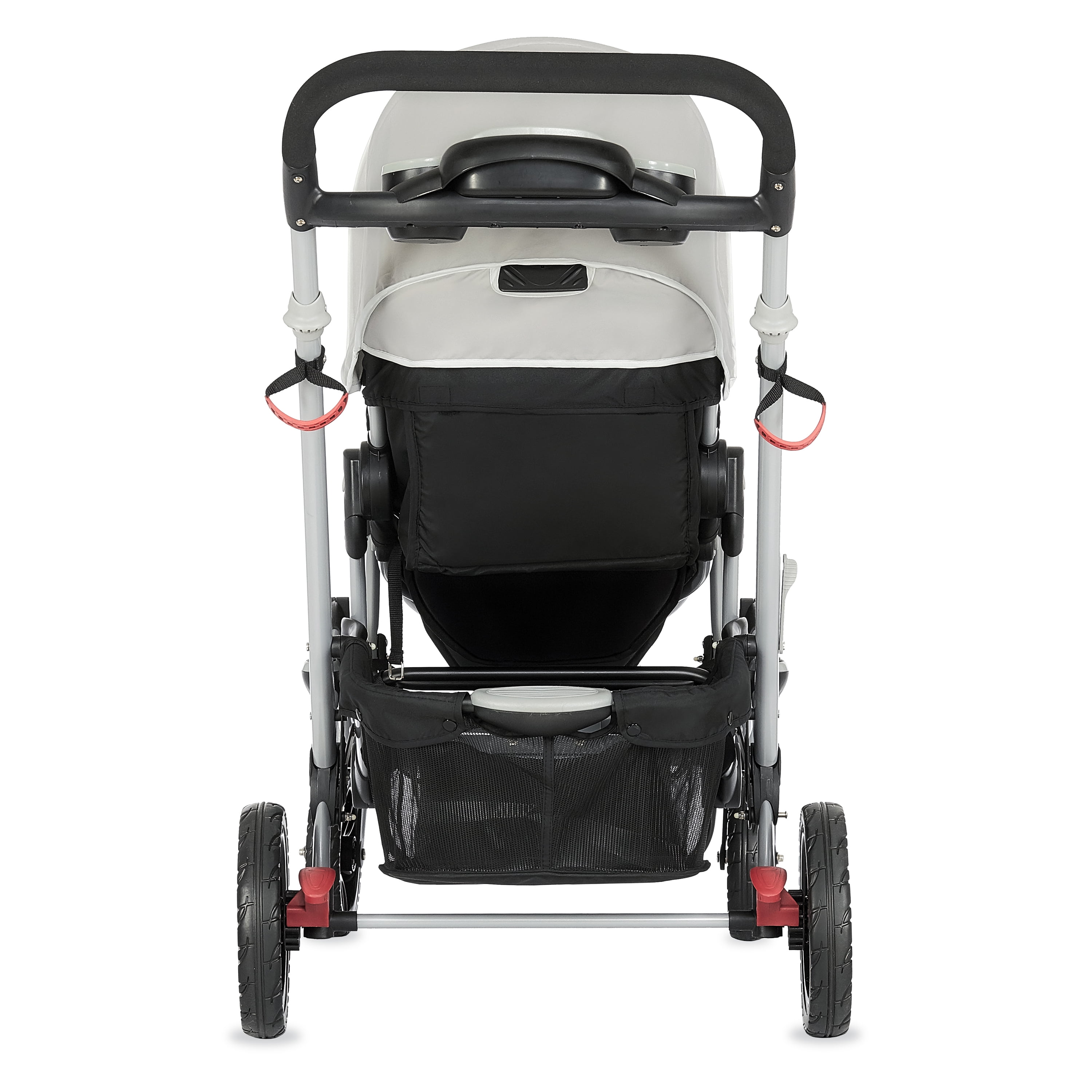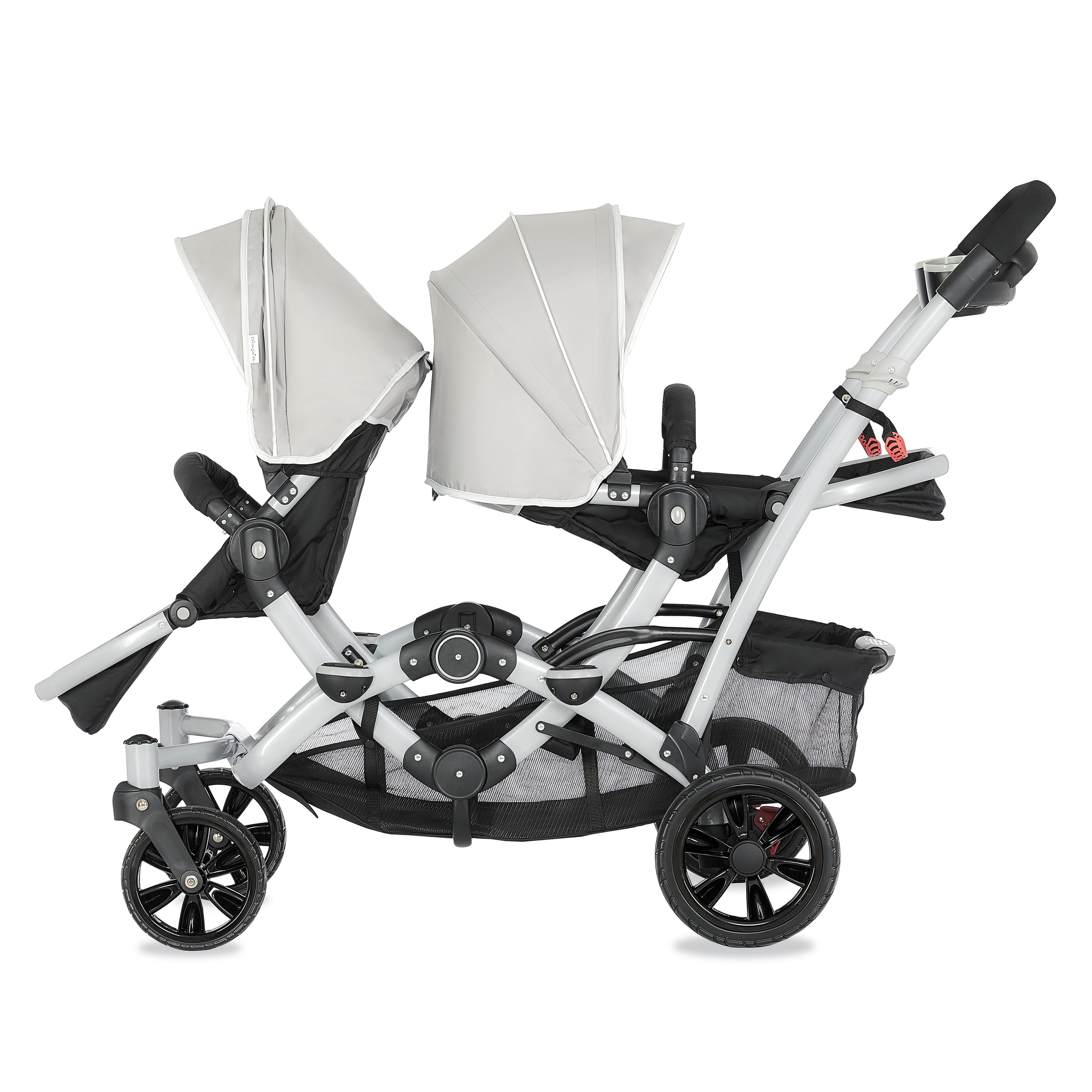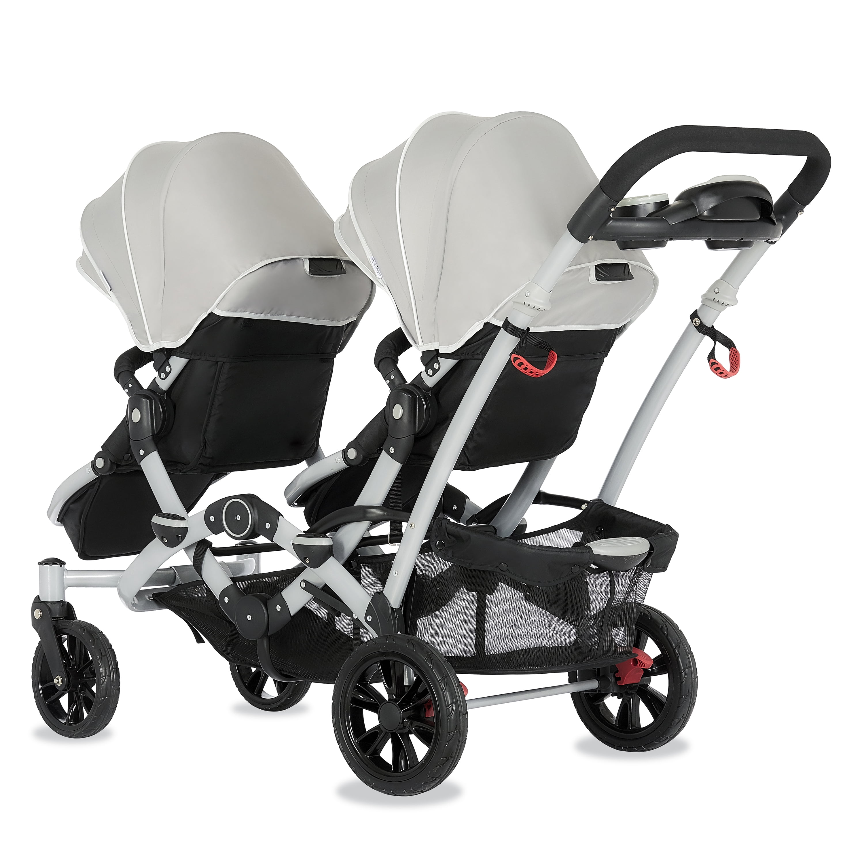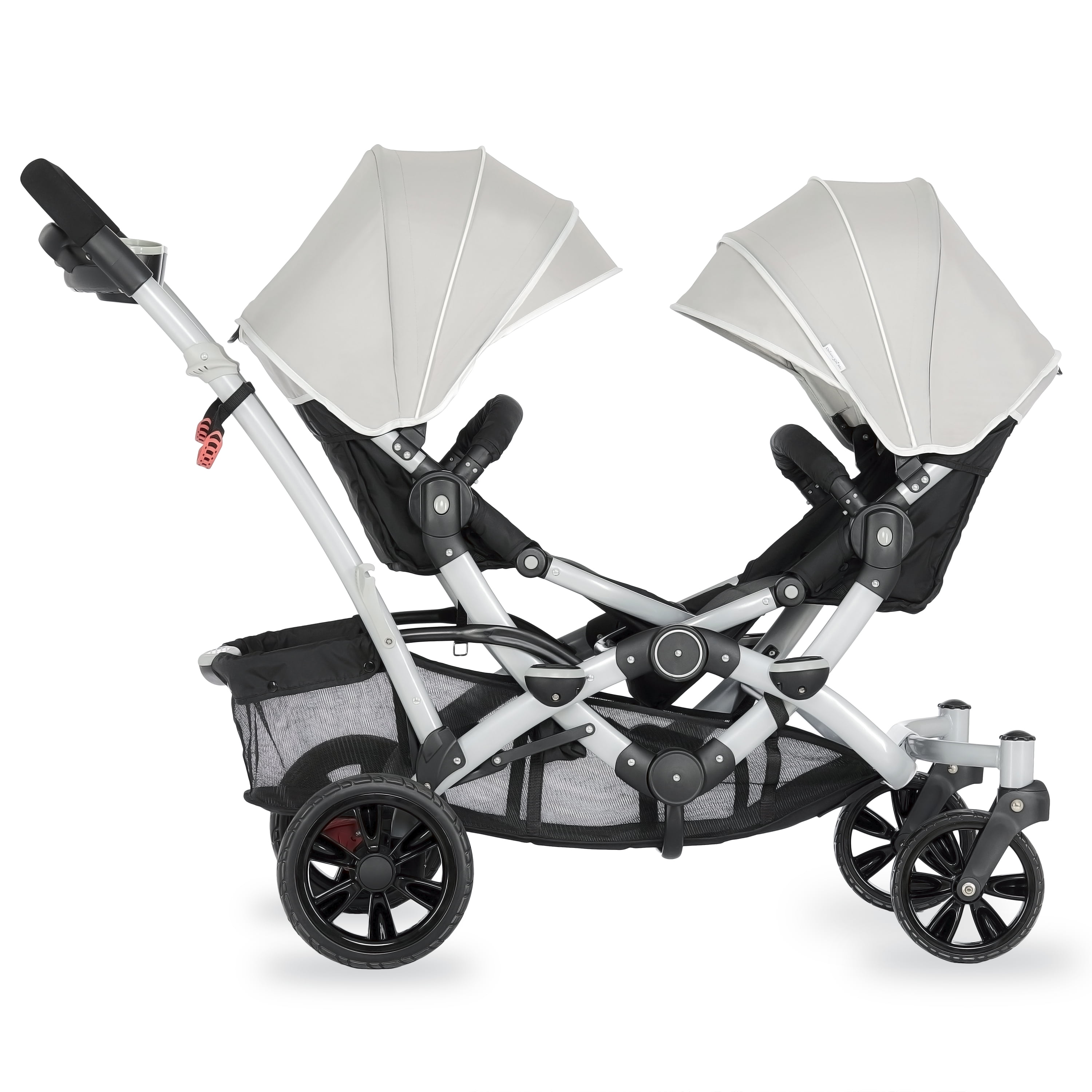 Lightweight Aluminum Frame with high-end anodizing treatment with reversible seats- Kids can face each other. The front seat offers an adjustable foot rest with one position seat recline while the rear seat can recline to 3 different positions Adjustable canopy with a convenient peek a boo window provides shade for both children when needed Lockable swivel wheels with suspension for superior maneuverability, which acts as a safe, guard in case you lose hold of the handle and give more flexibility. The comfortable seat with safety belt equipped is ideal to keep baby protected. LARGE STORAGE BASKET – The large storage basket underneath is ideal for holding purses, groceries, and diaper bags. Parent Tray is perfect to keep keys, purse drink etc. Stand by itself when folded; Storage latch auto-locks to keep it folded Both front and rear seats come with a 5-point safety harness for security Folded dimensions: 22 x 26 x 41”