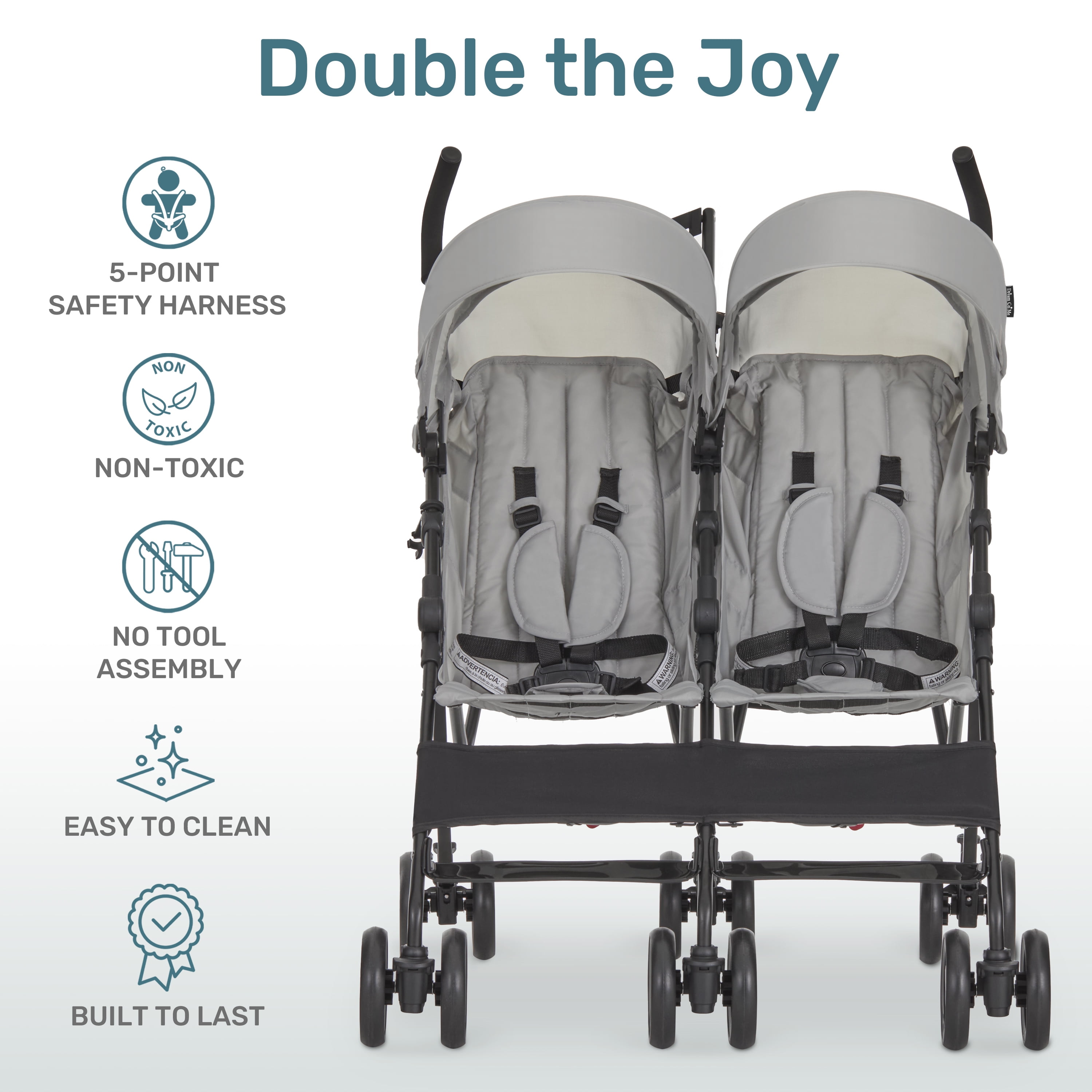 ADJUSTABLE MODES: The Twin Venture Stroller boasts multiple adjustable backrest positions, allowing you to customize the seating arrangement to suit your children’s preferences. FOR YOUR CONVENIENCE: Equipped with an adjustable and removable canopy, this stroller provides essential sun protection. The included cup holder offers convenient storage, ensuring you have everything you need within reach. SAFETY FIRST: For added safety, the Twin Venture Stroller meets/exceeds ASTM standards and features a removable bumper. VIBRANT FINISHES: This double stroller comes in a range of vibrant colors including Red, Light Blue, Light Gray, and Pink, ensuring you find the perfect match for your style. PRODUCT SPECS: Product dimensions are 29” L x 30” W x 39.5” H, with a weight capacity of 20.46 Lbs. This product can be used by children from 6-36 months.