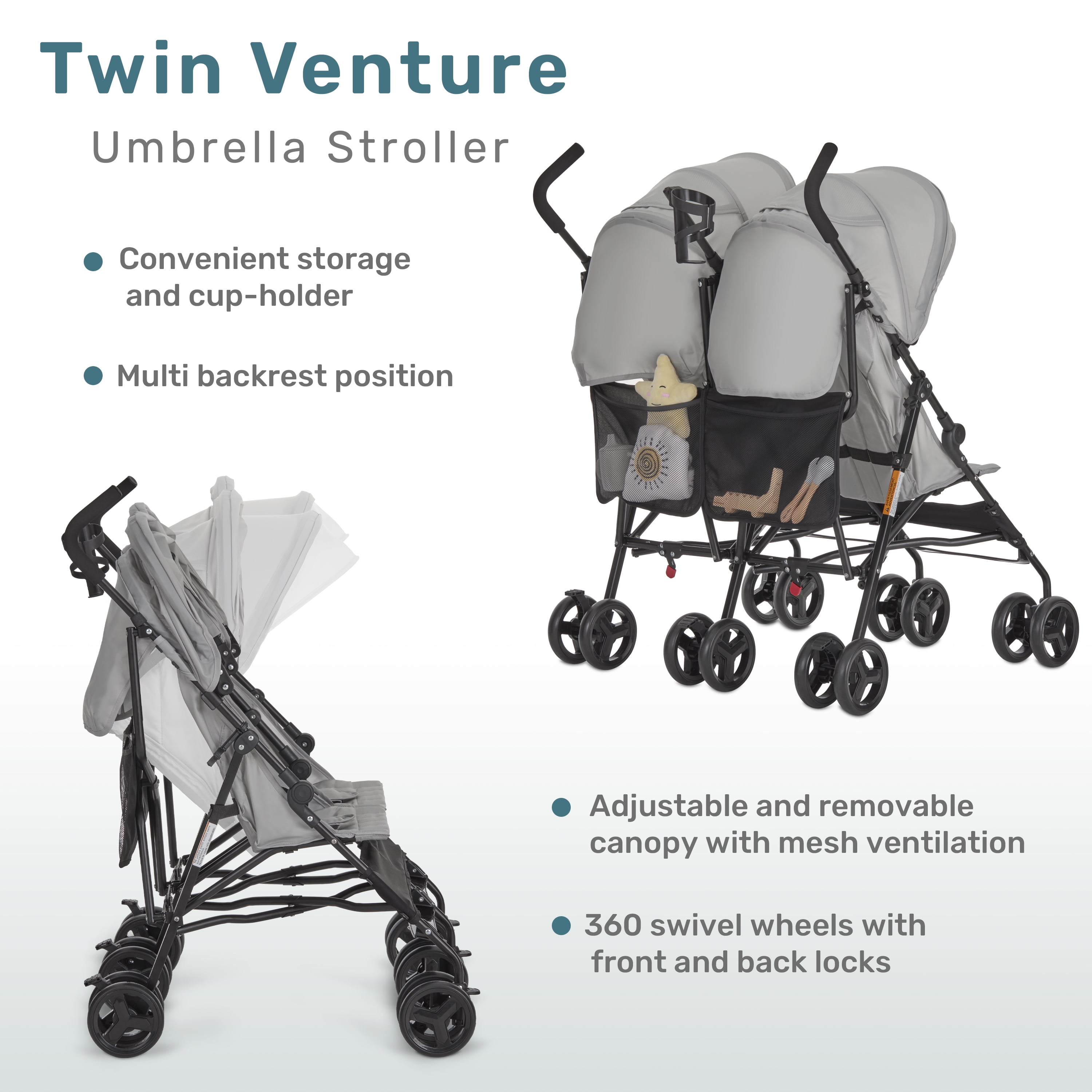Dream On Me Twin Venture Umbrella Stroller, Light Gray