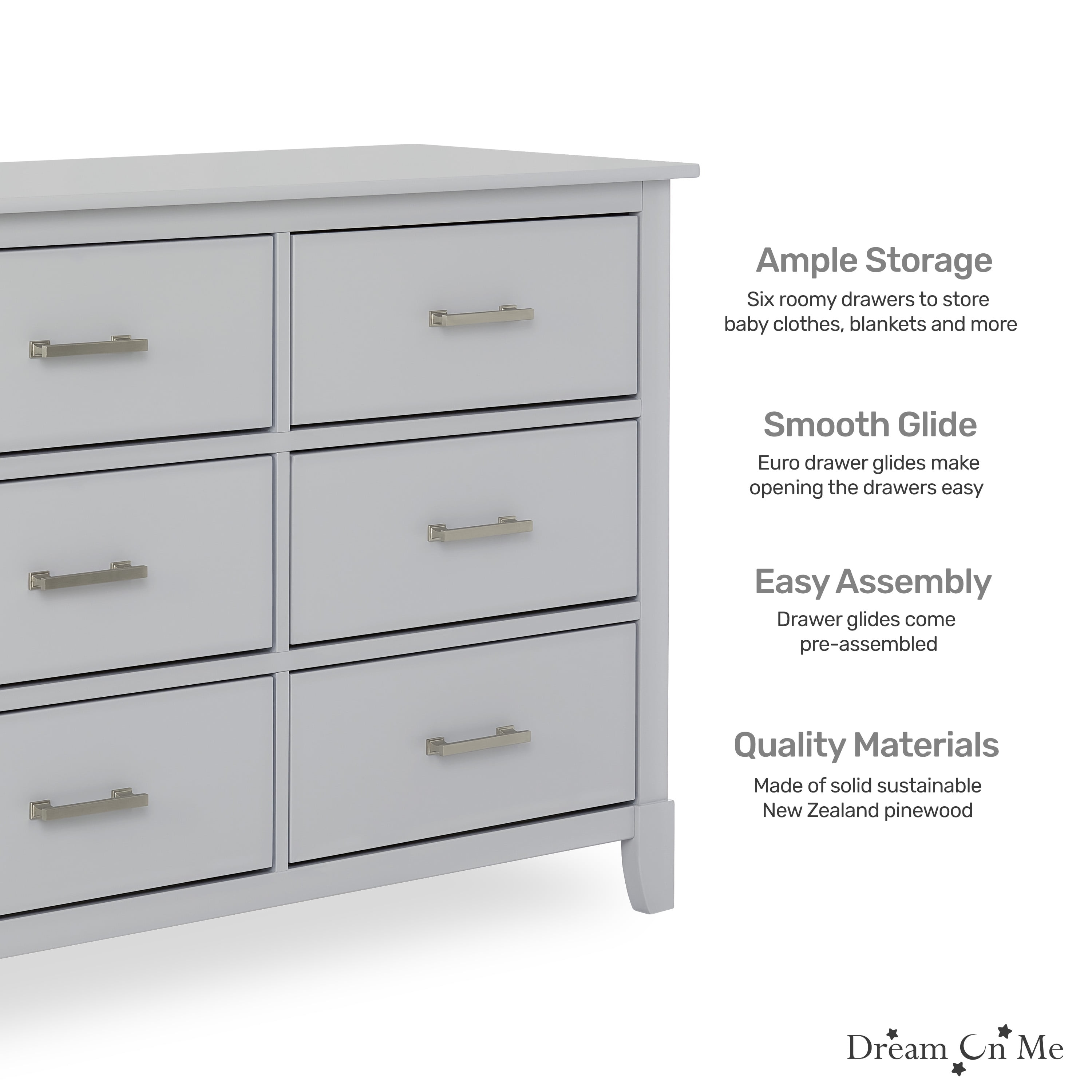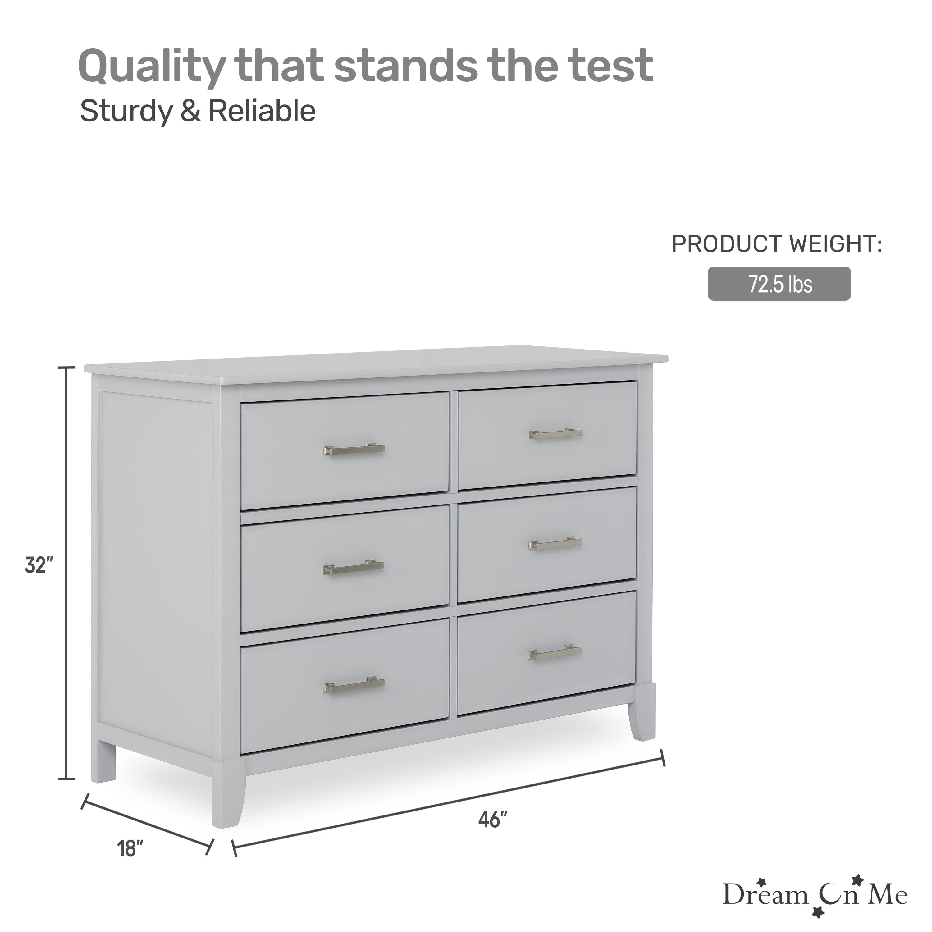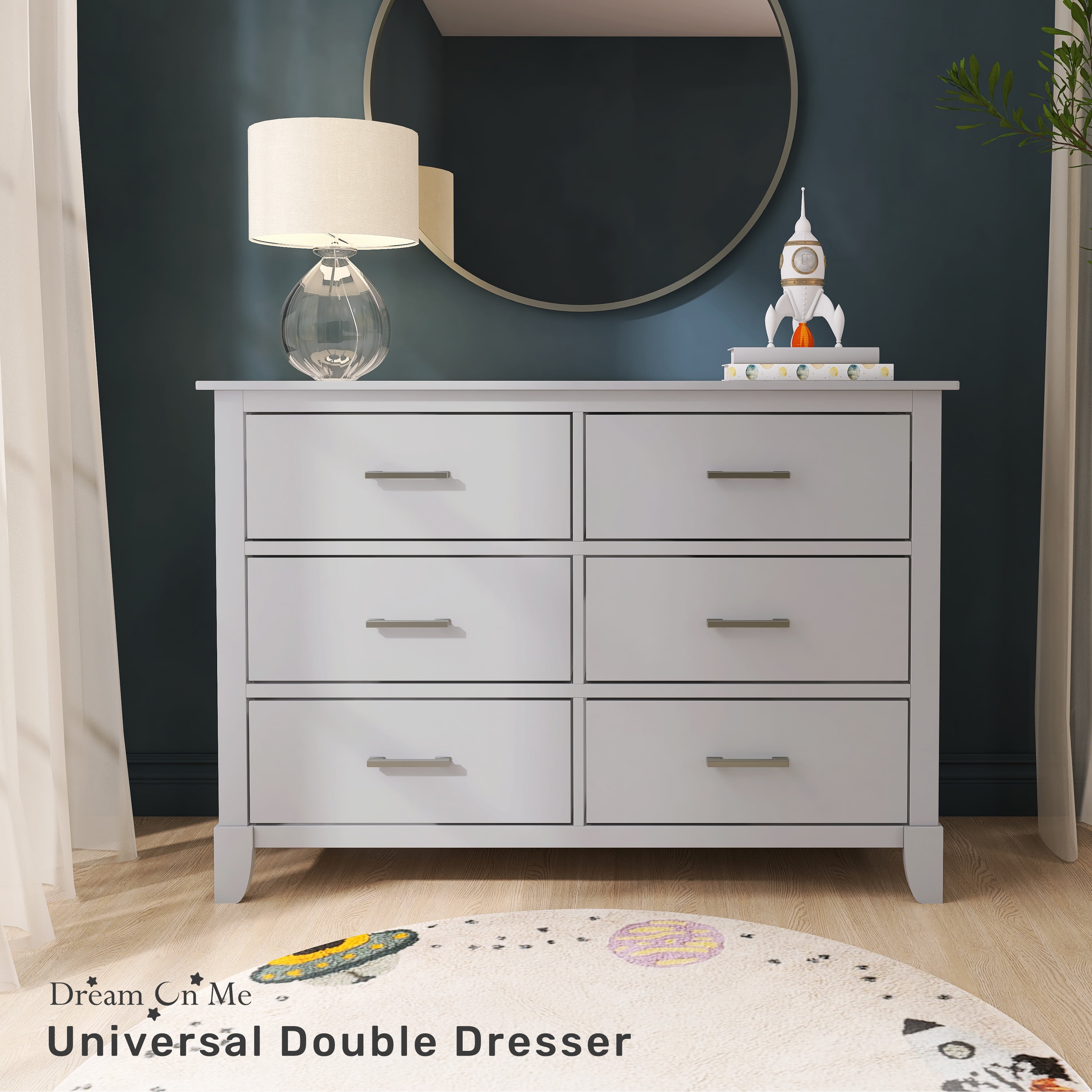 Dream On Me Universal Double Dresser: DURABILITY: six spacious drawers that can hold all the adorable baby clothes, blanket, and more. VERSATILE DESIGN: The dresser is designed to accommodate a Changing tray now and a big kid dresser later! This dresser is designed so that you can add a Dream On Me changing tray (#851KD) to use as a convenient changing station during the baby years. SMOOTH GLIDE: Euro drawer glides make opening the drawers easy even when your hands are full with your baby. EASY ASSEMBLY: We have done the hardest part for you! Drawer glides come pre-assembled so that you can put your dresser together more quickly and start enjoying your nursery sooner. QUALITY MATERIAL: Made of solid sustainable New Zealand pine wood and TSCA compliant engineered wood -only the best for your baby FOR YOUR BABY’S SAFETY: Say goodbye to toxic chemicals! Finished in a non-toxic multi-step painting process, lead, and phthalate safe. Rest assured knowing it exceeds ASTM International and U.S. CPSC safety standards. Stop mechanism and anti-tip kit included for additional safety Assembled dimensions: L 46.06 in x W 18.11 in x H 32.28 in
