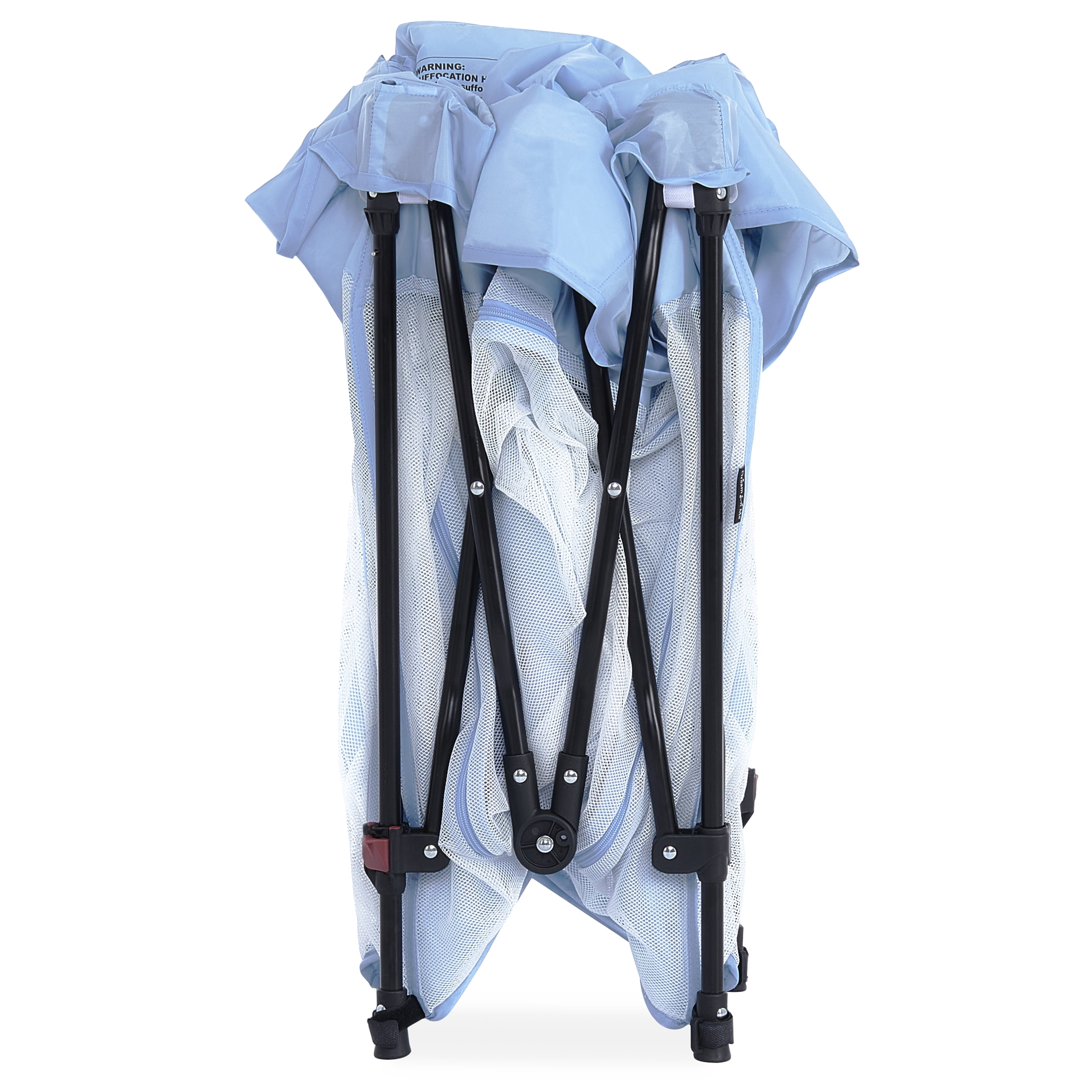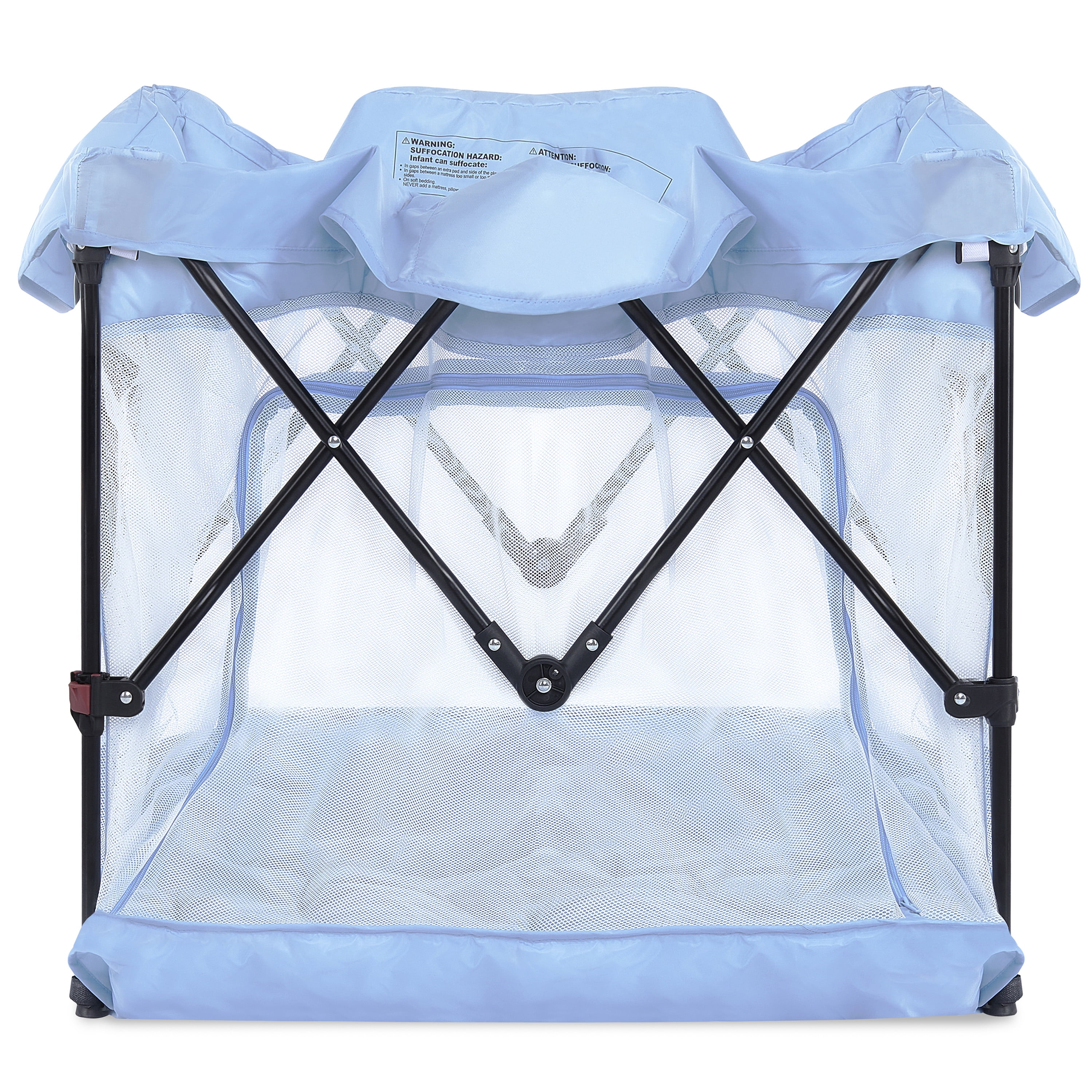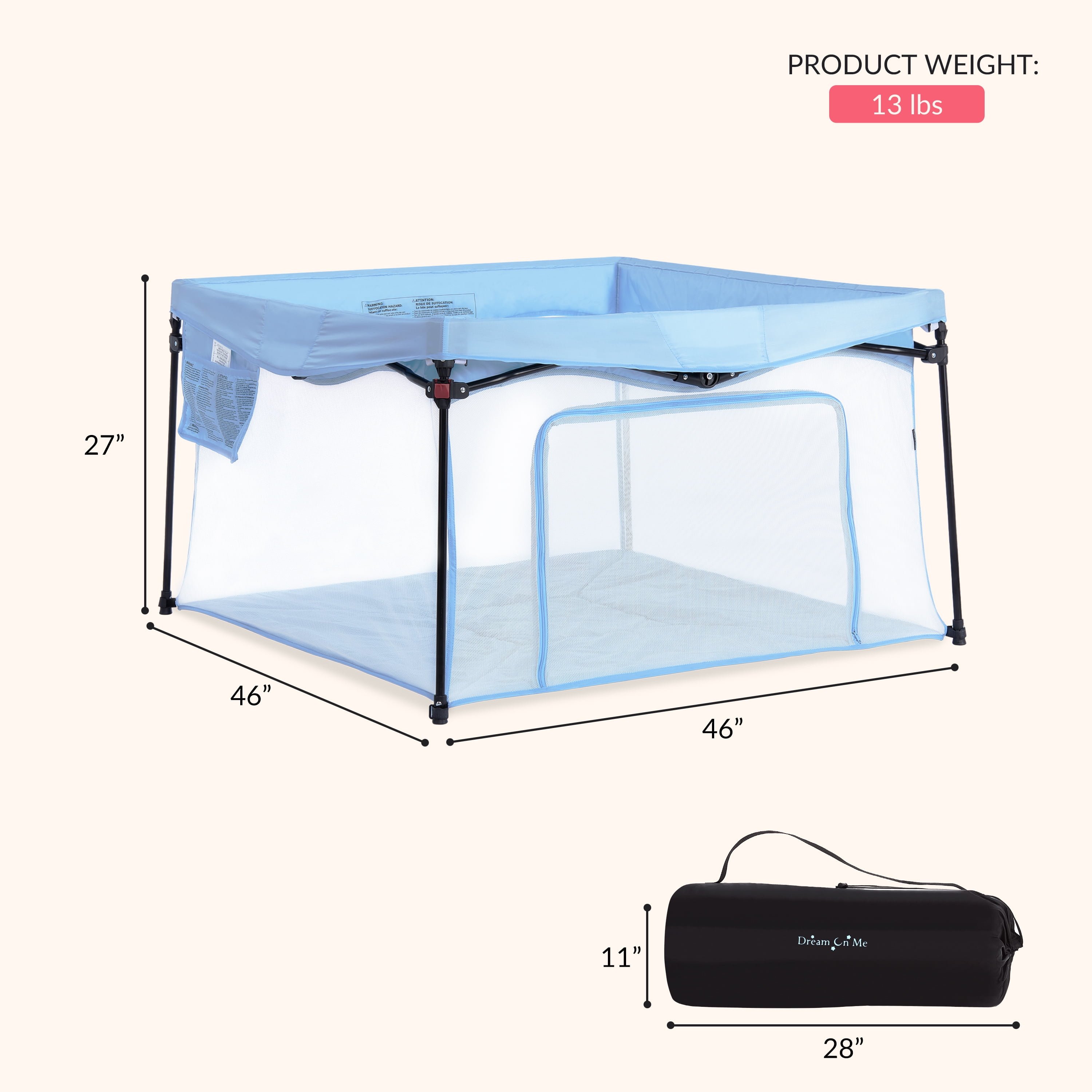 Lightweight, setup, and folding in seconds. Thickly padded floor, comfortable for a baby for playtime. Wide enough to accommodate parents inside with their little ones for play or storytime. Clear mesh walls for fresh airflow and visibility. Carrying bag included. Canopy with half mesh and half fabric to keep little one safe from bugs or sunlight (Sold separately). Meets ASTM F406-17 standard.