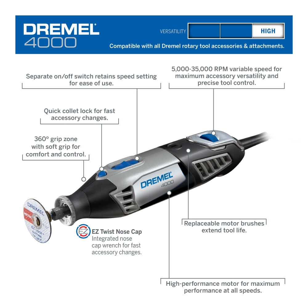 High-performance motor for maximum performance at all speeds Electronic feedback for consistent speed under load Variable speed provides maximum control and precision Separate on/off switch and speed control dial for the perfect speed every time Can be used with all Dremel rotary tool attachments and accessories Quick collet lock for fast accessory changes Cool-running ball bearing construction for smooth and quiet operation Replaceable motor brushes extend tool life Two year warranty