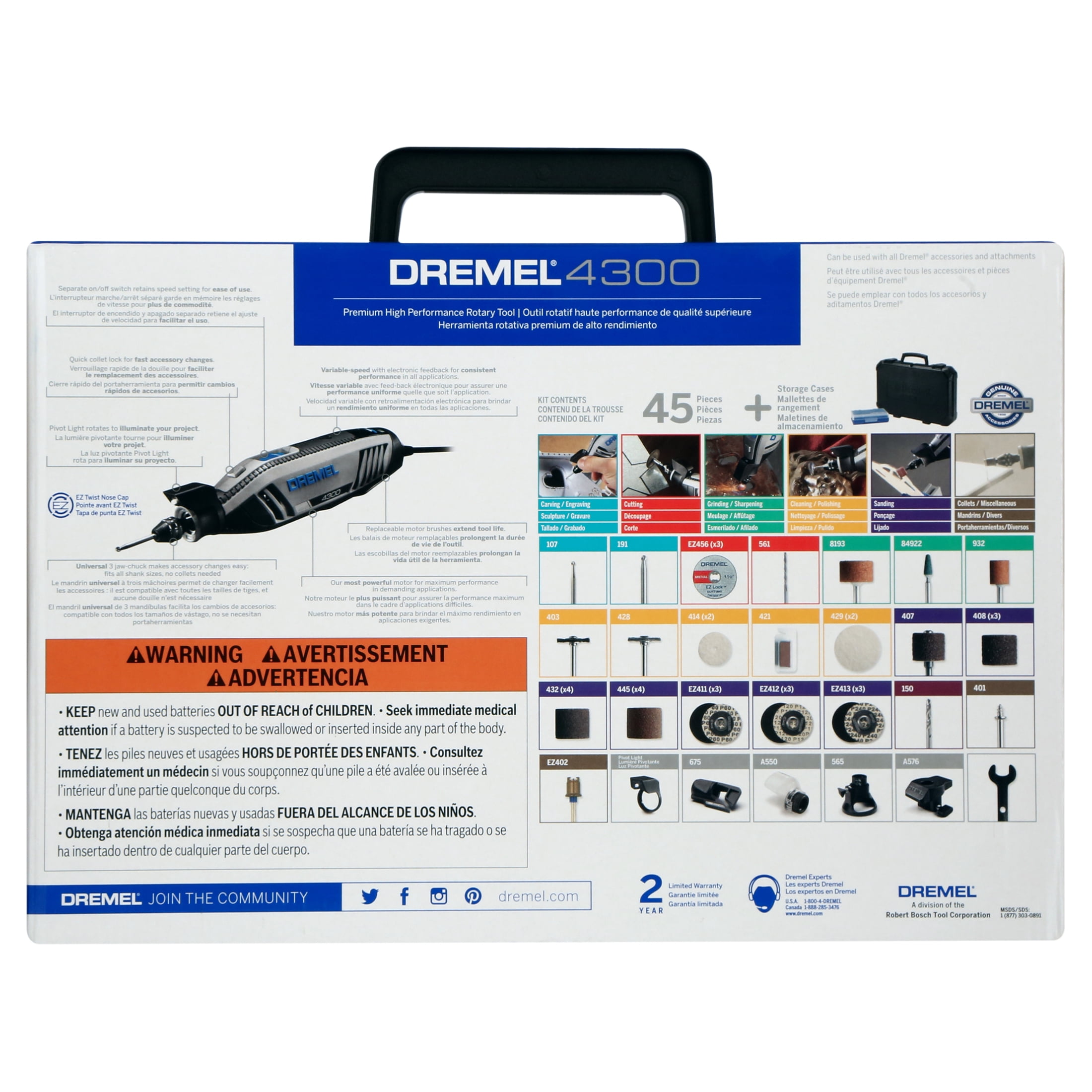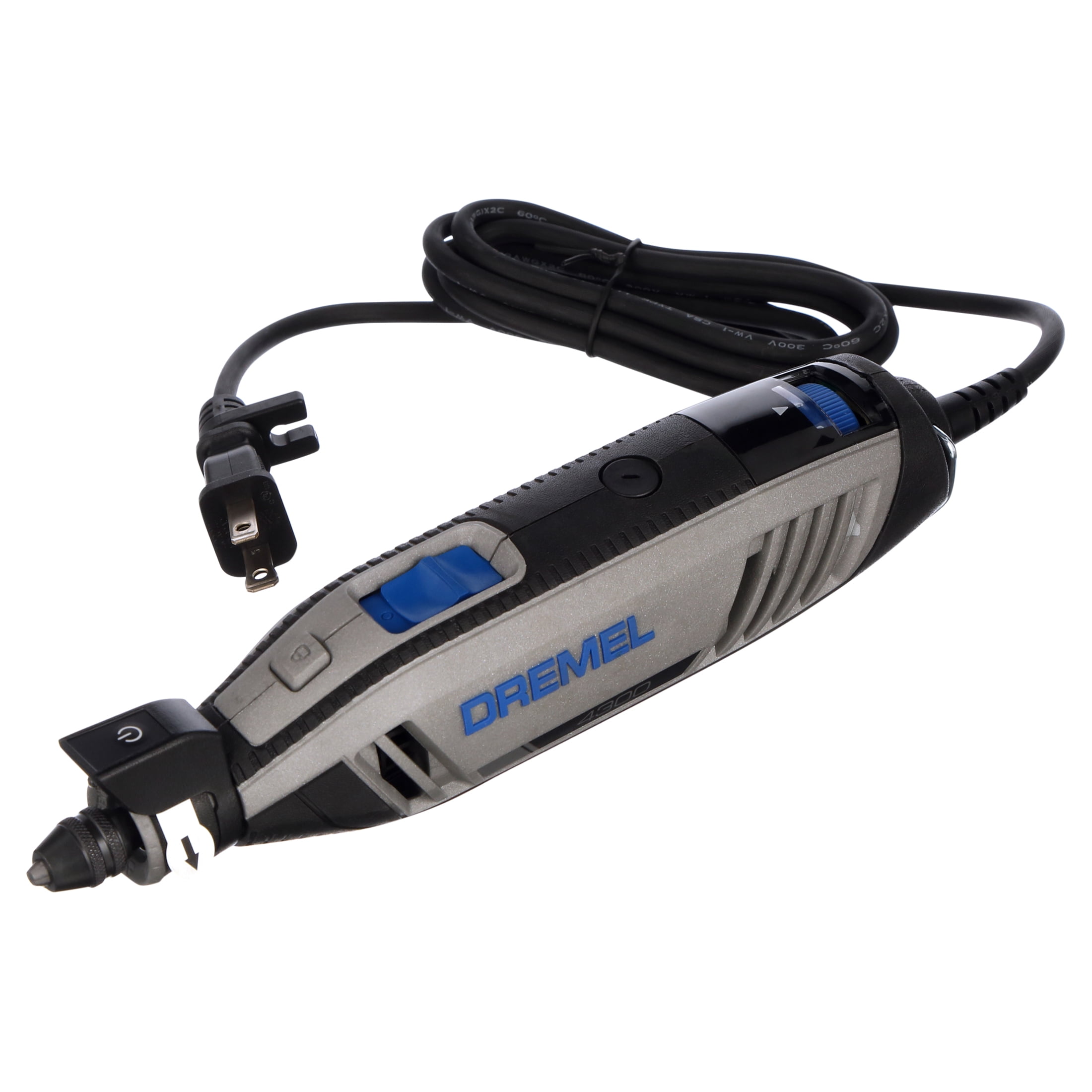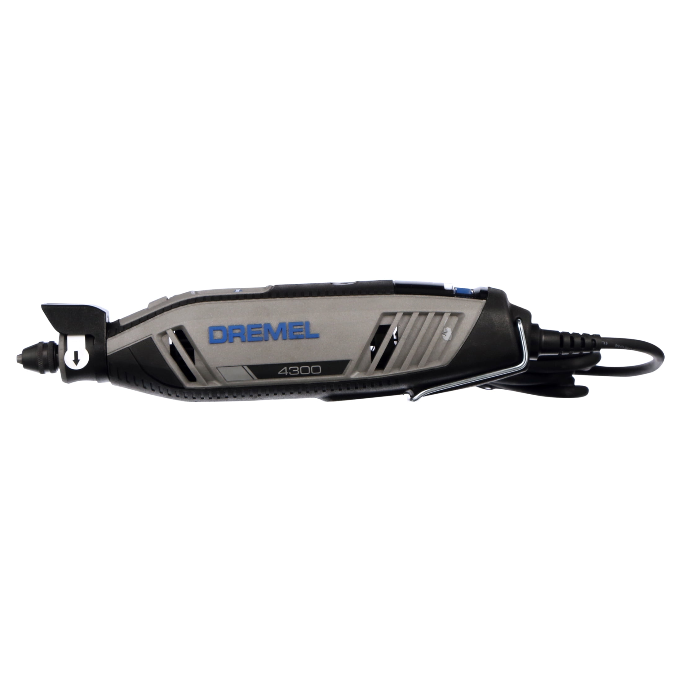 The Dremel 4300 is the first Dremel rotary tool to allow tool-less and collet-less accessory changes with the inclusion of the universal three-jaw chuck. The chuck accepts all Dremel accessory shank sizes for fast and convenient accessory changes without ever using a wrench or adaptor. Featuring the all new Pivot LED Light, your projects are well-lit with an optimum line of sight since the light pivots to direct illumination where you want it. Experiencing the full range of Dremel rotary tool applications is easier than ever because the 4300 offers our most powerful motor with built-in variable speed and electronic feedback circuitry. And the slim, ergonomic body design provides a comfortable 360-degree grip zone no matter how you hold it for extended ease of use. The completely redesigned airflow system lets the Dremel 4300 run cool, quiet, and smooth so completing projects are more enjoyable than ever. The Dremel 4300 is the perfect rotary tool for all your projects, even the most demanding ones.